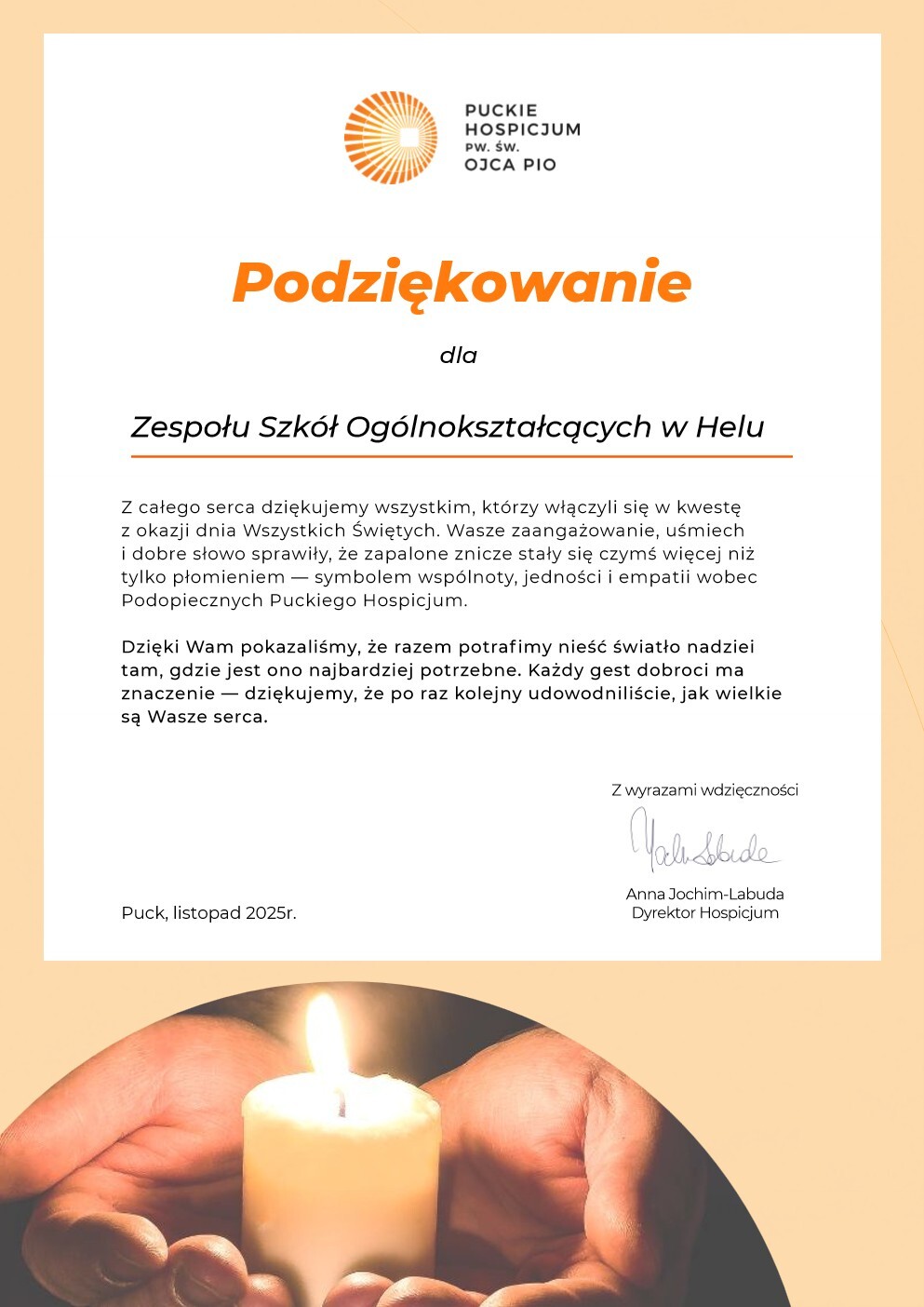 1 listopada Wolontariusze z naszej szkoły pod opieką Nauczycieli wsparli kwestę na rzecz puckiego Hospicjum im. Ojca Pio. Wszystkim Darczyńcom bardzo dziękujemy, uzbieraliśmy dla Podopiecznych hospicjum 5447.04! Wcześniej, 11 października, wzięliśmy udział w uroczystej Inauguracji Pól Nadziei 2026 i obsadziliśmy cebulkami żonkili szkolną rabatę. Już rozmyślamy o kwietniowej akcji. Dobrze jest doświadczać zrozumienia i solidarności we wspólnych ludzkich sprawach, dlatego wiele wdzięcznych słów kierujemy do EKO HELU- dzięki Wam mogliśmy się poczuć bezpiecznie, nie bać się deszczu, wiatru, mieć się dobrze w dobrej sprawie. Jeszcze raz Wszystkim sprzymierzeńcom dziękujemy!