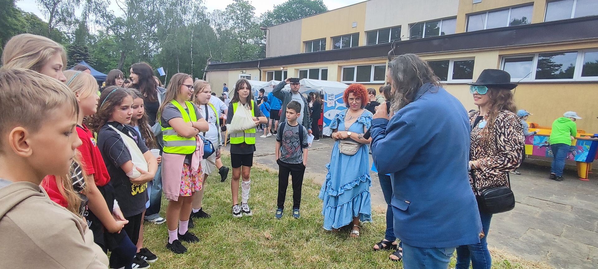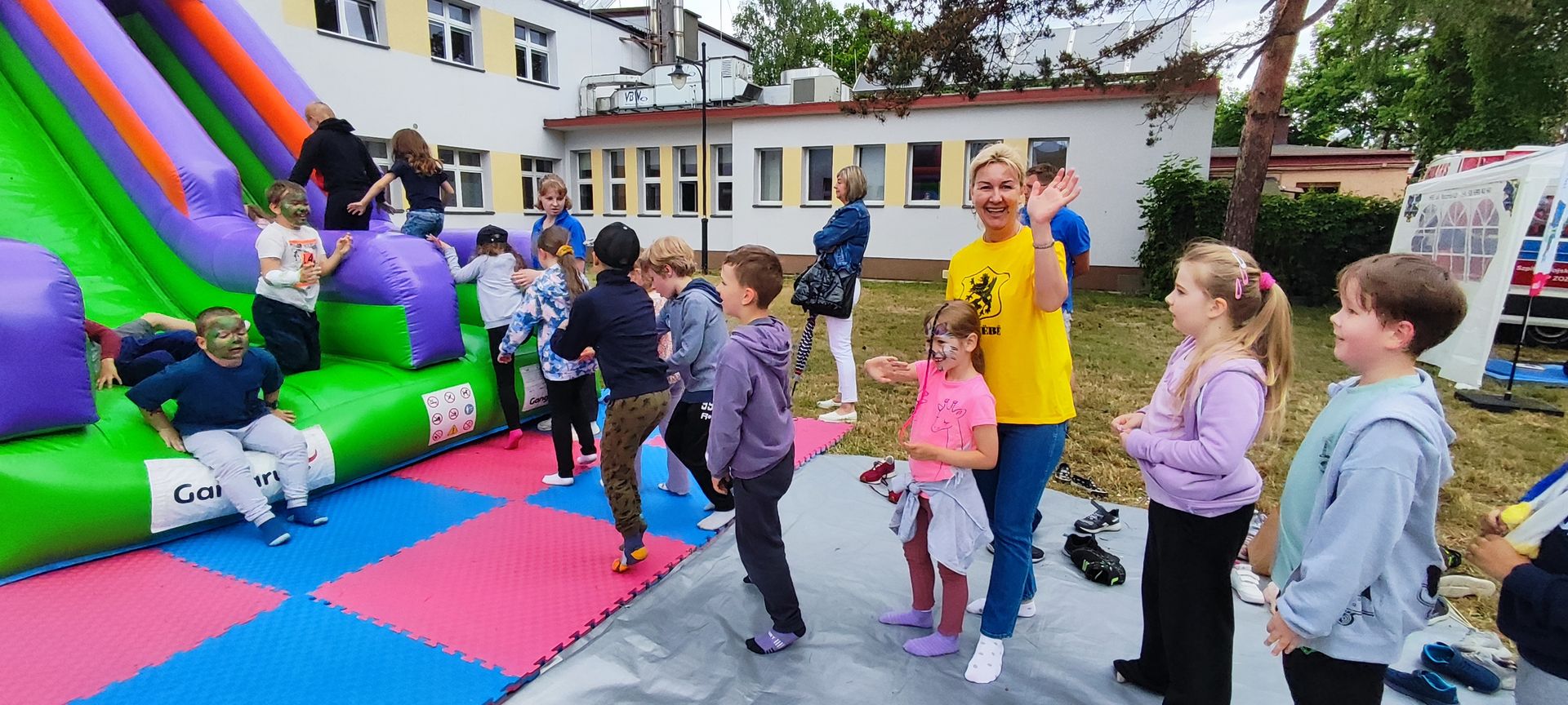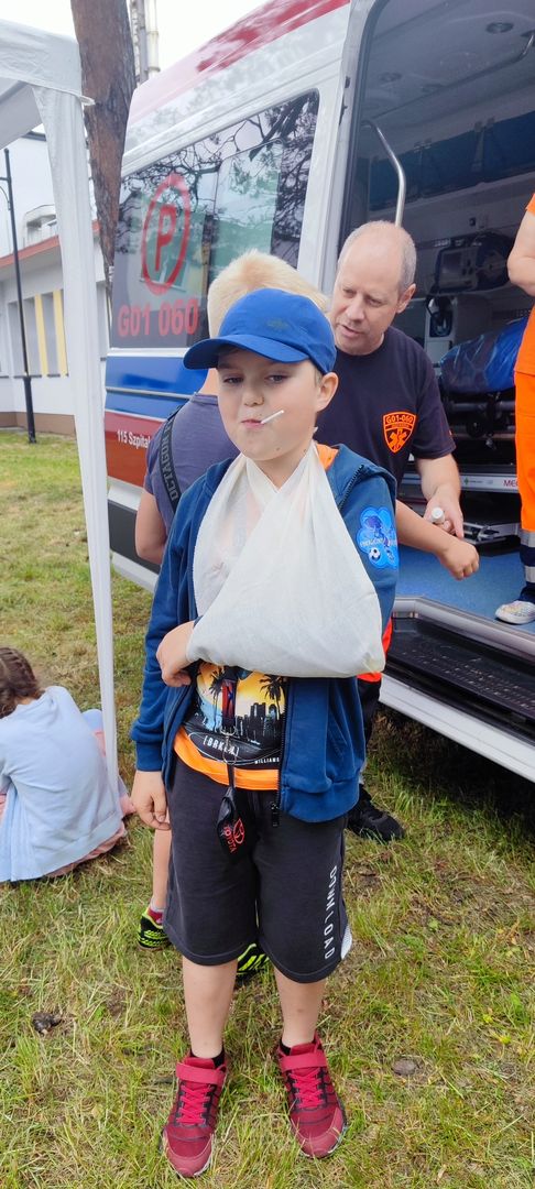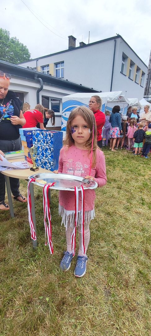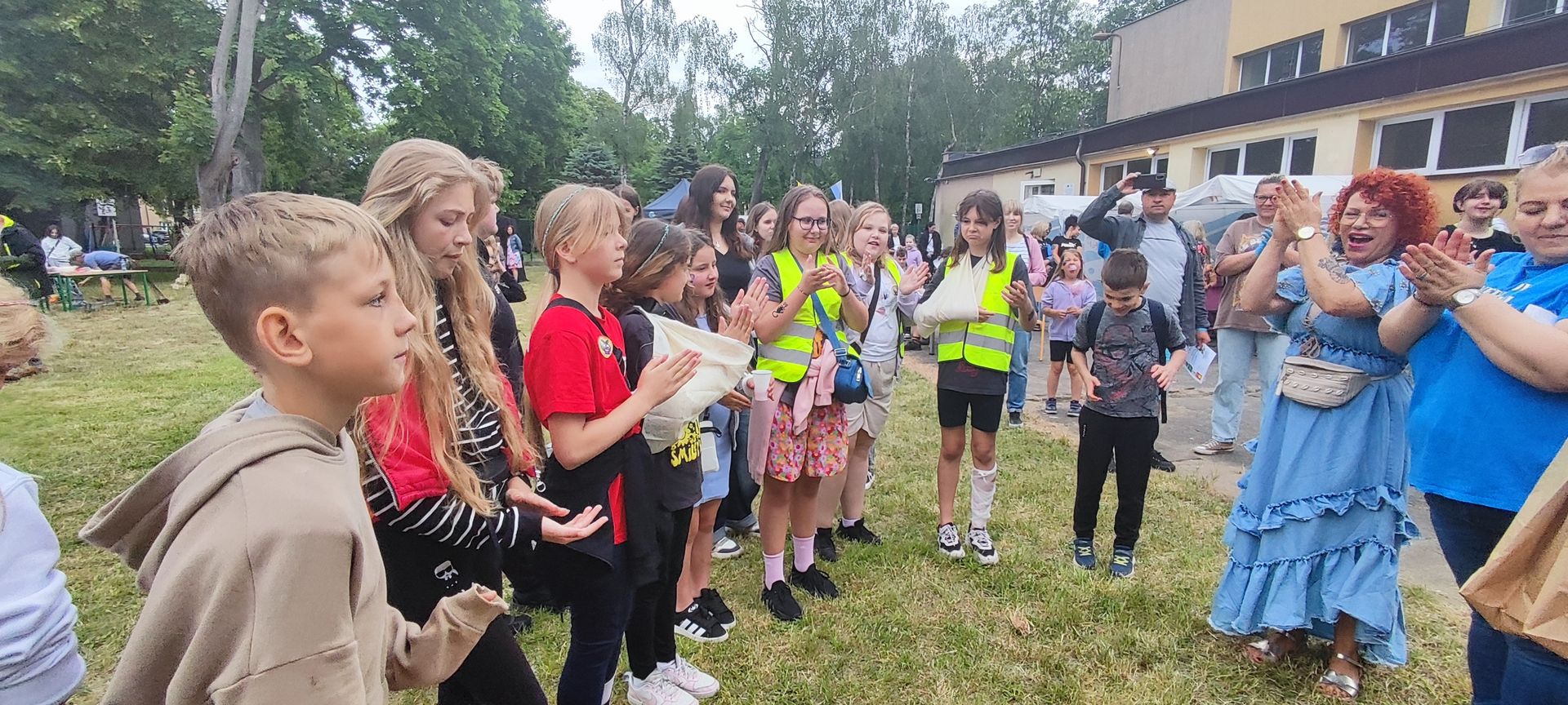 W atmosferze świetnej zabawy, muzyki dziecięcej serwowanej przez DJ Glewicza, uśmiechów na twarzach wszystkich obecnych, dzieci korzystały do woli, do ostatnich minut z wielorakich atrakcji: kolejki do warkoczyków i tatuaży, do malowania buziek, na zamek dmuchany, do zdjęć w FOTOBUDCE trwały i trwały J. Wszyscy zajadali się pysznościami z poszczególnych stoisk RR, ZKP, goframi upieczonymi przez naszych nauczycieli, popcornem i watą cukrową przygotowywaną przez starszych uczniów, ugotowaną zupą vege w kociołku, kiełbaskami pieczonymi przy ognisku a z okienka stołówki pan Rysiu rozdawał lody na patyku J. OSP zaprezentowała się nam w niespodziankowym pokazie tanecznym, odwiedził nas funkcjonariusz policji FOKA, z którą wszyscy chcieli mieć zdjęcie, była karetka pogotowia, do której można było zajrzeć oraz przypomnieć sobie zasady udzielania I pomocy przedmedycznej. EKOHEL jak zawsze zabawiał dzieci ekologiczną grą terenową. Upust inwencji twórczej można było zrealizować na stanowisku cieczy nienewtonowskiej i malowania na folii. W tajemniczym namiocie dwie dobre wróżki czytały przyszłość z linii papilarnych dłoni oraz kryształowej kuli J Każdy zainteresowany wychodził od nich z magicznym talizmanem. Nieopodal można było zagrać w badmintona oraz inne gry sportowe.