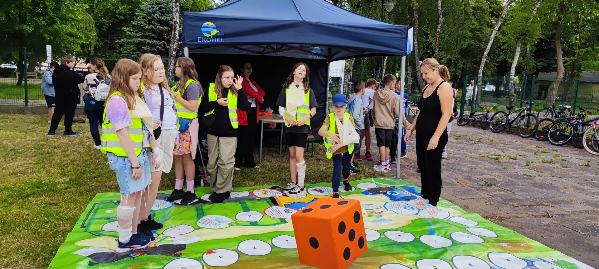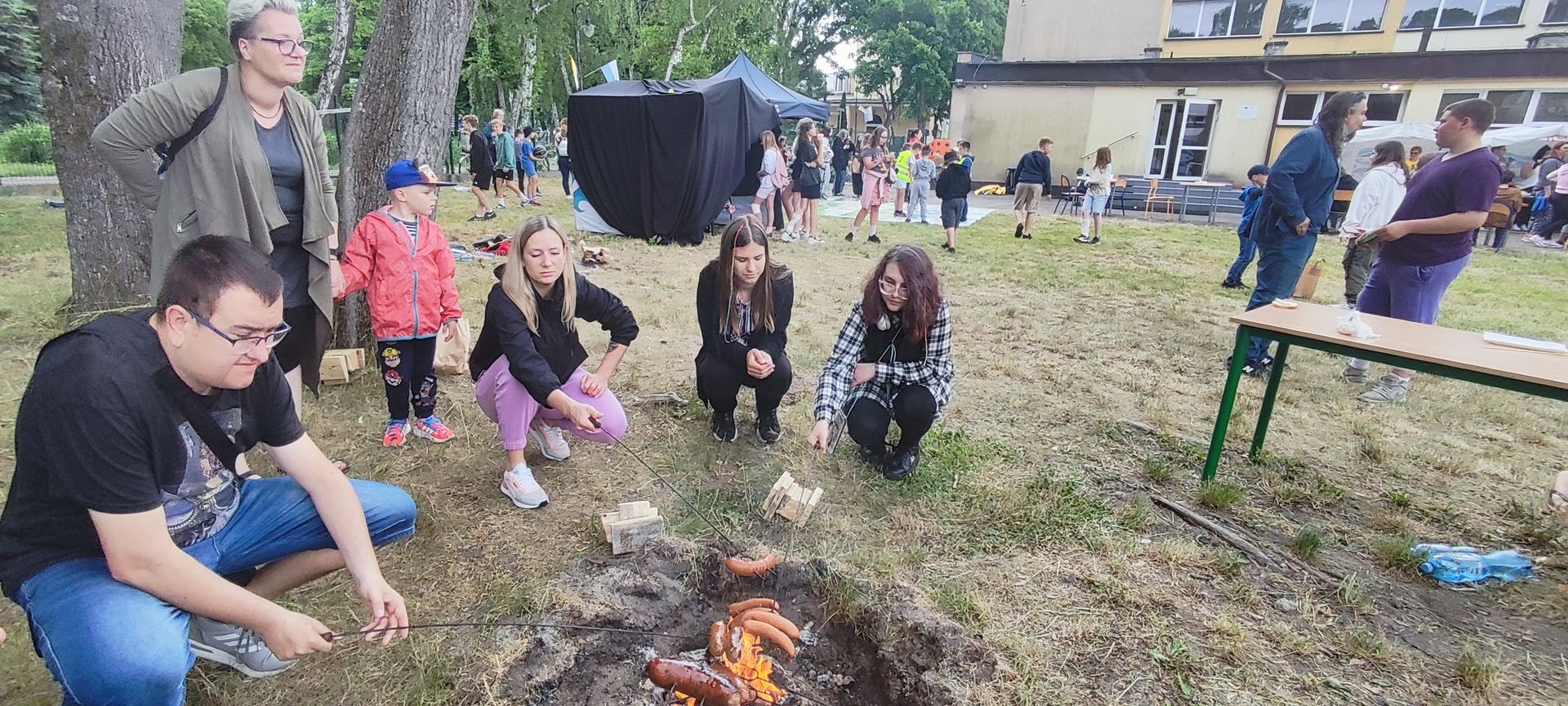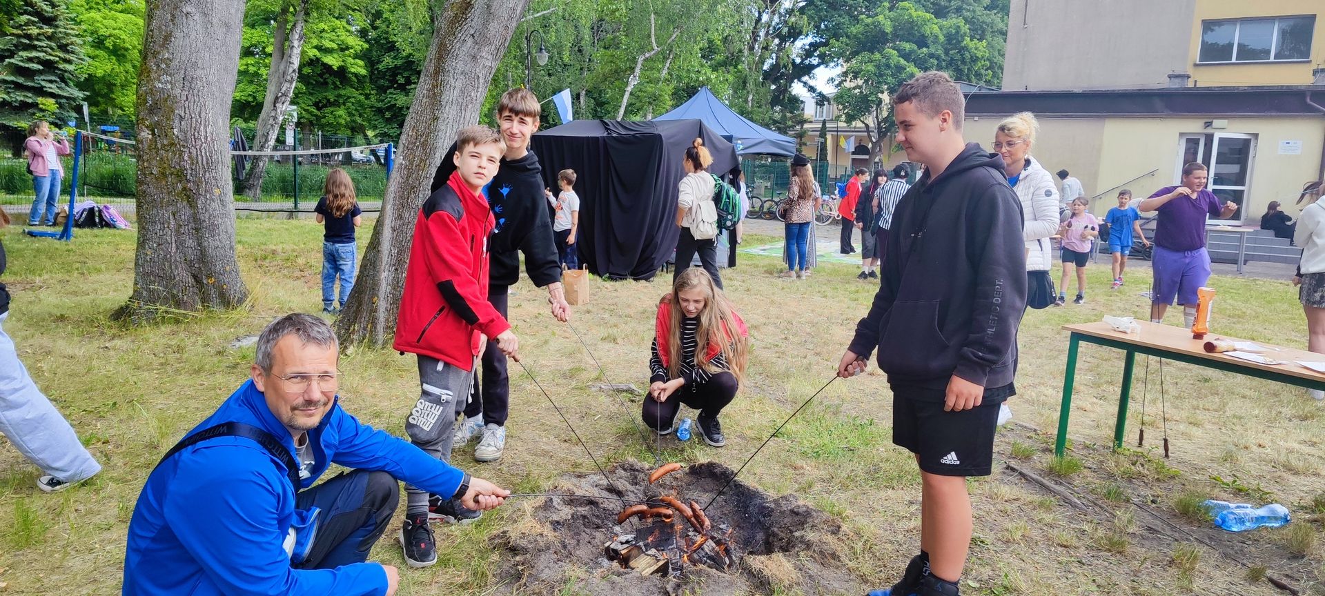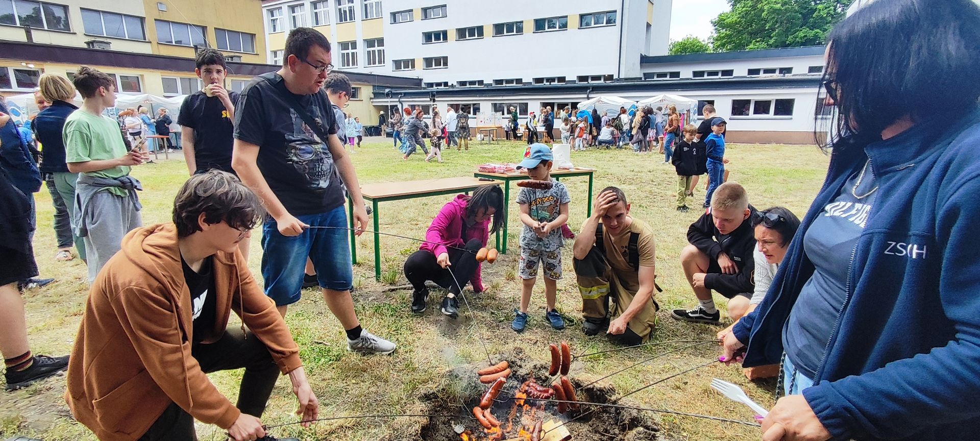 W atmosferze świetnej zabawy, muzyki dziecięcej serwowanej przez DJ Glewicza, uśmiechów na twarzach wszystkich obecnych, dzieci korzystały do woli, do ostatnich minut z wielorakich atrakcji: kolejki do warkoczyków i tatuaży, do malowania buziek, na zamek dmuchany, do zdjęć w FOTOBUDCE trwały i trwały J. Wszyscy zajadali się pysznościami z poszczególnych stoisk RR, ZKP, goframi upieczonymi przez naszych nauczycieli, popcornem i watą cukrową przygotowywaną przez starszych uczniów, ugotowaną zupą vege w kociołku, kiełbaskami pieczonymi przy ognisku a z okienka stołówki pan Rysiu rozdawał lody na patyku J. OSP zaprezentowała się nam w niespodziankowym pokazie tanecznym, odwiedził nas funkcjonariusz policji FOKA, z którą wszyscy chcieli mieć zdjęcie, była karetka pogotowia, do której można było zajrzeć oraz przypomnieć sobie zasady udzielania I pomocy przedmedycznej. EKOHEL jak zawsze zabawiał dzieci ekologiczną grą terenową. Upust inwencji twórczej można było zrealizować na stanowisku cieczy nienewtonowskiej i malowania na folii. W tajemniczym namiocie dwie dobre wróżki czytały przyszłość z linii papilarnych dłoni oraz kryształowej kuli J Każdy zainteresowany wychodził od nich z magicznym talizmanem. Nieopodal można było zagrać w badmintona oraz inne gry sportowe.
