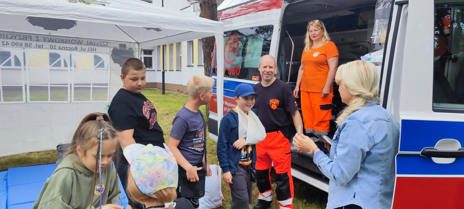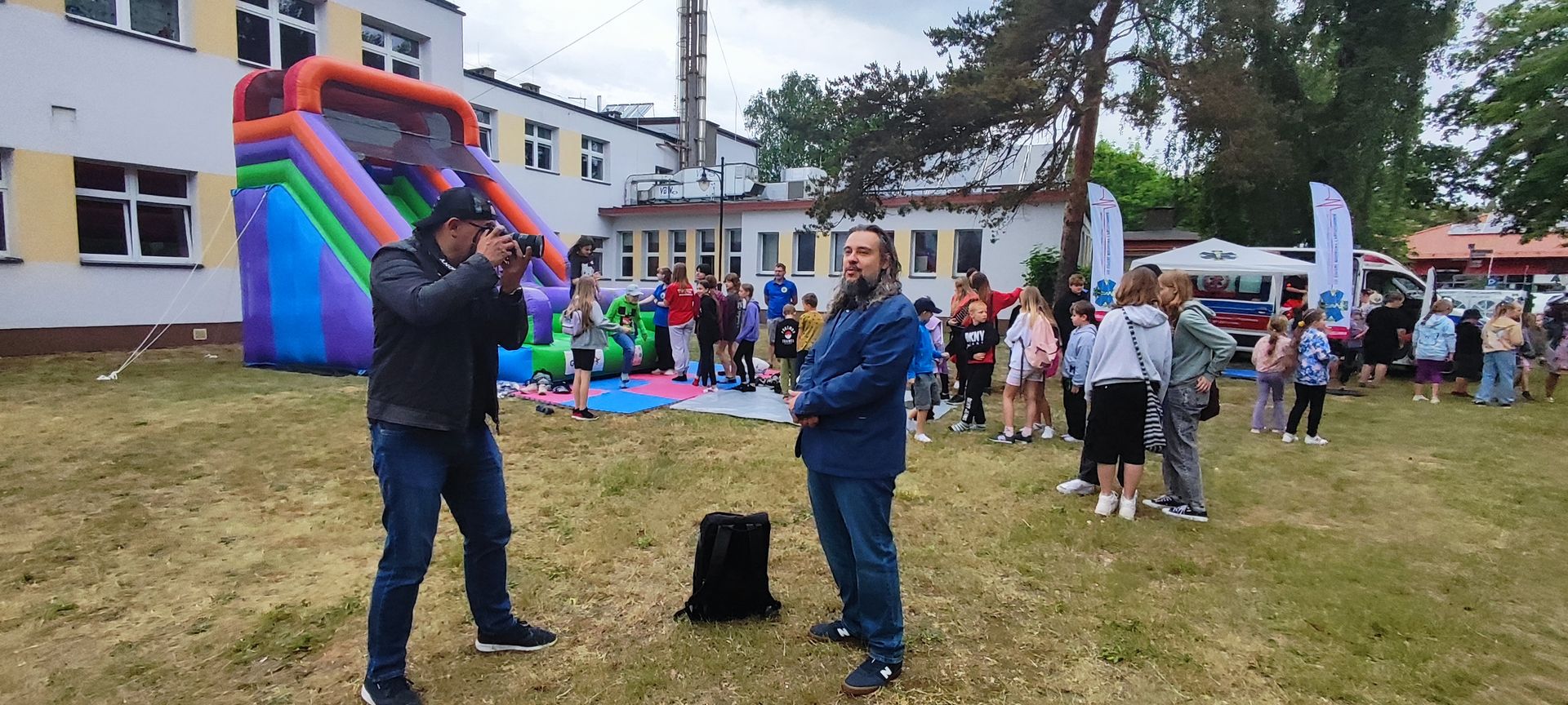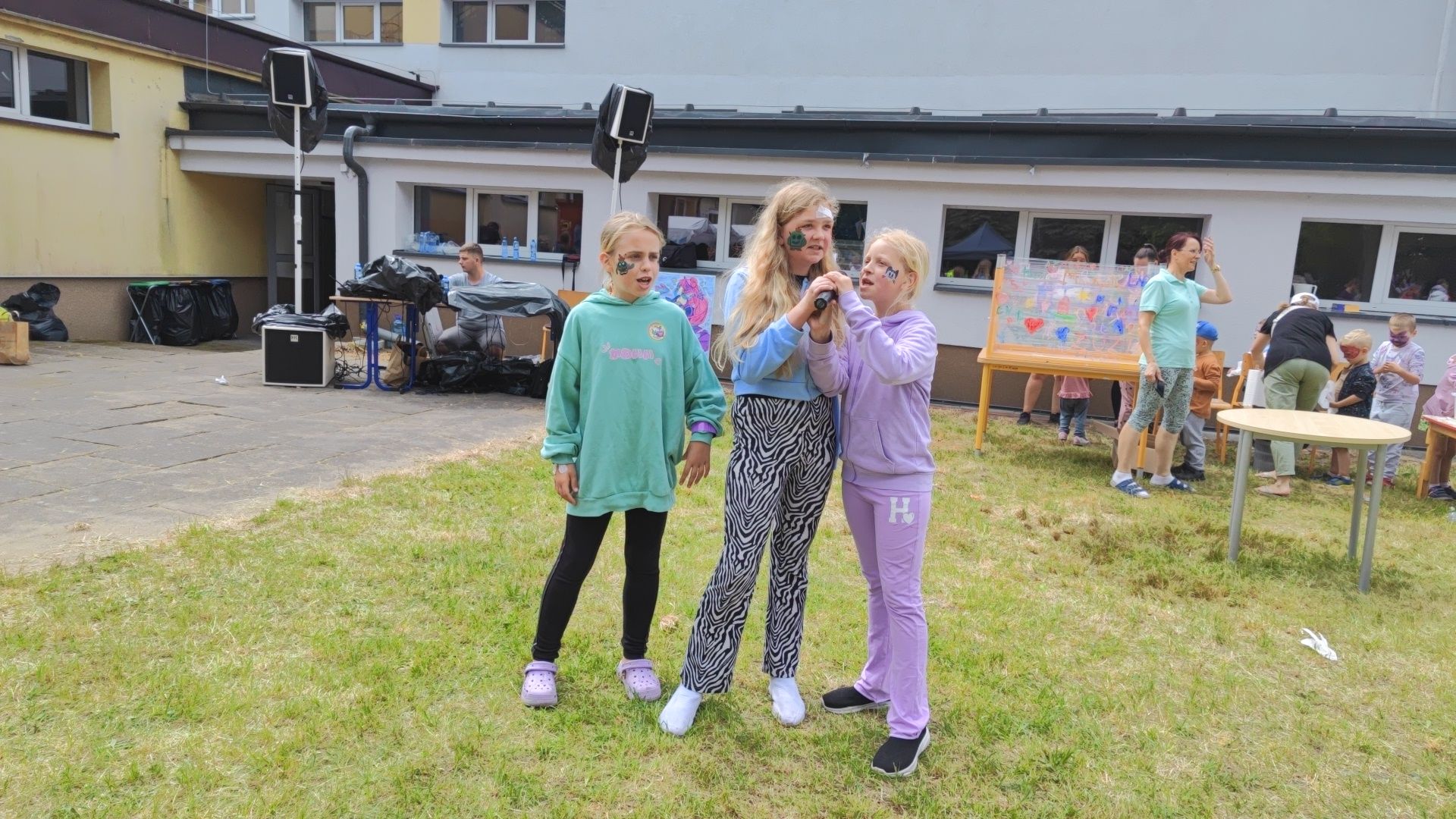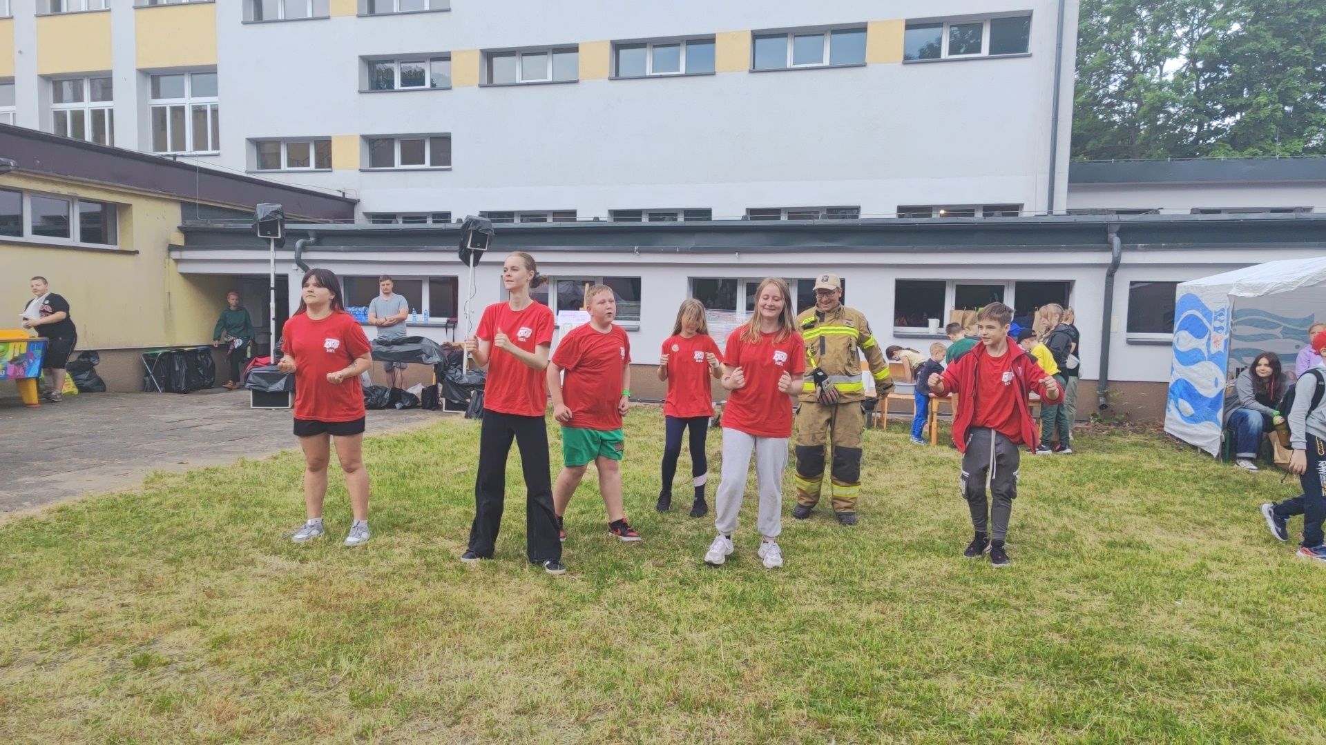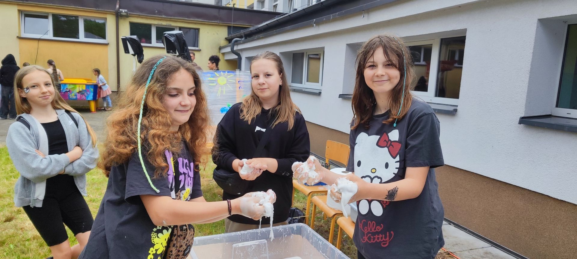 W atmosferze świetnej zabawy, muzyki dziecięcej serwowanej przez DJ Glewicza, uśmiechów na twarzach wszystkich obecnych, dzieci korzystały do woli, do ostatnich minut z wielorakich atrakcji: kolejki do warkoczyków i tatuaży, do malowania buziek, na zamek dmuchany, do zdjęć w FOTOBUDCE trwały i trwały J. Wszyscy zajadali się pysznościami z poszczególnych stoisk RR, ZKP, goframi upieczonymi przez naszych nauczycieli, popcornem i watą cukrową przygotowywaną przez starszych uczniów, ugotowaną zupą vege w kociołku, kiełbaskami pieczonymi przy ognisku a z okienka stołówki pan Rysiu rozdawał lody na patyku J. OSP zaprezentowała się nam w niespodziankowym pokazie tanecznym, odwiedził nas funkcjonariusz policji FOKA, z którą wszyscy chcieli mieć zdjęcie, była karetka pogotowia, do której można było zajrzeć oraz przypomnieć sobie zasady udzielania I pomocy przedmedycznej. EKOHEL jak zawsze zabawiał dzieci ekologiczną grą terenową. Upust inwencji twórczej można było zrealizować na stanowisku cieczy nienewtonowskiej i malowania na folii. W tajemniczym namiocie dwie dobre wróżki czytały przyszłość z linii papilarnych dłoni oraz kryształowej kuli J Każdy zainteresowany wychodził od nich z magicznym talizmanem. Nieopodal można było zagrać w badmintona oraz inne gry sportowe.