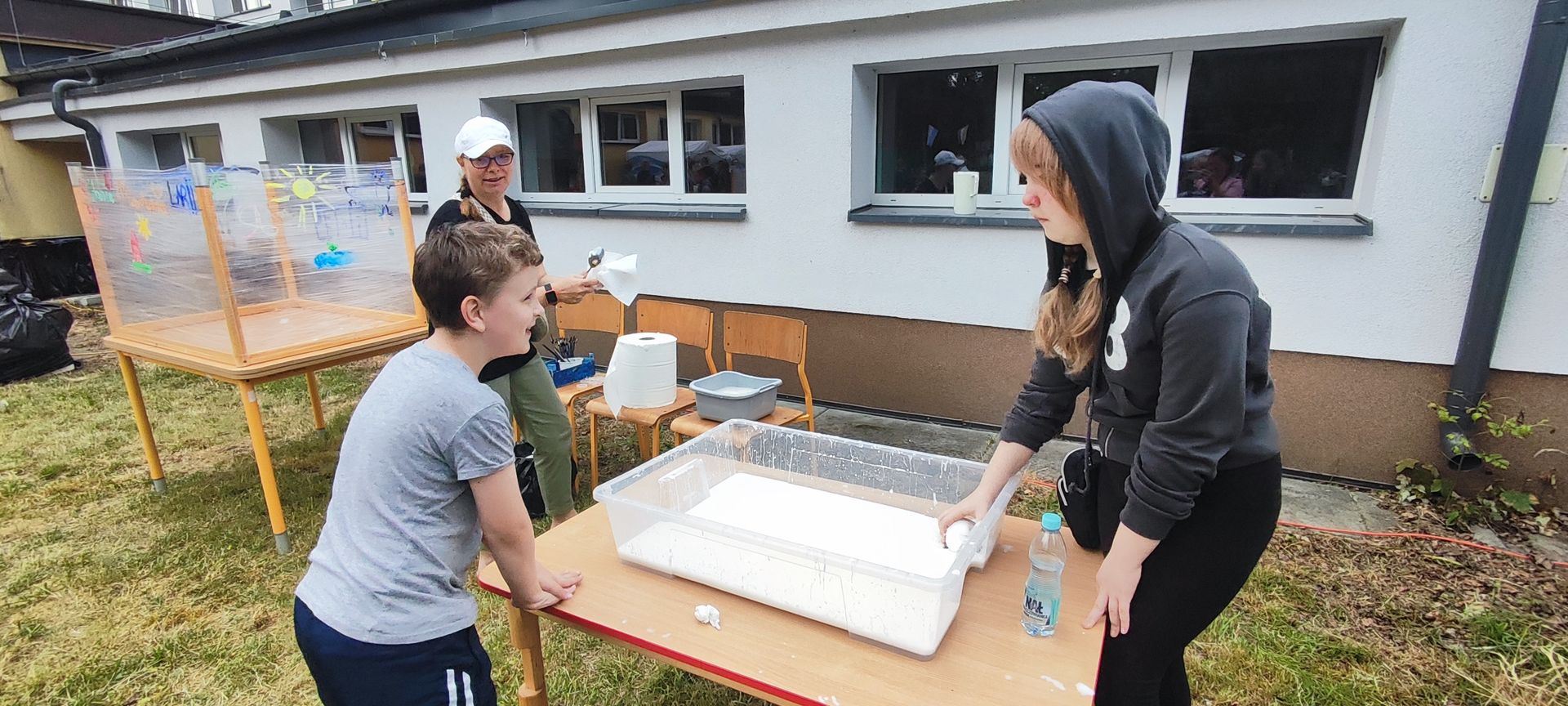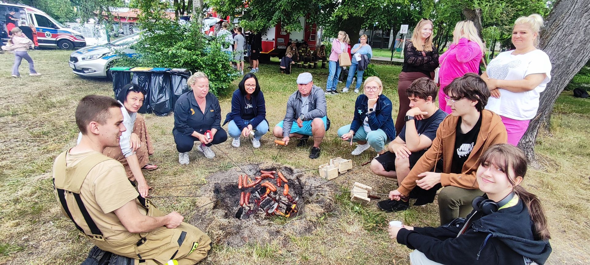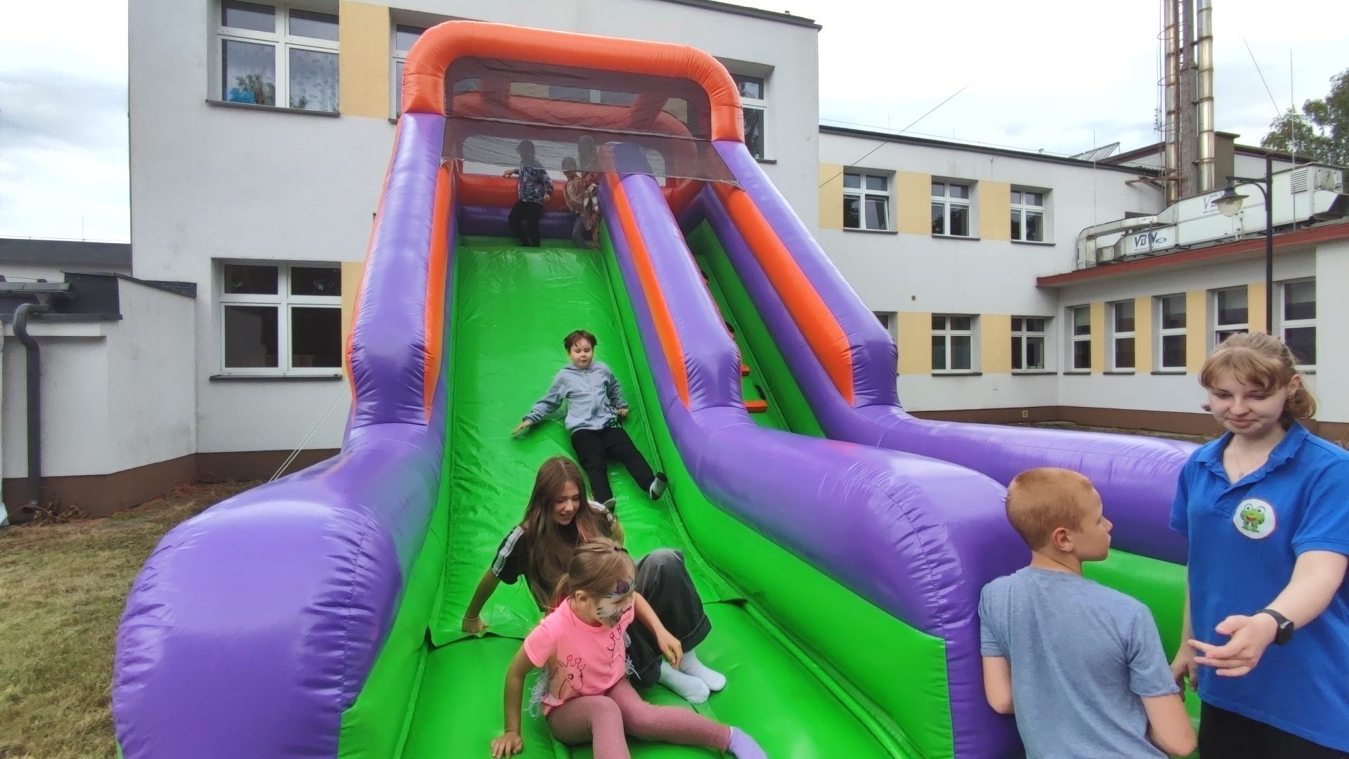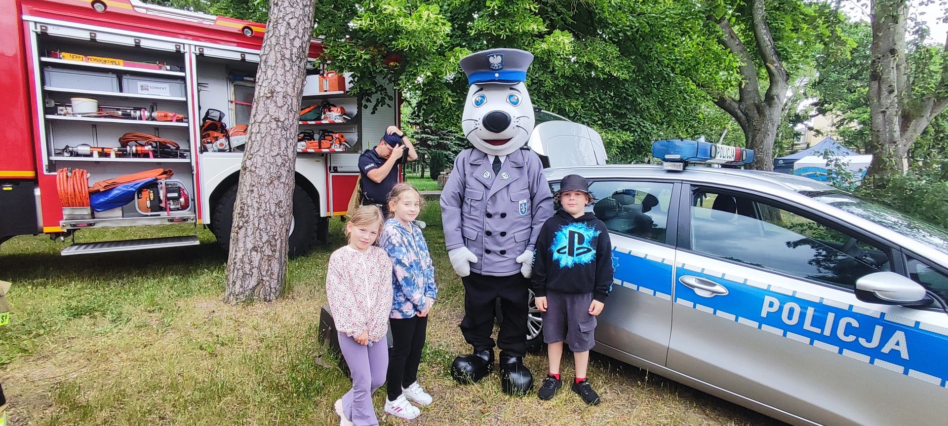 W atmosferze świetnej zabawy, muzyki dziecięcej serwowanej przez DJ Glewicza, uśmiechów na twarzach wszystkich obecnych, dzieci korzystały do woli, do ostatnich minut z wielorakich atrakcji: kolejki do warkoczyków i tatuaży, do malowania buziek, na zamek dmuchany, do zdjęć w FOTOBUDCE trwały i trwały J. Wszyscy zajadali się pysznościami z poszczególnych stoisk RR, ZKP, goframi upieczonymi przez naszych nauczycieli, popcornem i watą cukrową przygotowywaną przez starszych uczniów, ugotowaną zupą vege w kociołku, kiełbaskami pieczonymi przy ognisku a z okienka stołówki pan Rysiu rozdawał lody na patyku J. OSP zaprezentowała się nam w niespodziankowym pokazie tanecznym, odwiedził nas funkcjonariusz policji FOKA, z którą wszyscy chcieli mieć zdjęcie, była karetka pogotowia, do której można było zajrzeć oraz przypomnieć sobie zasady udzielania I pomocy przedmedycznej. EKOHEL jak zawsze zabawiał dzieci ekologiczną grą terenową. Upust inwencji twórczej można było zrealizować na stanowisku cieczy nienewtonowskiej i malowania na folii. W tajemniczym namiocie dwie dobre wróżki czytały przyszłość z linii papilarnych dłoni oraz kryształowej kuli J Każdy zainteresowany wychodził od nich z magicznym talizmanem. Nieopodal można było zagrać w badmintona oraz inne gry sportowe.