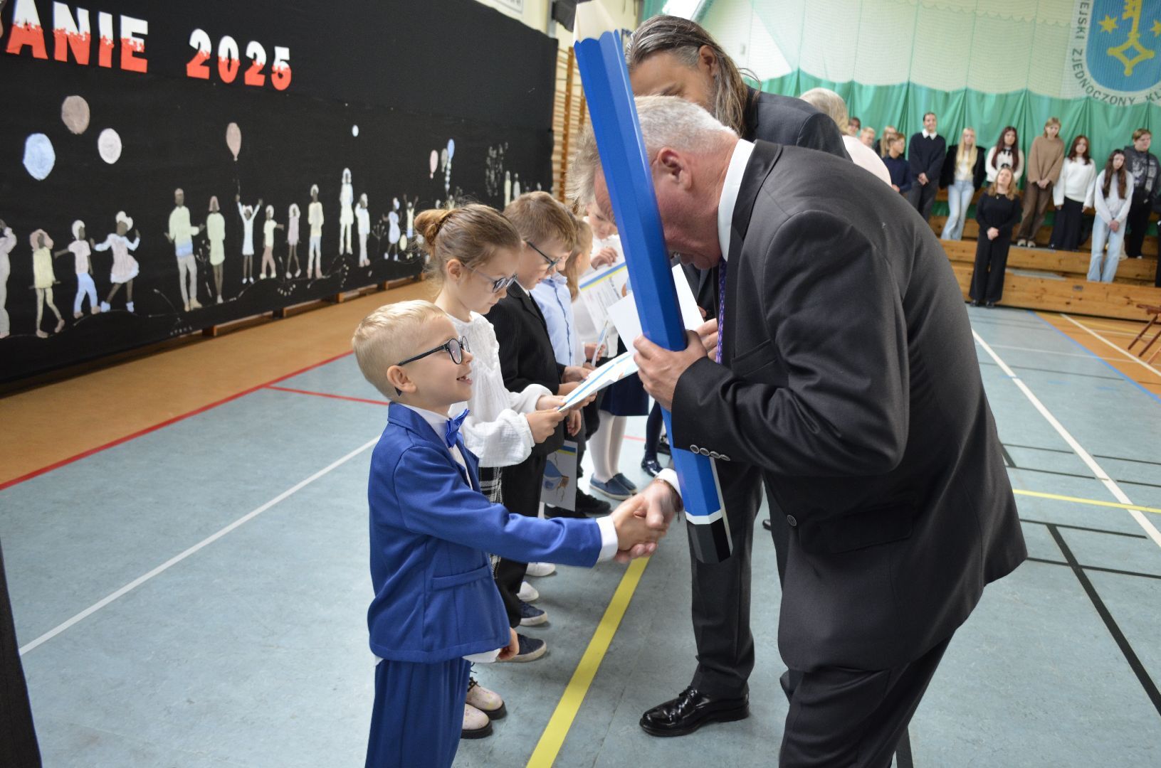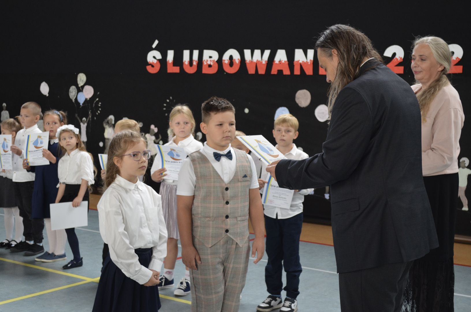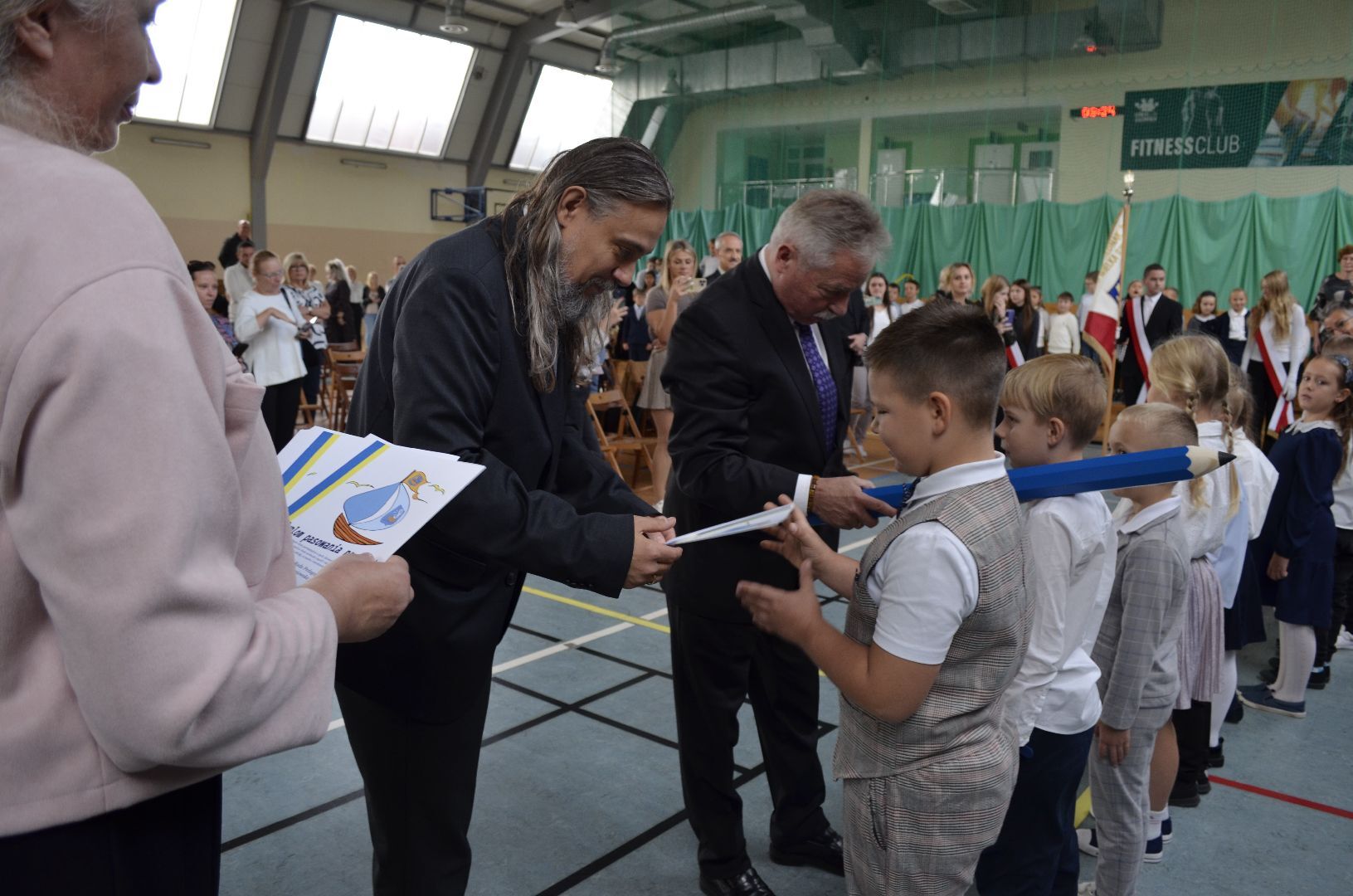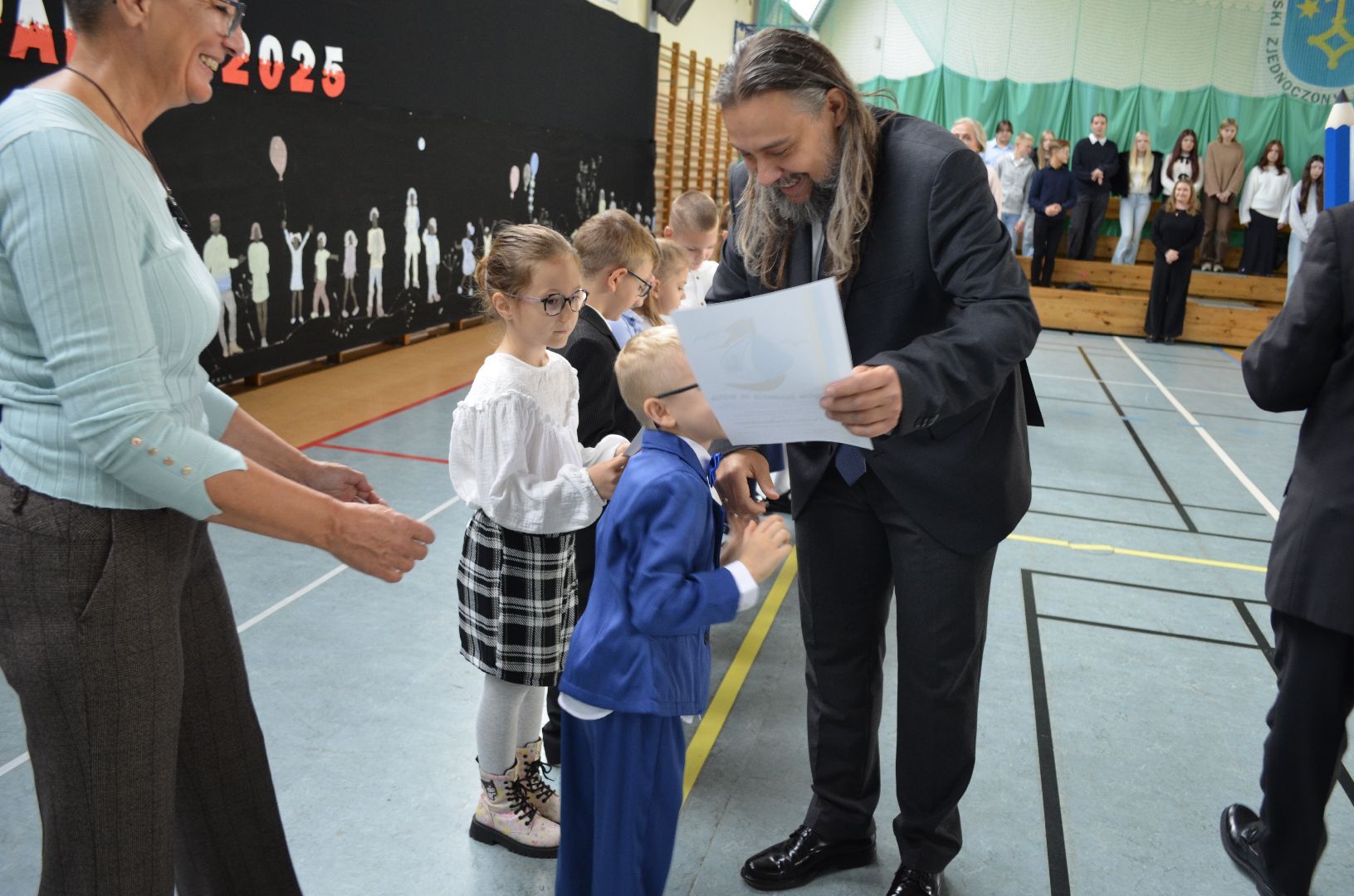 Po oficjalnej części, na której odbyło się ich ślubowanie na sztandar szkoły, oraz pasowanie, którego dokonał Burmistrz Miasta Hel Pan Mirosław Wądołowski - dzieci otrzymały z rąk Pana Dyrektora Dawida Migacza piękne pamiątkowe dyplomy.