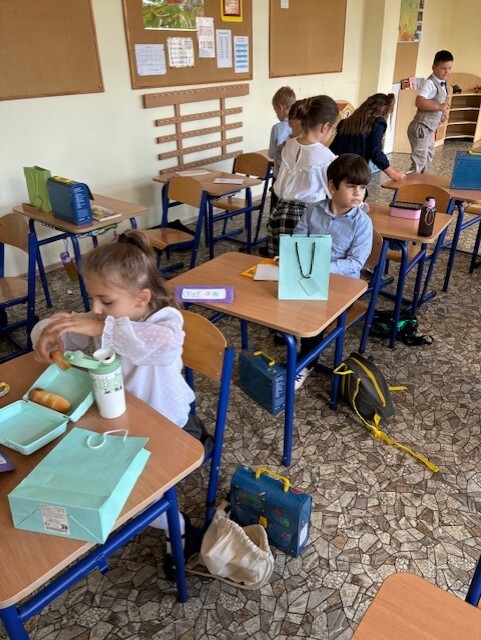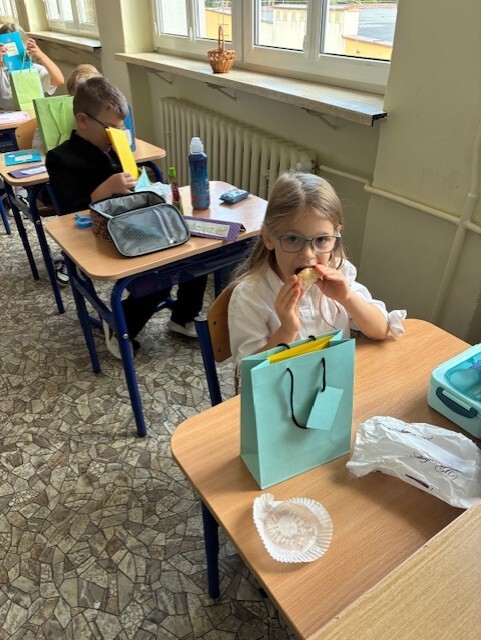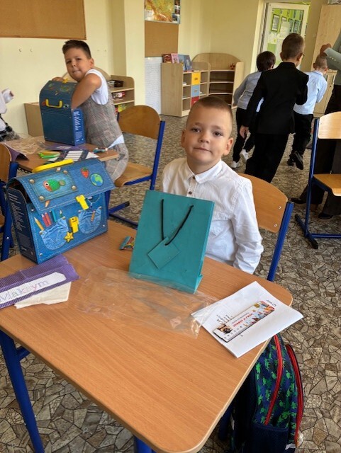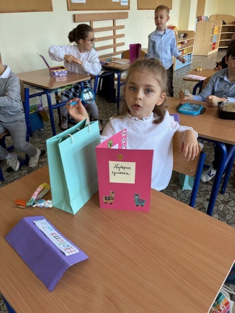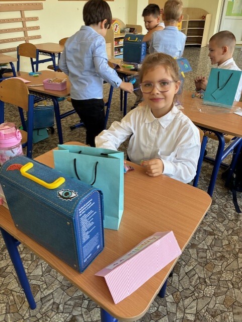 To nie był koniec niespodzianek. W naszej sali lekcyjnej czekały "błękitne kuferki skarbów", które przygotowali rodzice. Na koniec odwiedziła nas Pani Agnieszka Górska, Przewodnicząca Rady Rodziców Szkoły Podstawowej, z pięknymi życzeniami