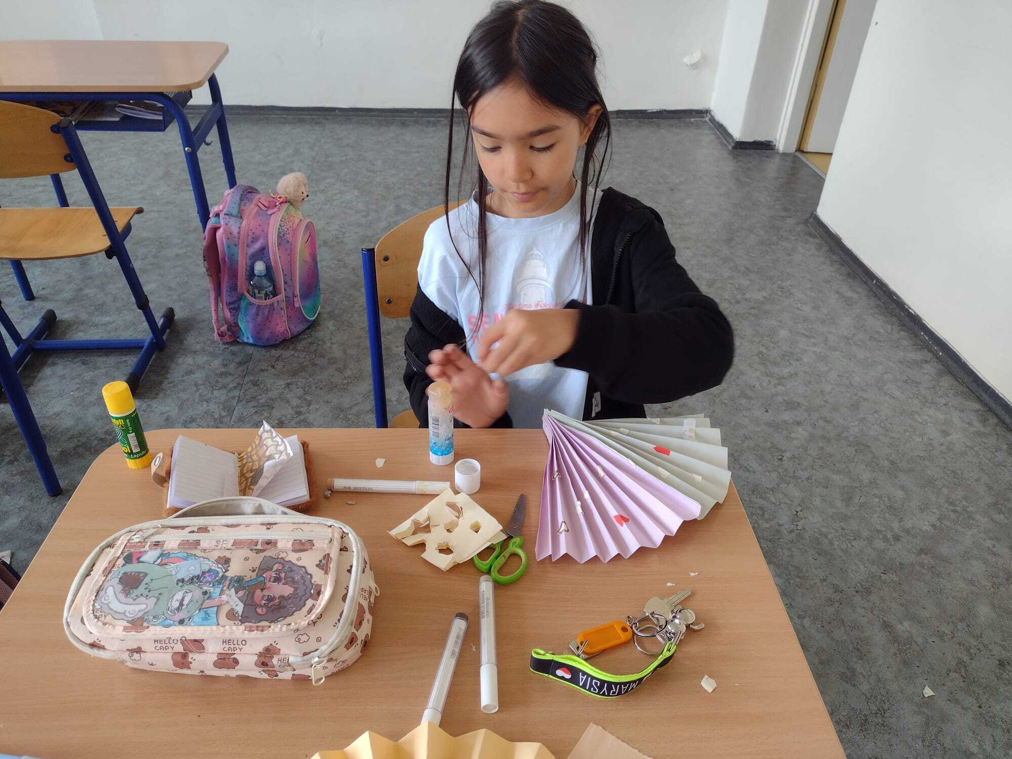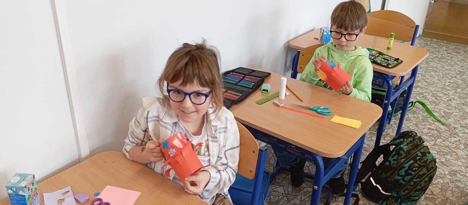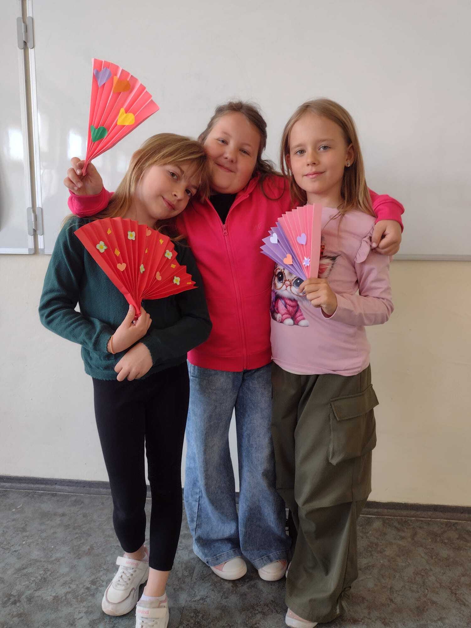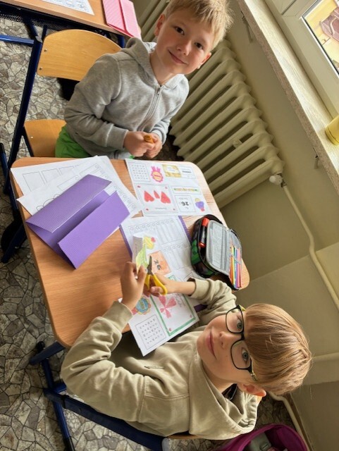Z okazji Dnia Mamy uczniowie klasy 2A z wielkim zaangażowaniem przygotowali wyjątkowe prace plastyczne. Każde dziecko wykonało kolorowy wachlarz, ozdobiony własnoręcznie wyciętymi kwiatkami i serduszkami. Uczniowie samodzielnie składali papier w harmonijkę, dobierali kolory oraz precyzyjnie wycinali i przyklejali ozdoby. Praca nad prezentami sprawiła dzieciom wiele radości i była doskonałą okazją do rozwijania zdolności manualnych. Gotowe wachlarze były piękne, kolorowe i pełne dziecięcej miłości – idealne, by wywołać uśmiech na twarzy każdej Mamy!