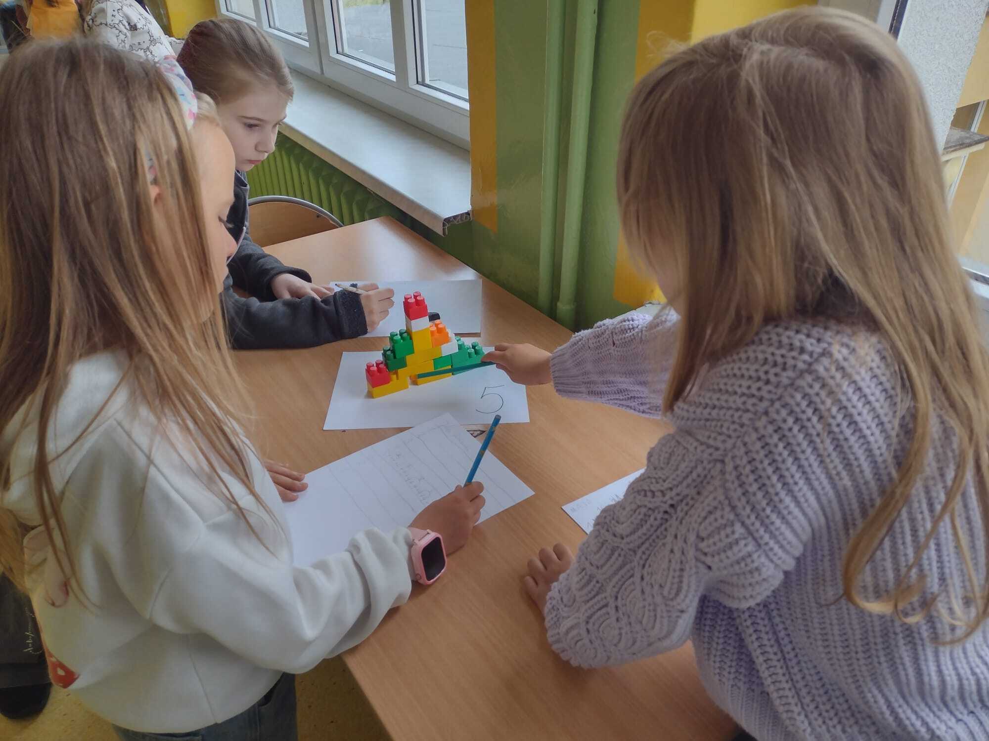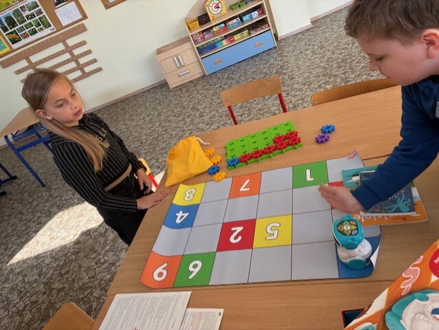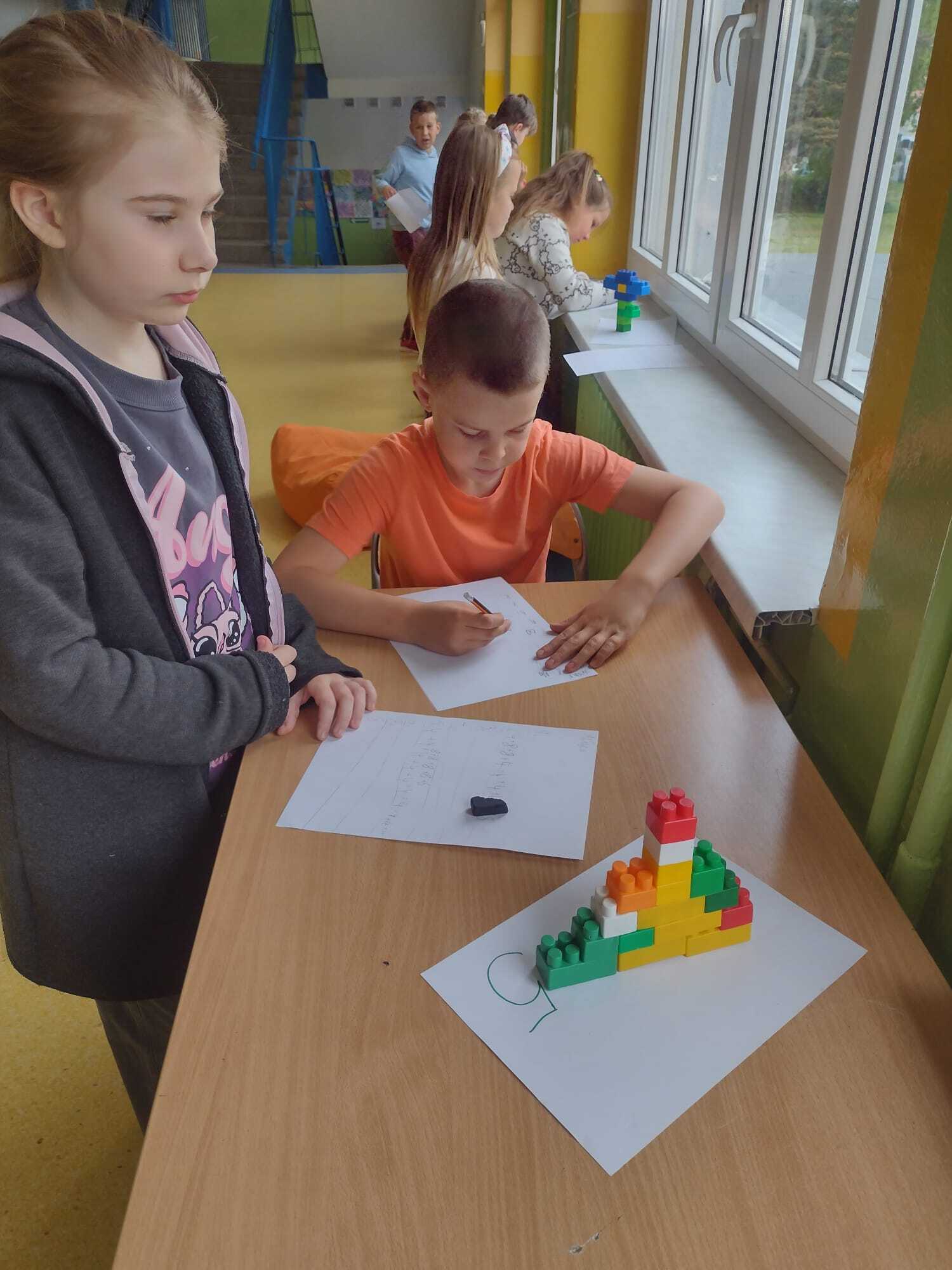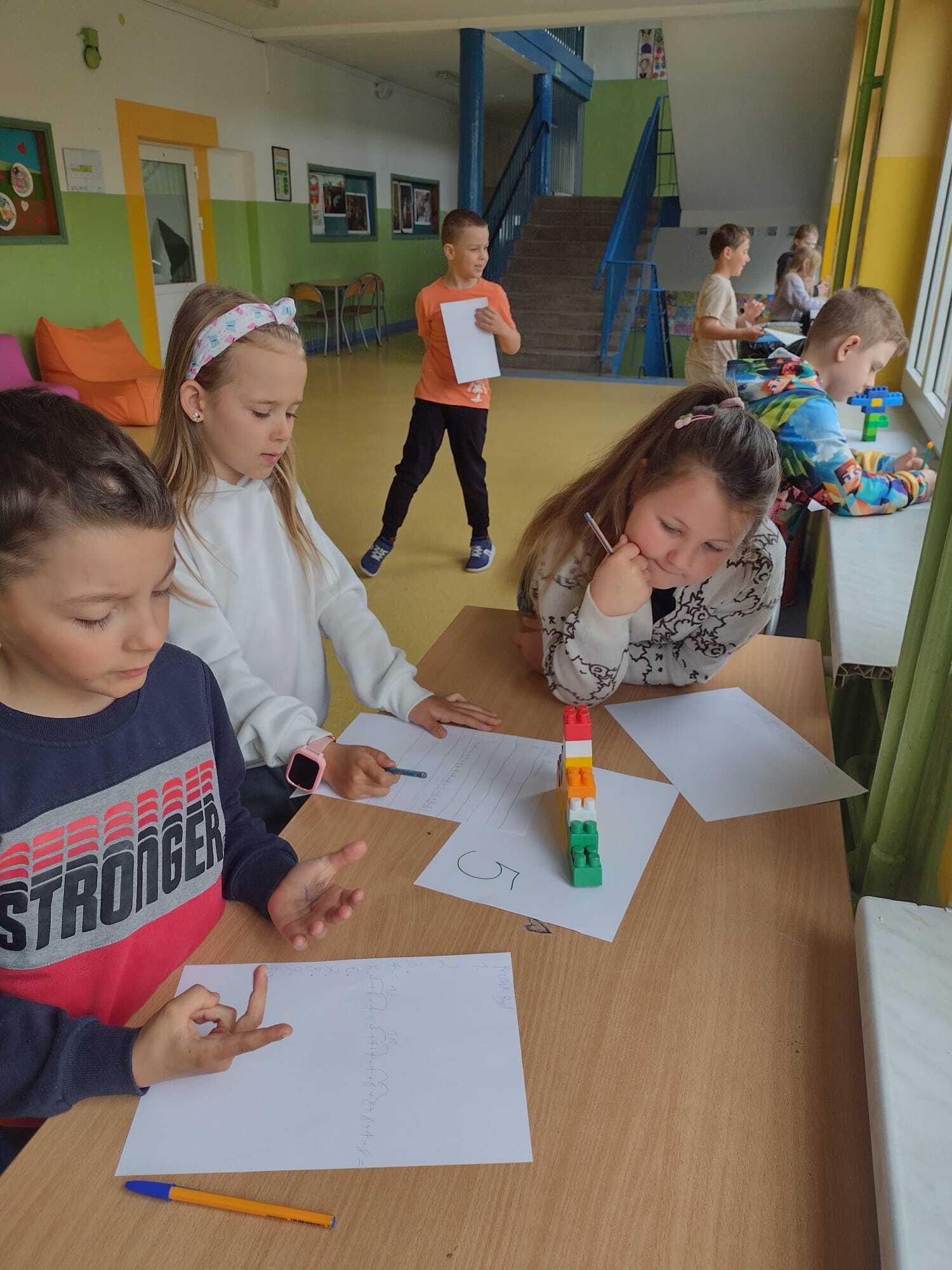 Uczniowie klasy 2A udowodnili, że matematyka może być ciekawa, twórcza i pełna ruchu! Zajęcia rozpoczęli od obejrzenia i rozwiązania zadań z podręcznika – tym razem pomogli Natalce w ustnych obliczeniach. Następnie przeszli do działania praktycznego: kolorowe konstrukcje z klocków zostały umieszczone na ponumerowanych kartkach w różnych miejscach sali i na korytarzu. Zadaniem każdego ucznia było policzyć, z ilu wypustek składa się dana konstrukcja, zapisać wynik i przejść do kolejnej stacji. Dzieci dodawały, mnożyły, sprawdzały swoje wyniki i dzieliły się pomysłami. Było dużo ruchu, śmiechu i matematycznego myślenia! Uczniowie świetnie współpracowali, a przy okazji doskonalili umiejętności liczenia i logicznego myślenia. To była nauka przez zabawę w najlepszym wydaniu!
