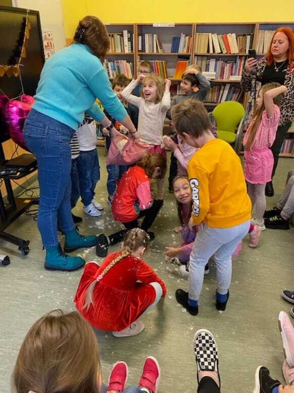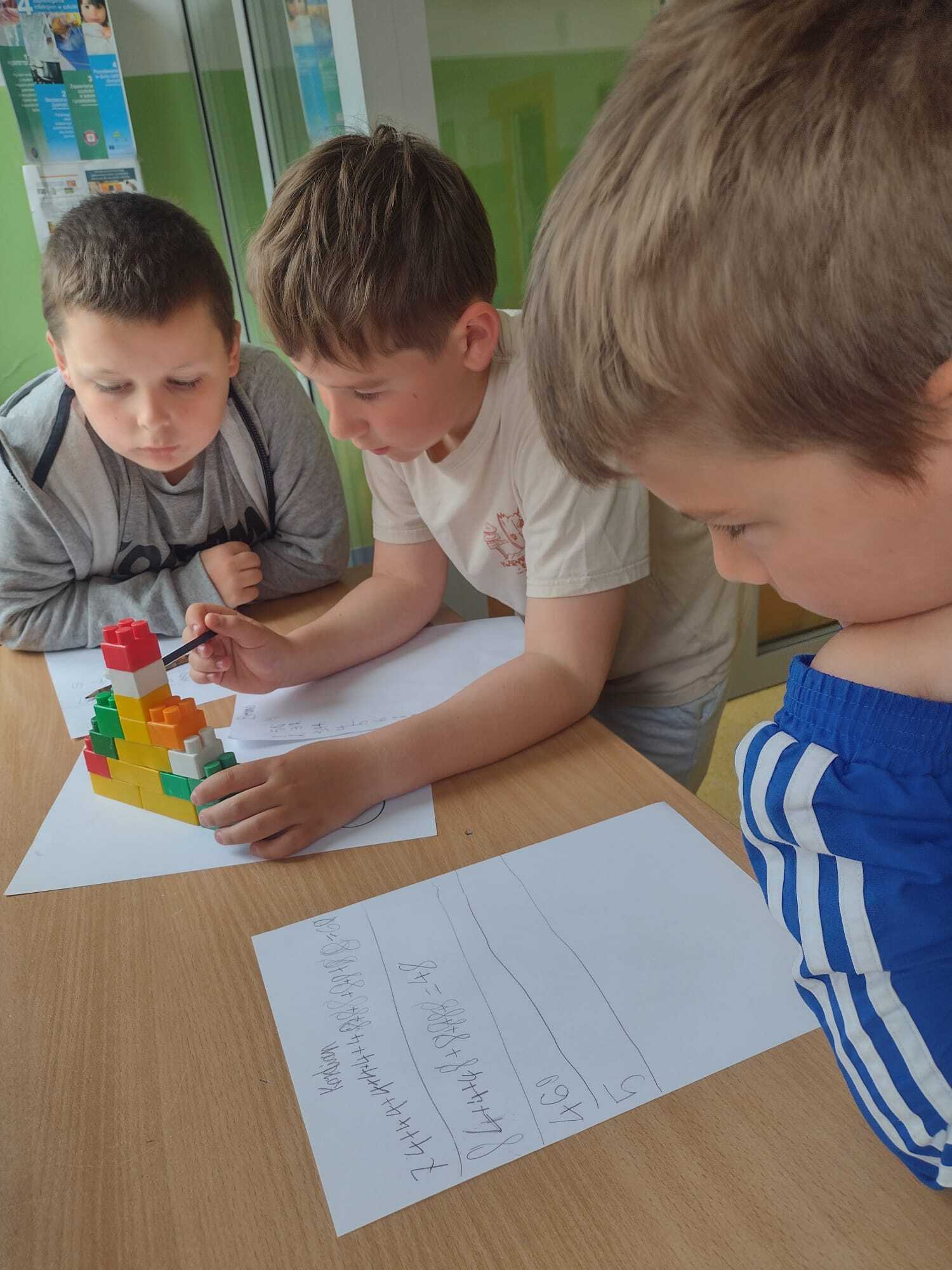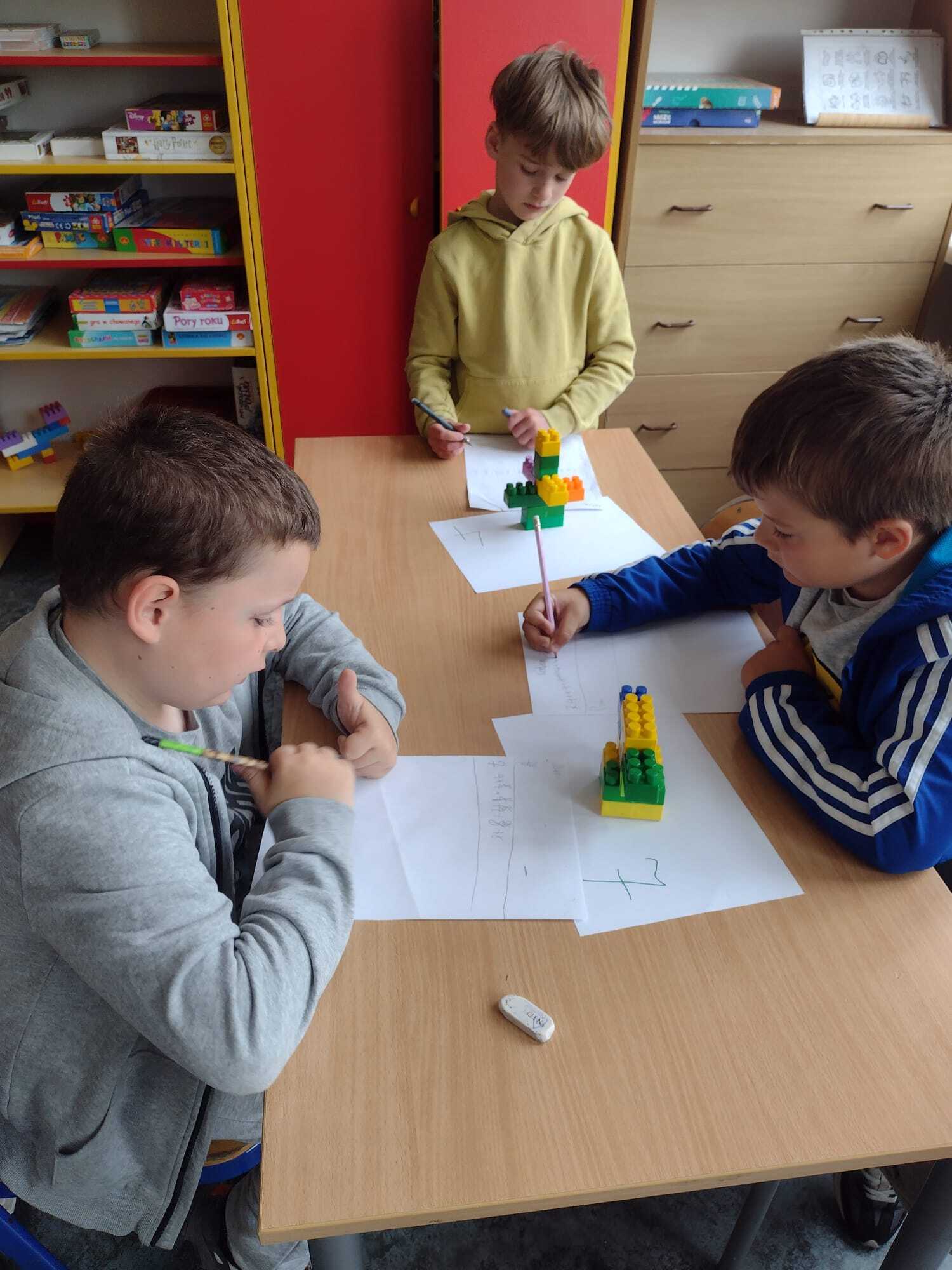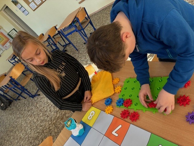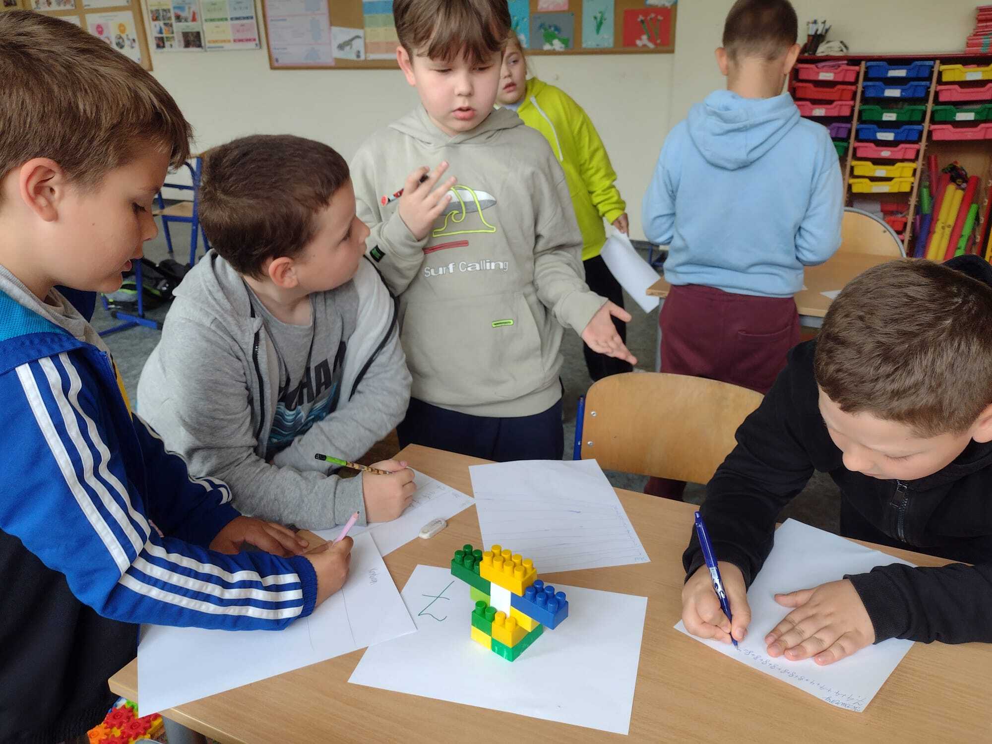 Uczniowie klasy 2A udowodnili, że matematyka może być ciekawa, twórcza i pełna ruchu! Zajęcia rozpoczęli od obejrzenia i rozwiązania zadań z podręcznika – tym razem pomogli Natalce w ustnych obliczeniach. Następnie przeszli do działania praktycznego: kolorowe konstrukcje z klocków zostały umieszczone na ponumerowanych kartkach w różnych miejscach sali i na korytarzu. Zadaniem każdego ucznia było policzyć, z ilu wypustek składa się dana konstrukcja, zapisać wynik i przejść do kolejnej stacji. Dzieci dodawały, mnożyły, sprawdzały swoje wyniki i dzieliły się pomysłami. Było dużo ruchu, śmiechu i matematycznego myślenia! Uczniowie świetnie współpracowali, a przy okazji doskonalili umiejętności liczenia i logicznego myślenia. To była nauka przez zabawę w najlepszym wydaniu!