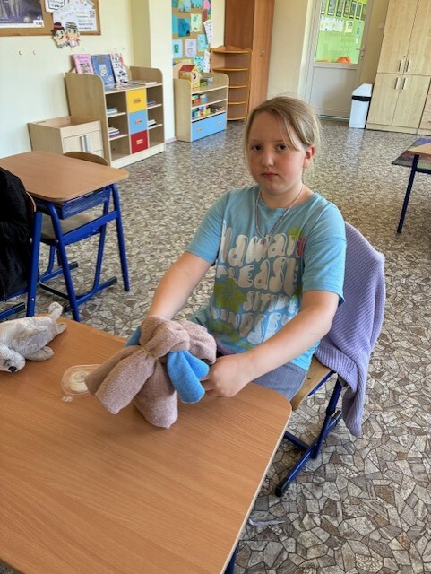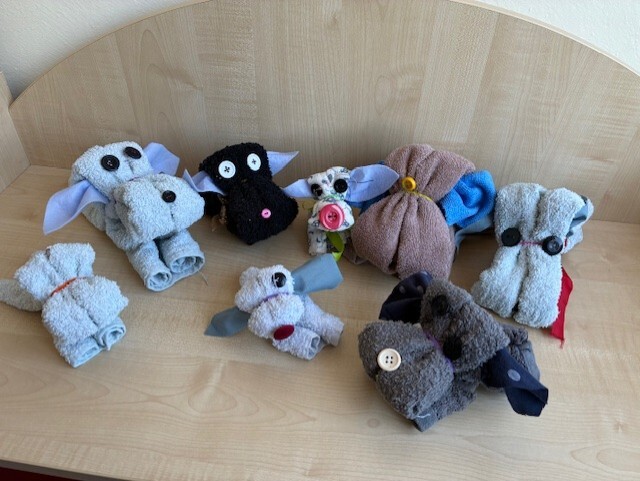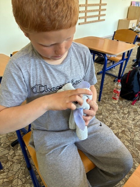 W maju odkryliśmy ciekawe zastosowanie ręcznika do rąk. Pomogła nam w tym instrukcja wykonania ,,Pieska z ręcznika" oraz materiały dodatkowe: gumki recepturki, guziczki, wstążeczka, tkanina oraz igła i nici.