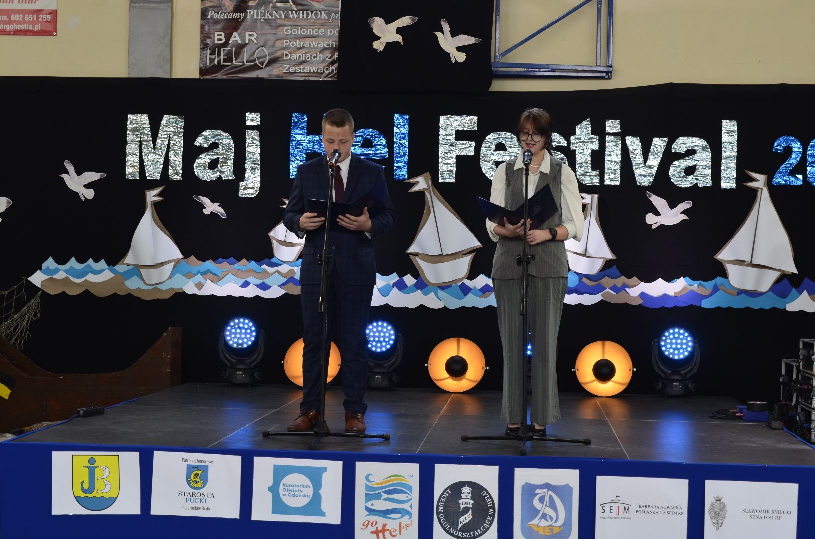 Oczywiście żaden żaglowiec nie popłynie bez wsparcia wiatrów i kapitalnej załogi. Maj Hel Festiwal zyskał wielu sprzymierzeńców, wśród nich głos zabrała ministra edukacji, Pani Barbara Nowacka, przesyłając specjalny list dobrych życzeń i podziękowań do wszystkich związanych z konkursem. Nie zapomniały o nas władze powiatu i samorządów i dobrym słowem wsparli festiwal: wicestarosta powiatu puckiego - Tomasz Herrmann, burmistrz sąsiadującej Jastarni - Bartosz Selin i oczywiście współgospodarz uroczystości burmistrz - Mirosław Wądołowski. Honorowy patronat nad konkursem objął również senator Sławomir Rybicki. Nie umknęło nam, że wśród gości dopingowali nam także: komendant 115 Szpitala Wojskowego w Helu - pułkownik Paweł Serafin, ksiądz proboszcz parafii pod wezwaniem Bożego Ciała w Helu - ojciec Ireneusz Główczewski, prezes EKOHELU, pan Marek Dykta, podinspektor ds. promocji miasta Helu - pani Elżbieta Marchlewska, Radni miasta Helu, niezawodni partnerzy z ZKP oddział w Helu i wielu niewymienionych a aktywnie nam towarzyszących. Wiemy, że Żaglowce płyną siłą wielu umysłów i rąk, dlatego ślemy Wam kapitański salut i wiele dobrych myśli.