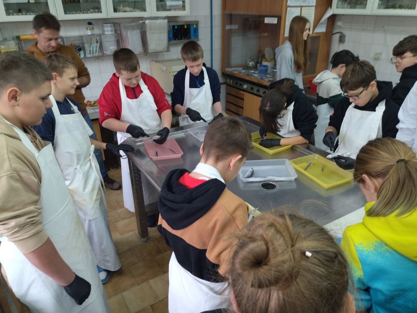 W piątek 12 tycznia gościliśmy w ZSO w Helu klasę siódmą ze Szkoły Podstawowej w Darżlubiu. Zaprzyjaźnioną młodzież i sympatycznych opiekunów podejmowali uczniowie klasy siódmej, którzy mierzyli się z obowiązkami gospodarzy w sytuacji rewizyty. Zaplanowane śniadanie i słodkie co nieco (tu warto wspomnieć o specjalnych babeczkach z dedykacjami, które przywieźli nasi Goście) stanowiły rozgrzewkę przed dniem pełnym edukacyjnej przygody. Wspólnie uczestniczyliśmy w zajęciach warsztatowych w Stacji Morskiej. Najpierw awifauna, uczyliśmy się rozpoznawać ptaki morskie, aby potem móc je według wzoru narysować-bohaterką szkiców stała się kaczka lodówka. Północne wiatry przepędzały nas znad zatoki, ale w chwilowym styczniowym słońcu obejrzeliśmy karmienie fok, którym ziąb nie przeszkadzał baraszkować i chlapać. Przed nami została część najpoważniejsza, gdzie podzieleni ma grupy uczyliśmy się fizjologii nurkowania i rybiej anatomii. Po teoretycznych wstępach przystąpiliśmy do dzieła: mierzyliśmy tętno i poziom natlenowania krwi podczas nurkowania …z głową w misce, a tuż obok dokonywaliśmy prawdziwej sekcji ryby. Oczywiście potem zmiana. Towarzyszyły nam różne emocje, od strachu i zmieszania po adrenalinę i entuzjazm prób naukowych. Panie Monika i Justyna, edukatorki ze Stacji Morskiej, pomagały przezwyciężyć lęki i dopingowały ciekawskim amatorom biologii i fizyki. Wspólne lekcje spędziliśmy niewątpliwie konstruktywnie, zabrakło nam czasoprzestrzeni, by po prostu ze sobą pobyć, dać szansę wzrosnąć znajomościom i sympatiom. Gościnność nie jest sztuką łatwą, wymaga wyobraźni i empatii, umiejętności planowania i obycia towarzyskiego. Wnioskujemy, że jeszcze wiele przed nami.