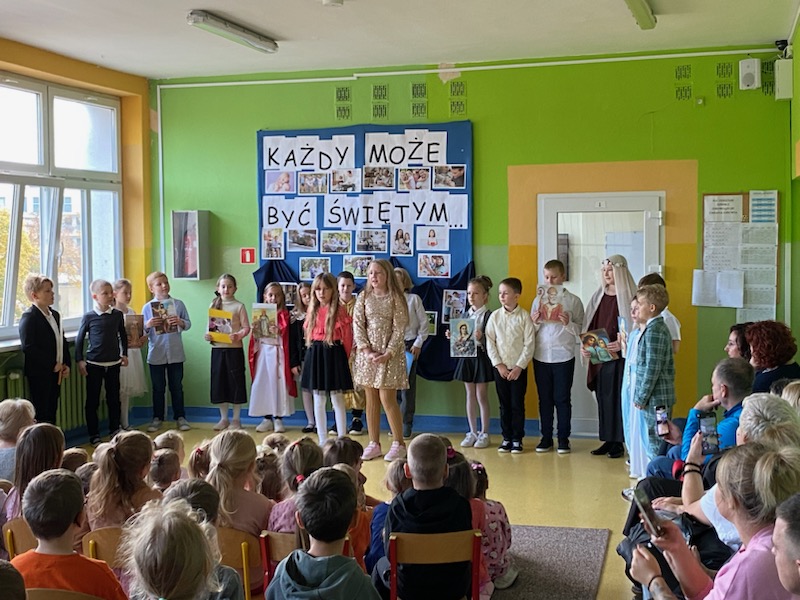 Pod takim hasłem klasy 3a i 3b przygotowały przedstawienie, w którym przybliżyły dzieciom z przedszkola i klas 1-2 postacie niektórych świętych. Uczniowie przedstawili ich krótkie życiorysy, prezentując jednocześnie stroje, w jakie się przebrali.