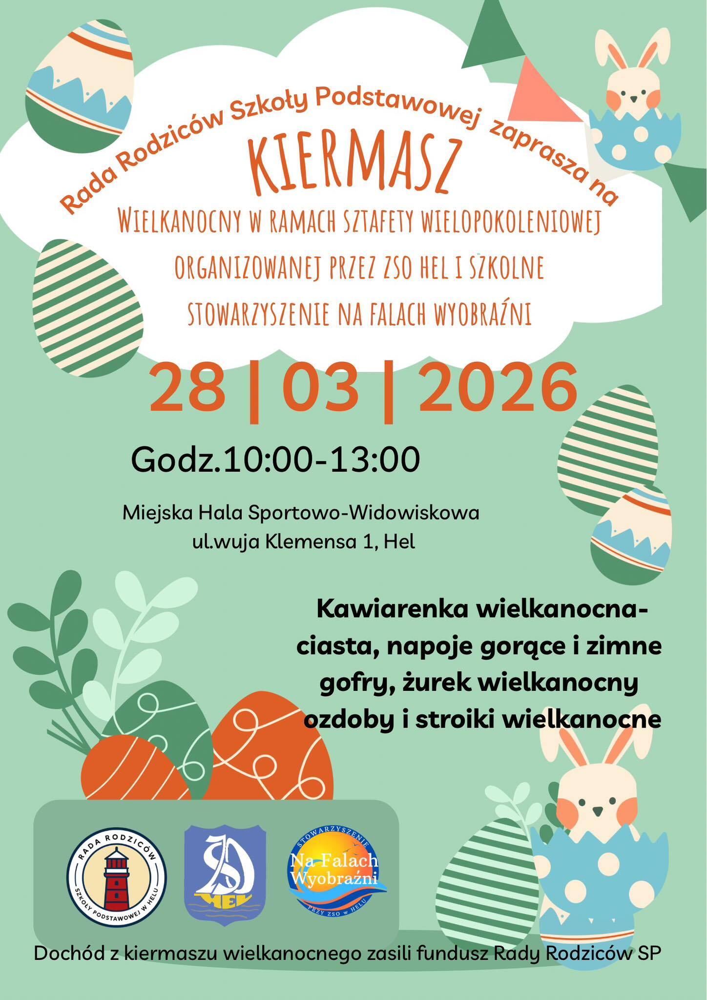 Rada Rodziców Szkoły Podstawowej serdecznie zaprasza wszystkich Państwa na KIERMASZ WIELKANOCNY w ramach sztafety wielopokoleniowej organizowanej przez ZSO w Helu i szkolne stowarzyszenie NA FALACH WYOBRAŹNI