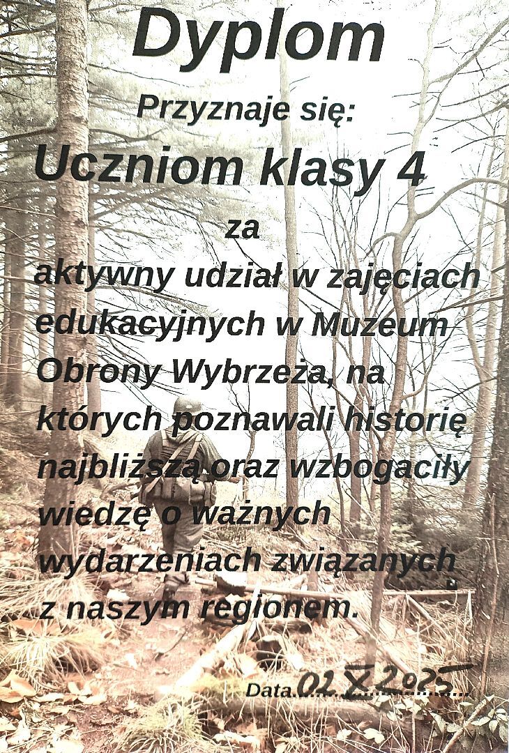 NOWY ROK – NOWE PROJEKTY… ZACZĘLIŚMY OD AKCJI PRZEPROWADZONEJ WSPÓLNIE Z MUZEUM OBRONY WYBRZEŻA (PANI MAJU – UKŁONY I BUZIAKI!!!). DZIECI Z IV KLASY UCZESTNICZYŁY W LEKCJI MUZEALNEJ O NASZYCH BOHATERSKICH OBROŃCACH, PO KTÓREJ PRZYSTĄPIŁY DO KONKURSU SPRAWDZAJĄCEGO WIEDZĘ NA TEMAT 32 DNI… WYSZŁO PIĘKNIE, A FINAŁEM AKCJI BYŁO WRĘCZENIE UCZNIOM DYPLOMU I DROBNYCH UPOMINKÓW ZWIĄZANYCH Z TEMATEM, PODCZAS UROCZYSTOŚCI 02 PAŹDZIERNIKA W NASZEJ SZKOLE.
