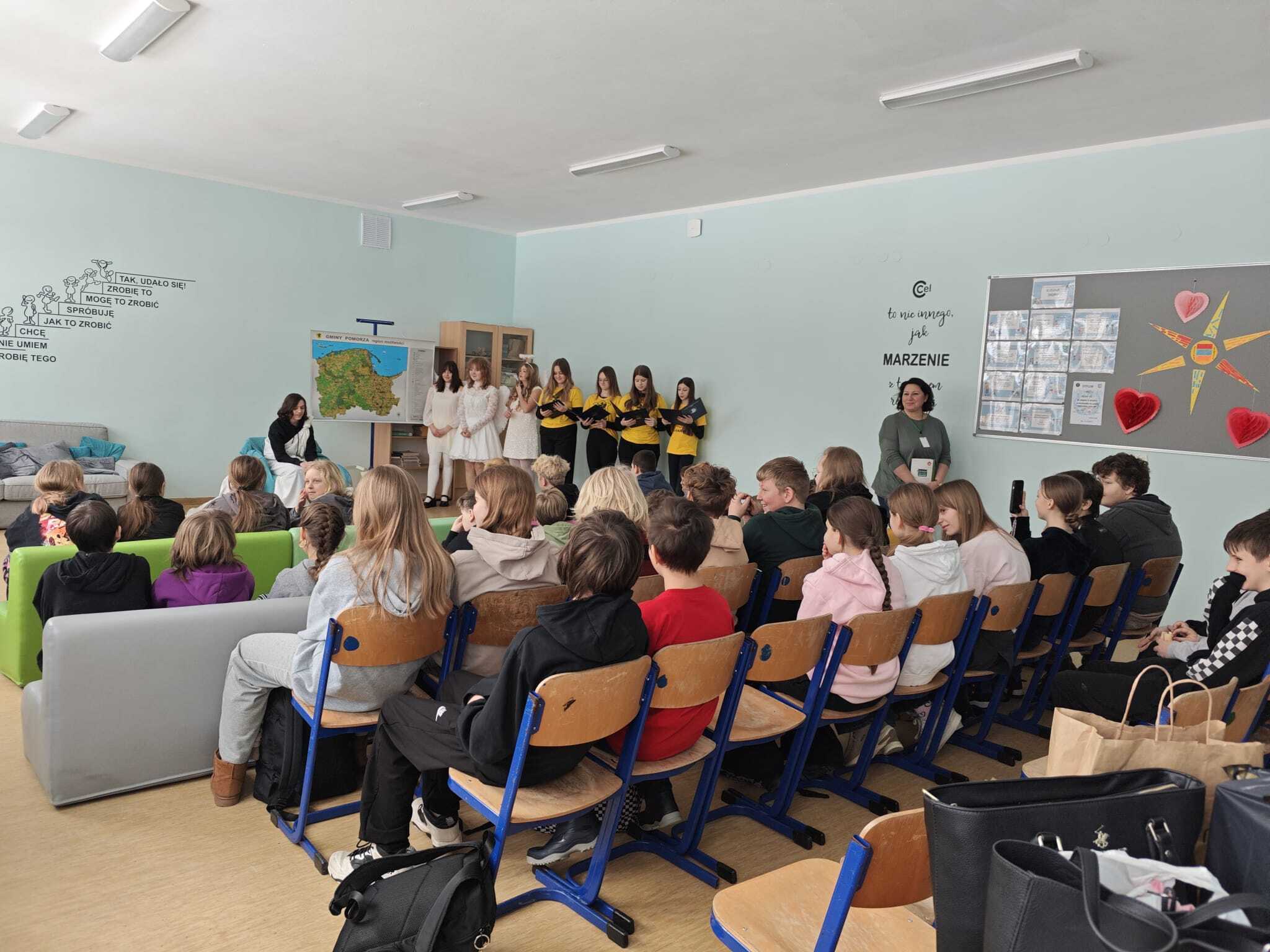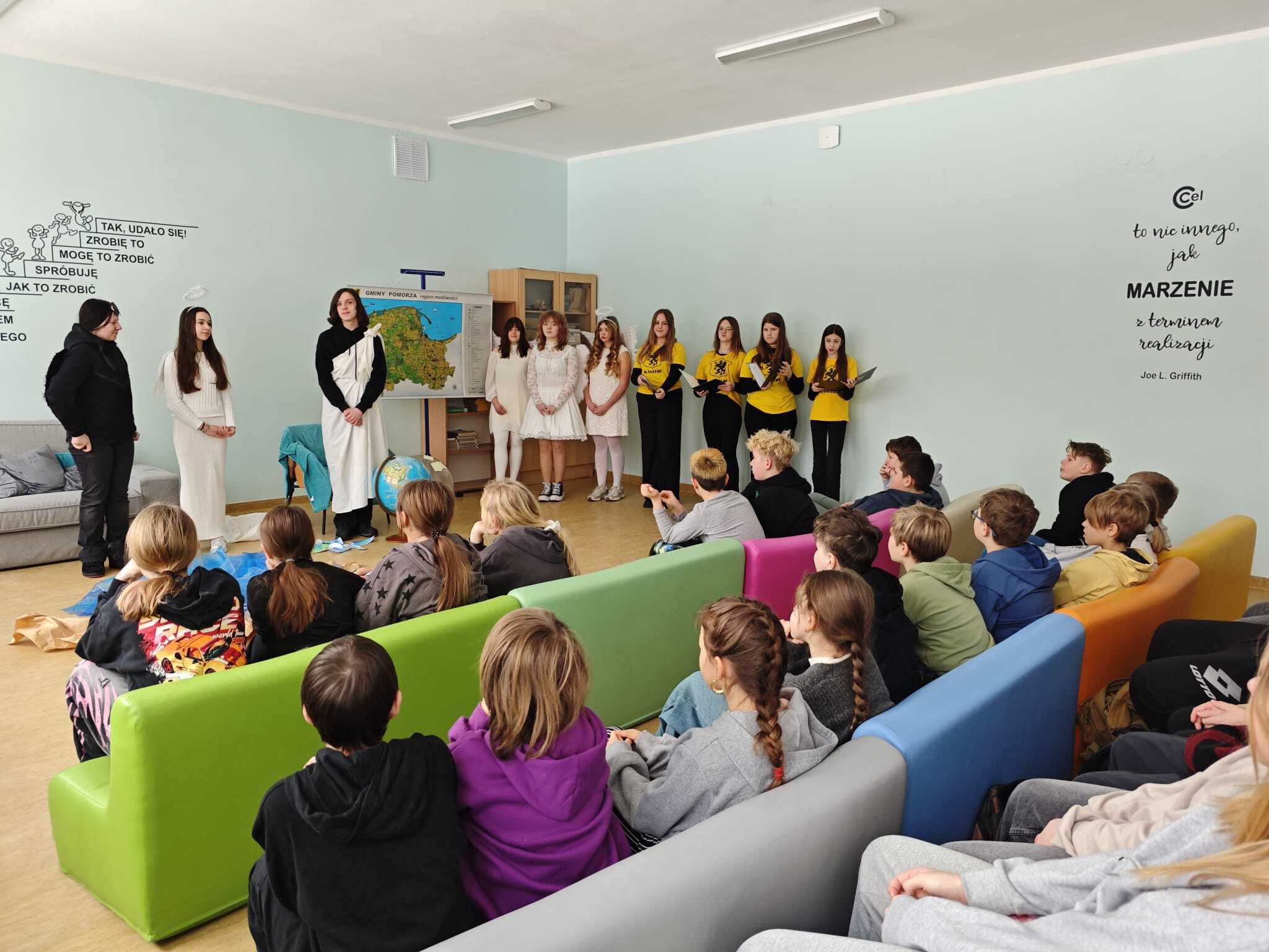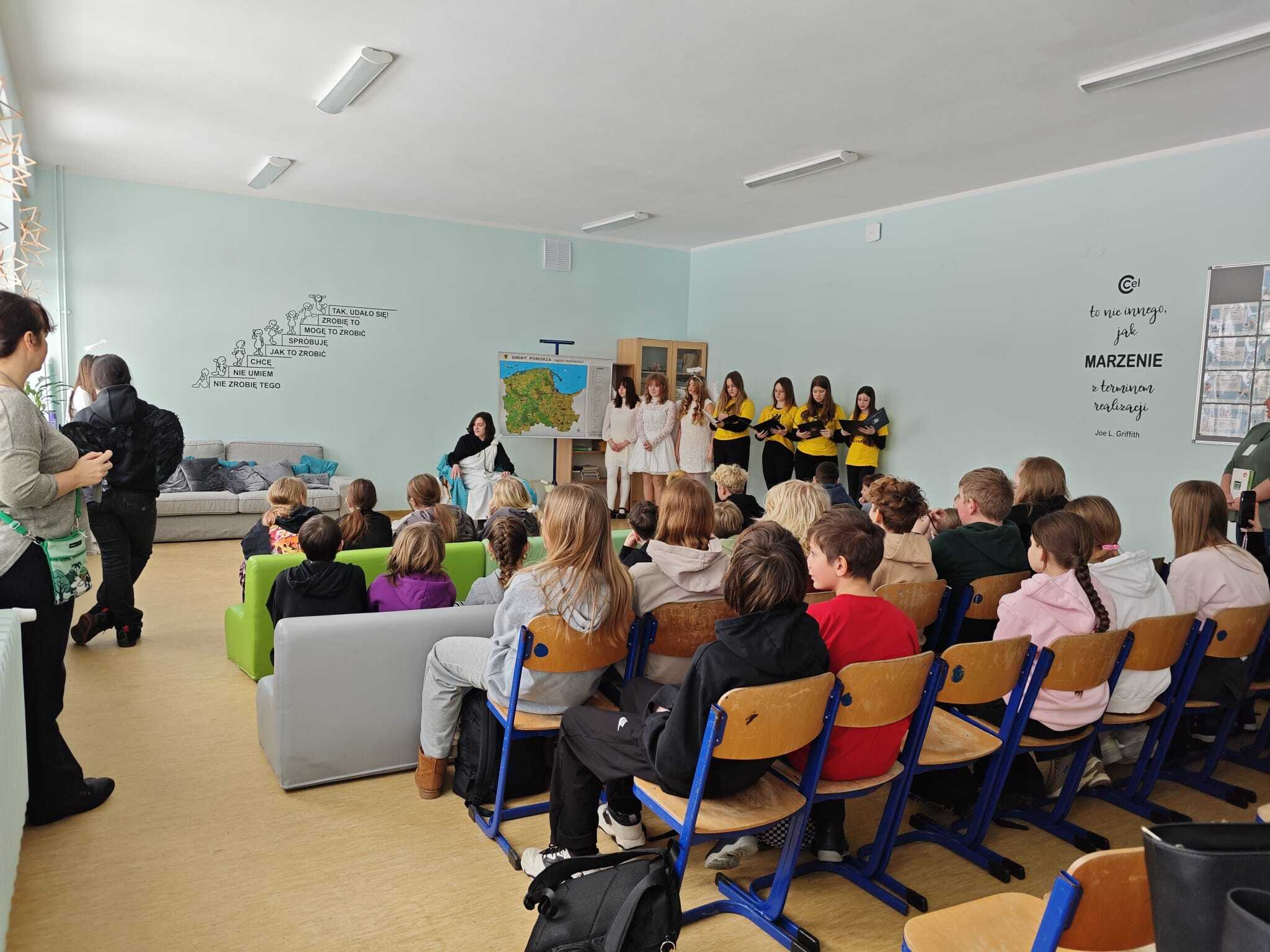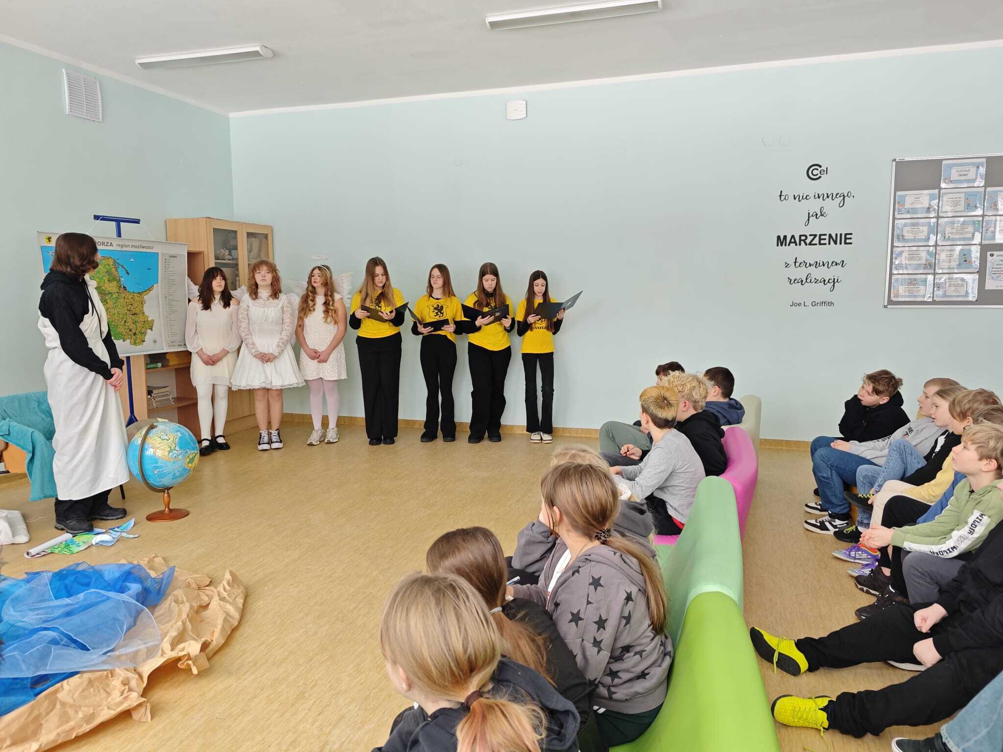 Legendę, która wyjaśnia między innymi wyjątkową urodę kaszubskiej ziemi, w dwóch zadomowionych na naszej ziemi językach, siódmacy, zdobywszy się na odwagę, wystawili przed wszystkimi oddziałami klas Szkoły Podstawowej oraz przedszkolakami. Było zabawnie a zadowolenie pozostało wrażeniem odbiorców i autorów.