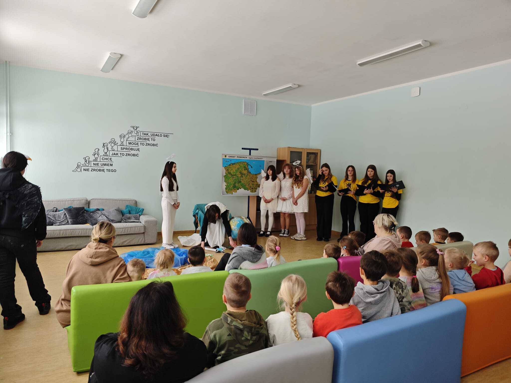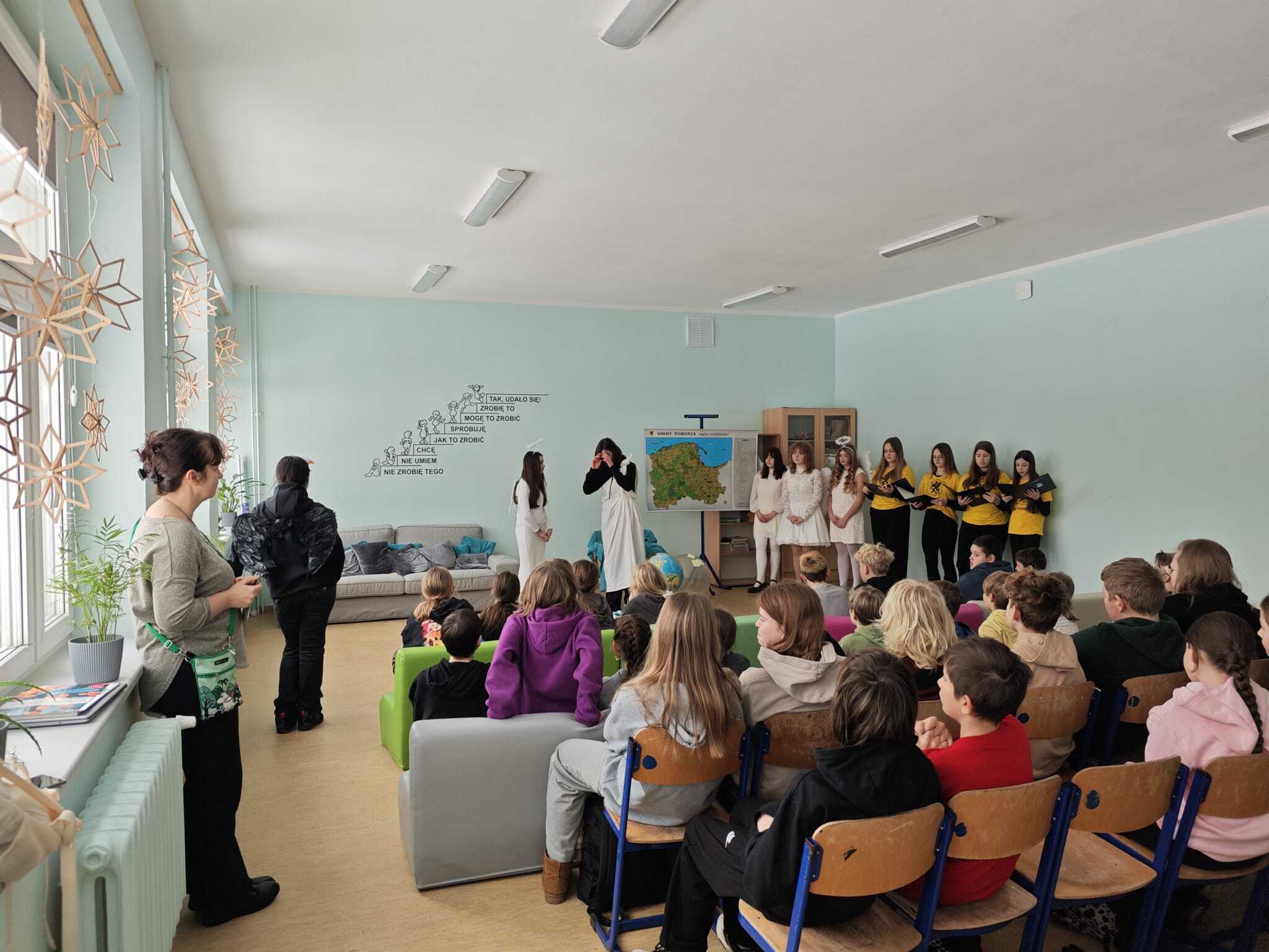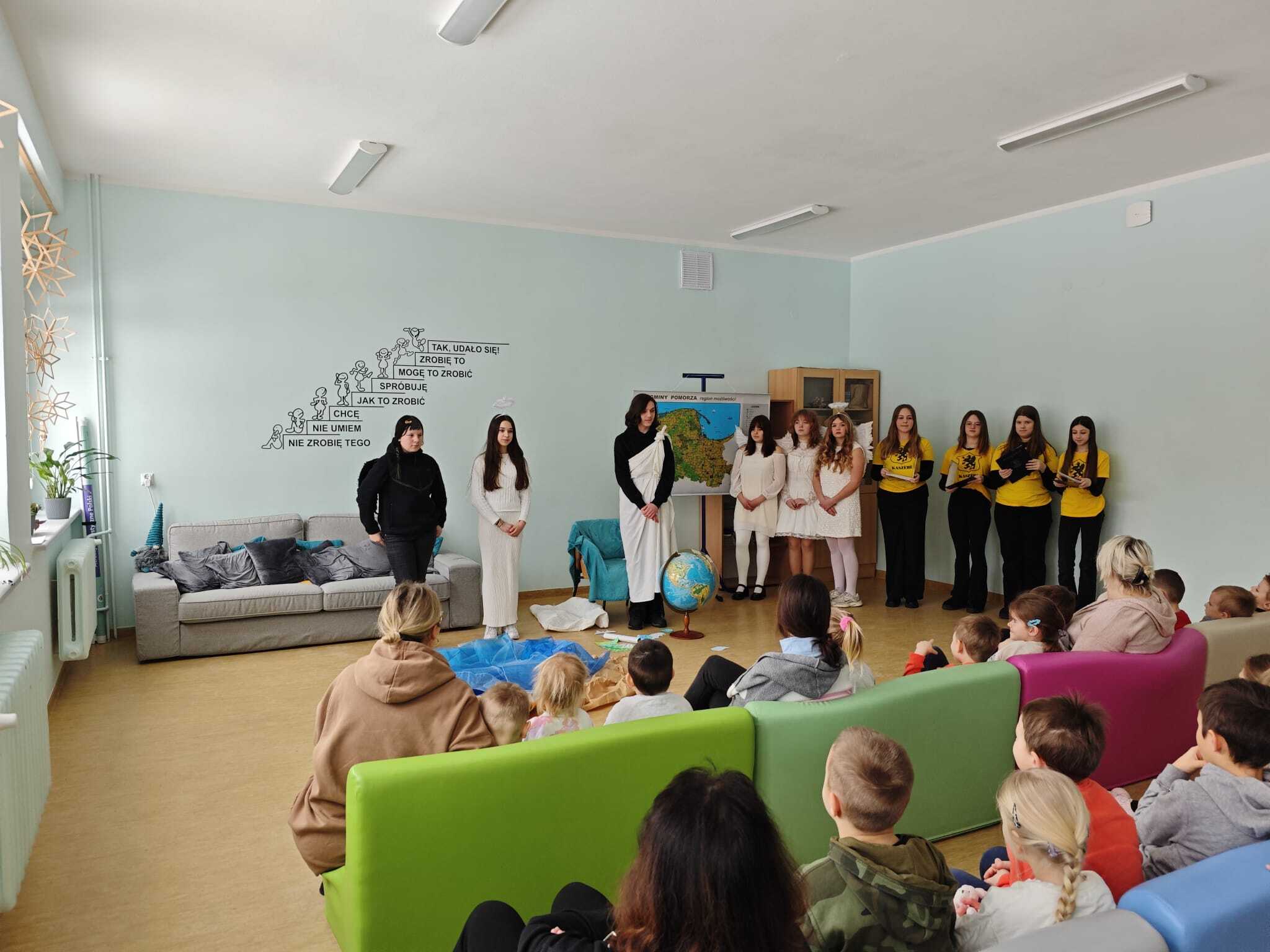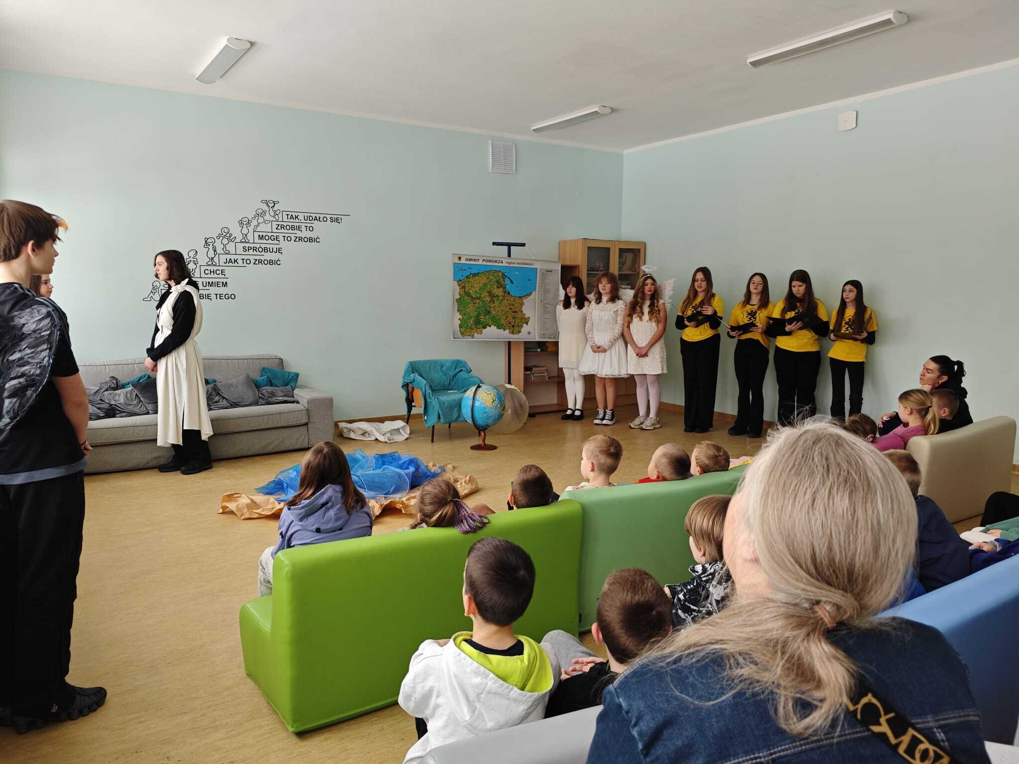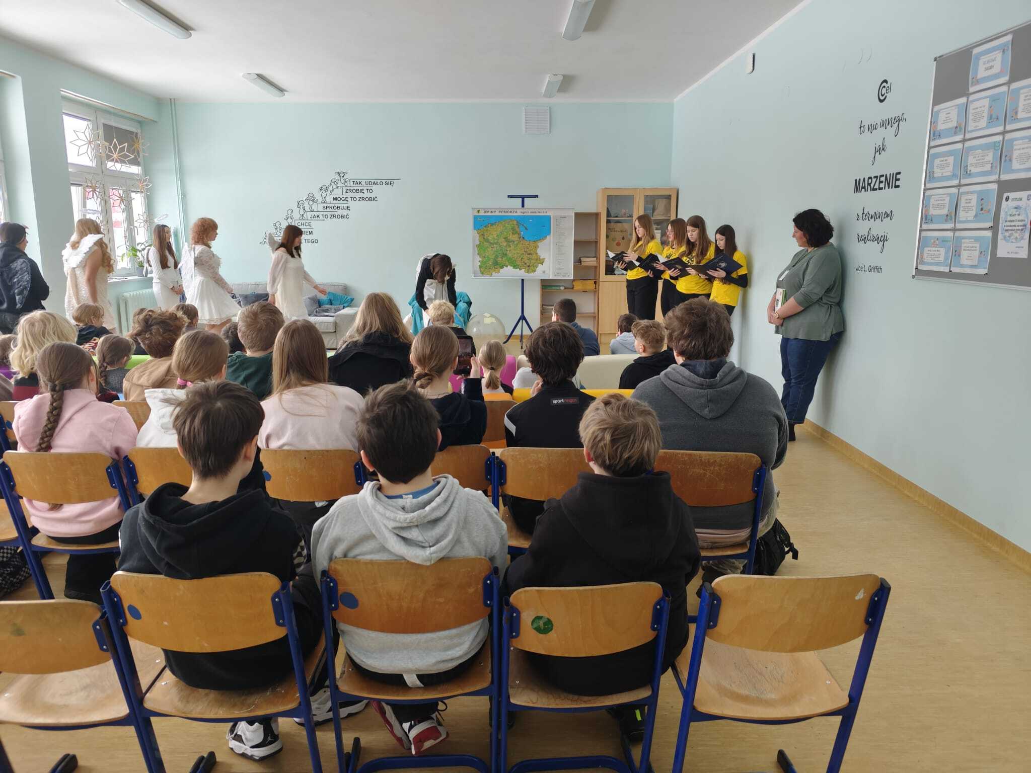 Legendę, która wyjaśnia między innymi wyjątkową urodę kaszubskiej ziemi, w dwóch zadomowionych na naszej ziemi językach, siódmacy, zdobywszy się na odwagę, wystawili przed wszystkimi oddziałami klas Szkoły Podstawowej oraz przedszkolakami. Było zabawnie a zadowolenie pozostało wrażeniem odbiorców i autorów.