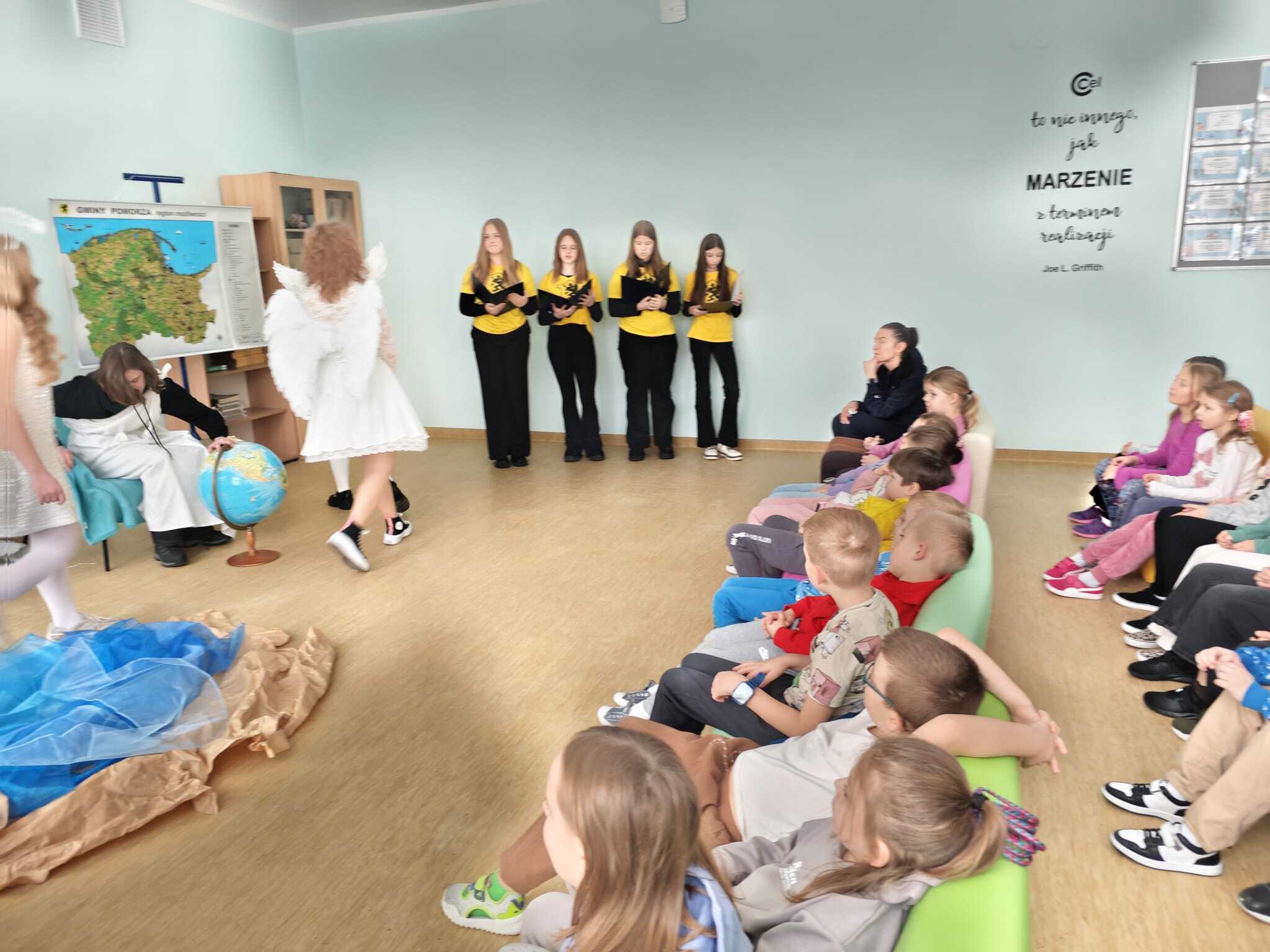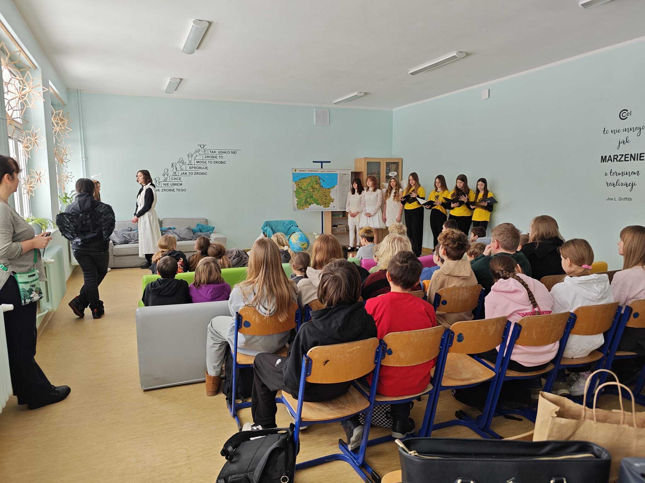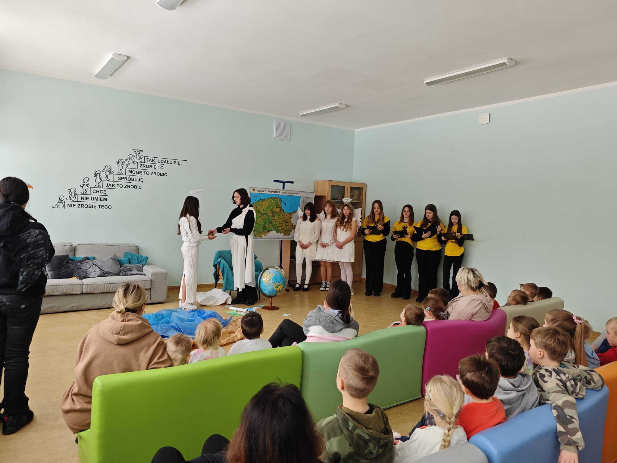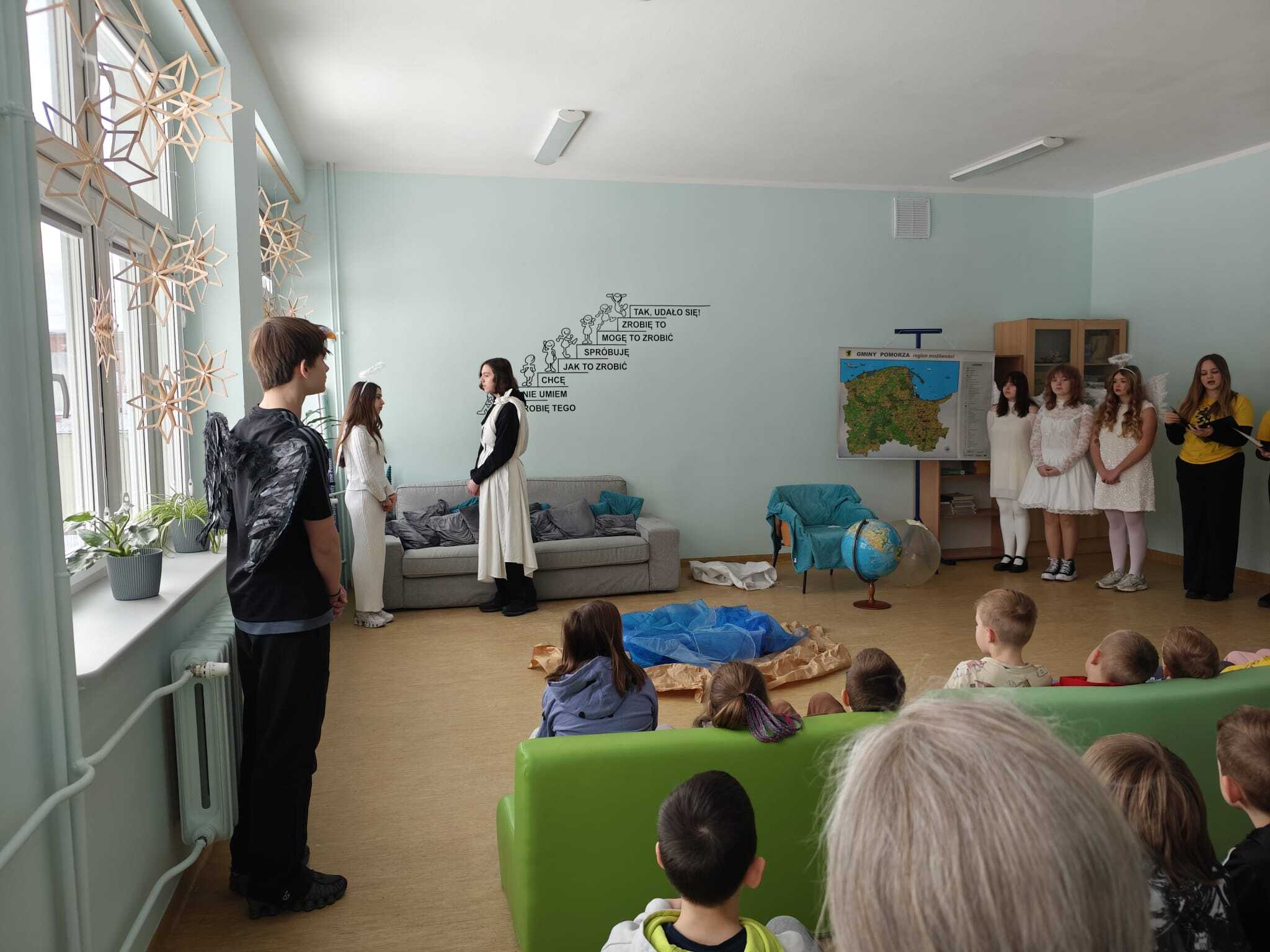 Legendę, która wyjaśnia między innymi wyjątkową urodę kaszubskiej ziemi, w dwóch zadomowionych na naszej ziemi językach, siódmacy, zdobywszy się na odwagę, wystawili przed wszystkimi oddziałami klas Szkoły Podstawowej oraz przedszkolakami. Było zabawnie a zadowolenie pozostało wrażeniem odbiorców i autorów.