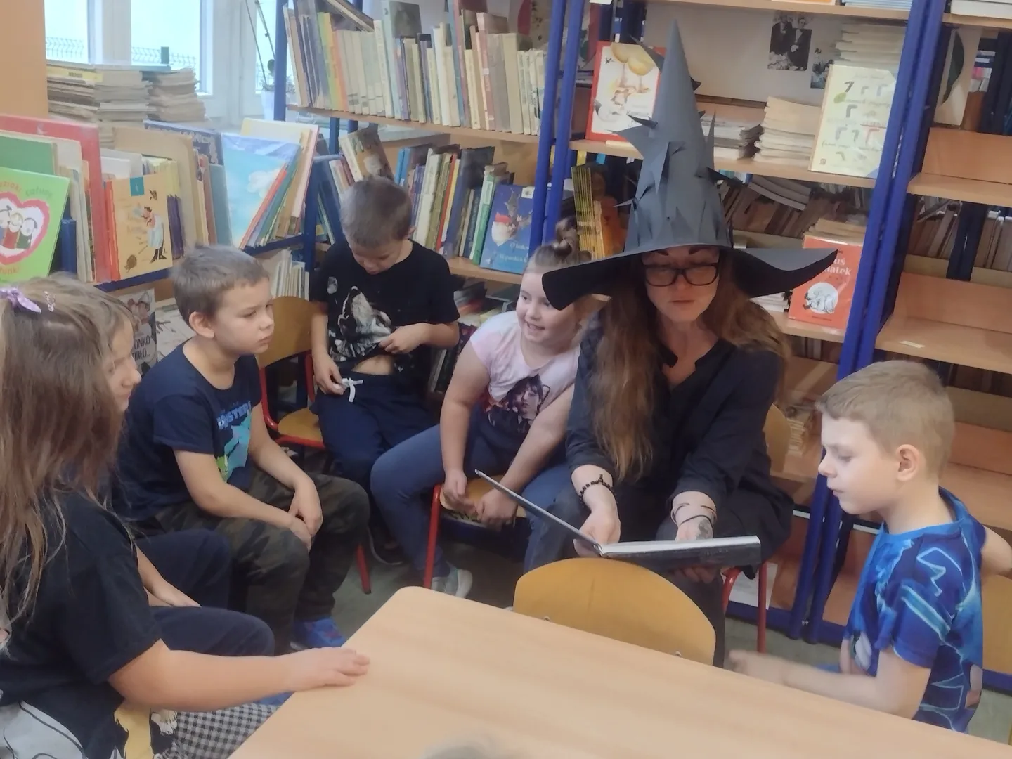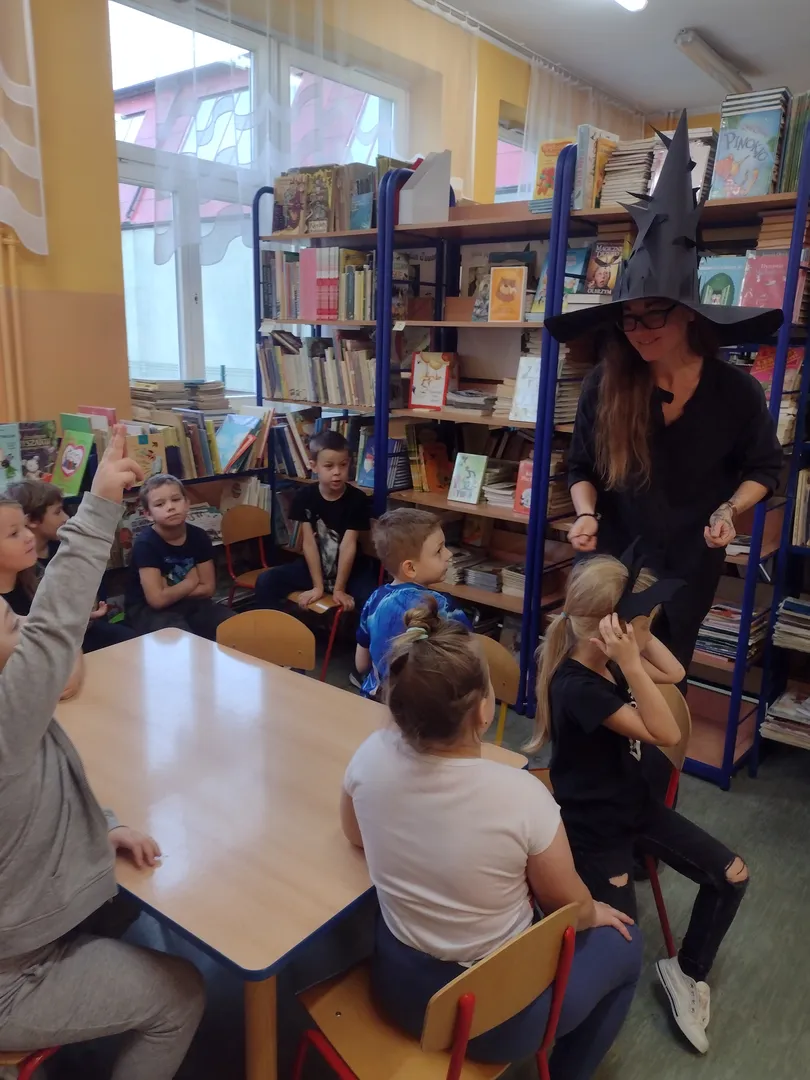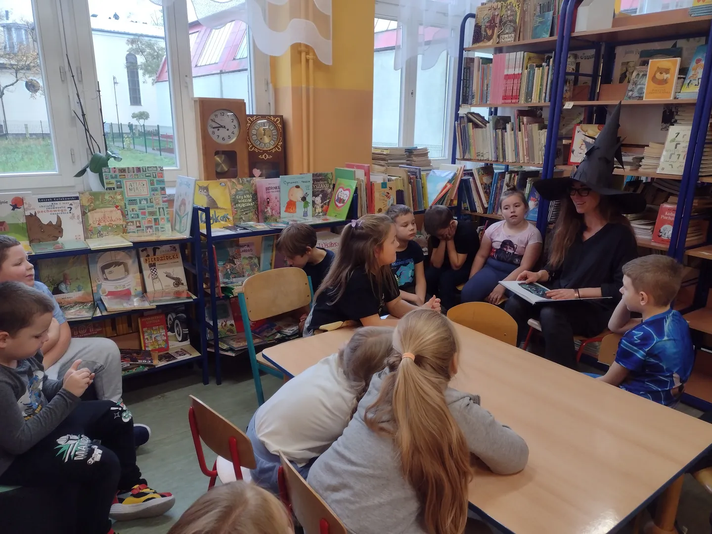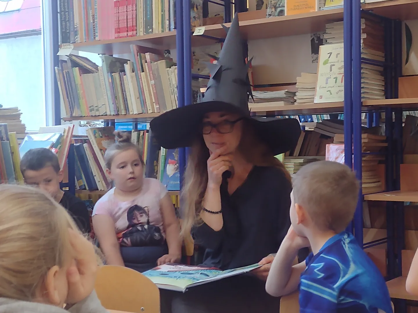 Dzieci, w otoczeniu lektur, baśni, legend często niesamowitych, wysłuchały opowieści z bajkowego świata, które wyskoczyły z magicznego kapelusza. Czarownica Drut i jej przepis na pyszną zupkę dyniową, dzięki której zyskała leśnych przyjaciół. Sara Łaskotka, urocza opiekunka dzieci, kolejna wielbicielka dyniowych pyszności, przykuły uwagę Pierwszaków, którzy po wysłuchaniu bajek przeglądali ilustracje książki i żywo wymieniali się wrażeniami.