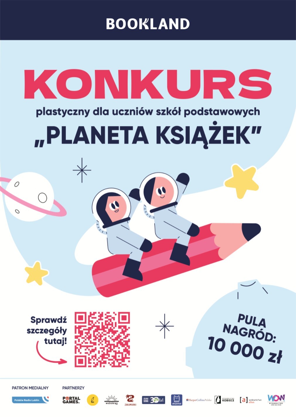 Serdecznie zapraszamy do udziału w ogólnopolskim konkursie „Planeta książek”, organizowanym przez Księgarnię Bookland. Konkurs skierowany jest do uczniów klas 1-8, a łączna pula nagród wynosi 10 tysięcy złotych!