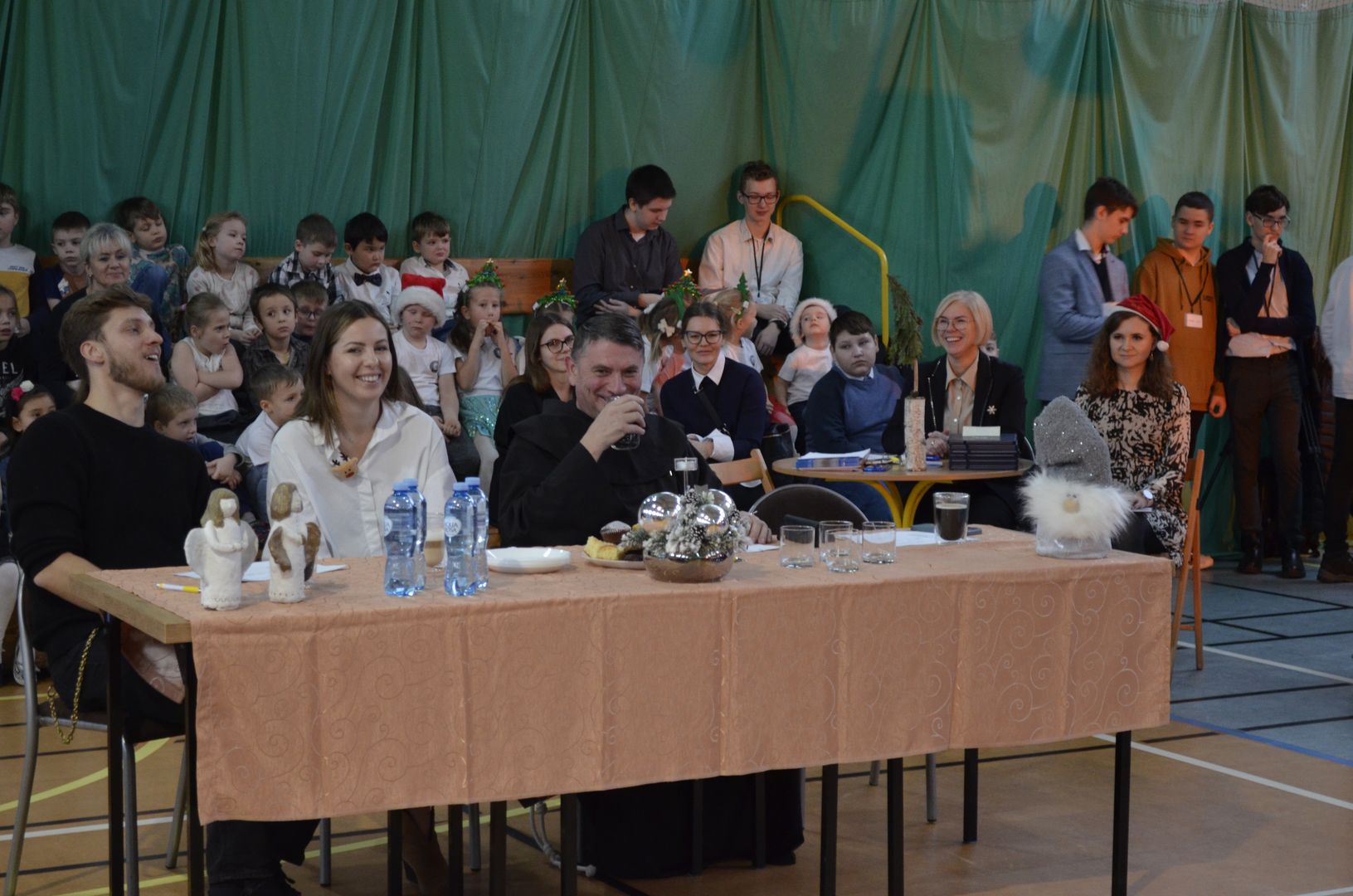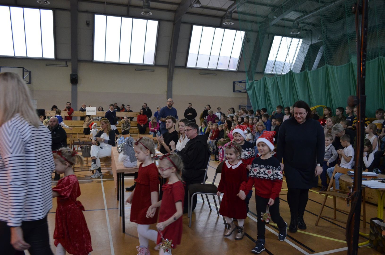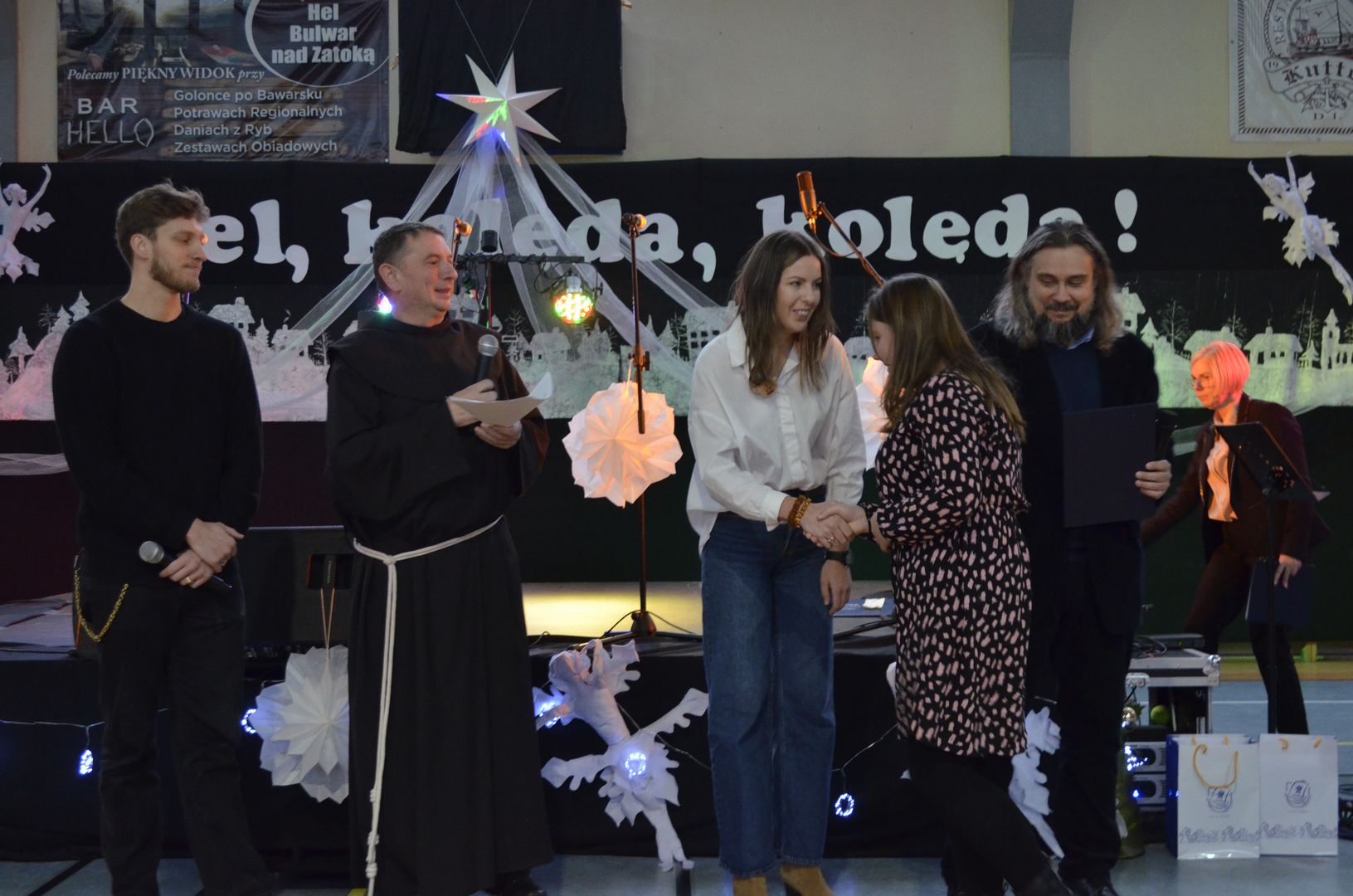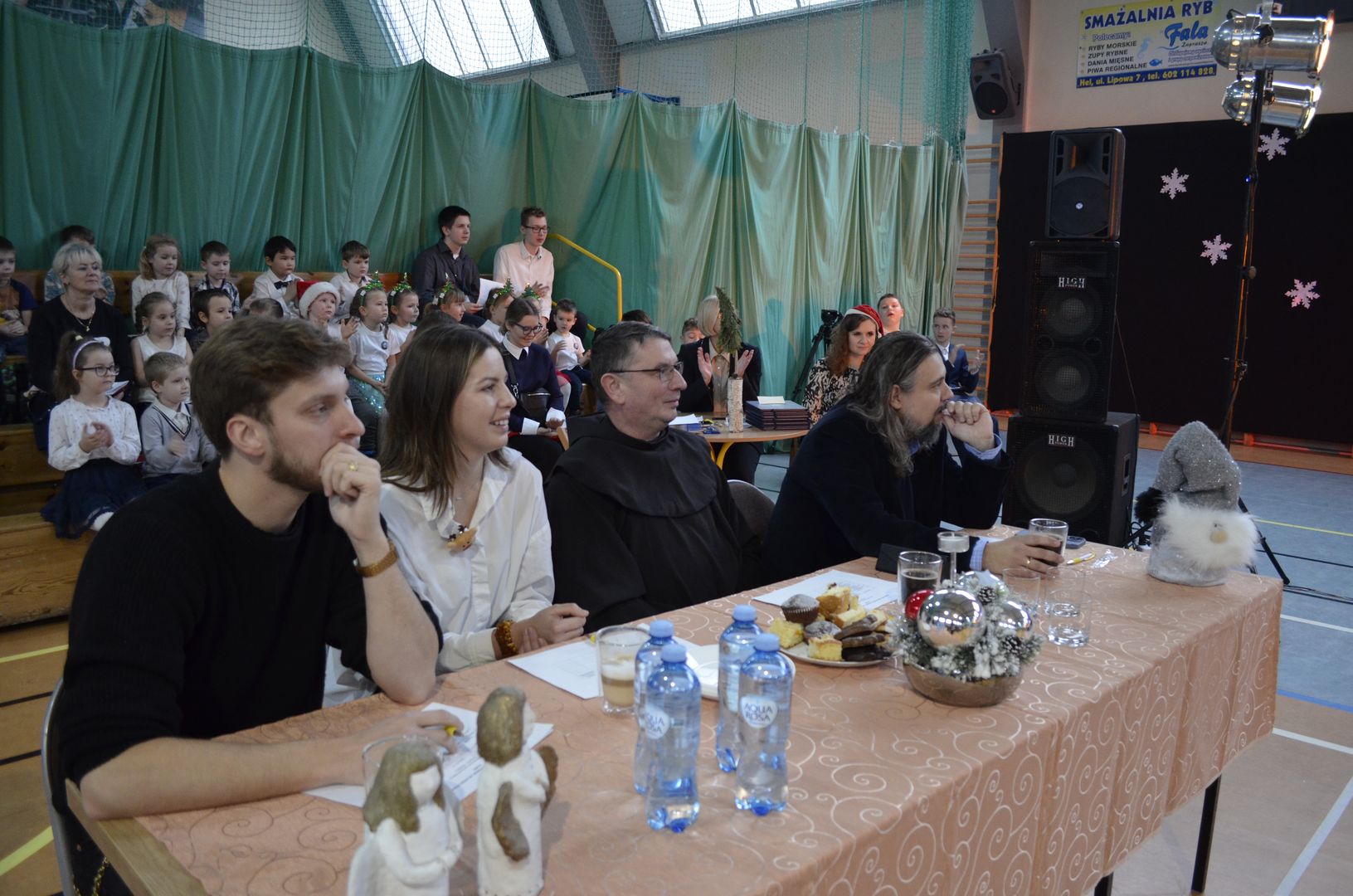 Podczas gdy na scenie w hali widowiskowo-sportowej prezentowały się kolejne zespoły oraz soliści, pozostali uczestnicy mogli w dowolnym momencie opuścić trybuny i rozśpiewać się lub wyciszyć w przydzielonej im sali, a także nabrać sił w strefie gastronomicznej, gdzie czekał słodki poczęstunek, napoje, a nawet gorąca zupa. Założeniem konkursu, poza wspieraniem młodych talentów wokalnych, było pielęgnowanie tradycji i zwyczajów związanych z Bożym Narodzeniem. Specjalna strefa kreatywna oferowała stworzenie rozmaitych ozdób świątecznych. Bliższemu poznawaniu się uczestników sprzyjała strefa gier, w której mogli odpocząć na miękkich pufach i pograć w planszowki czy też rozegrać mecz piłkarzyków stołowych. Nasi uczniowie, jak przystało na gospodarzy, otoczyli opieką gości, pełniąc funkcję przewodników grup. W całej szkole panowała przyjacielska i radosna atmosfera.