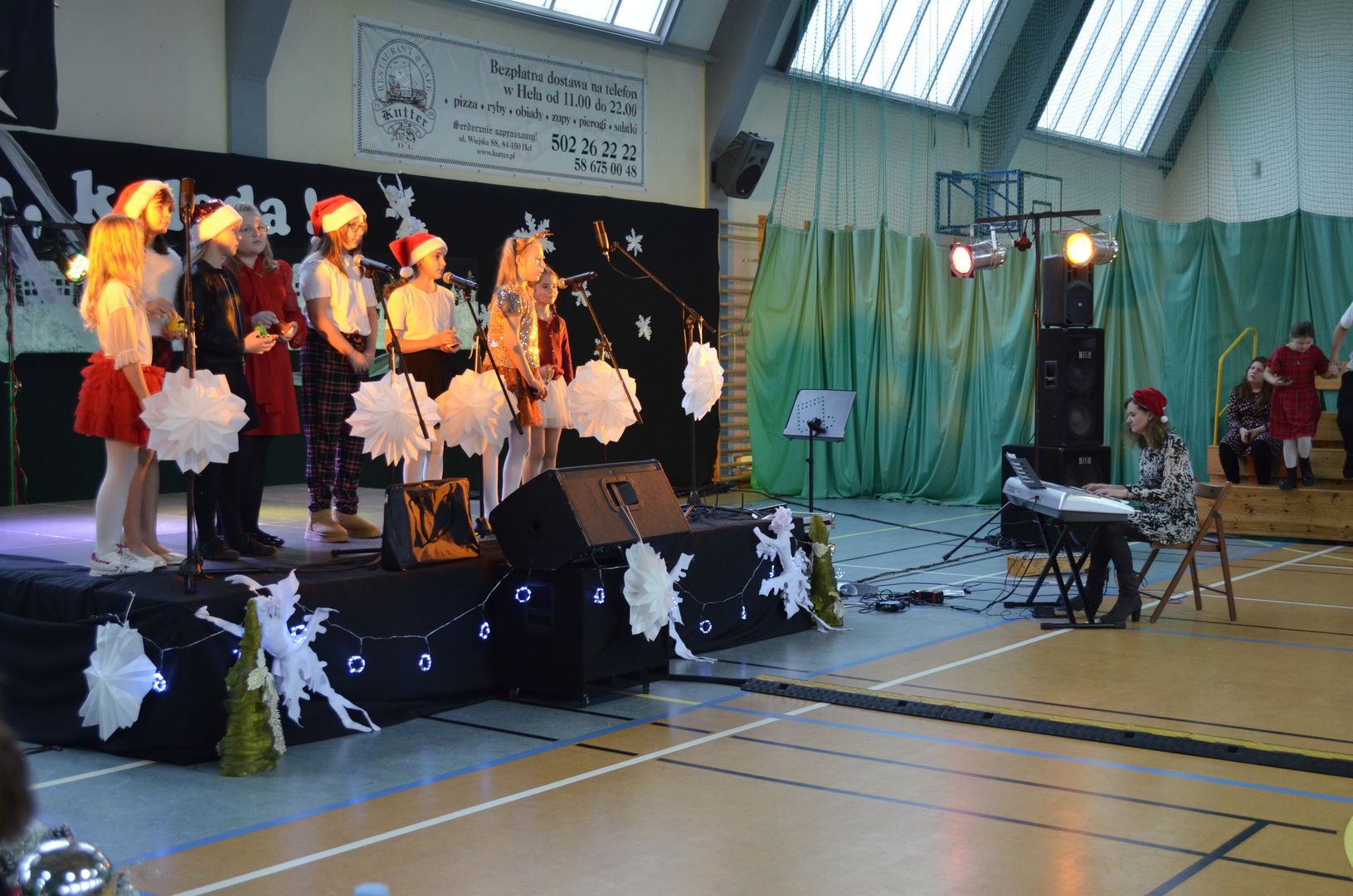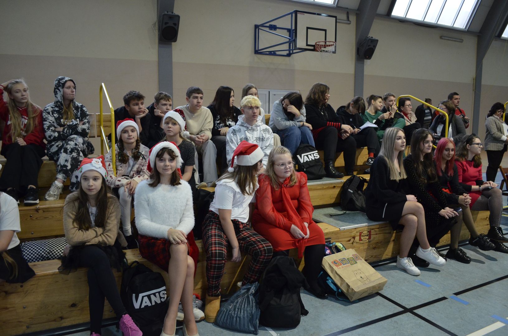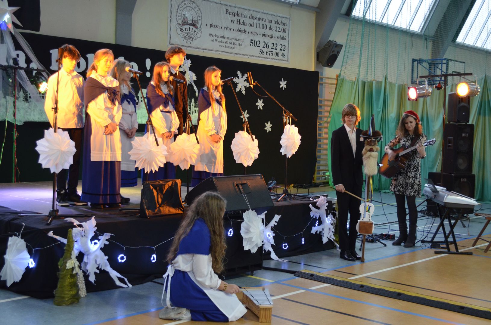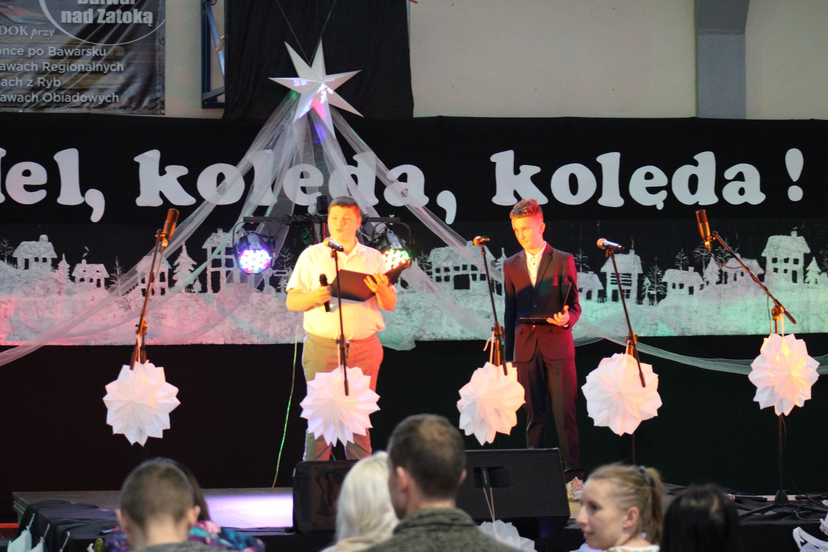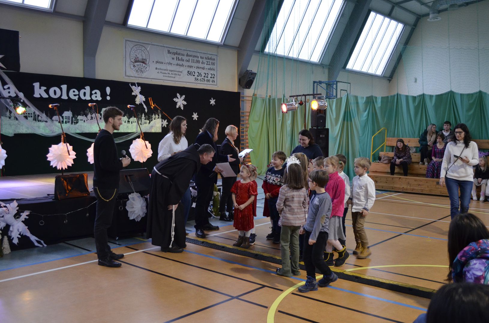 Podczas gdy na scenie w hali widowiskowo-sportowej prezentowały się kolejne zespoły oraz soliści, pozostali uczestnicy mogli w dowolnym momencie opuścić trybuny i rozśpiewać się lub wyciszyć w przydzielonej im sali, a także nabrać sił w strefie gastronomicznej, gdzie czekał słodki poczęstunek, napoje, a nawet gorąca zupa. Założeniem konkursu, poza wspieraniem młodych talentów wokalnych, było pielęgnowanie tradycji i zwyczajów związanych z Bożym Narodzeniem. Specjalna strefa kreatywna oferowała stworzenie rozmaitych ozdób świątecznych. Bliższemu poznawaniu się uczestników sprzyjała strefa gier, w której mogli odpocząć na miękkich pufach i pograć w planszowki czy też rozegrać mecz piłkarzyków stołowych. Nasi uczniowie, jak przystało na gospodarzy, otoczyli opieką gości, pełniąc funkcję przewodników grup. W całej szkole panowała przyjacielska i radosna atmosfera.