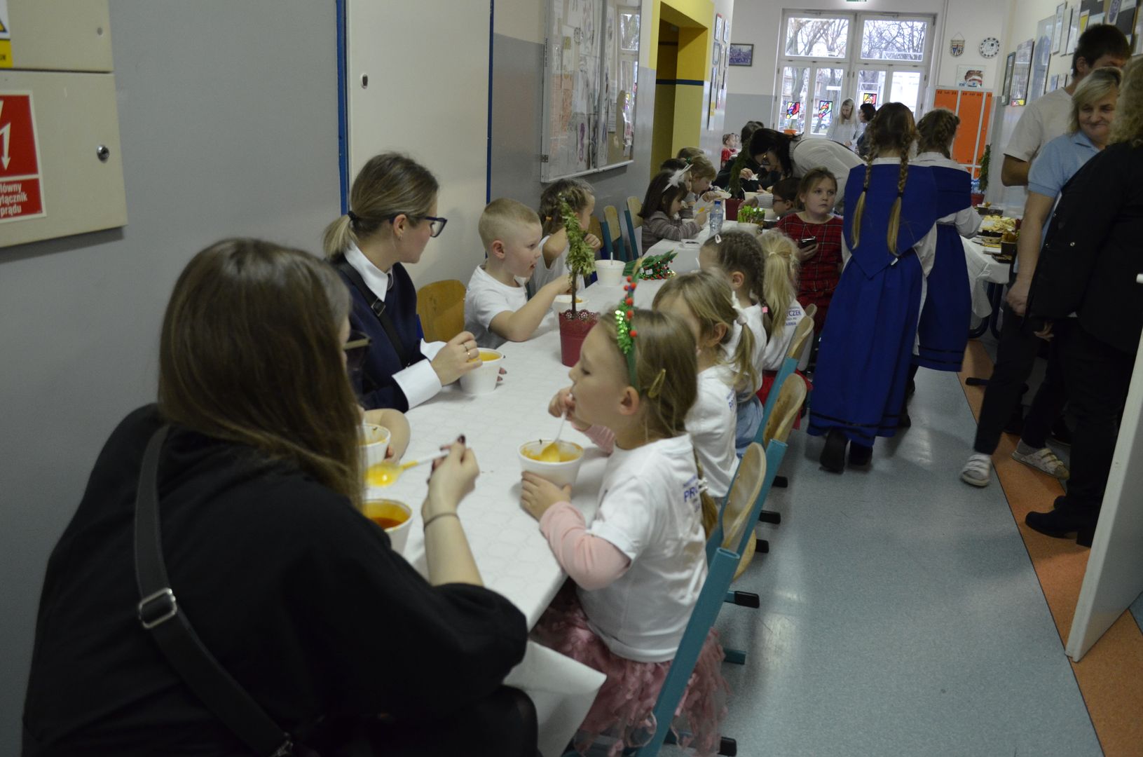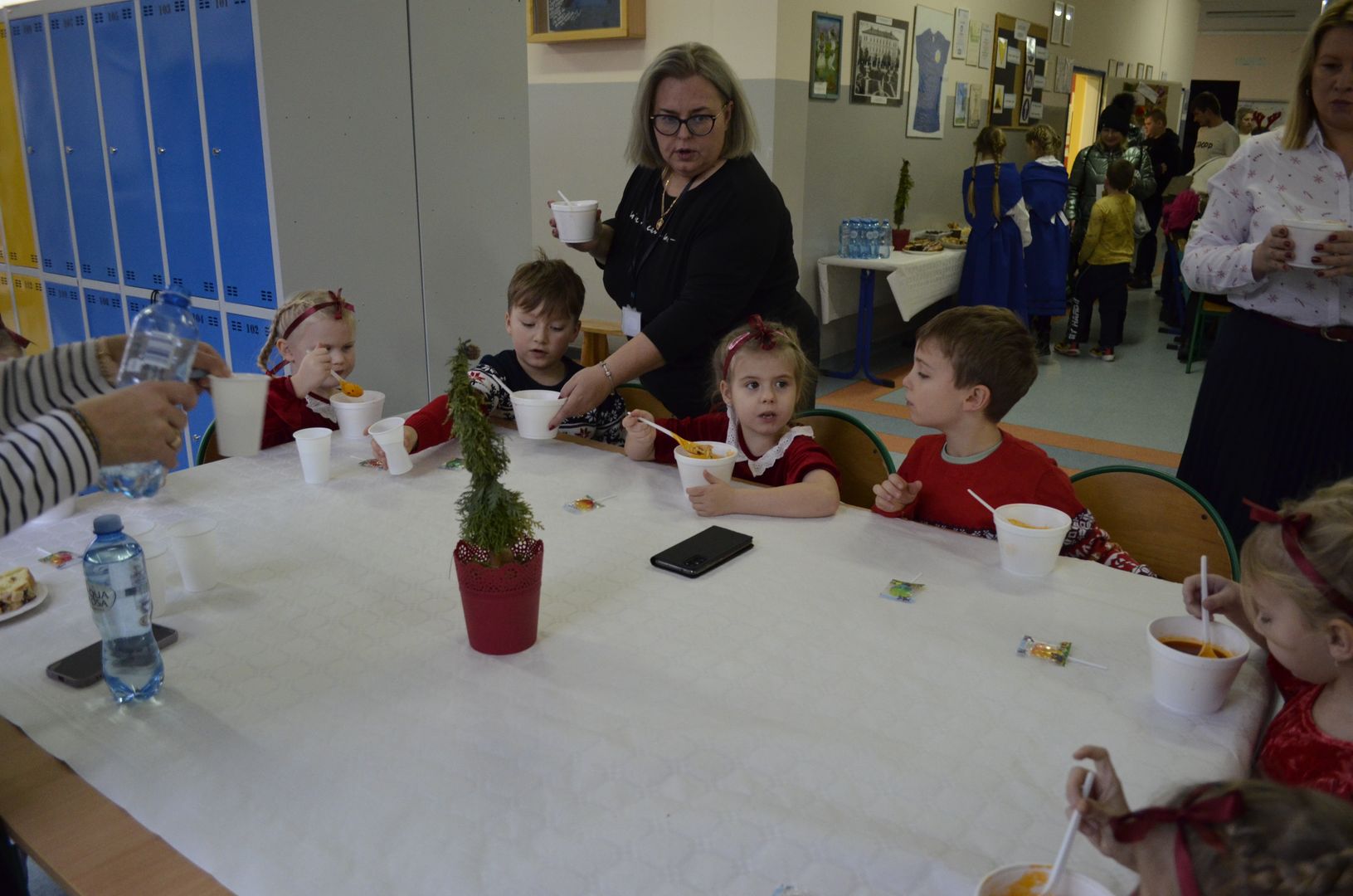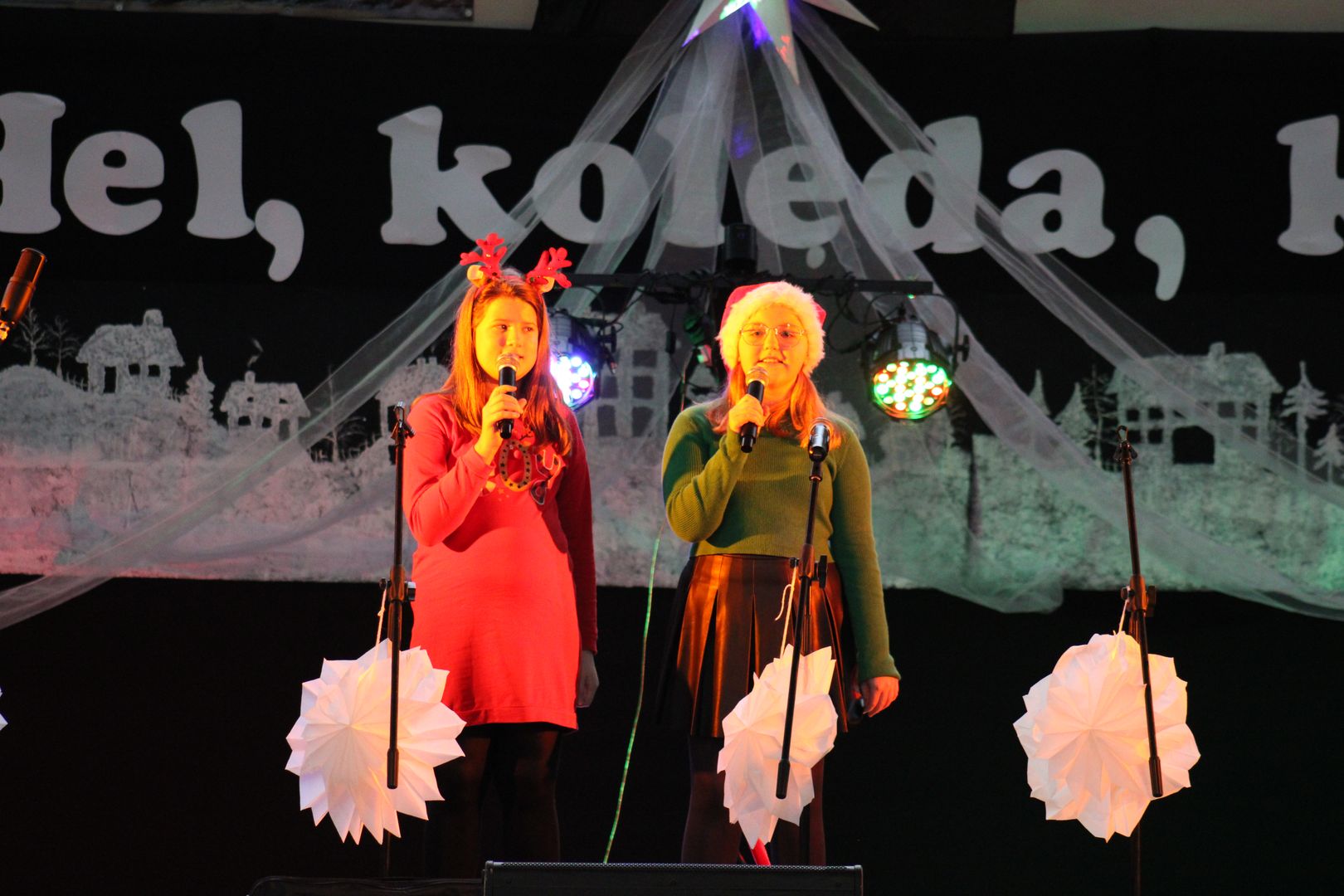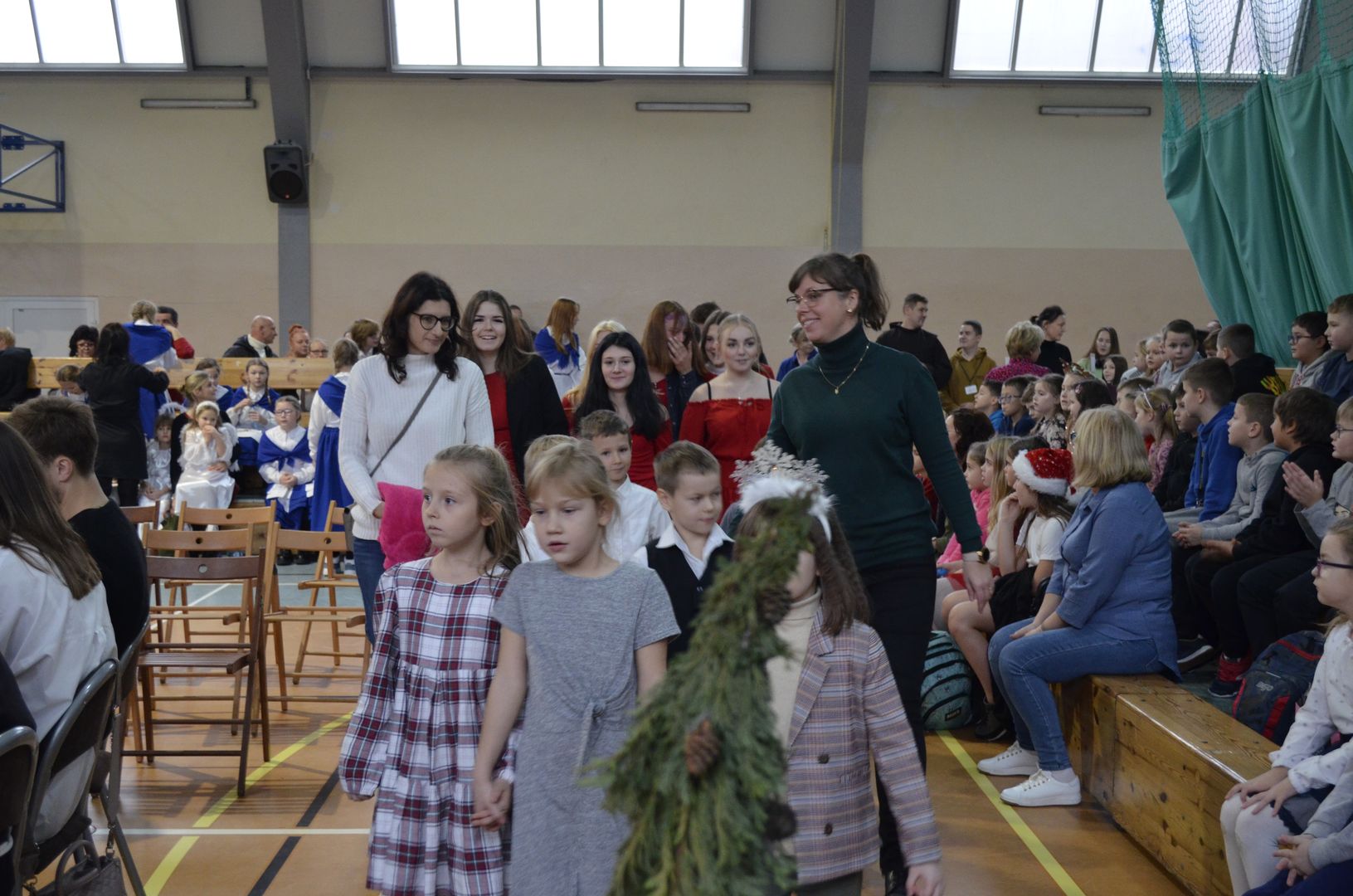 Podczas gdy na scenie w hali widowiskowo-sportowej prezentowały się kolejne zespoły oraz soliści, pozostali uczestnicy mogli w dowolnym momencie opuścić trybuny i rozśpiewać się lub wyciszyć w przydzielonej im sali, a także nabrać sił w strefie gastronomicznej, gdzie czekał słodki poczęstunek, napoje, a nawet gorąca zupa. Założeniem konkursu, poza wspieraniem młodych talentów wokalnych, było pielęgnowanie tradycji i zwyczajów związanych z Bożym Narodzeniem. Specjalna strefa kreatywna oferowała stworzenie rozmaitych ozdób świątecznych. Bliższemu poznawaniu się uczestników sprzyjała strefa gier, w której mogli odpocząć na miękkich pufach i pograć w planszowki czy też rozegrać mecz piłkarzyków stołowych. Nasi uczniowie, jak przystało na gospodarzy, otoczyli opieką gości, pełniąc funkcję przewodników grup. W całej szkole panowała przyjacielska i radosna atmosfera.