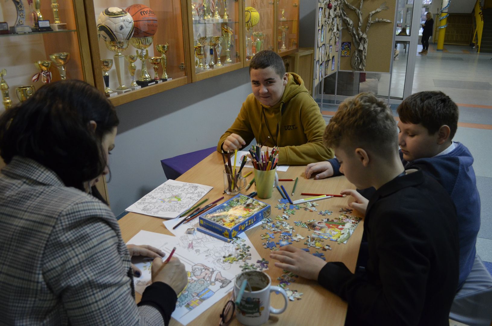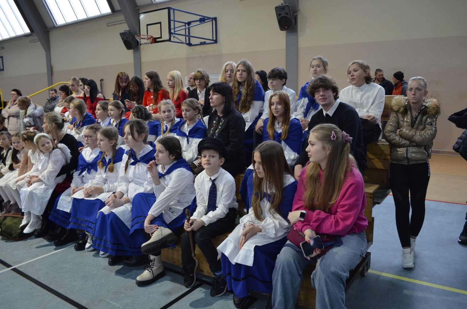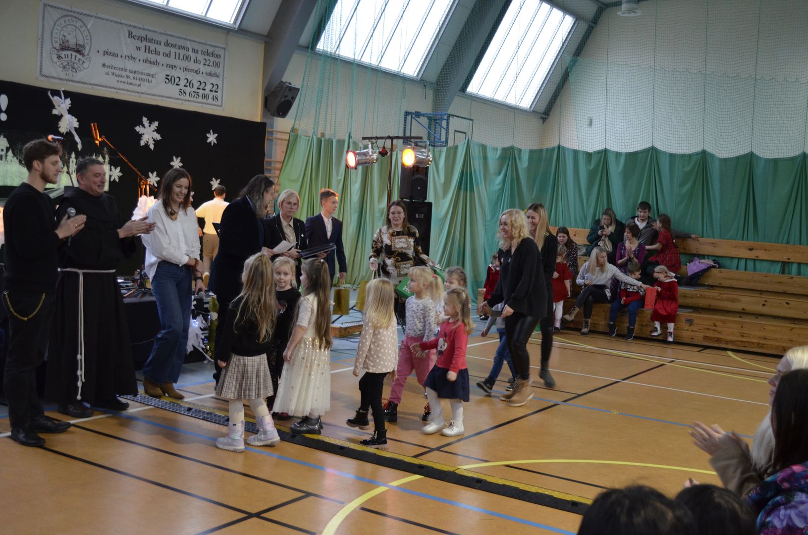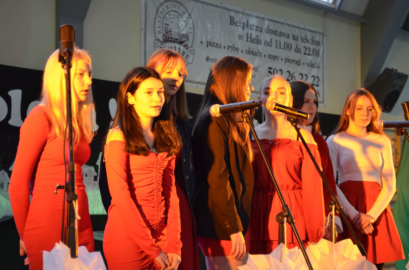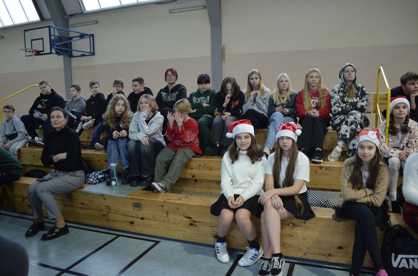 Podczas gdy na scenie w hali widowiskowo-sportowej prezentowały się kolejne zespoły oraz soliści, pozostali uczestnicy mogli w dowolnym momencie opuścić trybuny i rozśpiewać się lub wyciszyć w przydzielonej im sali, a także nabrać sił w strefie gastronomicznej, gdzie czekał słodki poczęstunek, napoje, a nawet gorąca zupa. Założeniem konkursu, poza wspieraniem młodych talentów wokalnych, było pielęgnowanie tradycji i zwyczajów związanych z Bożym Narodzeniem. Specjalna strefa kreatywna oferowała stworzenie rozmaitych ozdób świątecznych. Bliższemu poznawaniu się uczestników sprzyjała strefa gier, w której mogli odpocząć na miękkich pufach i pograć w planszowki czy też rozegrać mecz piłkarzyków stołowych. Nasi uczniowie, jak przystało na gospodarzy, otoczyli opieką gości, pełniąc funkcję przewodników grup. W całej szkole panowała przyjacielska i radosna atmosfera.