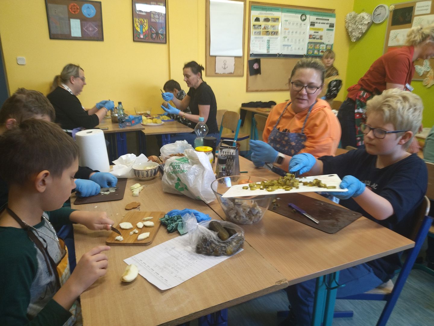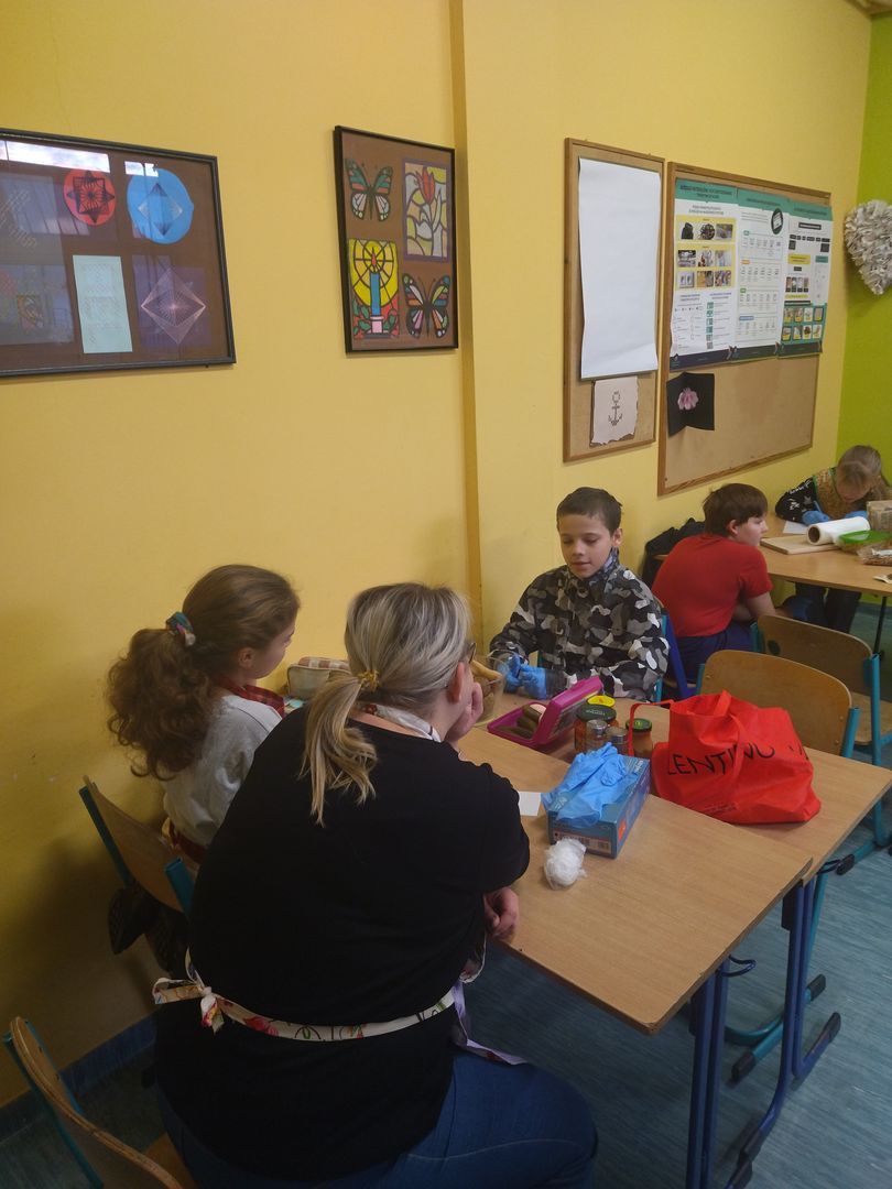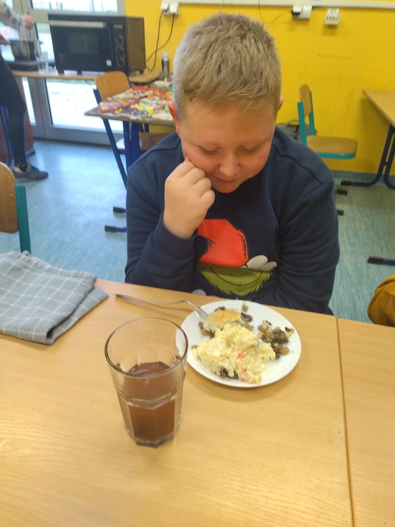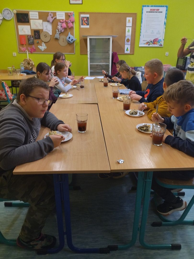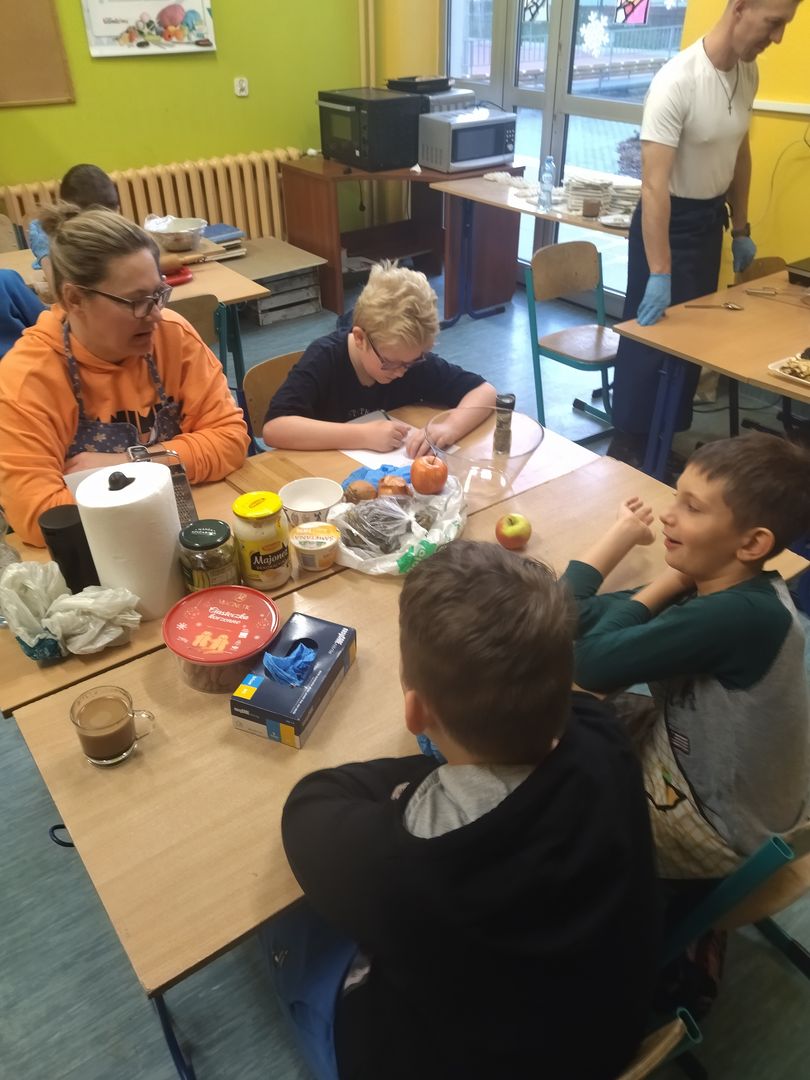 13 i 18 grudnia Rodzice i Uczniowie klas czwartych wzięli udział w lekcjach otwartych języka polskiego i … komunikacji, pracy zespołowej, integracji i zajęć kulinarnych. Zadaniem małych zespołów (jeden Rodzic i dwoje Dzieci z zastrzeżeniem, aby Rodzic nie był Master Szefem w drużynie swojego Dziecka) było stworzyć recepturę / przepis na danie świąteczne, następnie zespołowo je wykonać, a o ustalonej godzinie przeznaczyć do wspólnej degustacji. Dodatkowo zespoły zmagały się z wymyśleniem nazwy, która najlepiej oddałaby charakter działań grupy lub kulinarne wyzwanie. Szkolna kuchnia w sali technicznej tętniła energią różnych działań, od podziału obowiązków do pokonywania trudności na warsztacie deseczek i noży. Było przyjaźnie, wesoło, twórczo i najważniejsze, że razem. Bardzo dziękujemy Rodzicom klas czwartych za zaangażowanie, energię i wyobraźnię Starszaków. Do zobaczenia w kolejnych zadaniach!