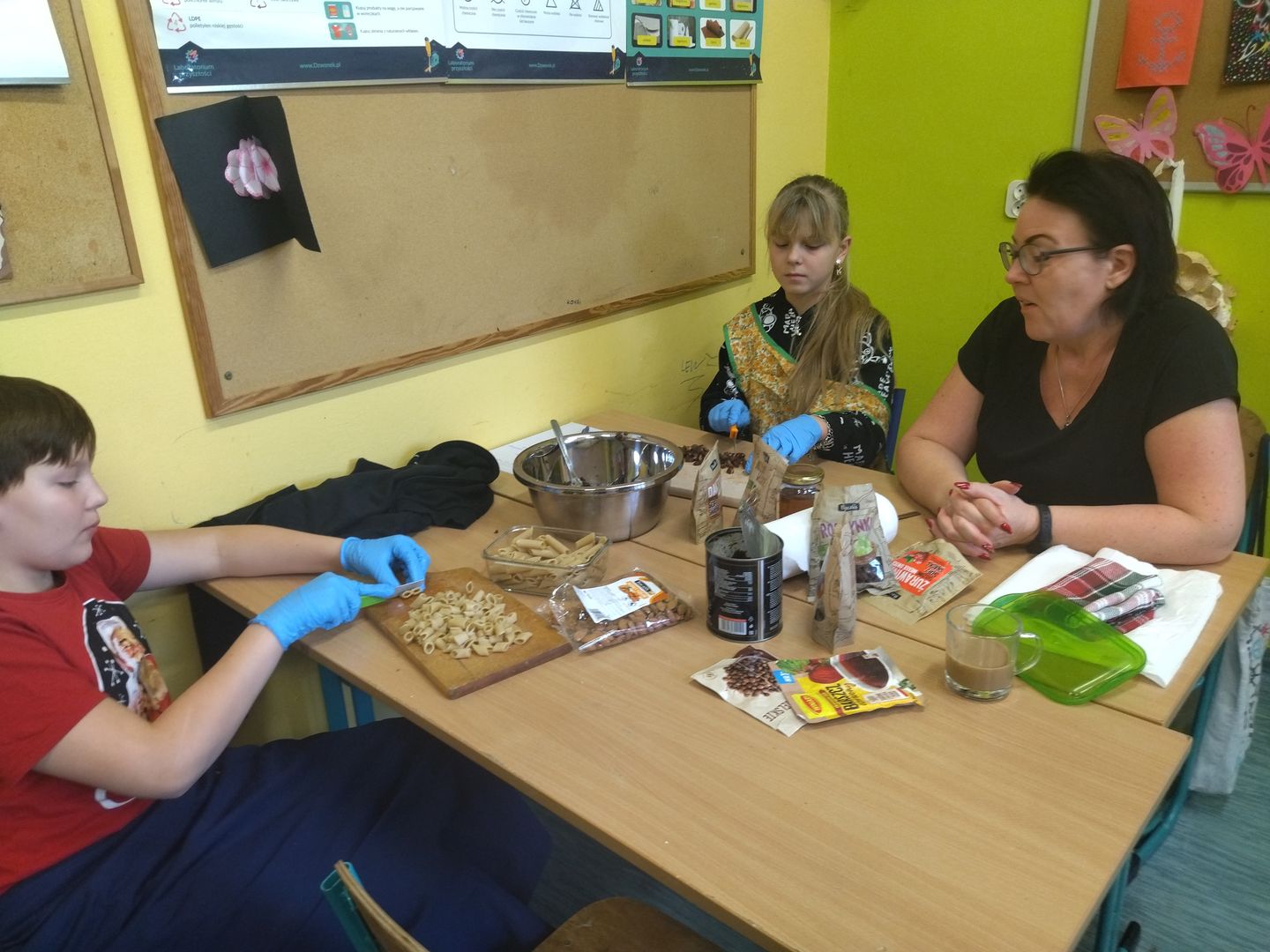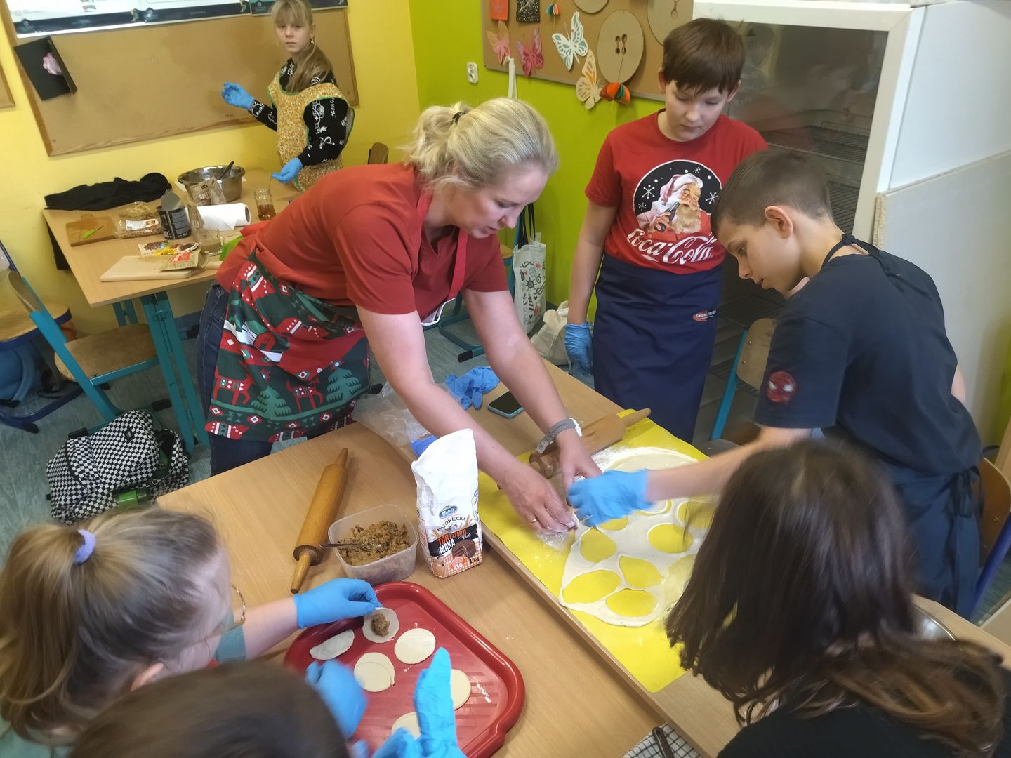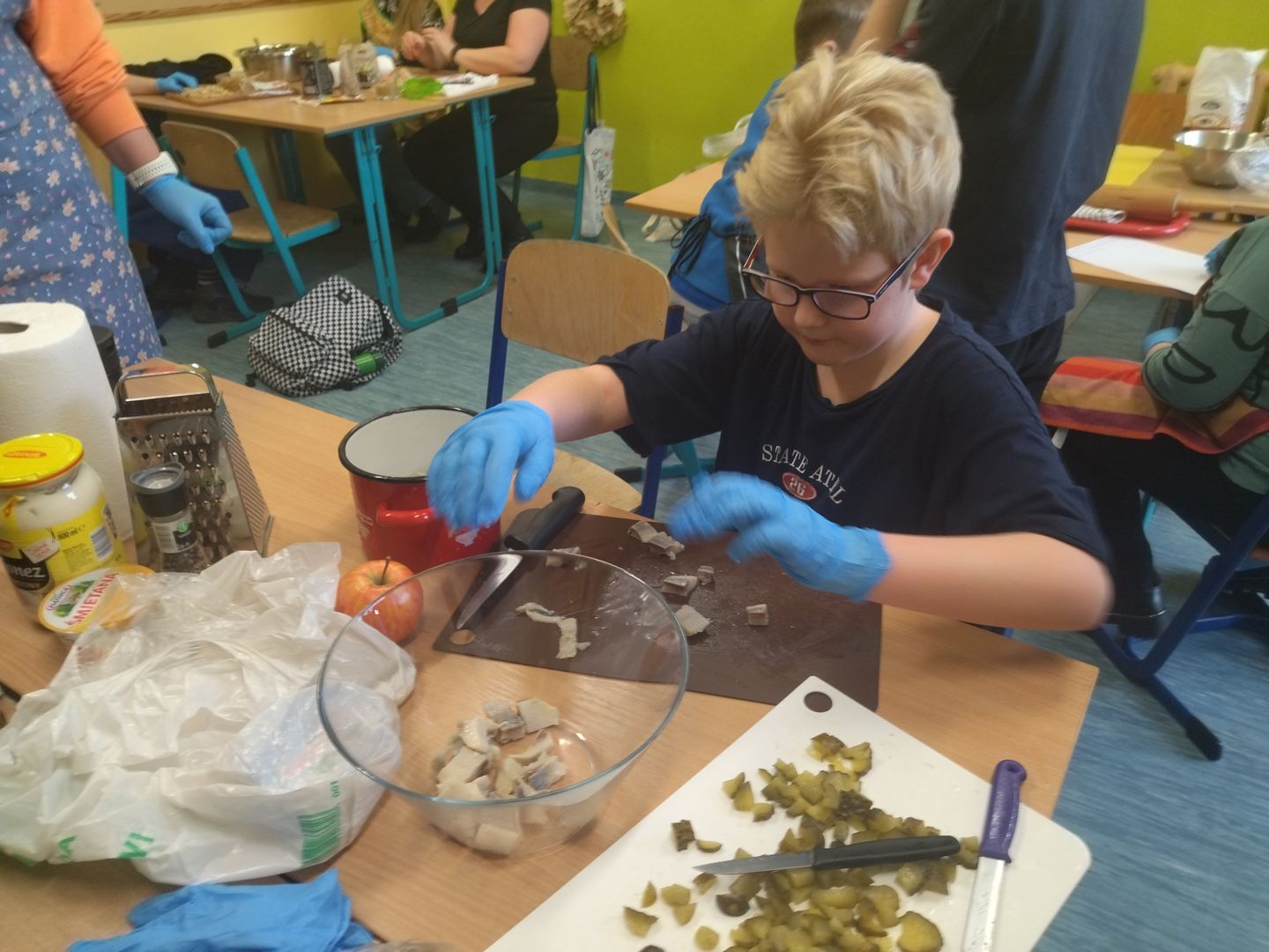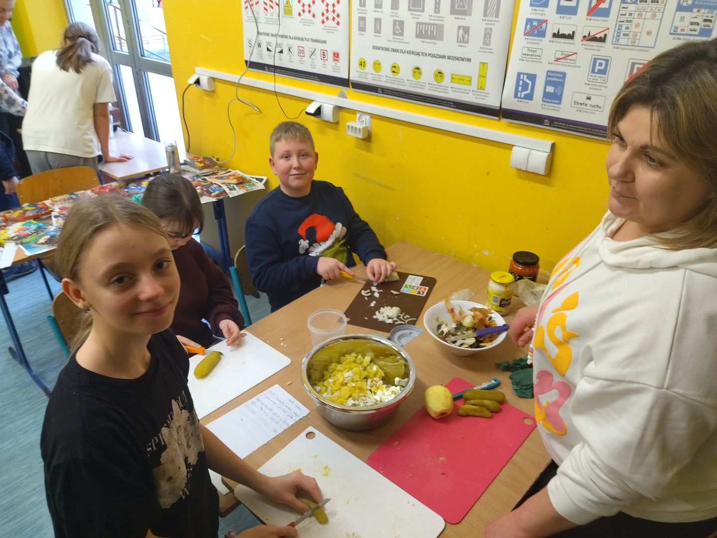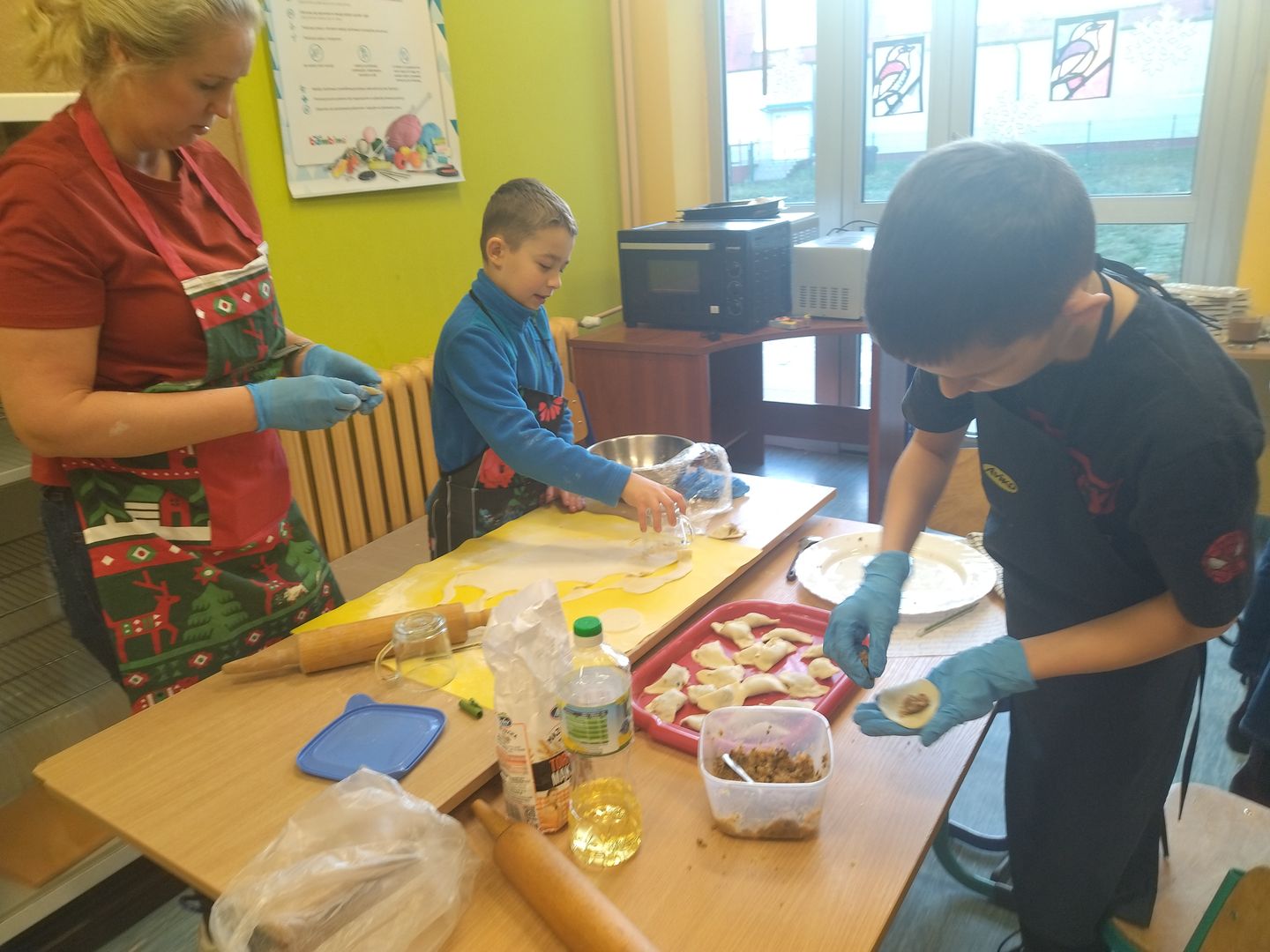 13 i 18 grudnia Rodzice i Uczniowie klas czwartych wzięli udział w lekcjach otwartych języka polskiego i … komunikacji, pracy zespołowej, integracji i zajęć kulinarnych. Zadaniem małych zespołów (jeden Rodzic i dwoje Dzieci z zastrzeżeniem, aby Rodzic nie był Master Szefem w drużynie swojego Dziecka) było stworzyć recepturę / przepis na danie świąteczne, następnie zespołowo je wykonać, a o ustalonej godzinie przeznaczyć do wspólnej degustacji. Dodatkowo zespoły zmagały się z wymyśleniem nazwy, która najlepiej oddałaby charakter działań grupy lub kulinarne wyzwanie. Szkolna kuchnia w sali technicznej tętniła energią różnych działań, od podziału obowiązków do pokonywania trudności na warsztacie deseczek i noży. Było przyjaźnie, wesoło, twórczo i najważniejsze, że razem. Bardzo dziękujemy Rodzicom klas czwartych za zaangażowanie, energię i wyobraźnię Starszaków. Do zobaczenia w kolejnych zadaniach!