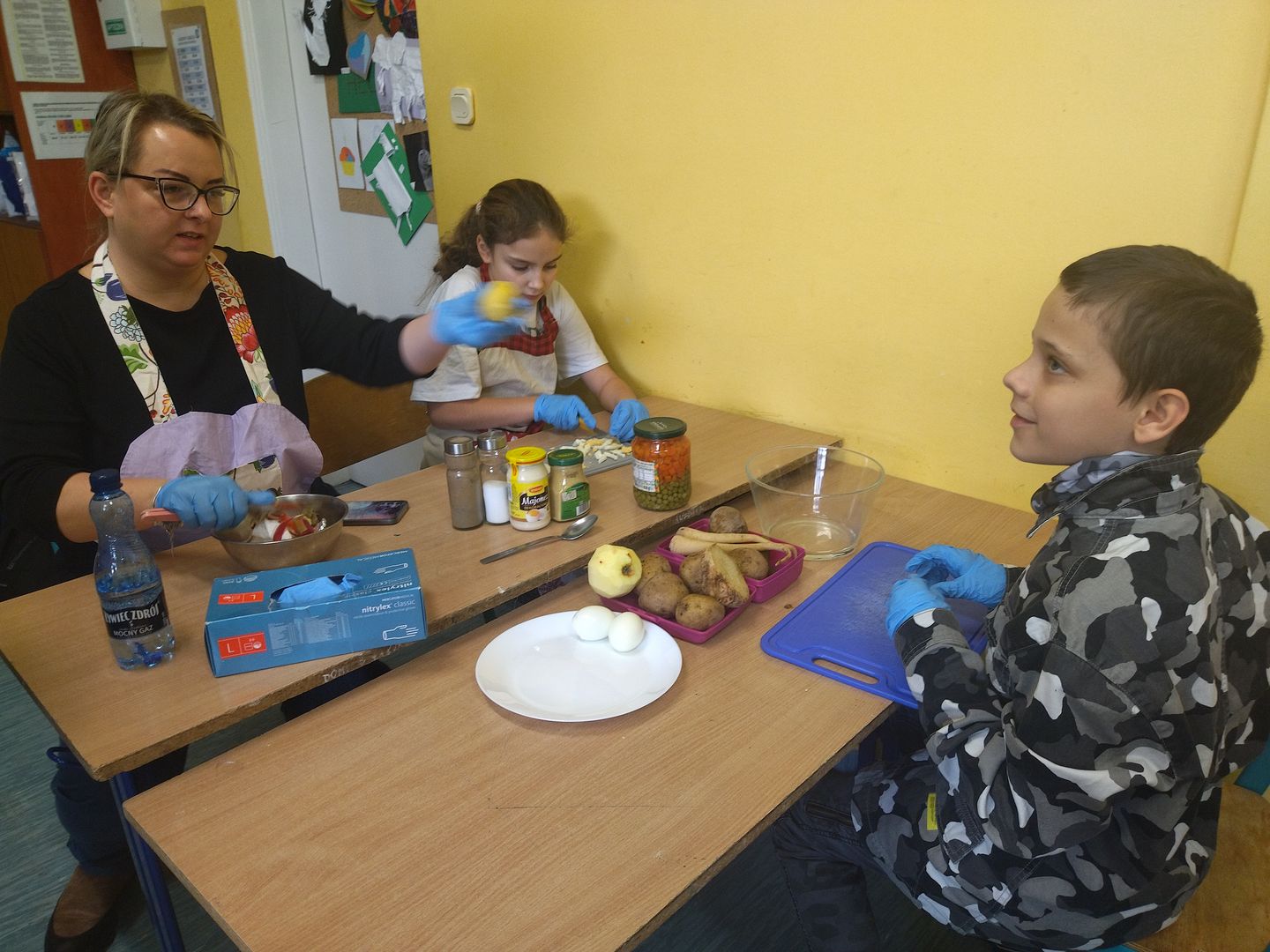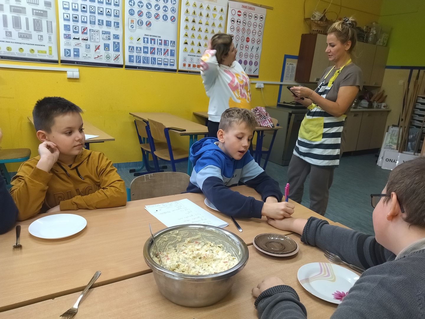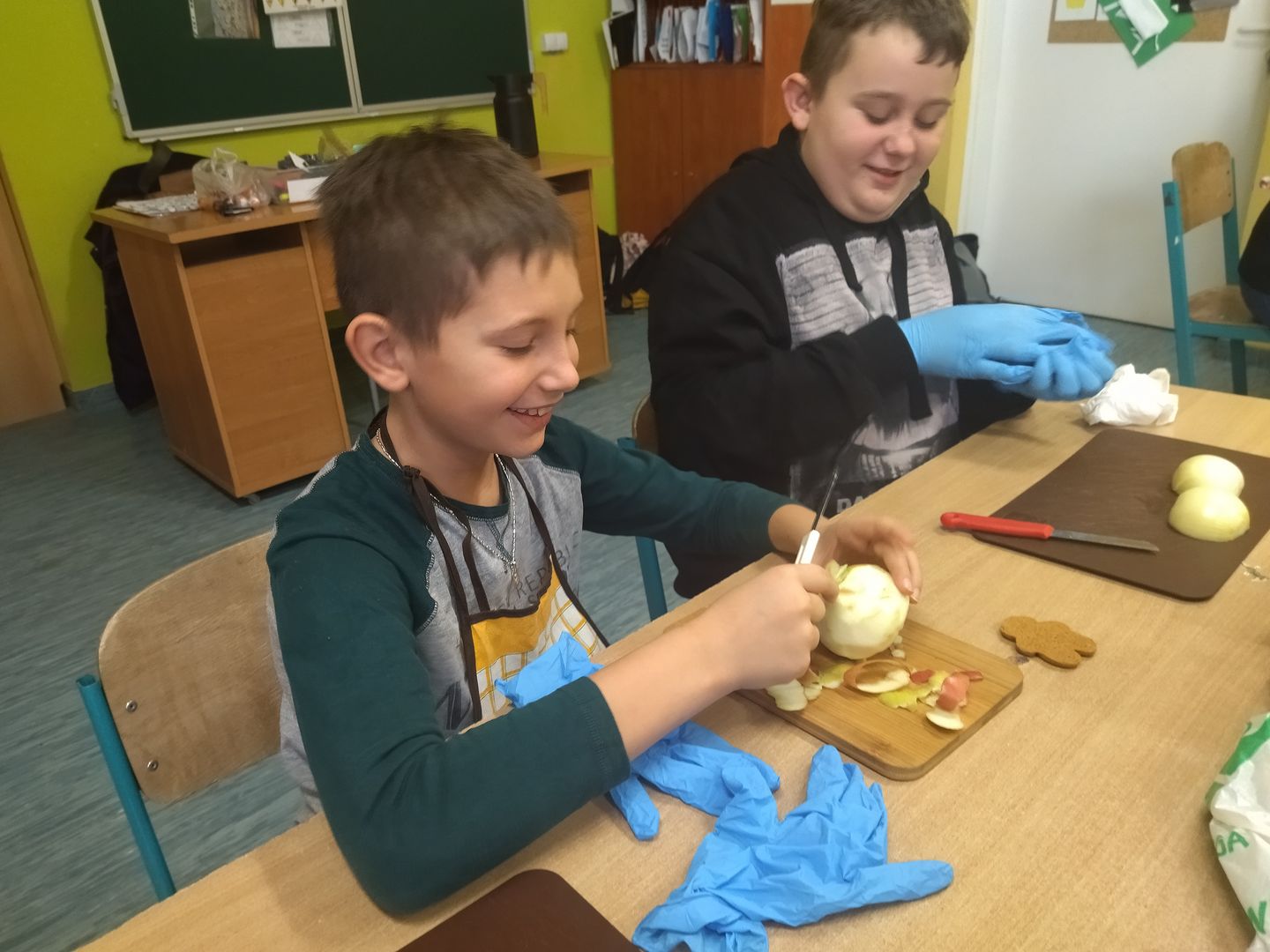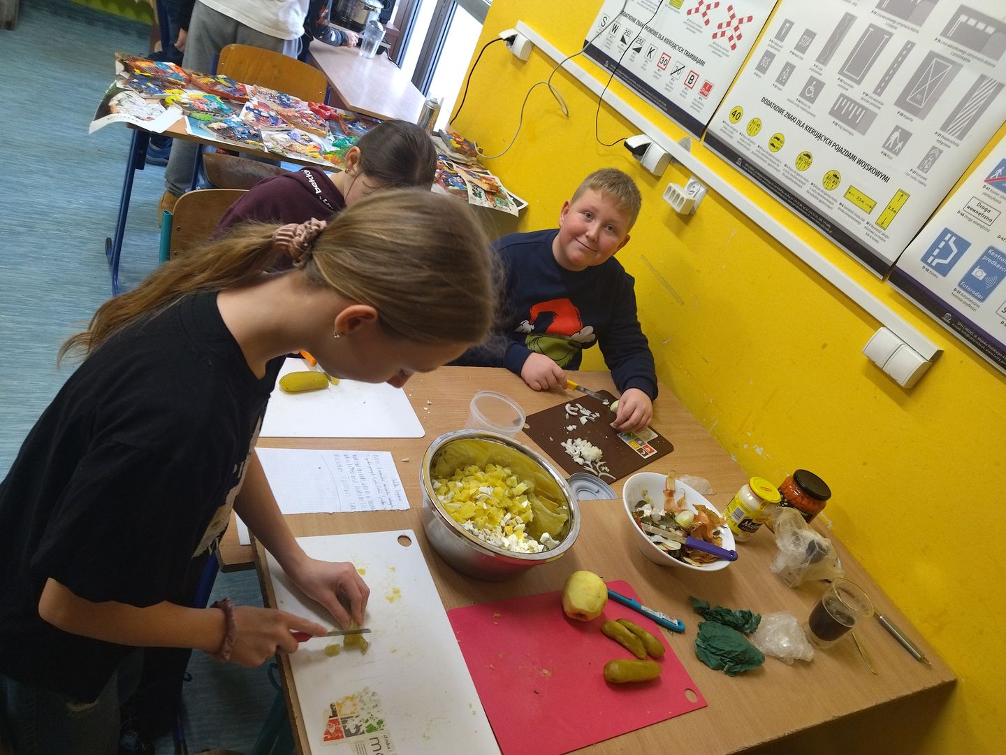 13 i 18 grudnia Rodzice i Uczniowie klas czwartych wzięli udział w lekcjach otwartych języka polskiego i … komunikacji, pracy zespołowej, integracji i zajęć kulinarnych. Zadaniem małych zespołów (jeden Rodzic i dwoje Dzieci z zastrzeżeniem, aby Rodzic nie był Master Szefem w drużynie swojego Dziecka) było stworzyć recepturę / przepis na danie świąteczne, następnie zespołowo je wykonać, a o ustalonej godzinie przeznaczyć do wspólnej degustacji. Dodatkowo zespoły zmagały się z wymyśleniem nazwy, która najlepiej oddałaby charakter działań grupy lub kulinarne wyzwanie. Szkolna kuchnia w sali technicznej tętniła energią różnych działań, od podziału obowiązków do pokonywania trudności na warsztacie deseczek i noży. Było przyjaźnie, wesoło, twórczo i najważniejsze, że razem. Bardzo dziękujemy Rodzicom klas czwartych za zaangażowanie, energię i wyobraźnię Starszaków. Do zobaczenia w kolejnych zadaniach!