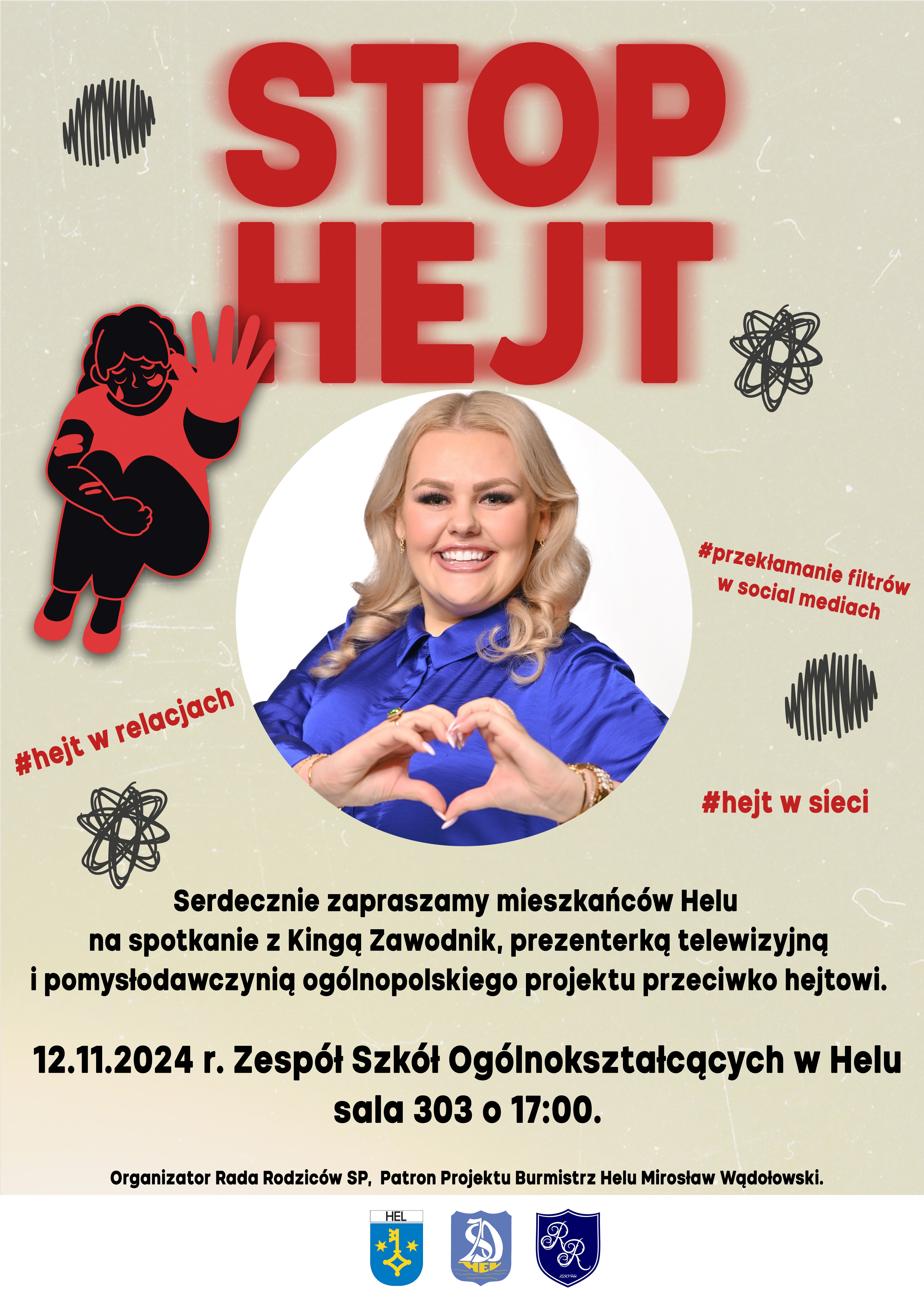 Serdecznie zapraszamy na spotkanie z Panią Kingą Zawodnik 12.11.2024r. godz. 17.00 ZSO w Helu sala 303, Spotkanie pod hasłem STOP HEJT