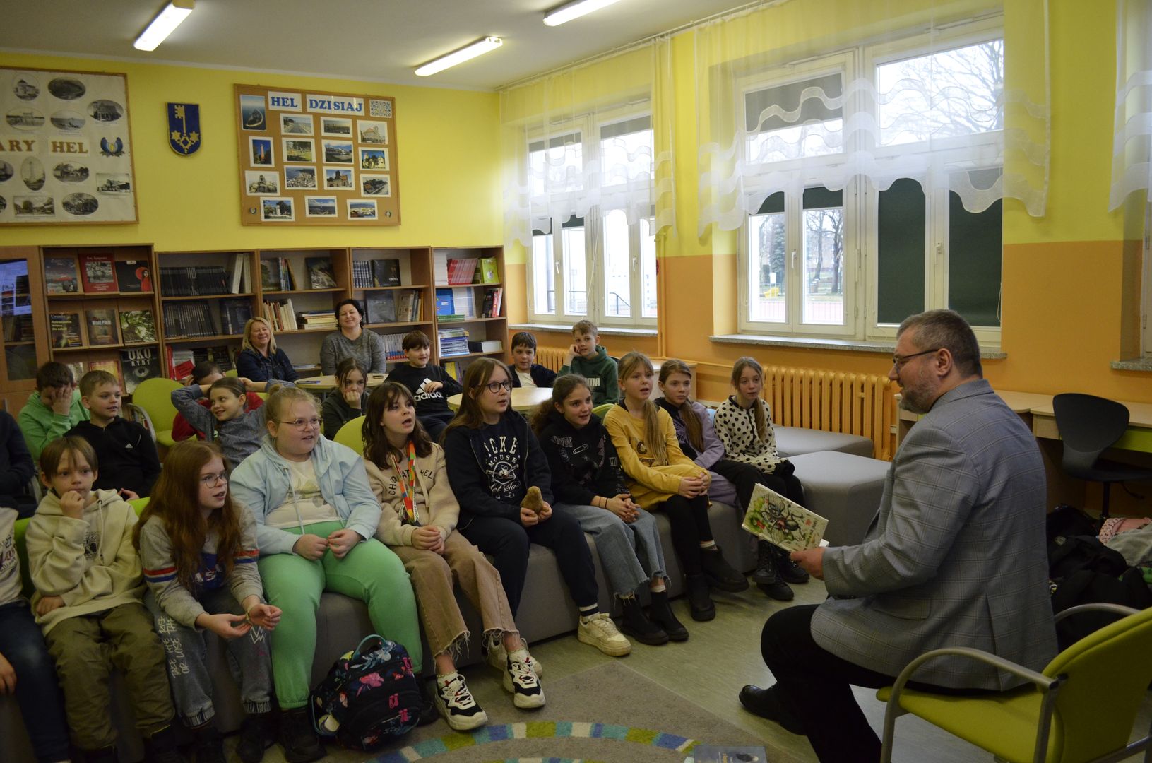 Nieco później Wasta Tómk Fopka spotkał się z energicznymi klasami czwartymi, których niespożyte siły witalne należało zaledwie zaprosić do ćwiczeń językowych i muzycznych, żeby gościnna czytelnia wypełniła się onomatopeicznym paliwem emocji, wrażeń i dzikiej teatralnej mocy.