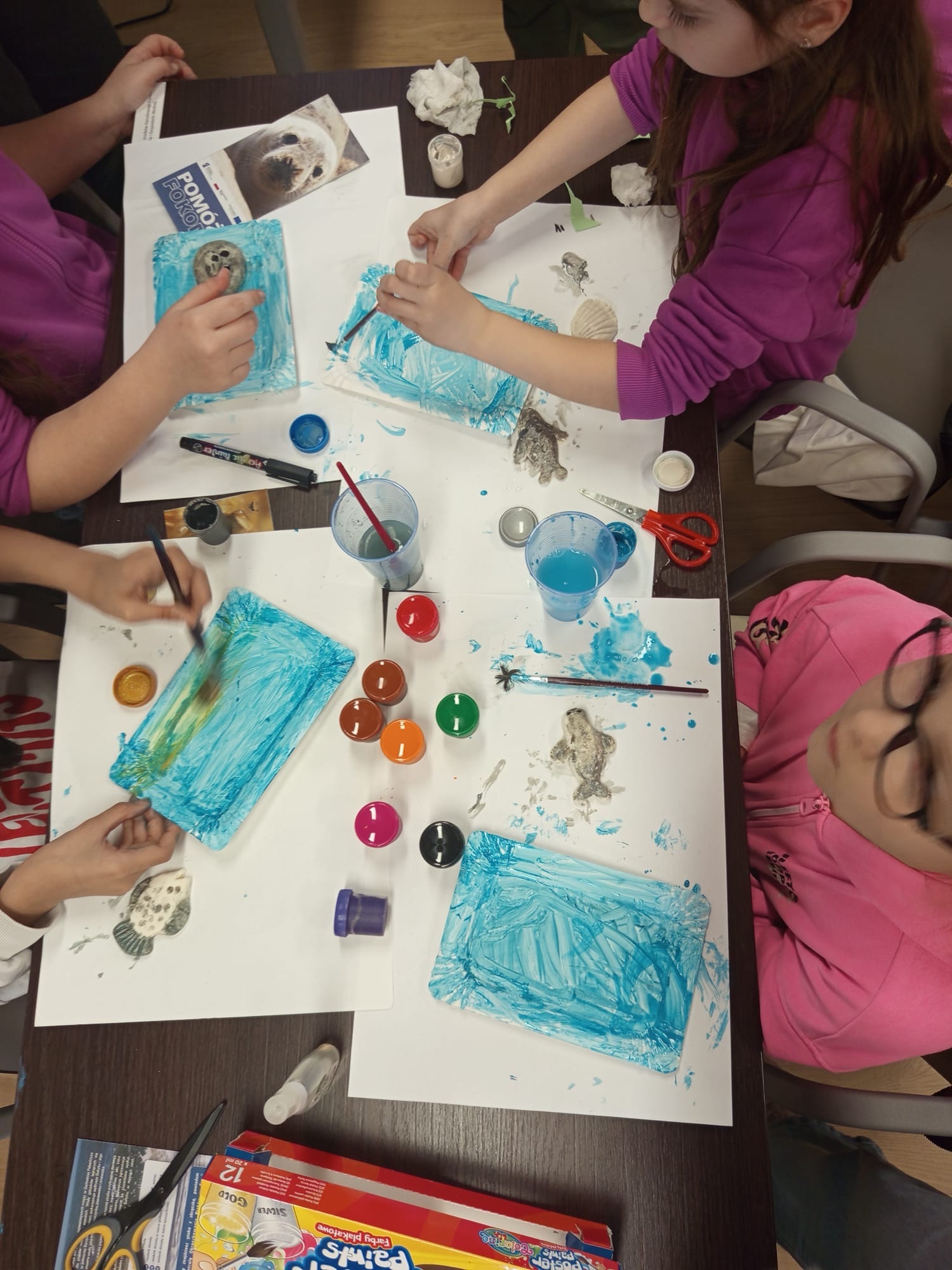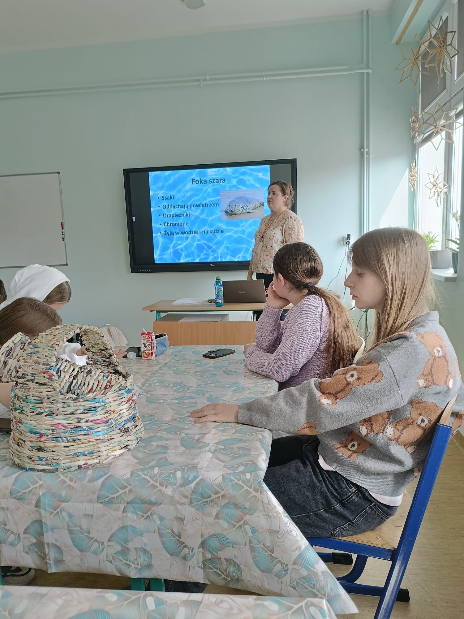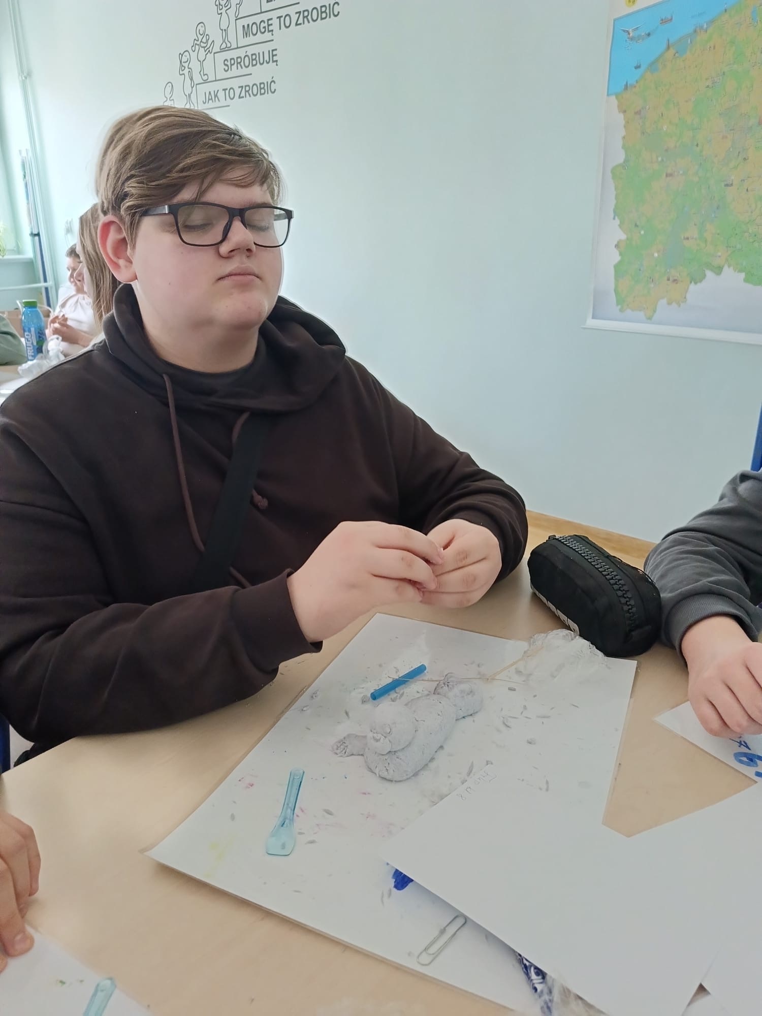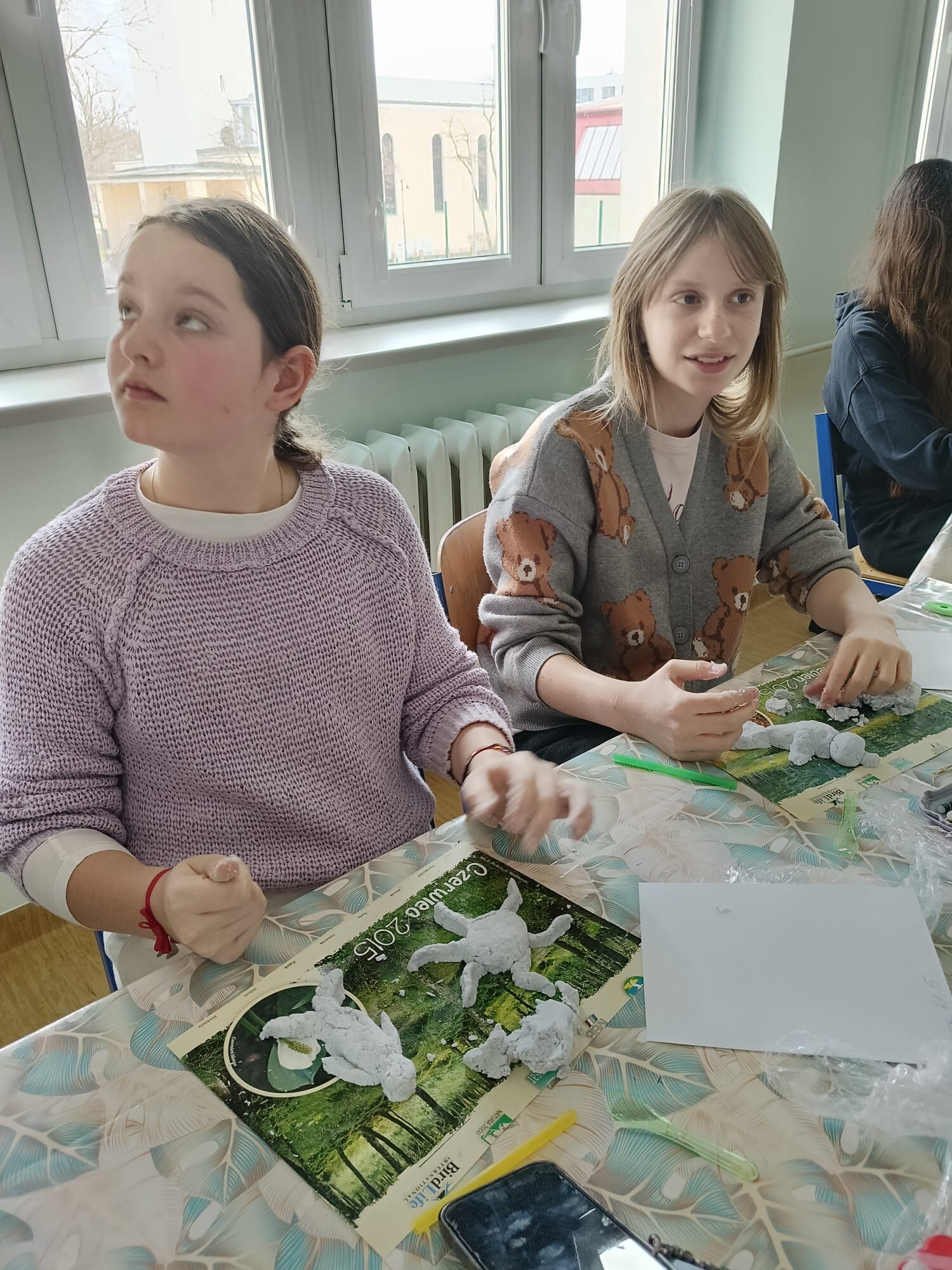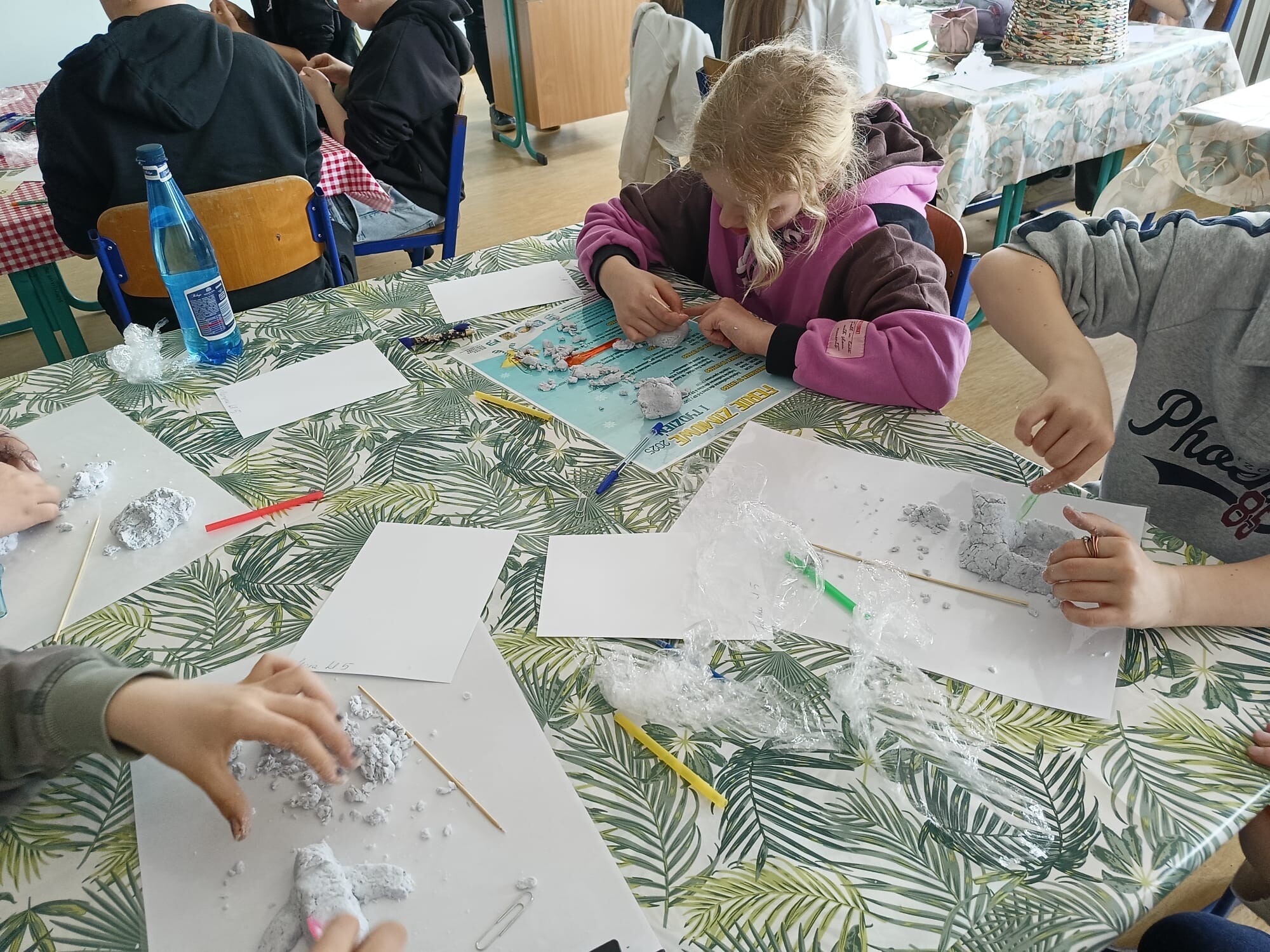 - Konkurs Drugie Życie Odpadów II tura. Pracowały w niej klasy szóste i siódma. Wyczerpujący wstęp o współczesnych problemach ekologicznych posłużył do dyskusji o korzyściach recyklingu i upcyklingu. Uczyliśmy się, jak zmniejszać zużycie surowców naturalnych oraz ilości powstałych odpadów. W duchu upcyklingu, czyli bez zbędnego zużycia energii elektrycznej i gazu, praktykowaliśmy techniki ręczne. To również przyczynia się do dbania o nasze środowisko, a może też stać się przedmiotem sztuki, na co liczymy jako organizatorzy Konkursu „Drugie Życie Odpadów”. Rozwiązanie konkursu nastąpi dopiero w maju, jako że prace z masy papierowej wymagają wysuszenie i pomalowania.