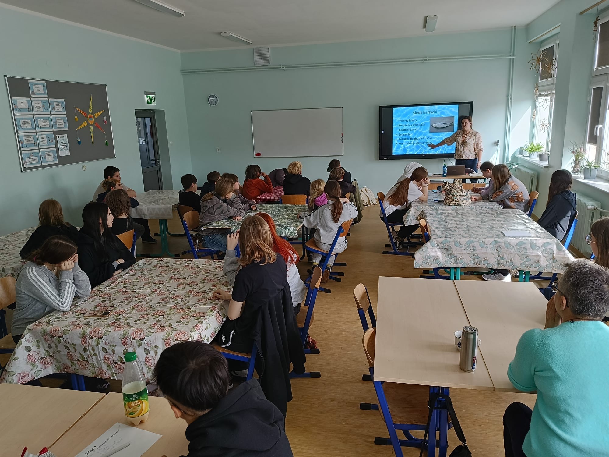 - Akcja terenowa „Czysty Hel – Czysty Bałtyk” – Uczniowie klasy 4SP ze specjalnym gościem z EKOHELu, Panem Sebastianem Pszenicznym, podjęli aktywne ekologiczne zadanie. Wyruszyli na Górę Szwedów, by tam wysłuchać lekcji o konieczności właściwego segregowania śmieci i zagrożeniach z powodu mikro plastiku w wodach Morza Bałtyckiego. W drodze powrotnej czwartoklasiści sprzątali plażę, pieczętując zdobytą wiedzę.