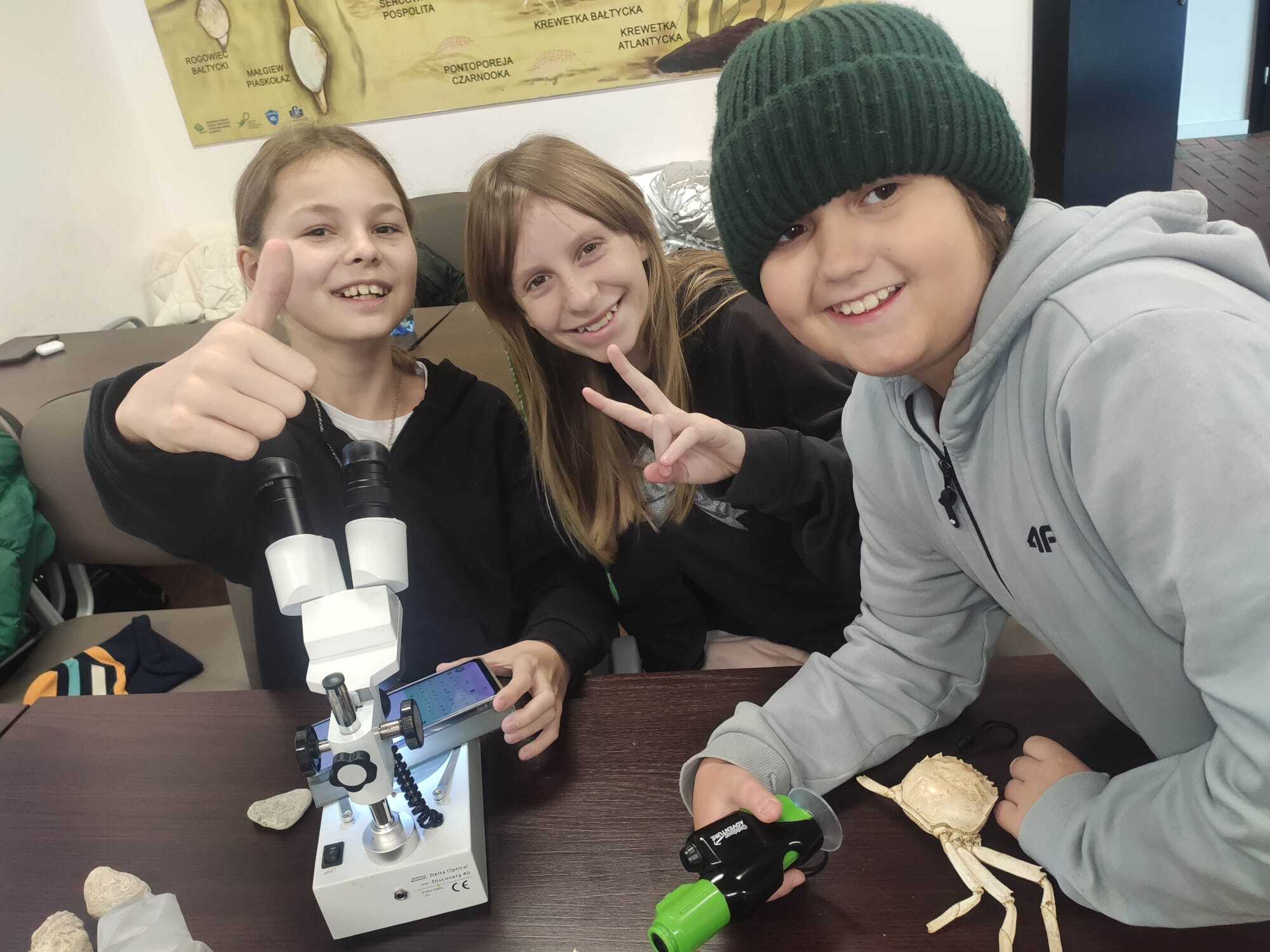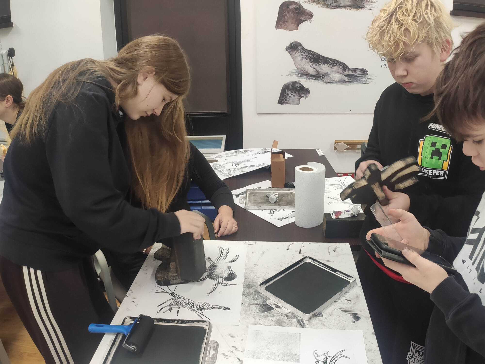 Piątkowe zajęcia w Stacji Morskiej upłynęły pod znakiem poszukiwań przybyszów, którzy do Bałtyku przypłynęli z innych mórz. Choć nasze morze jest wyjątkowe w skali Europy, a nawet świata (najsłodsze, najmłodsze i najpłytsze) z odległych akwenów przybywają tu gatunki nieraz bardzo egzotyczne, poszerzając tym samym zasięg swojego występowania. Nie zawsze ich obecność pozostaje bez echa, warto więc odpowiedzialnie podróżować, by zabierając pasażerów na gapę, nie narobić Bałtykowi kłopotów. Dużych i małych bałtyckich gatunków obcych poszukiwali uczniowie klas 4, 5 i 7SP, posługując się własnym wzrokiem a także lupą i przenośnym mikroskopem. Na koniec chętni odbijali linorytowe wizerunki bałtyckich gości na tekstyliach lub papierze.