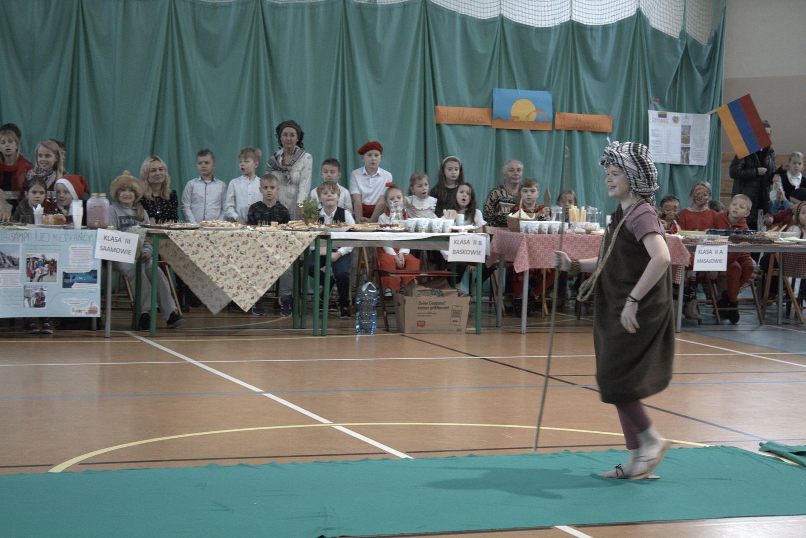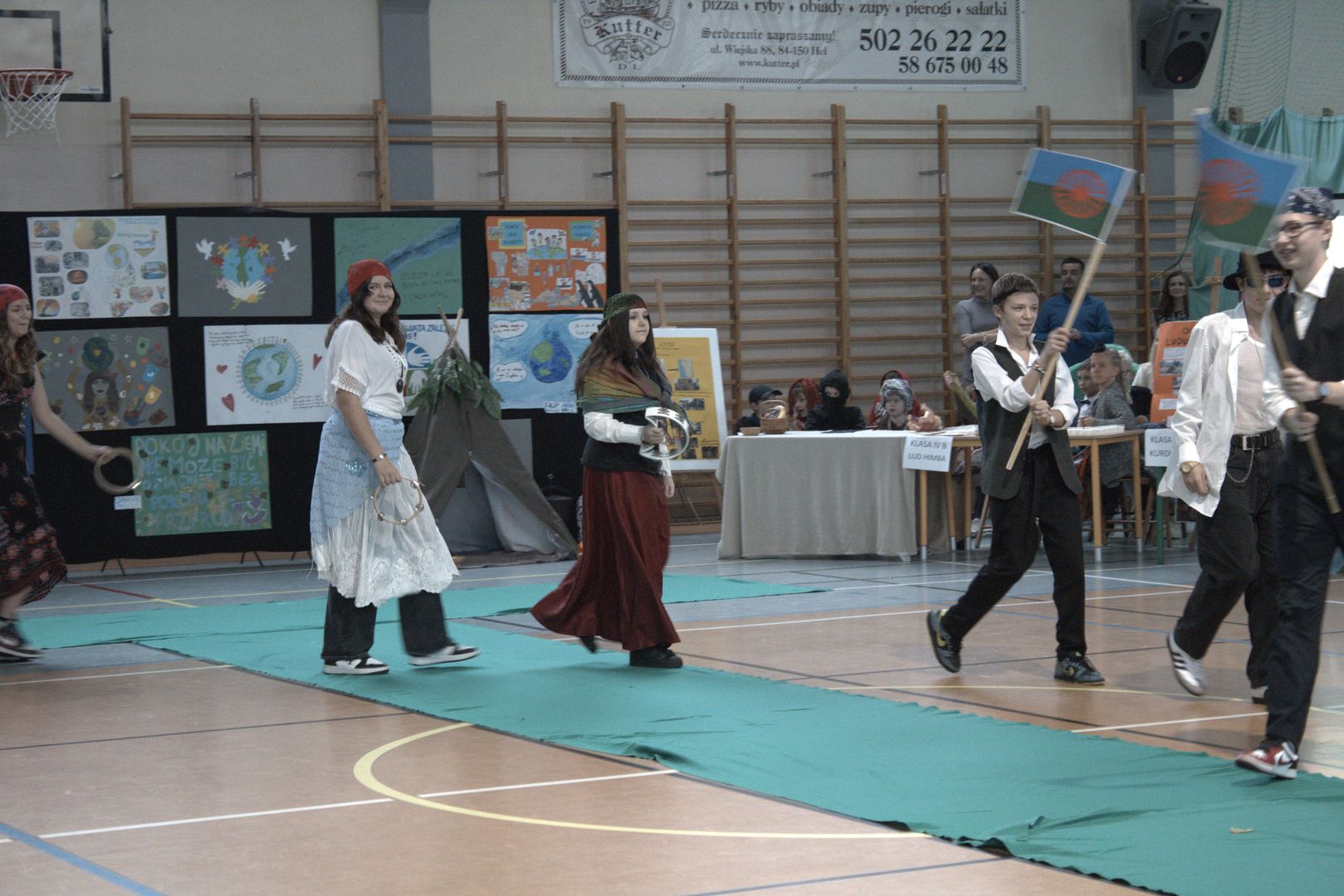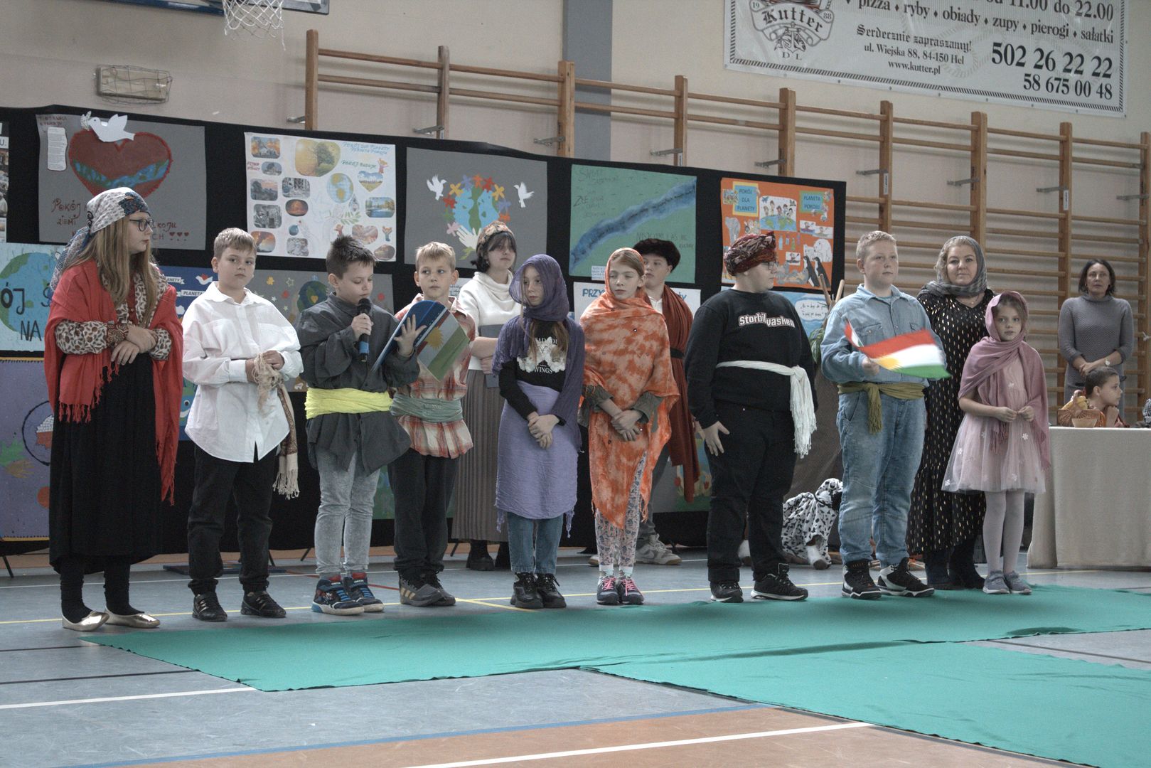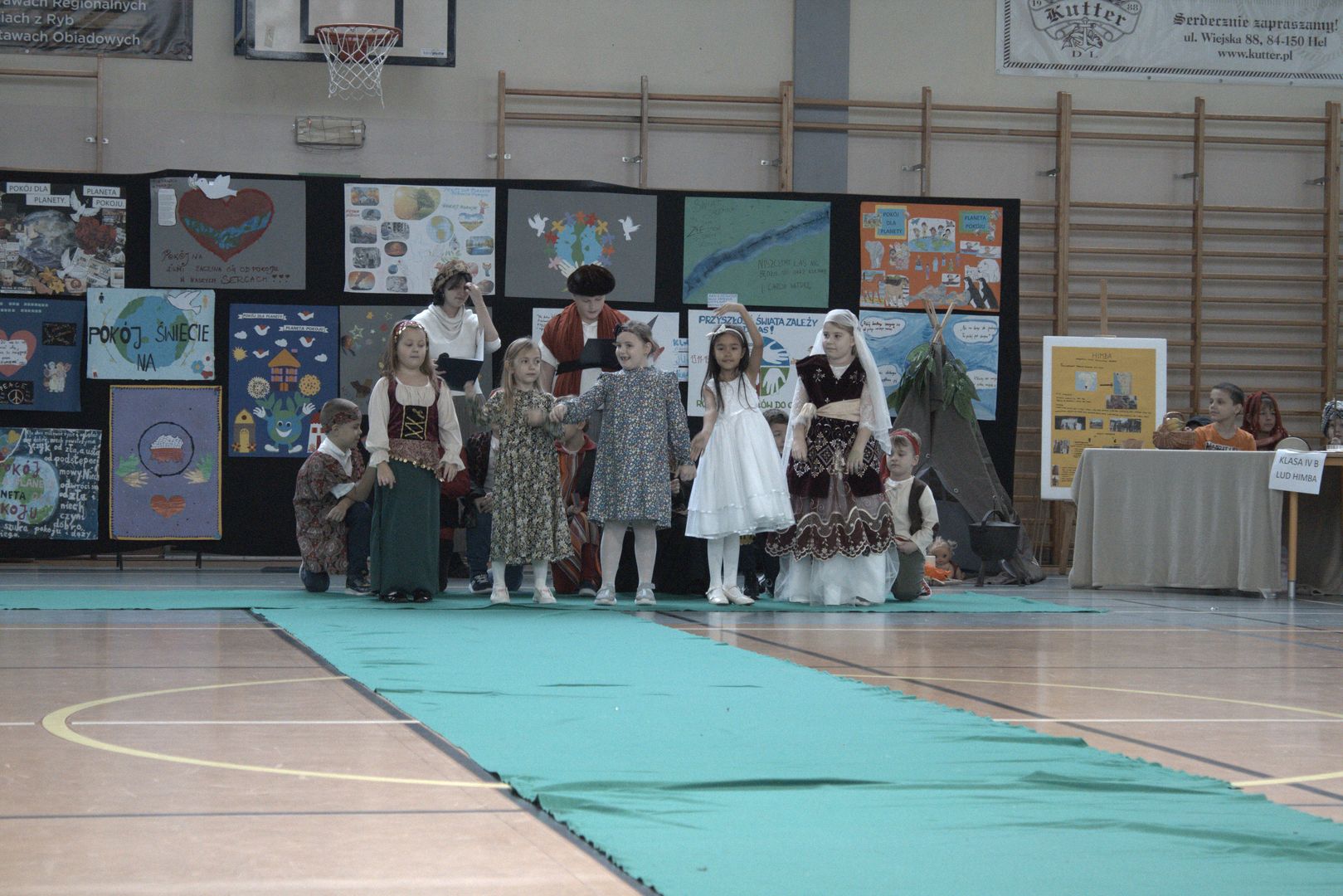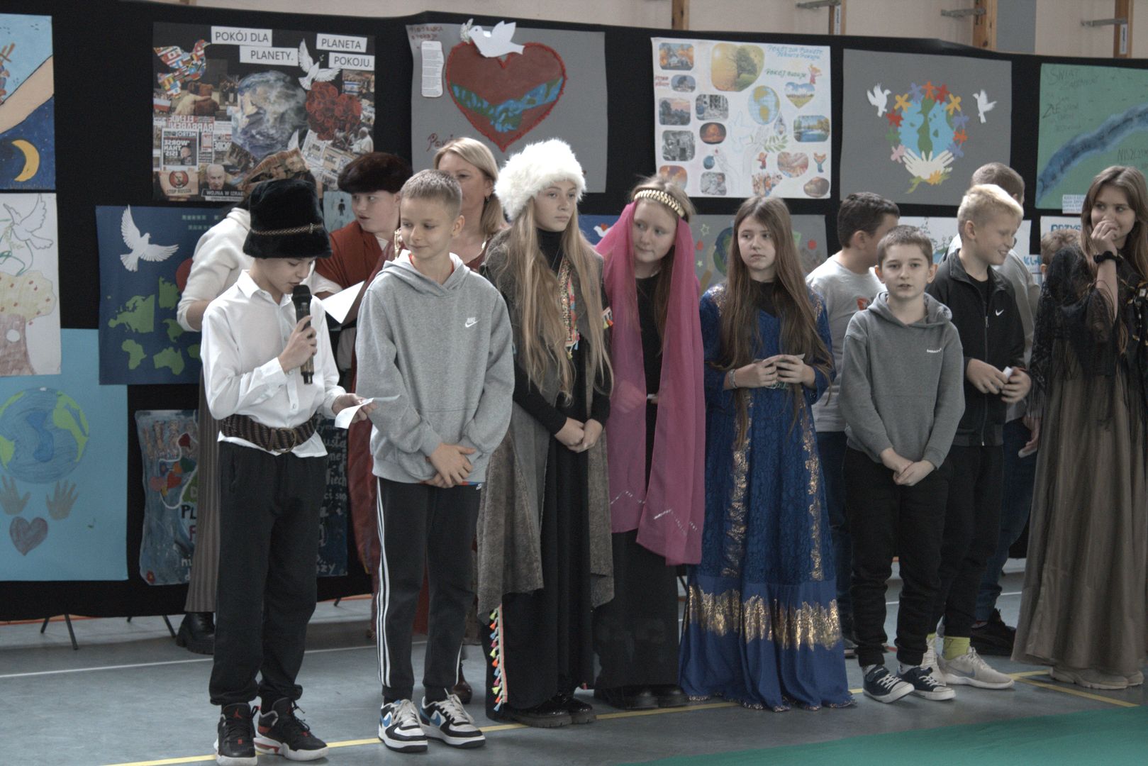 Piątek podyktowany był działaniami związanymi z przybliżaniem obrazu małych nacji, grup etnicznych i kulturowych, tak aby temat pokoju na planecie Ziemi dotyczył wszystkich, także tych, którzy są nam odlegli, czasami wręcz egzotyczni. Klasy losowały grupy a następnie przygotowywały prezentację oraz krótki poczęstunek. I tak klasa 1a w tanecznym pląsie zamieniała się w Ormian, czyli starożytny naród indoeuropejski. Klasa 2a przeniosła nas do Afryki i przedstawiła etniczną grupę Masajów, a 2b wcieliła się w prastary naród znad Zatoki Biskajskiej - Basków. Trzecioklasiści wylosowali Saamów, zwanych Lapończykami, związanych z rejonem północnym, a klasy czwarte pochyliły się nad ludem Himba i Kurdami. Piątacy zaprezentowali kulturę Łemków, a klasa szósta Tatarów. Siódmoklasiści otworzyli się na kulturę żydowską, a klasa ósma zawirowała w rytm muzyki ludów Sinti. Najstarsi reprezentanci szkoły, uczniowie HEL-LO przybliżyli kulturę najmniejszej grupy kulturowo- religijnej w naszym kraju- Karaimów. Pokaz uzupełniały muzyka i charakterystyczne przysmaki danej nacji.