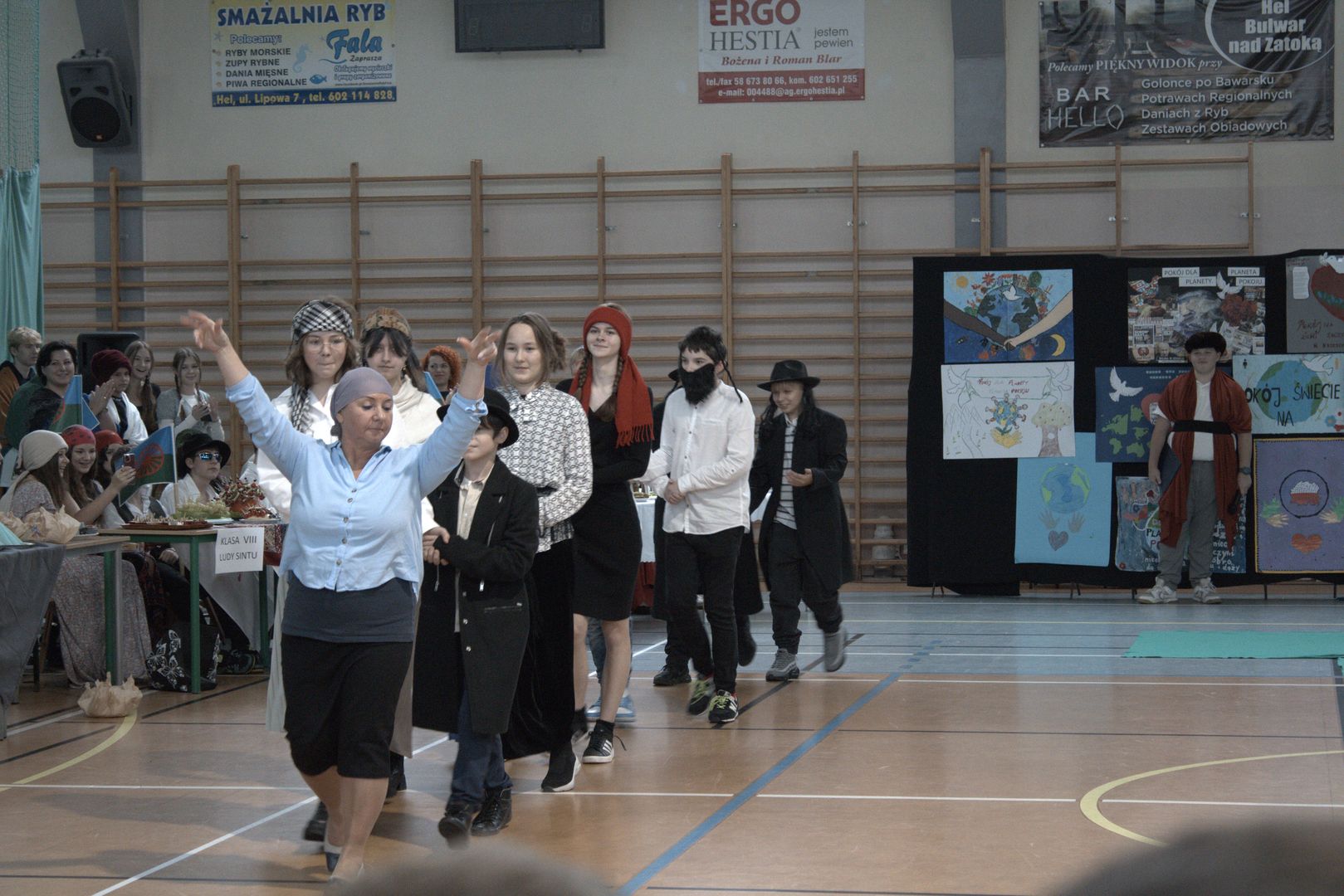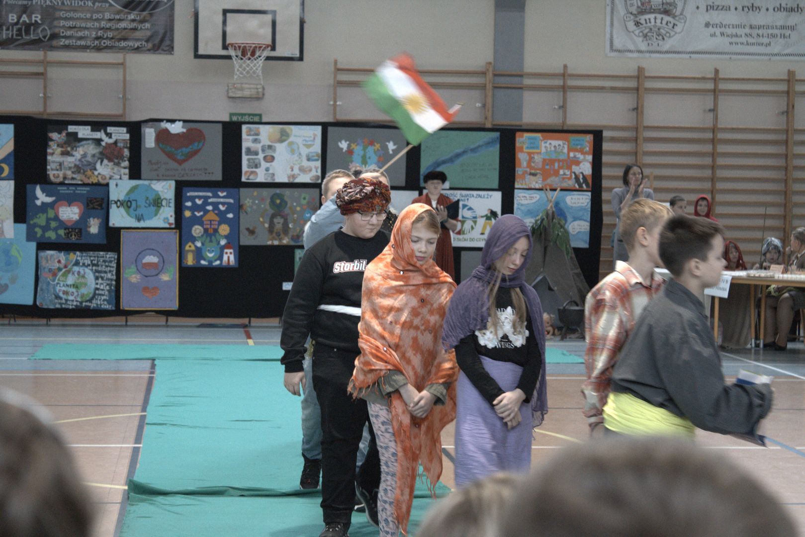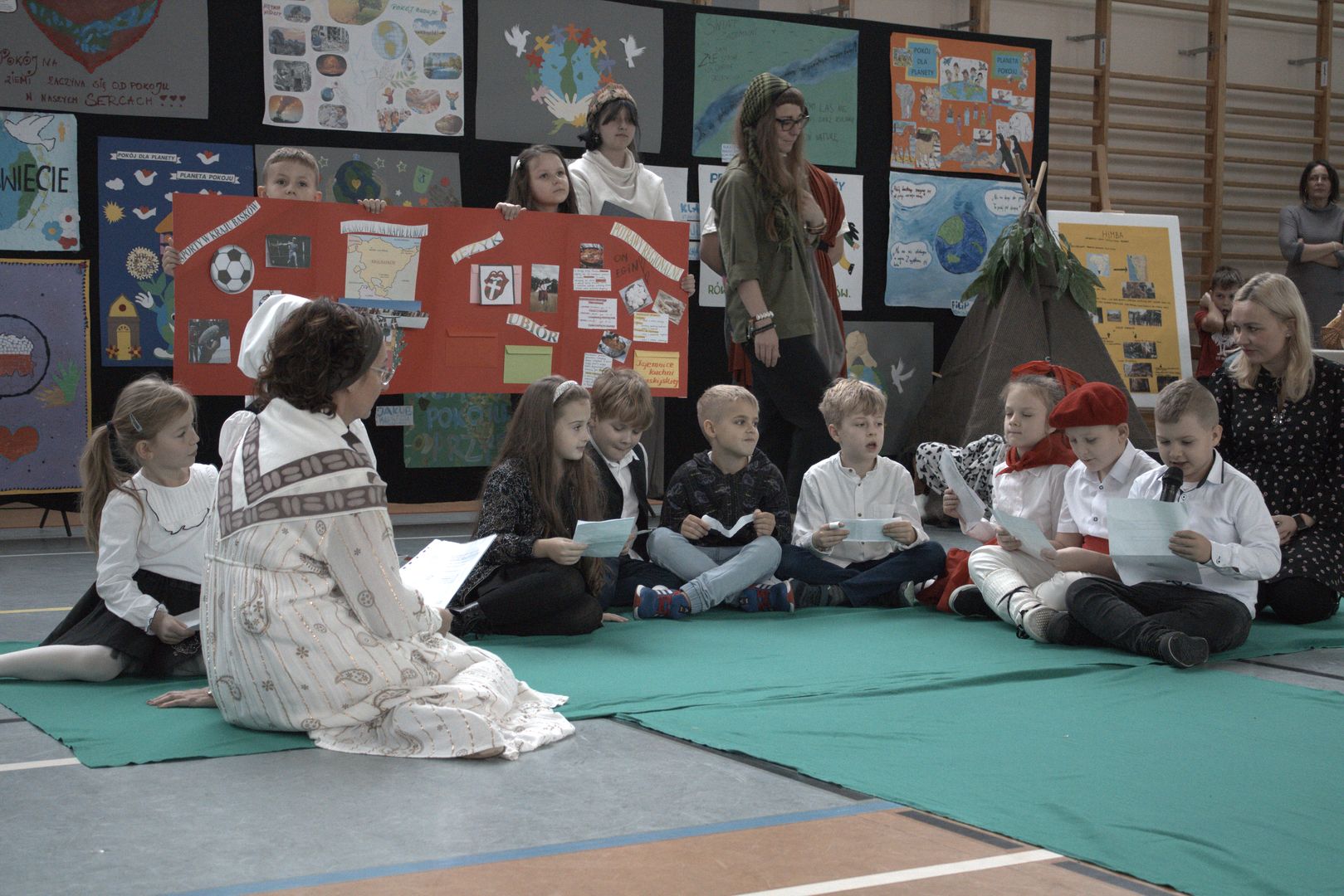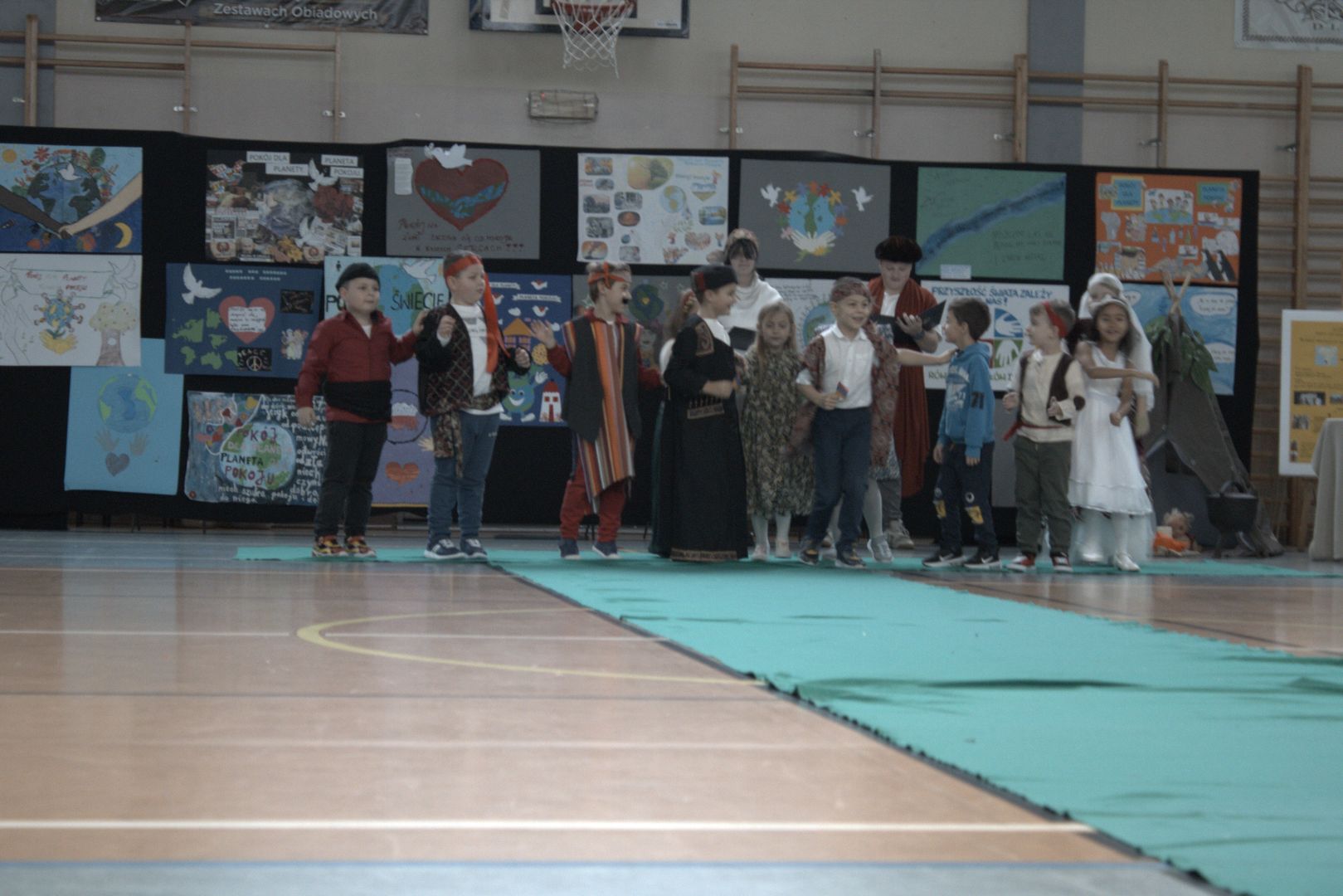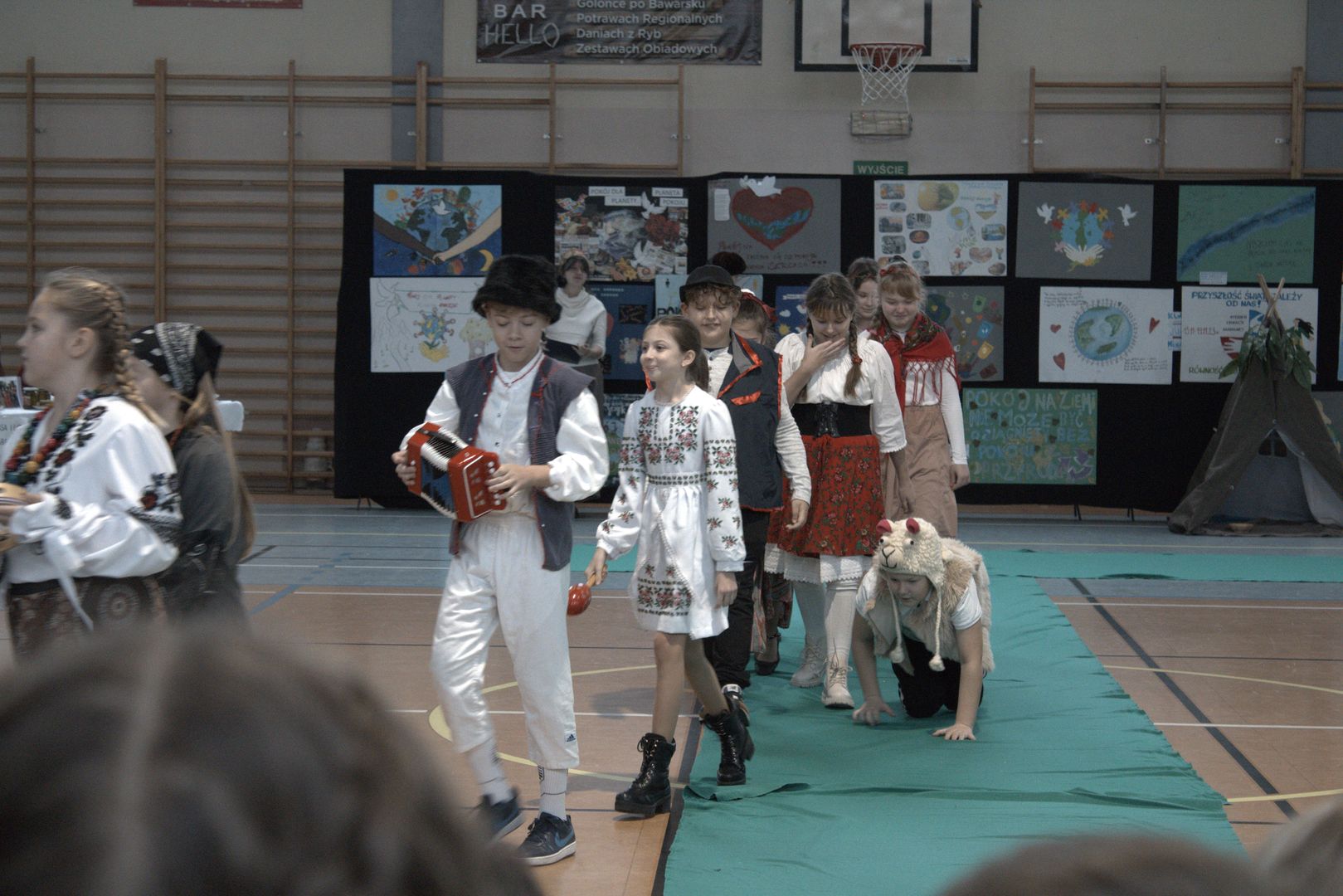 Piątek podyktowany był działaniami związanymi z przybliżaniem obrazu małych nacji, grup etnicznych i kulturowych, tak aby temat pokoju na planecie Ziemi dotyczył wszystkich, także tych, którzy są nam odlegli, czasami wręcz egzotyczni. Klasy losowały grupy a następnie przygotowywały prezentację oraz krótki poczęstunek. I tak klasa 1a w tanecznym pląsie zamieniała się w Ormian, czyli starożytny naród indoeuropejski. Klasa 2a przeniosła nas do Afryki i przedstawiła etniczną grupę Masajów, a 2b wcieliła się w prastary naród znad Zatoki Biskajskiej - Basków. Trzecioklasiści wylosowali Saamów, zwanych Lapończykami, związanych z rejonem północnym, a klasy czwarte pochyliły się nad ludem Himba i Kurdami. Piątacy zaprezentowali kulturę Łemków, a klasa szósta Tatarów. Siódmoklasiści otworzyli się na kulturę żydowską, a klasa ósma zawirowała w rytm muzyki ludów Sinti. Najstarsi reprezentanci szkoły, uczniowie HEL-LO przybliżyli kulturę najmniejszej grupy kulturowo- religijnej w naszym kraju- Karaimów. Pokaz uzupełniały muzyka i charakterystyczne przysmaki danej nacji.