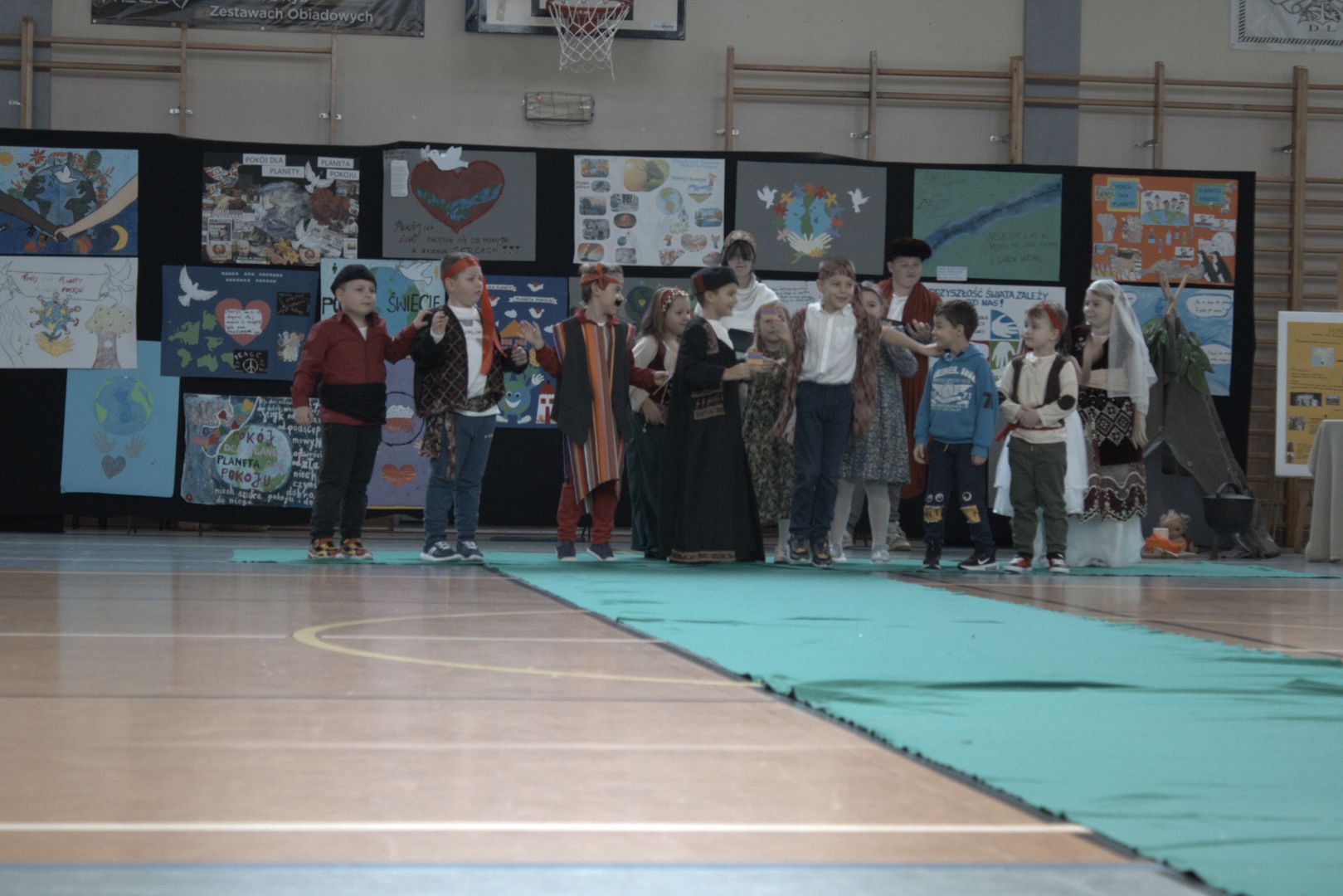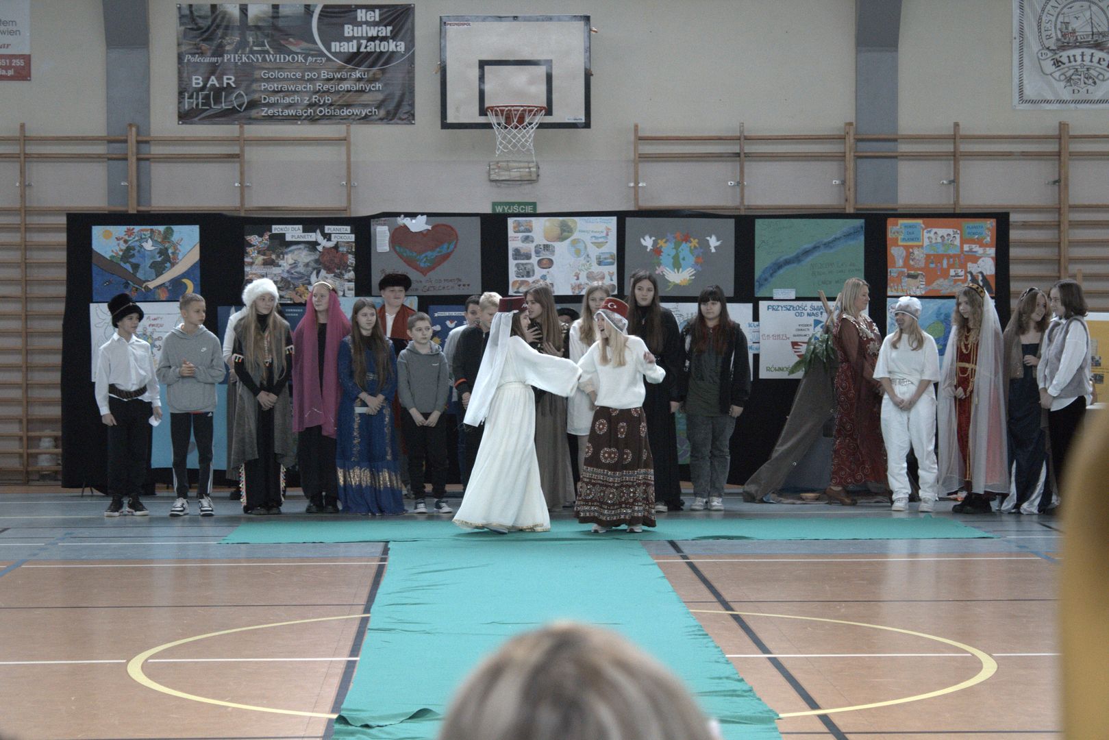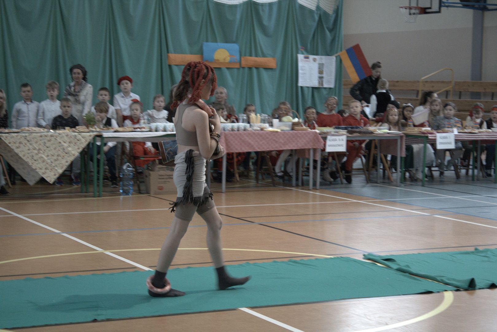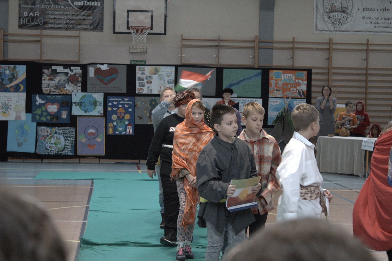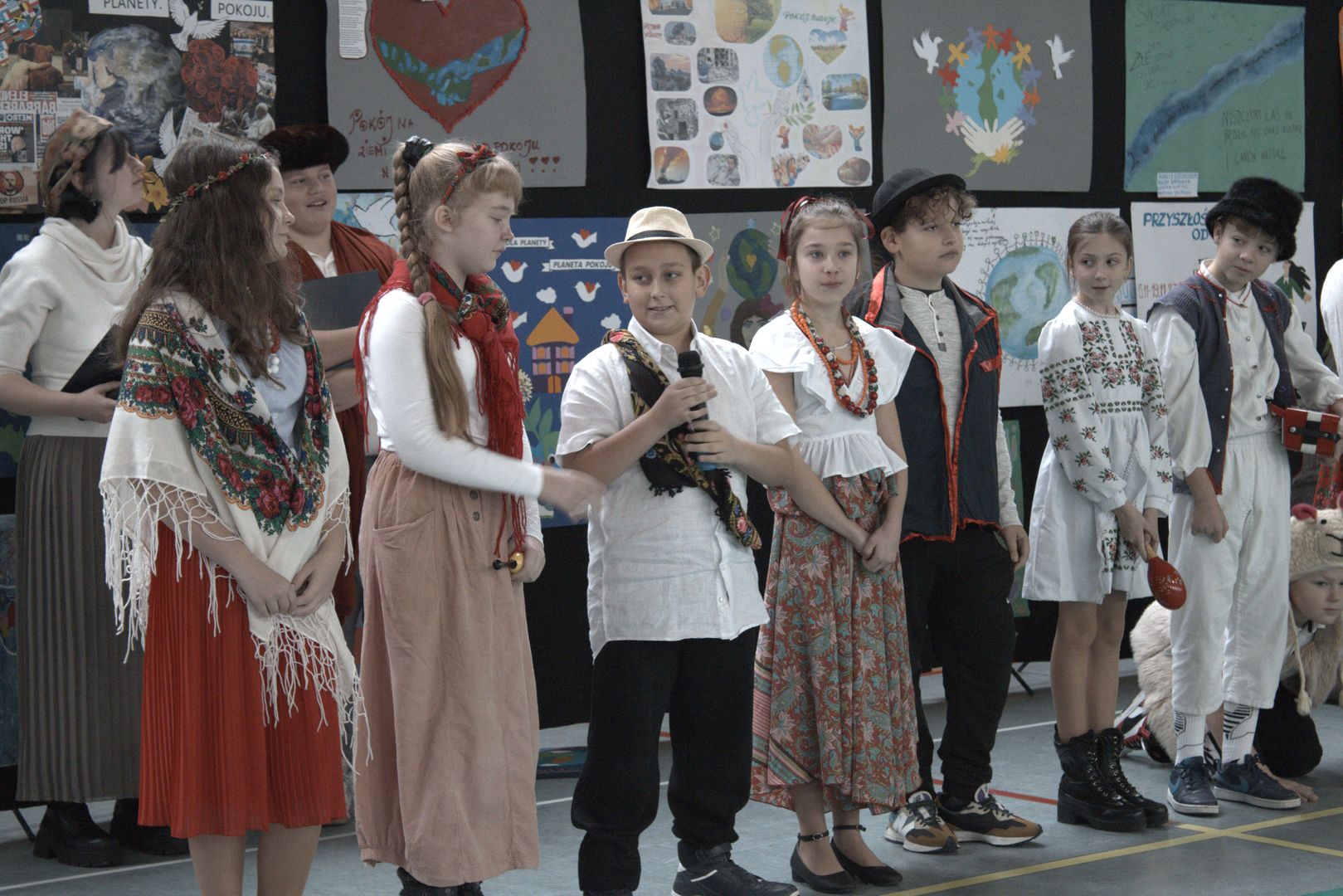 Piątek podyktowany był działaniami związanymi z przybliżaniem obrazu małych nacji, grup etnicznych i kulturowych, tak aby temat pokoju na planecie Ziemi dotyczył wszystkich, także tych, którzy są nam odlegli, czasami wręcz egzotyczni. Klasy losowały grupy a następnie przygotowywały prezentację oraz krótki poczęstunek. I tak klasa 1a w tanecznym pląsie zamieniała się w Ormian, czyli starożytny naród indoeuropejski. Klasa 2a przeniosła nas do Afryki i przedstawiła etniczną grupę Masajów, a 2b wcieliła się w prastary naród znad Zatoki Biskajskiej - Basków. Trzecioklasiści wylosowali Saamów, zwanych Lapończykami, związanych z rejonem północnym, a klasy czwarte pochyliły się nad ludem Himba i Kurdami. Piątacy zaprezentowali kulturę Łemków, a klasa szósta Tatarów. Siódmoklasiści otworzyli się na kulturę żydowską, a klasa ósma zawirowała w rytm muzyki ludów Sinti. Najstarsi reprezentanci szkoły, uczniowie HEL-LO przybliżyli kulturę najmniejszej grupy kulturowo- religijnej w naszym kraju- Karaimów. Pokaz uzupełniały muzyka i charakterystyczne przysmaki danej nacji.