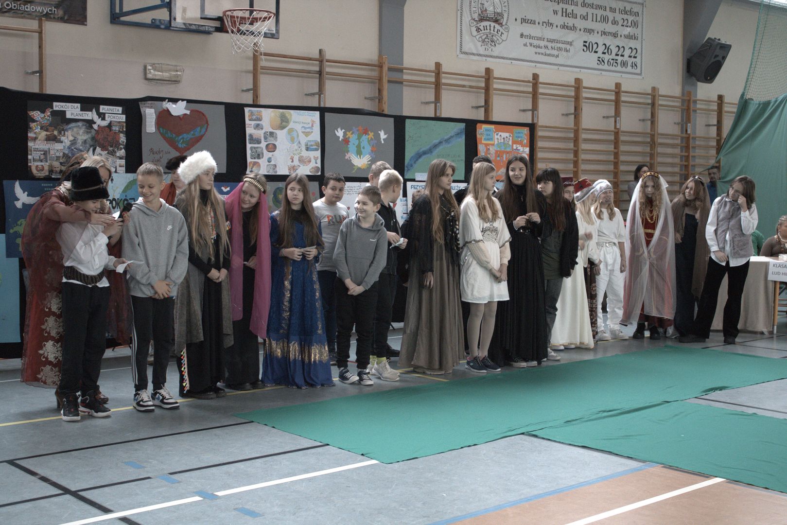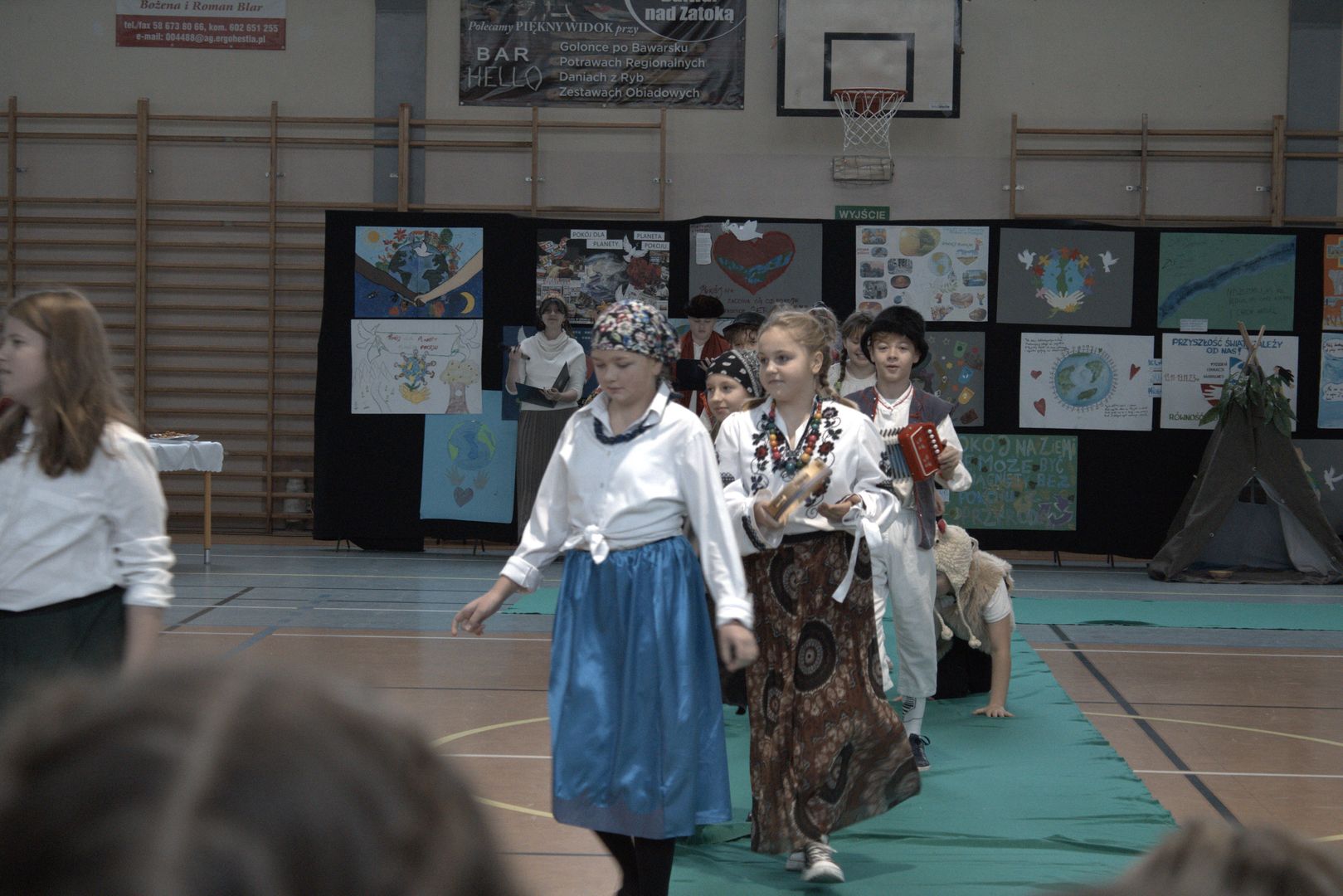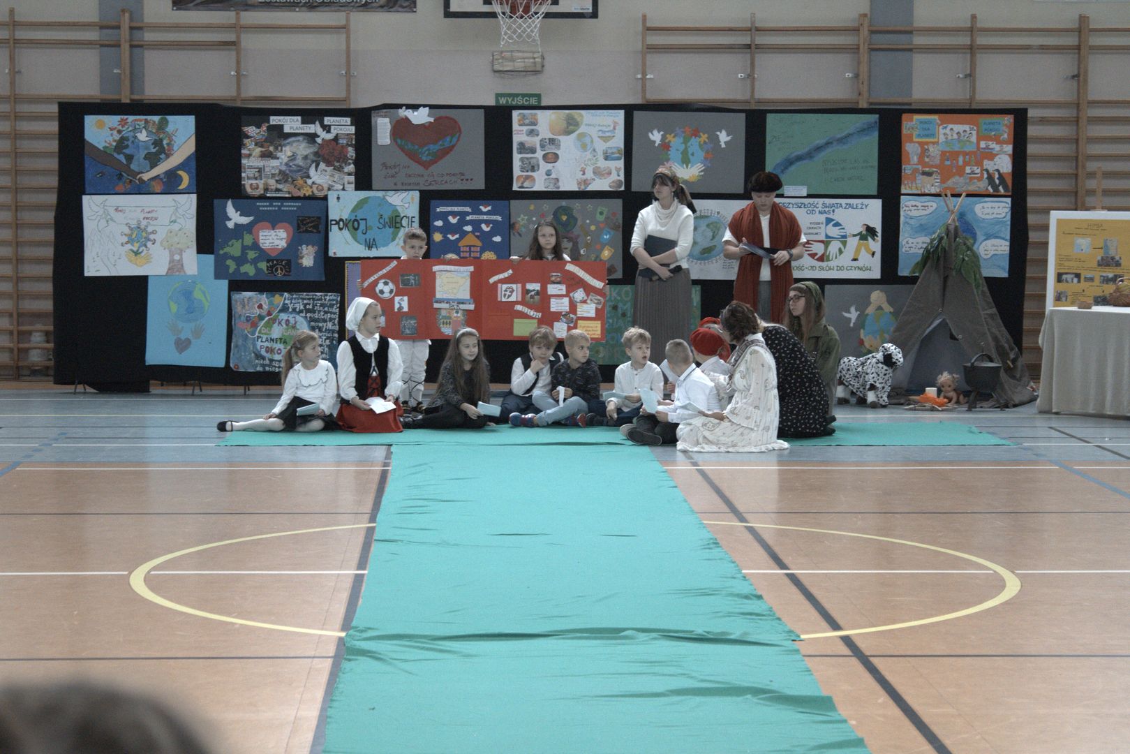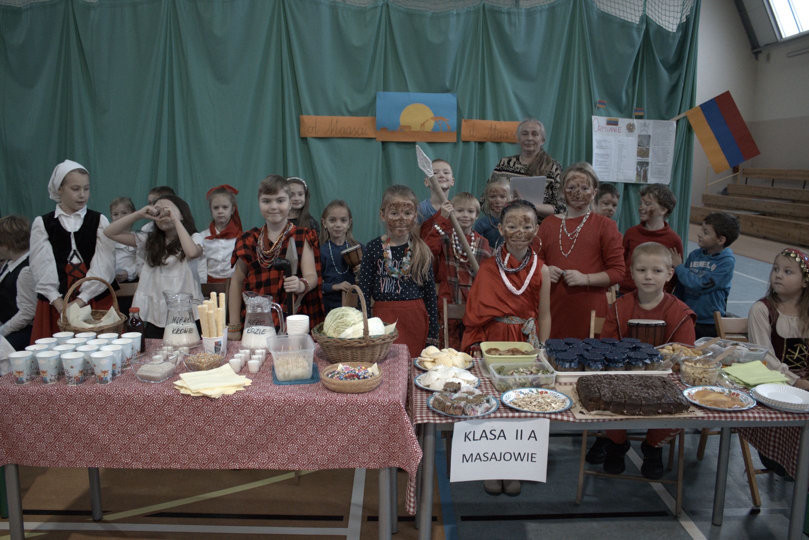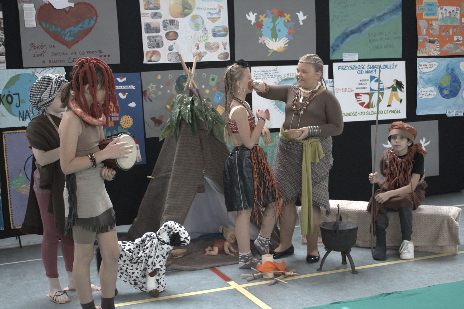 Piątek podyktowany był działaniami związanymi z przybliżaniem obrazu małych nacji, grup etnicznych i kulturowych, tak aby temat pokoju na planecie Ziemi dotyczył wszystkich, także tych, którzy są nam odlegli, czasami wręcz egzotyczni. Klasy losowały grupy a następnie przygotowywały prezentację oraz krótki poczęstunek. I tak klasa 1a w tanecznym pląsie zamieniała się w Ormian, czyli starożytny naród indoeuropejski. Klasa 2a przeniosła nas do Afryki i przedstawiła etniczną grupę Masajów, a 2b wcieliła się w prastary naród znad Zatoki Biskajskiej - Basków. Trzecioklasiści wylosowali Saamów, zwanych Lapończykami, związanych z rejonem północnym, a klasy czwarte pochyliły się nad ludem Himba i Kurdami. Piątacy zaprezentowali kulturę Łemków, a klasa szósta Tatarów. Siódmoklasiści otworzyli się na kulturę żydowską, a klasa ósma zawirowała w rytm muzyki ludów Sinti. Najstarsi reprezentanci szkoły, uczniowie HEL-LO przybliżyli kulturę najmniejszej grupy kulturowo- religijnej w naszym kraju- Karaimów. Pokaz uzupełniały muzyka i charakterystyczne przysmaki danej nacji.