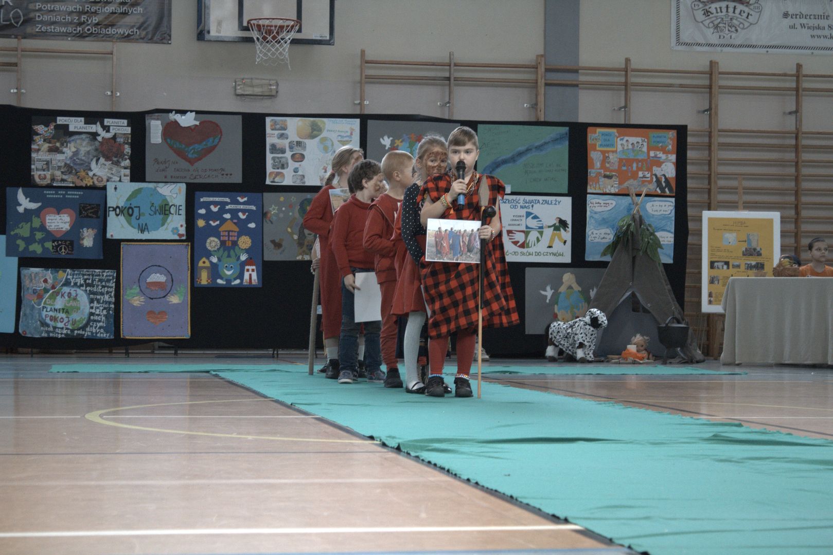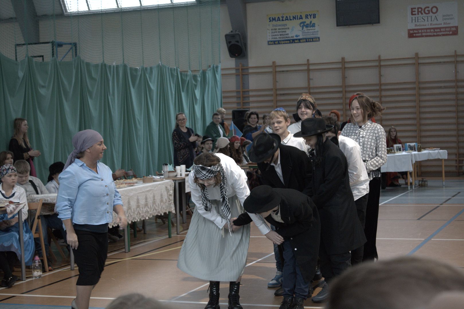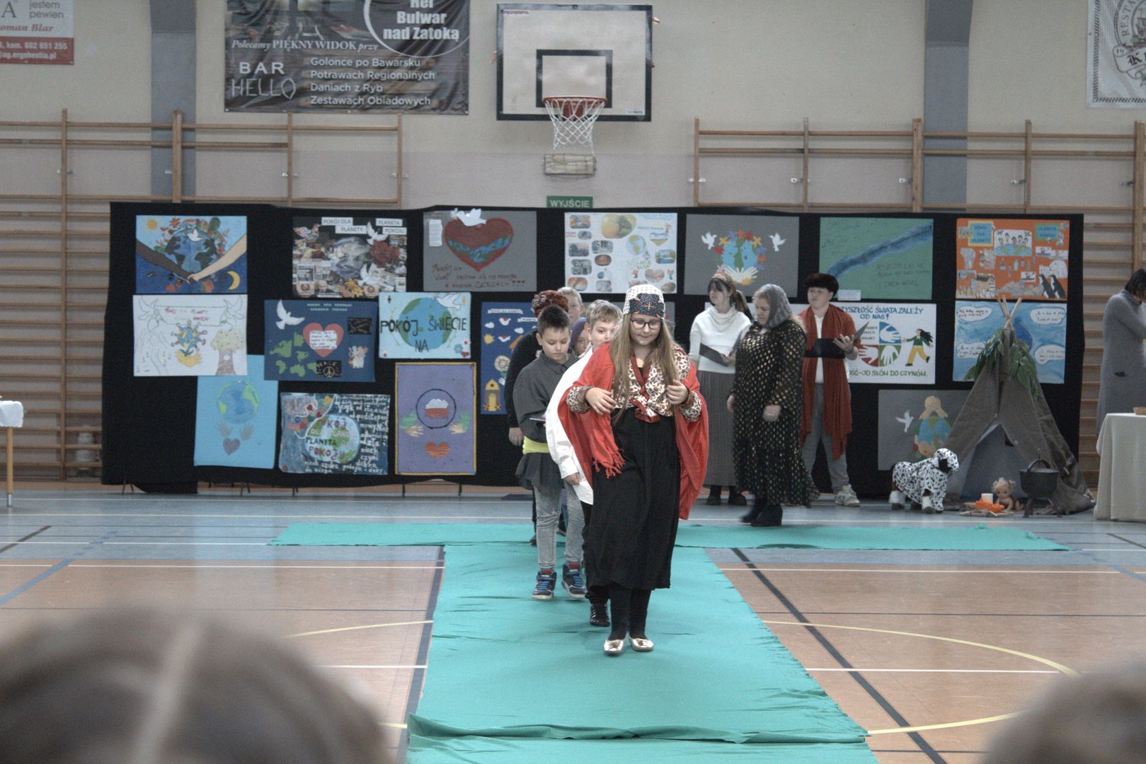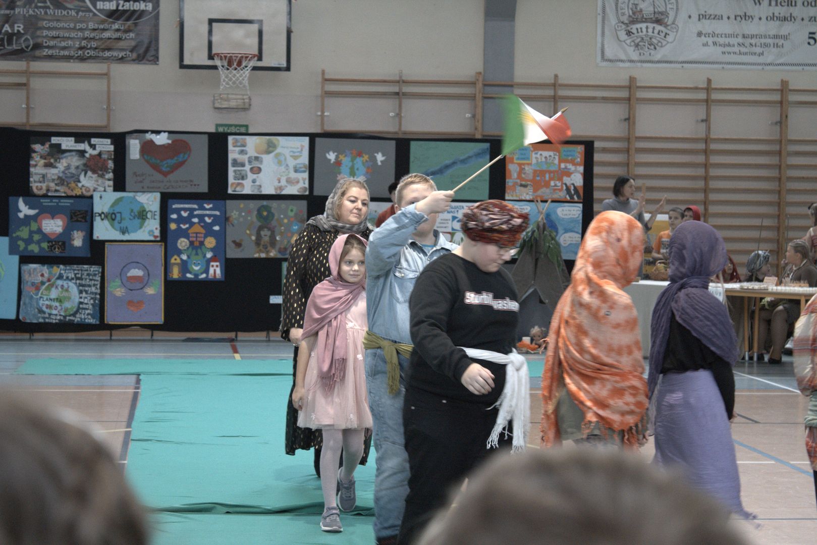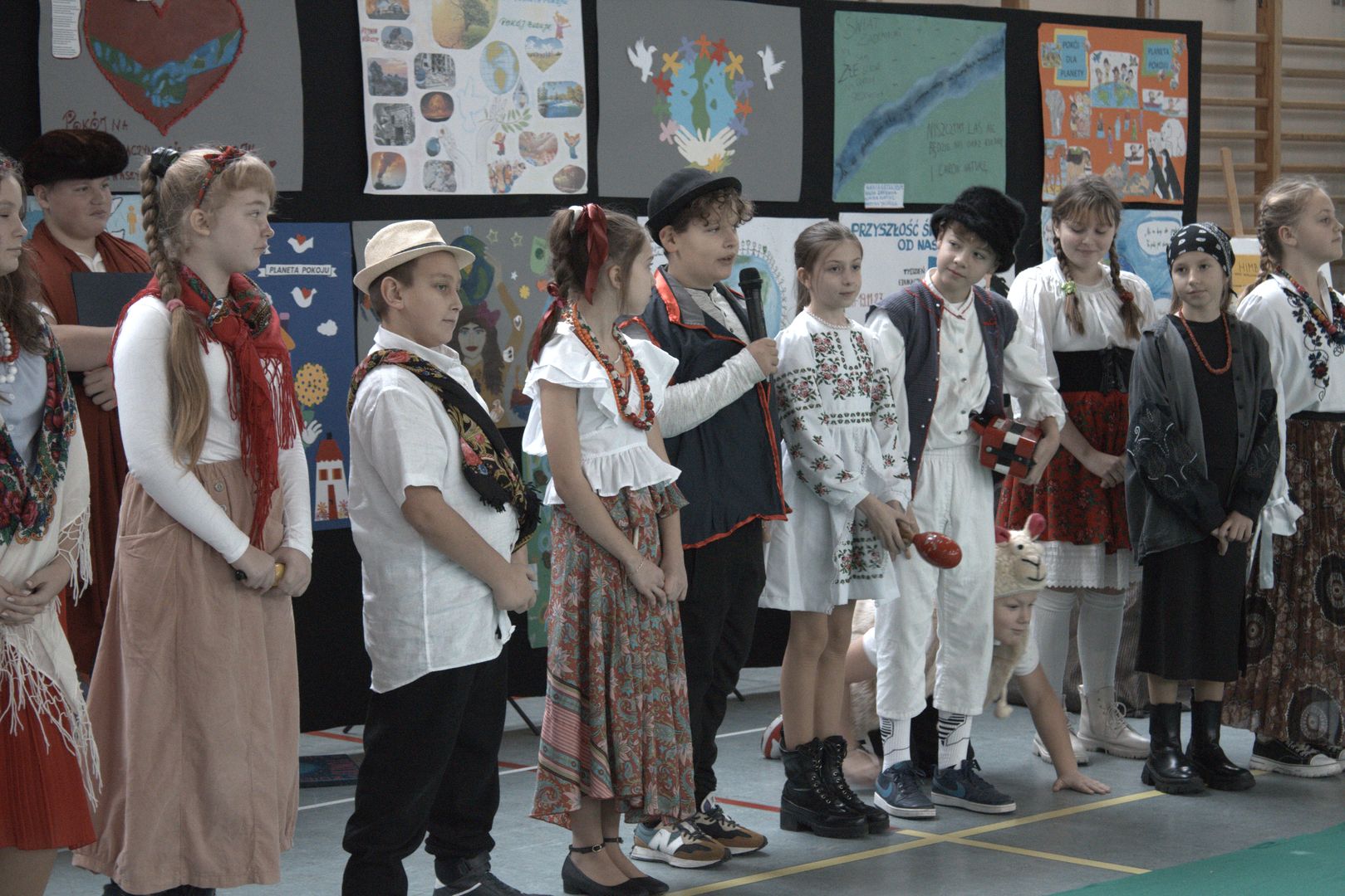 Piątek podyktowany był działaniami związanymi z przybliżaniem obrazu małych nacji, grup etnicznych i kulturowych, tak aby temat pokoju na planecie Ziemi dotyczył wszystkich, także tych, którzy są nam odlegli, czasami wręcz egzotyczni. Klasy losowały grupy a następnie przygotowywały prezentację oraz krótki poczęstunek. I tak klasa 1a w tanecznym pląsie zamieniała się w Ormian, czyli starożytny naród indoeuropejski. Klasa 2a przeniosła nas do Afryki i przedstawiła etniczną grupę Masajów, a 2b wcieliła się w prastary naród znad Zatoki Biskajskiej - Basków. Trzecioklasiści wylosowali Saamów, zwanych Lapończykami, związanych z rejonem północnym, a klasy czwarte pochyliły się nad ludem Himba i Kurdami. Piątacy zaprezentowali kulturę Łemków, a klasa szósta Tatarów. Siódmoklasiści otworzyli się na kulturę żydowską, a klasa ósma zawirowała w rytm muzyki ludów Sinti. Najstarsi reprezentanci szkoły, uczniowie HEL-LO przybliżyli kulturę najmniejszej grupy kulturowo- religijnej w naszym kraju- Karaimów. Pokaz uzupełniały muzyka i charakterystyczne przysmaki danej nacji.