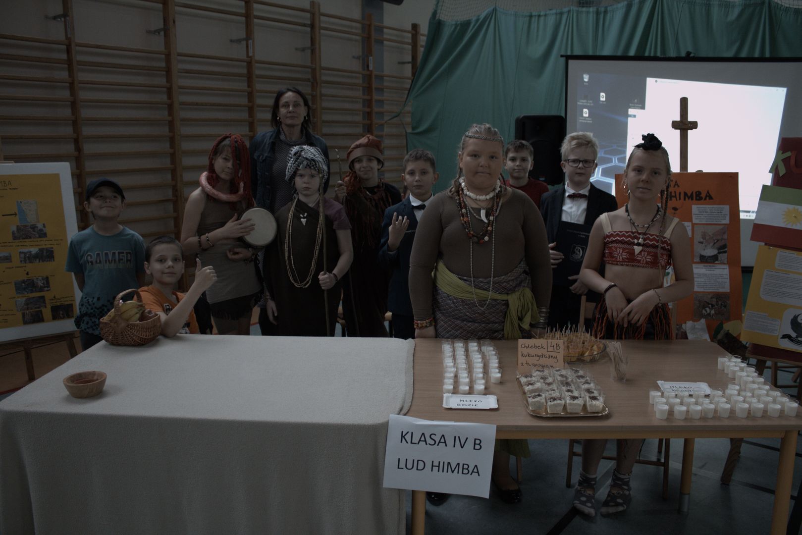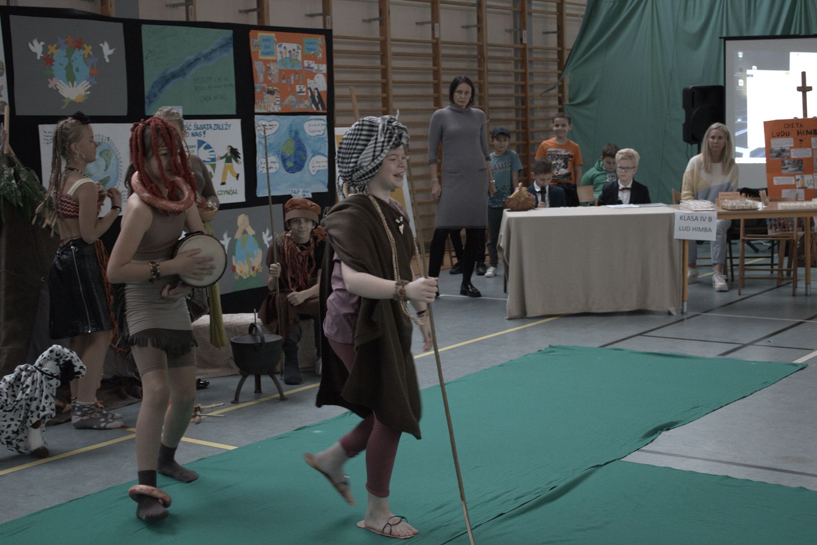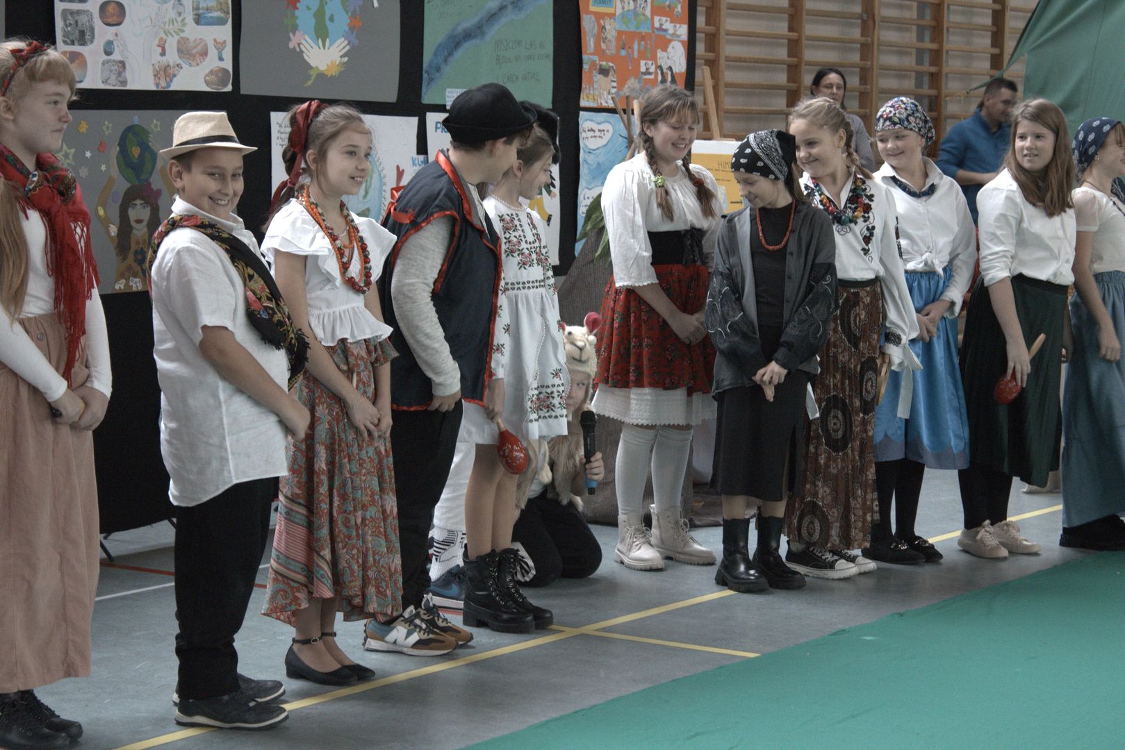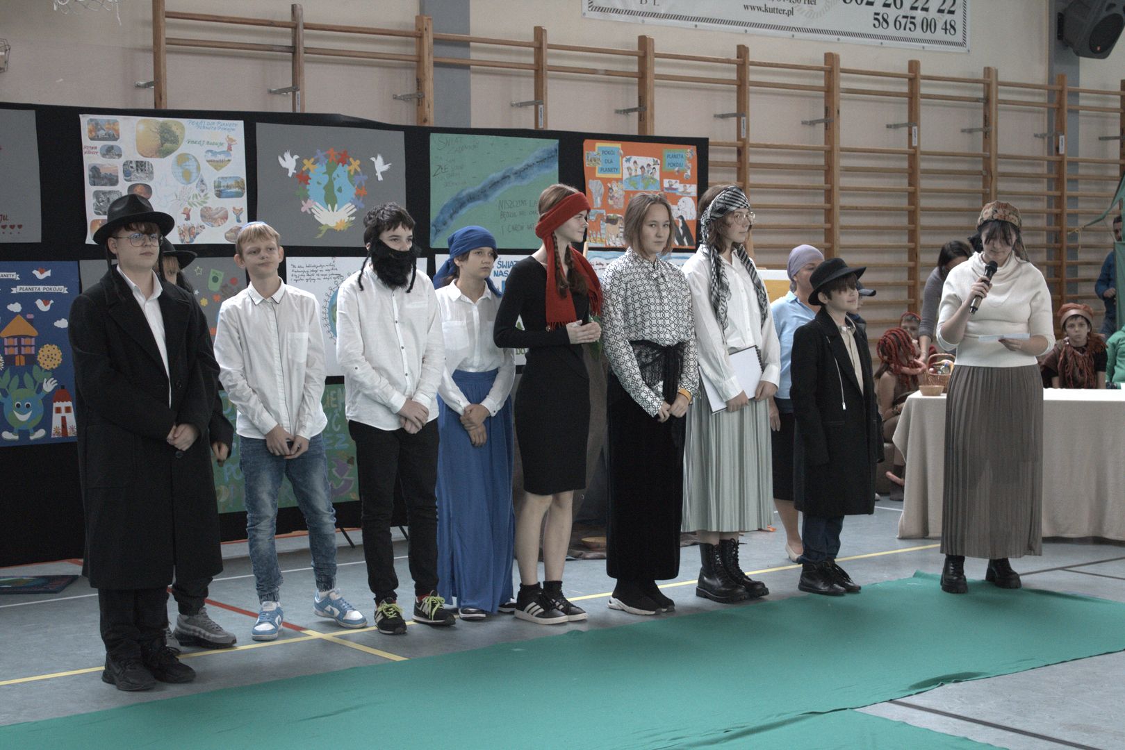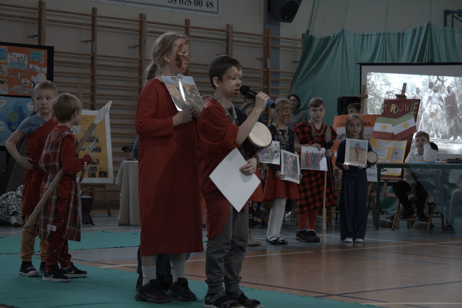 Piątek podyktowany był działaniami związanymi z przybliżaniem obrazu małych nacji, grup etnicznych i kulturowych, tak aby temat pokoju na planecie Ziemi dotyczył wszystkich, także tych, którzy są nam odlegli, czasami wręcz egzotyczni. Klasy losowały grupy a następnie przygotowywały prezentację oraz krótki poczęstunek. I tak klasa 1a w tanecznym pląsie zamieniała się w Ormian, czyli starożytny naród indoeuropejski. Klasa 2a przeniosła nas do Afryki i przedstawiła etniczną grupę Masajów, a 2b wcieliła się w prastary naród znad Zatoki Biskajskiej - Basków. Trzecioklasiści wylosowali Saamów, zwanych Lapończykami, związanych z rejonem północnym, a klasy czwarte pochyliły się nad ludem Himba i Kurdami. Piątacy zaprezentowali kulturę Łemków, a klasa szósta Tatarów. Siódmoklasiści otworzyli się na kulturę żydowską, a klasa ósma zawirowała w rytm muzyki ludów Sinti. Najstarsi reprezentanci szkoły, uczniowie HEL-LO przybliżyli kulturę najmniejszej grupy kulturowo- religijnej w naszym kraju- Karaimów. Pokaz uzupełniały muzyka i charakterystyczne przysmaki danej nacji.