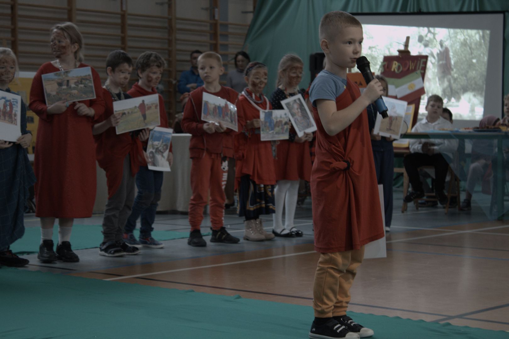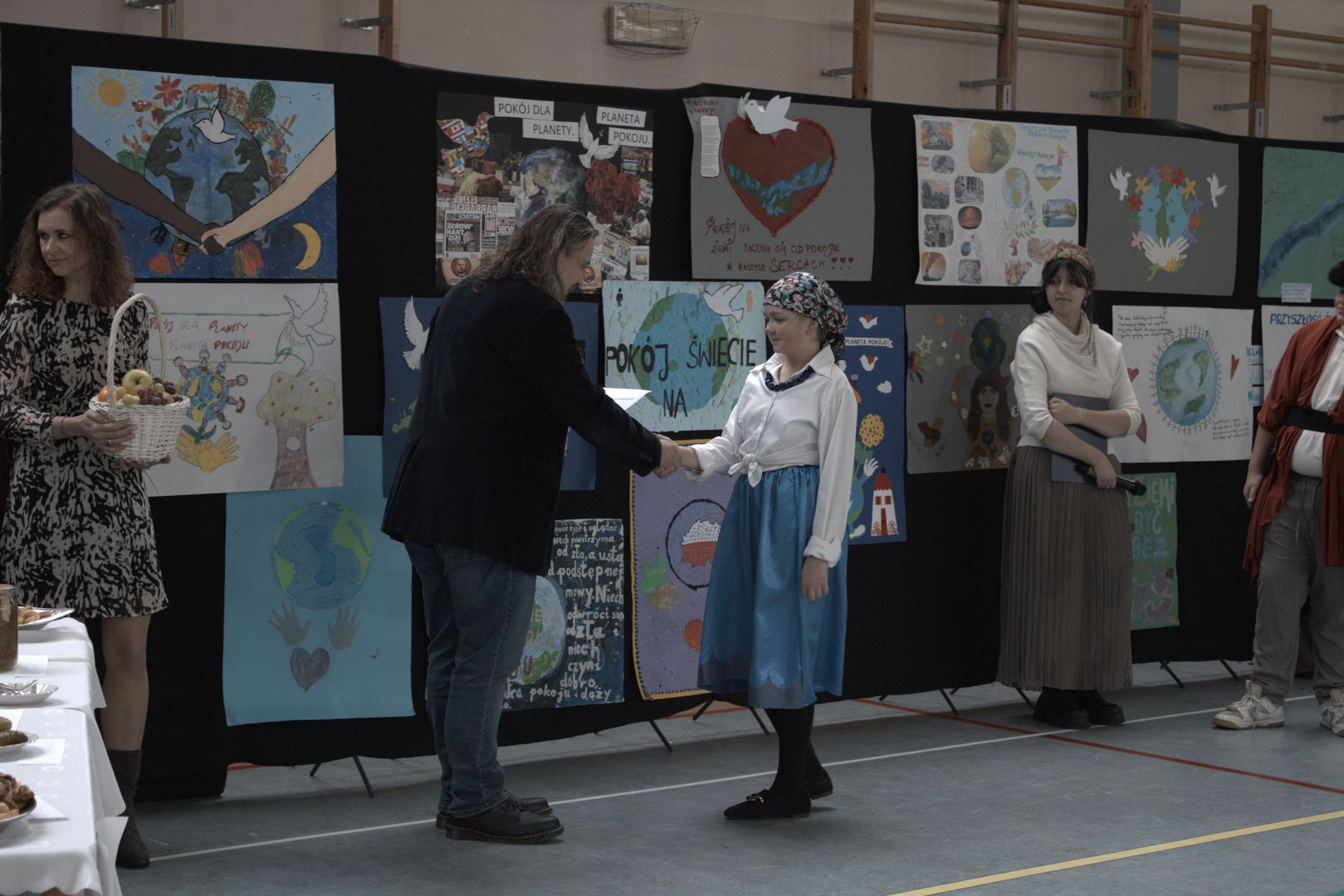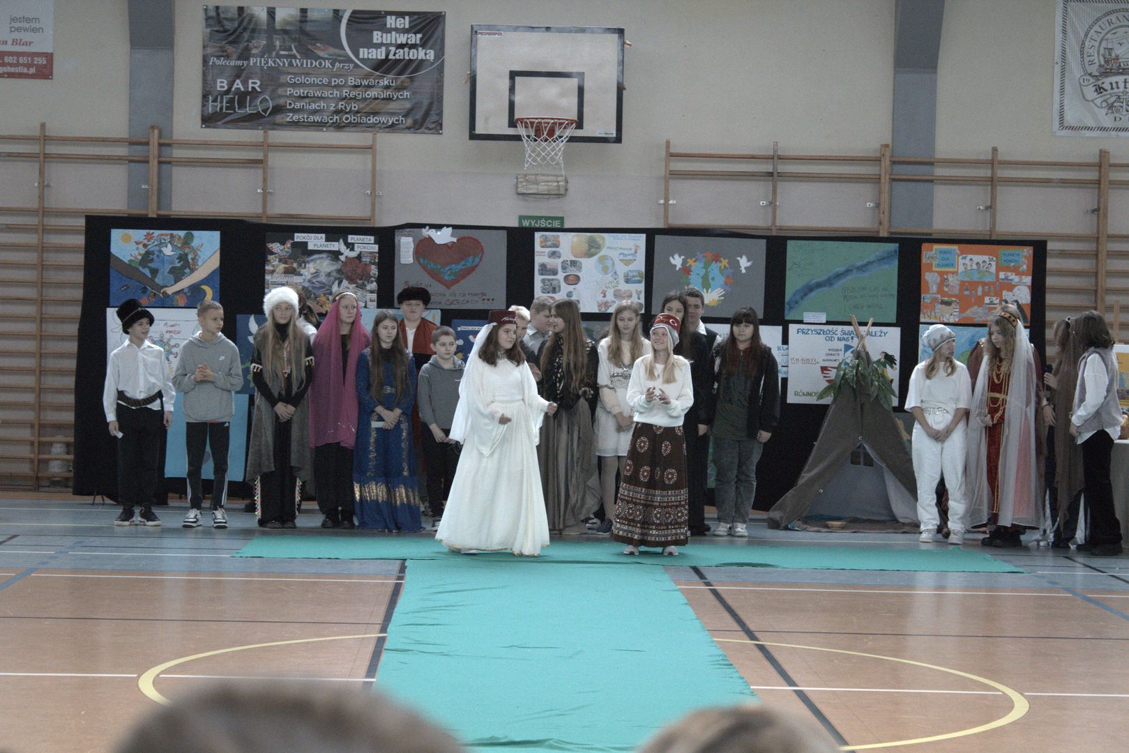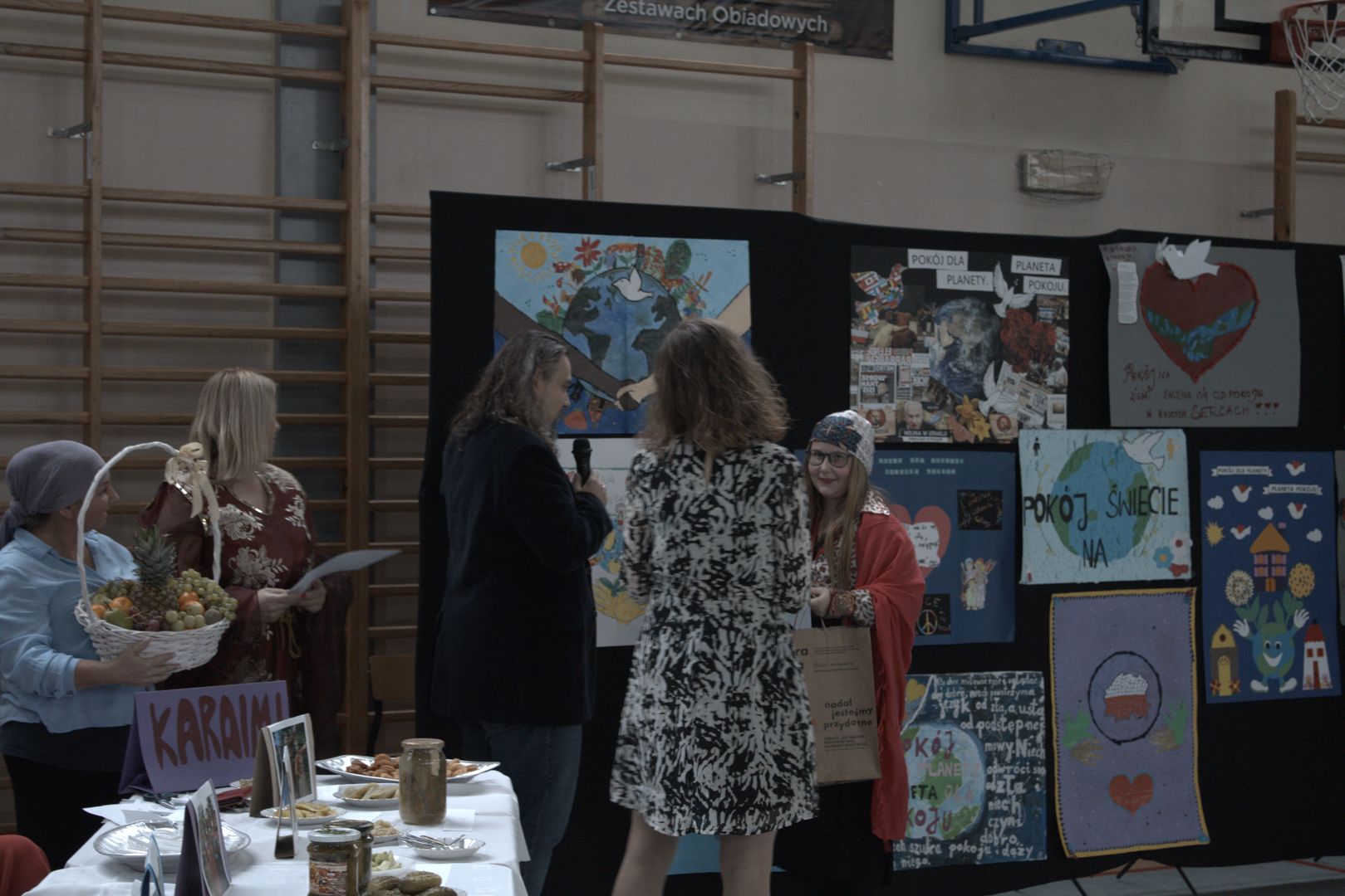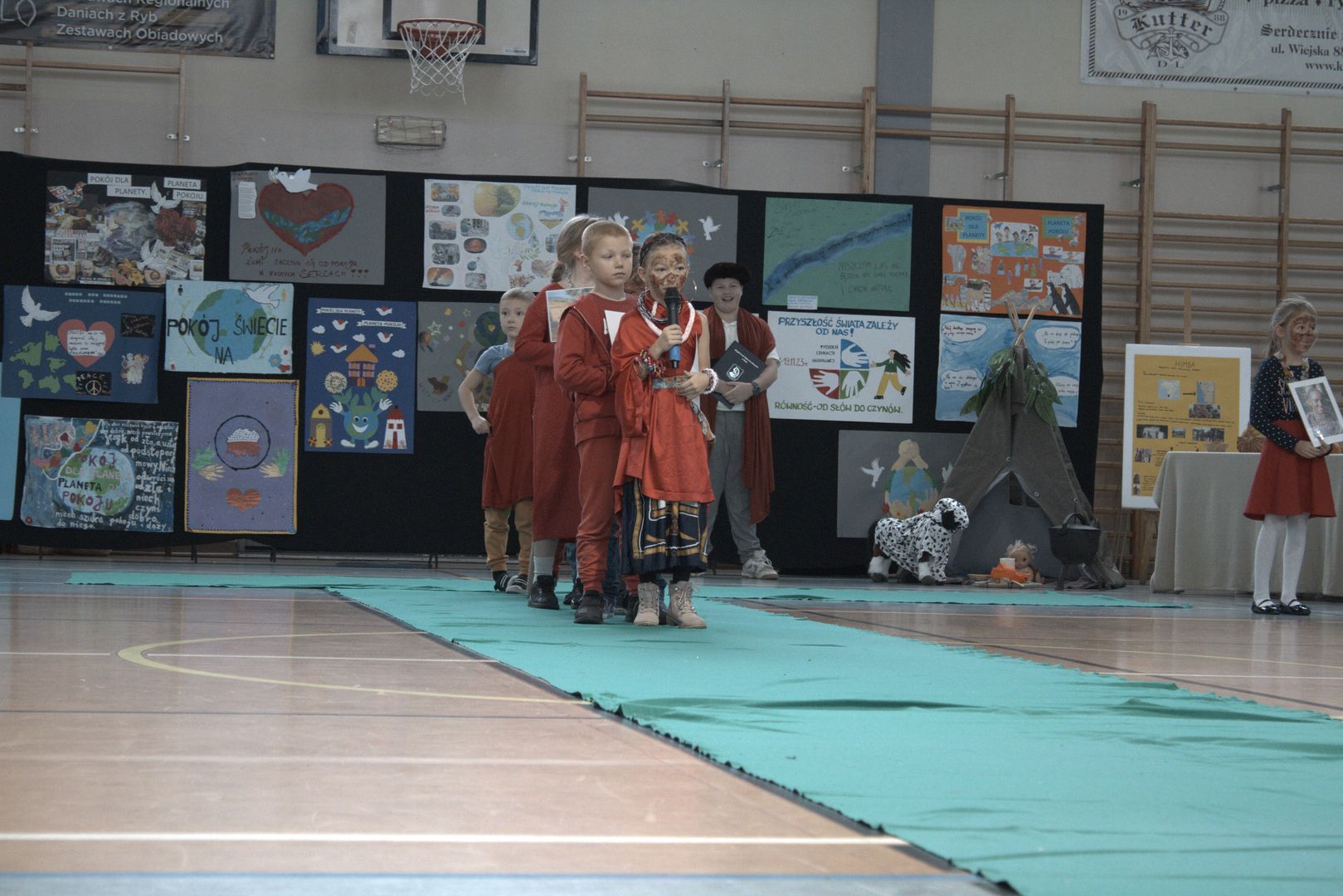 Piątek podyktowany był działaniami związanymi z przybliżaniem obrazu małych nacji, grup etnicznych i kulturowych, tak aby temat pokoju na planecie Ziemi dotyczył wszystkich, także tych, którzy są nam odlegli, czasami wręcz egzotyczni. Klasy losowały grupy a następnie przygotowywały prezentację oraz krótki poczęstunek. I tak klasa 1a w tanecznym pląsie zamieniała się w Ormian, czyli starożytny naród indoeuropejski. Klasa 2a przeniosła nas do Afryki i przedstawiła etniczną grupę Masajów, a 2b wcieliła się w prastary naród znad Zatoki Biskajskiej - Basków. Trzecioklasiści wylosowali Saamów, zwanych Lapończykami, związanych z rejonem północnym, a klasy czwarte pochyliły się nad ludem Himba i Kurdami. Piątacy zaprezentowali kulturę Łemków, a klasa szósta Tatarów. Siódmoklasiści otworzyli się na kulturę żydowską, a klasa ósma zawirowała w rytm muzyki ludów Sinti. Najstarsi reprezentanci szkoły, uczniowie HEL-LO przybliżyli kulturę najmniejszej grupy kulturowo- religijnej w naszym kraju- Karaimów. Pokaz uzupełniały muzyka i charakterystyczne przysmaki danej nacji.