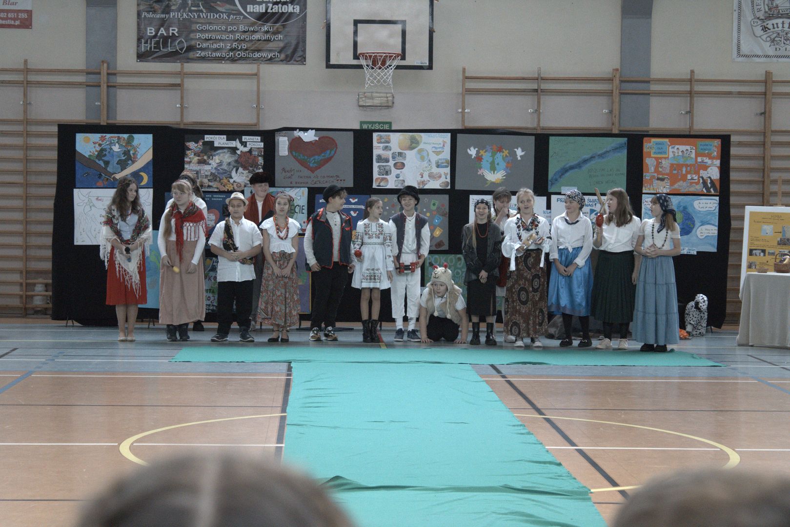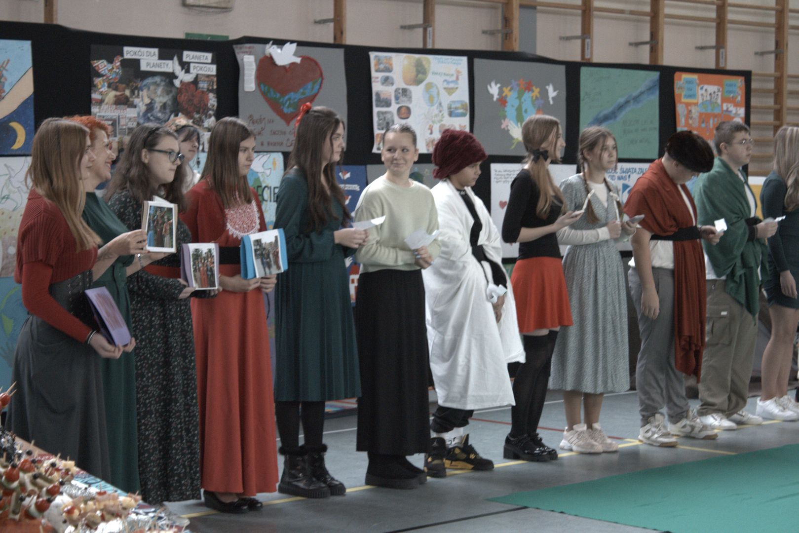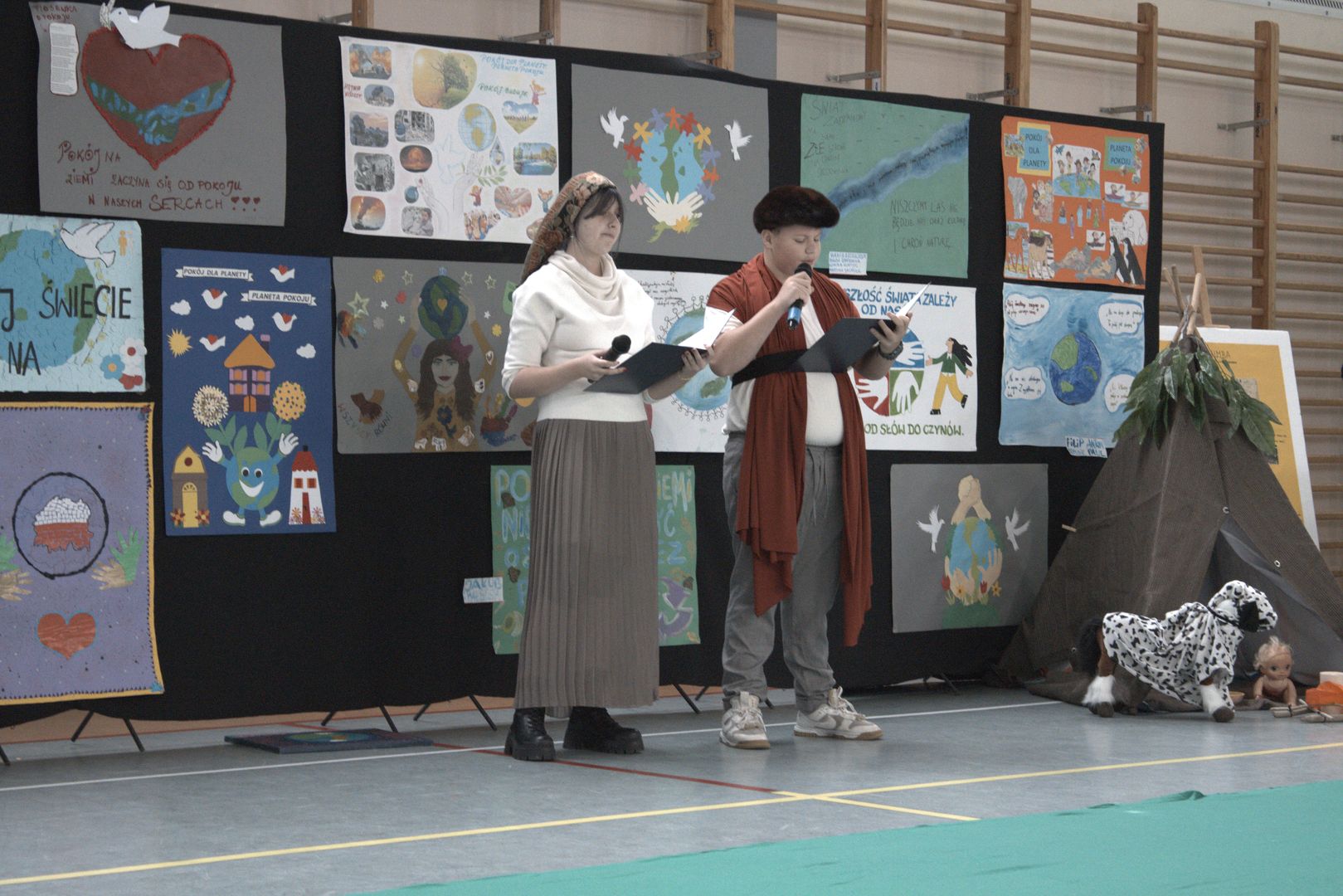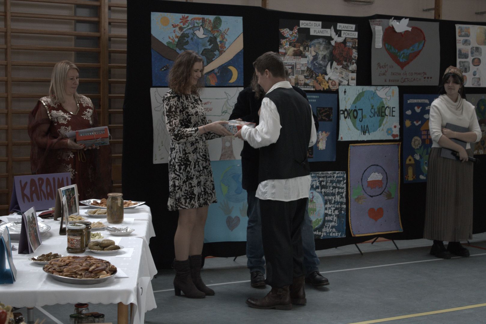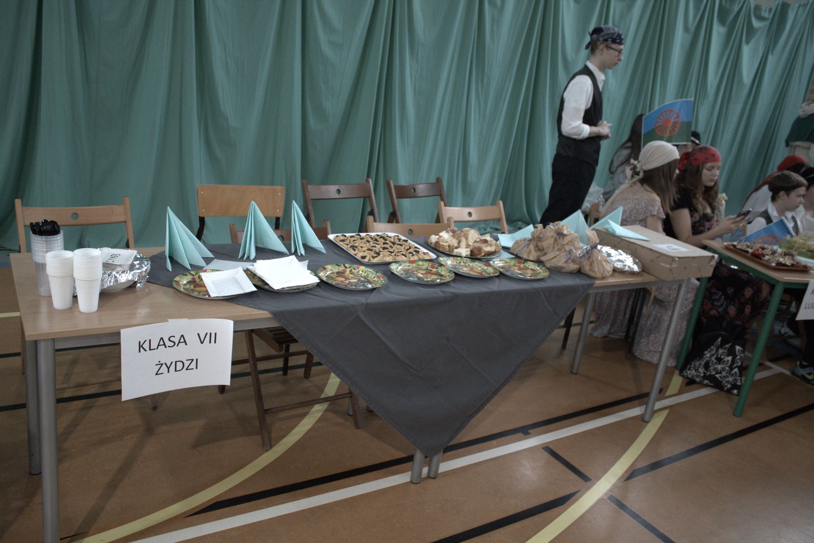 Piątek podyktowany był działaniami związanymi z przybliżaniem obrazu małych nacji, grup etnicznych i kulturowych, tak aby temat pokoju na planecie Ziemi dotyczył wszystkich, także tych, którzy są nam odlegli, czasami wręcz egzotyczni. Klasy losowały grupy a następnie przygotowywały prezentację oraz krótki poczęstunek. I tak klasa 1a w tanecznym pląsie zamieniała się w Ormian, czyli starożytny naród indoeuropejski. Klasa 2a przeniosła nas do Afryki i przedstawiła etniczną grupę Masajów, a 2b wcieliła się w prastary naród znad Zatoki Biskajskiej - Basków. Trzecioklasiści wylosowali Saamów, zwanych Lapończykami, związanych z rejonem północnym, a klasy czwarte pochyliły się nad ludem Himba i Kurdami. Piątacy zaprezentowali kulturę Łemków, a klasa szósta Tatarów. Siódmoklasiści otworzyli się na kulturę żydowską, a klasa ósma zawirowała w rytm muzyki ludów Sinti. Najstarsi reprezentanci szkoły, uczniowie HEL-LO przybliżyli kulturę najmniejszej grupy kulturowo- religijnej w naszym kraju- Karaimów. Pokaz uzupełniały muzyka i charakterystyczne przysmaki danej nacji.