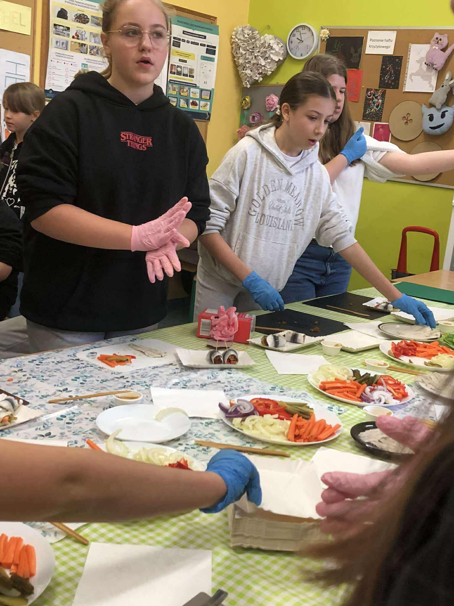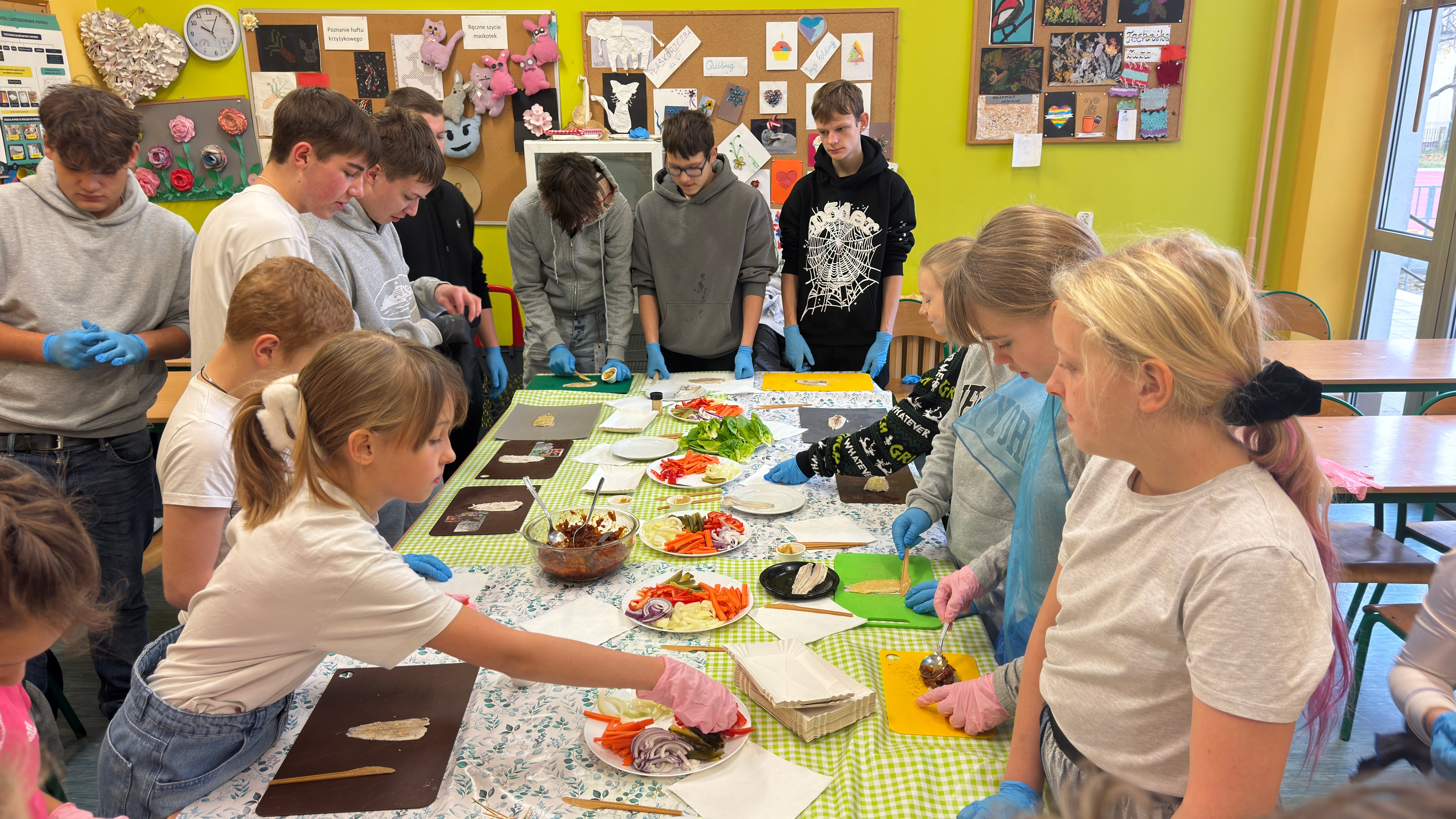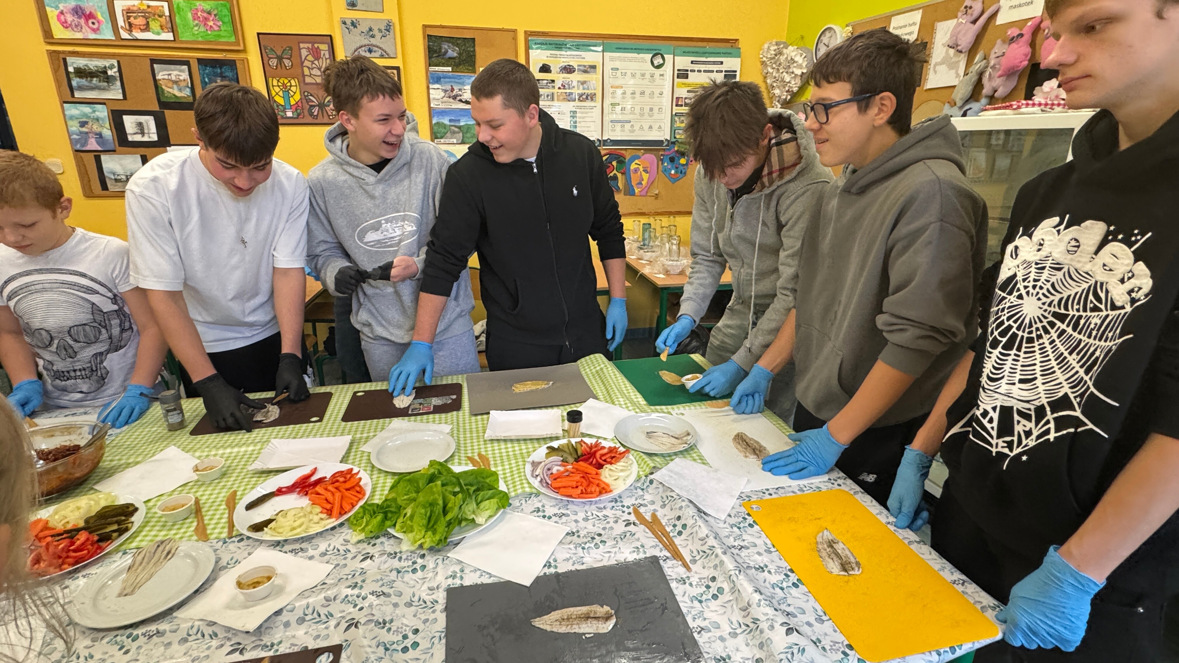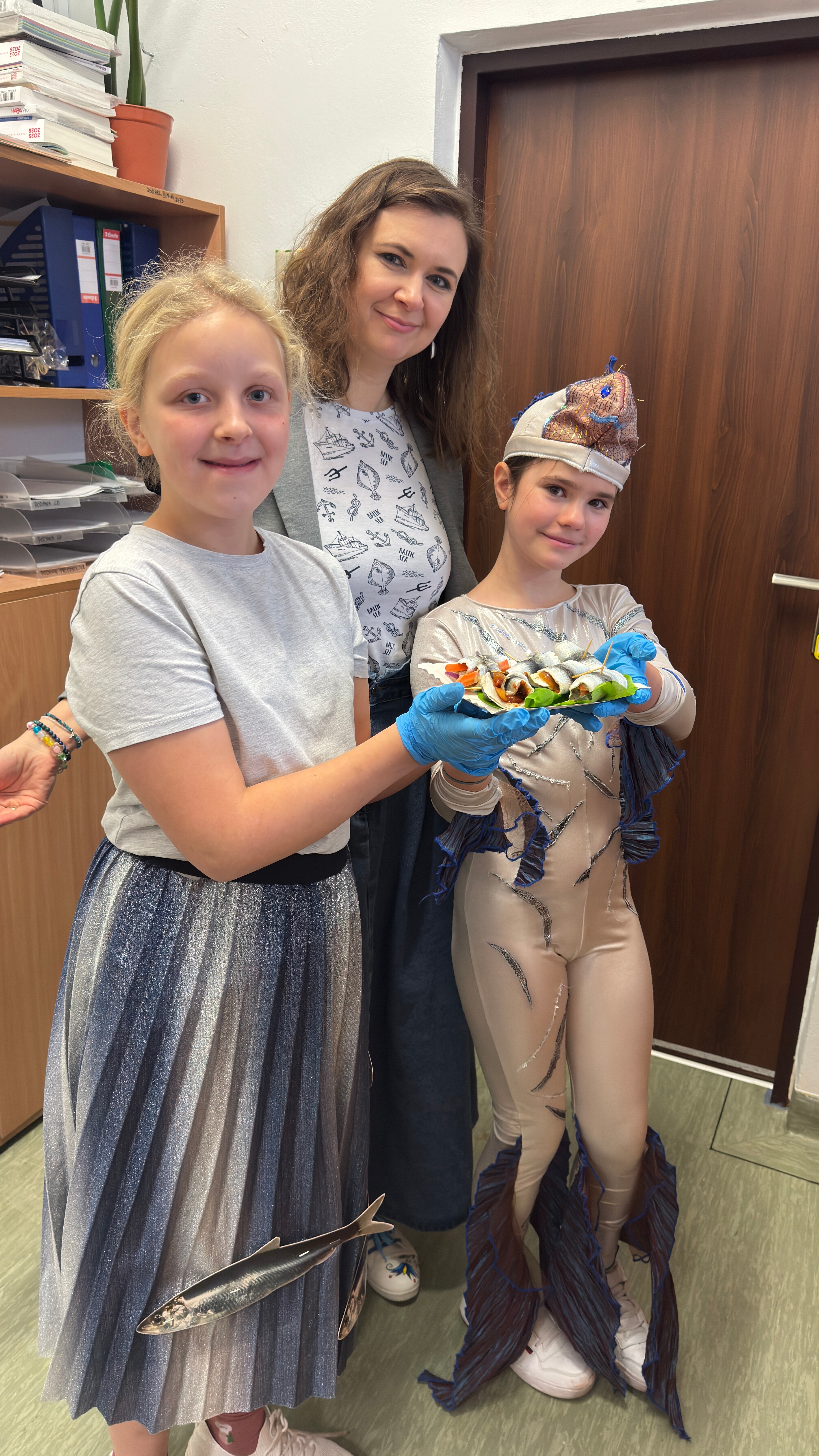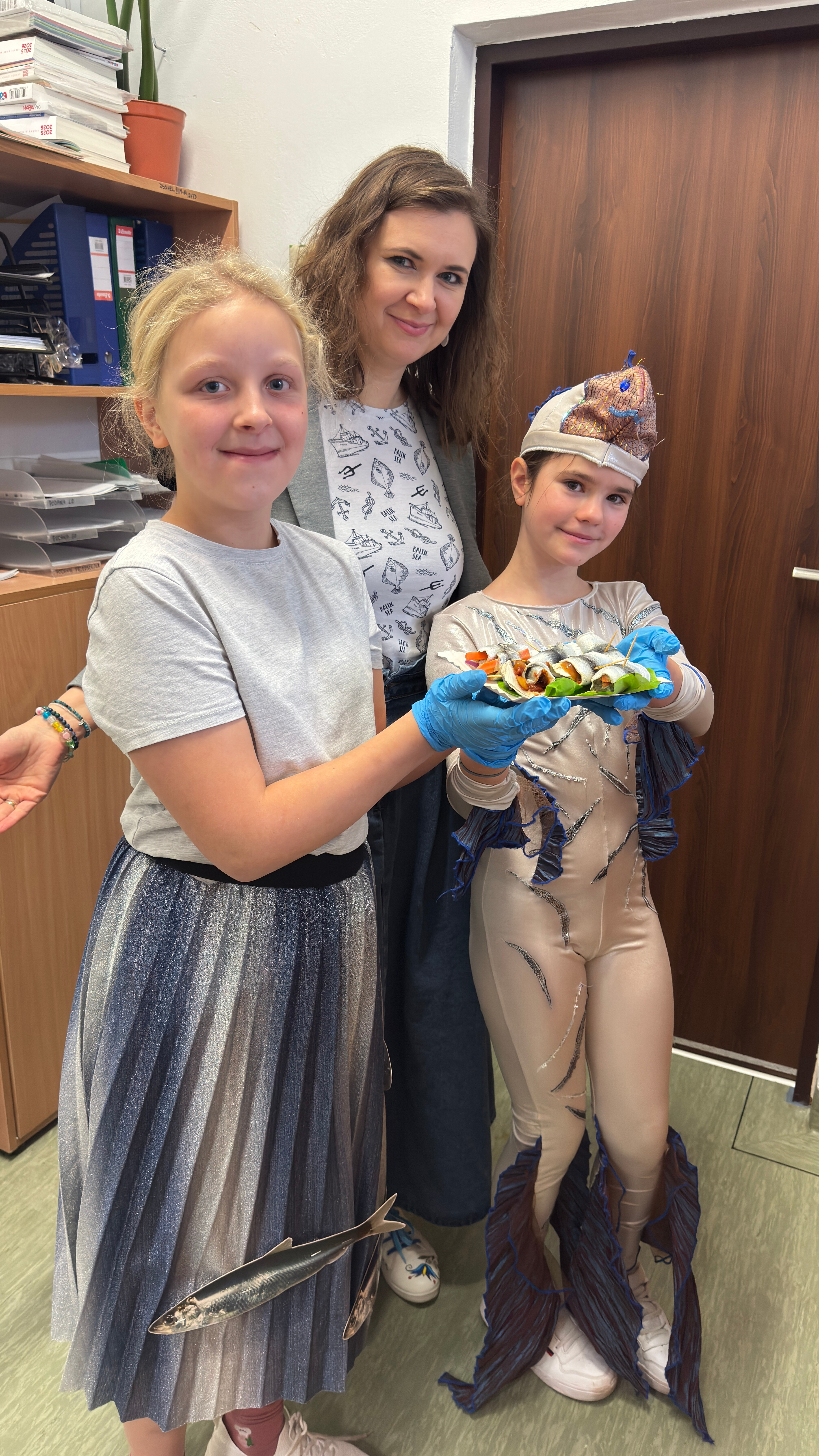 Dla 25 chętnych Uczniów Rodzice klasy 5SP przygotowali zajęcia skręcania rolmopsów. Lokalne zasoby śledzia to rzeczywiste królestwo smaków: po kaszubsku z cebulą w pomidorach, wytrawne z marchewką i ogórkiem, pikantne z papryka i musztardą- przepyszne wariacje. Czego uczyliśmy? Rozpoznawania smaków wód, które nas otaczają, świadomego wybierania ryb trafiających na talerz. Cel 14: Chronić oceany, morza i zasoby morskie oraz wykorzystywać je w sposób zrównoważony.