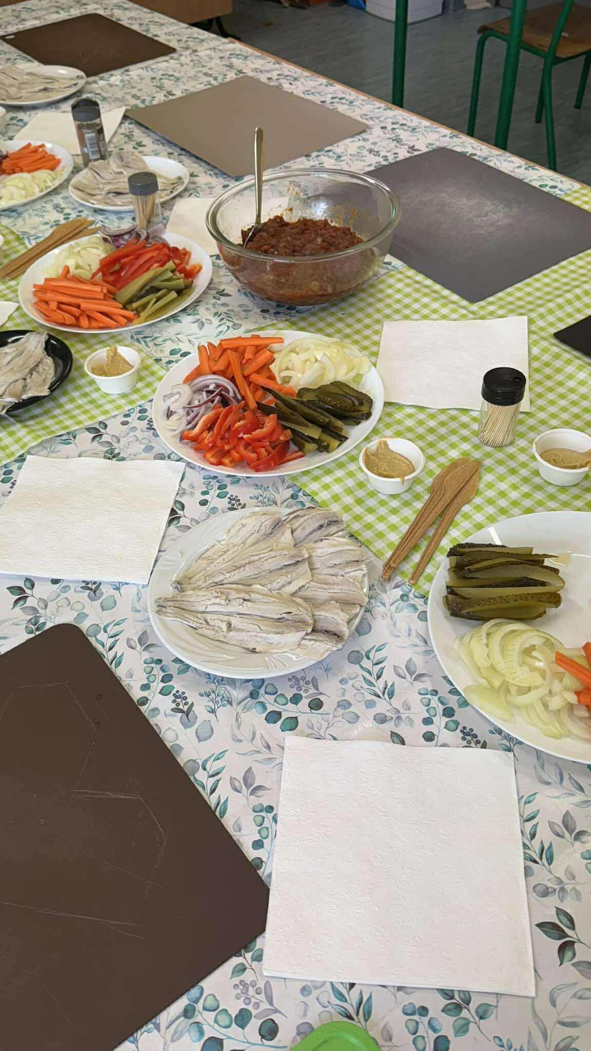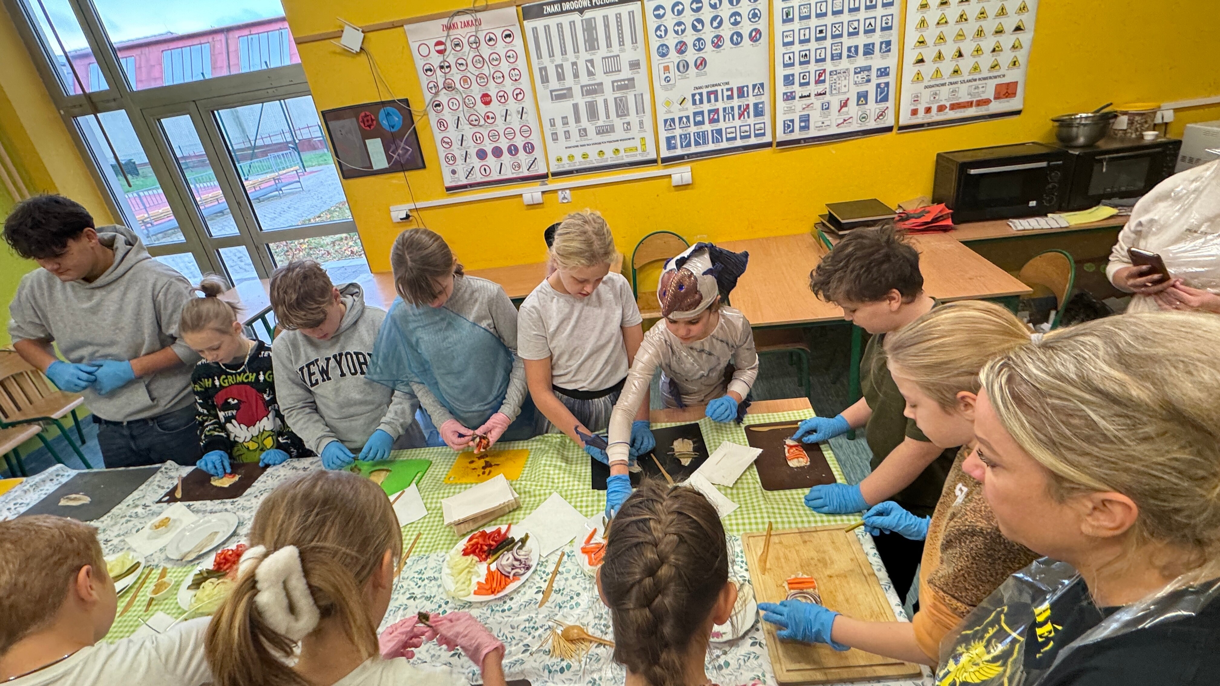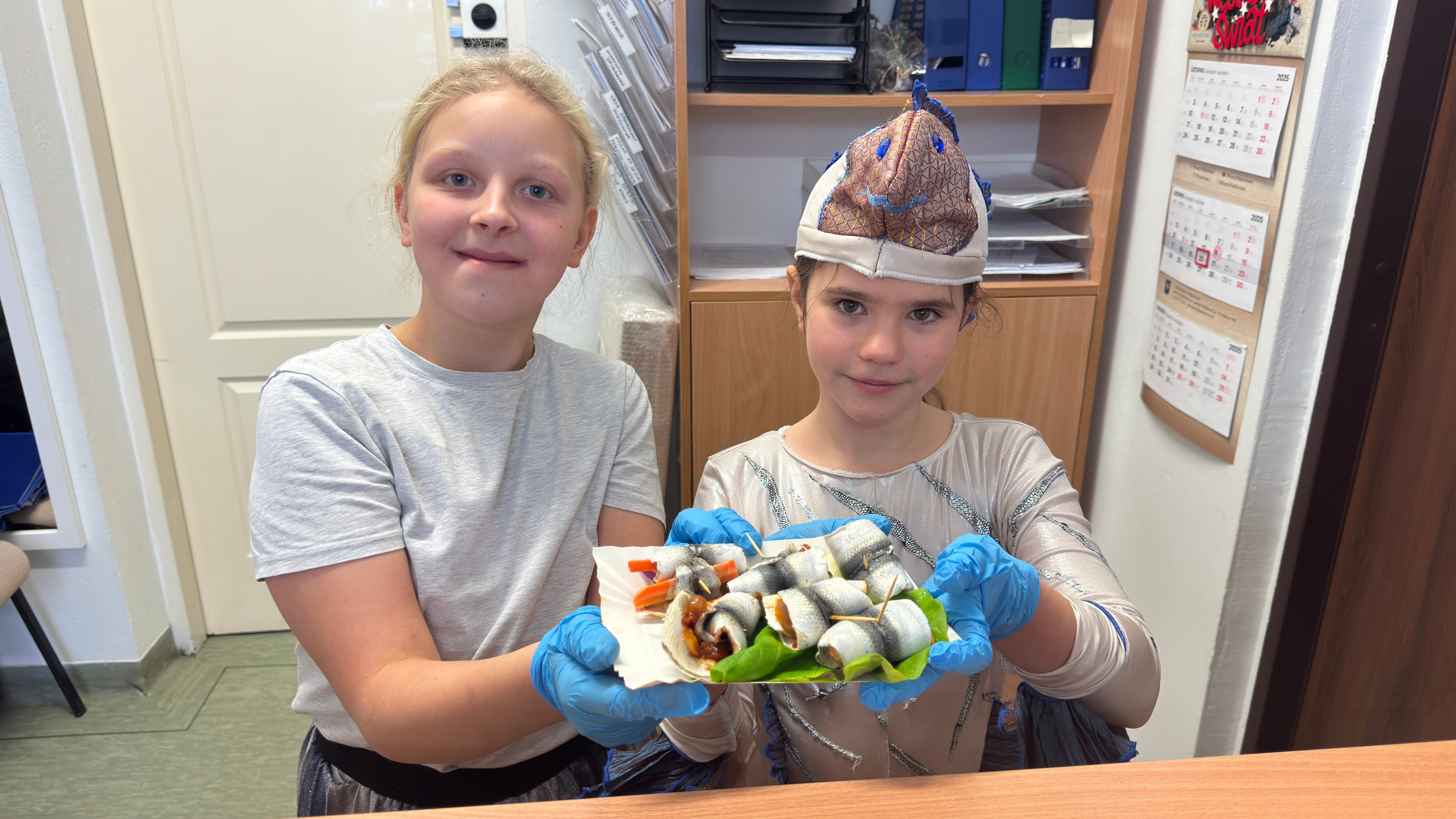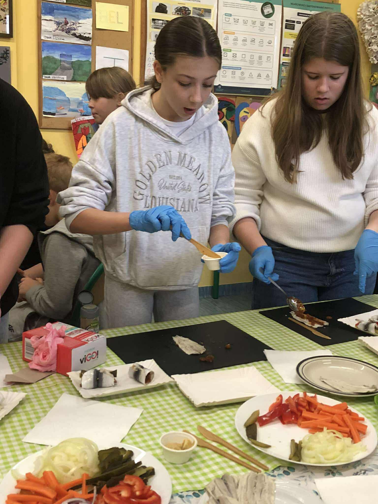 Dla 25 chętnych Uczniów Rodzice klasy 5SP przygotowali zajęcia skręcania rolmopsów. Lokalne zasoby śledzia to rzeczywiste królestwo smaków: po kaszubsku z cebulą w pomidorach, wytrawne z marchewką i ogórkiem, pikantne z papryka i musztardą- przepyszne wariacje. Czego uczyliśmy? Rozpoznawania smaków wód, które nas otaczają, świadomego wybierania ryb trafiających na talerz. Cel 14: Chronić oceany, morza i zasoby morskie oraz wykorzystywać je w sposób zrównoważony.