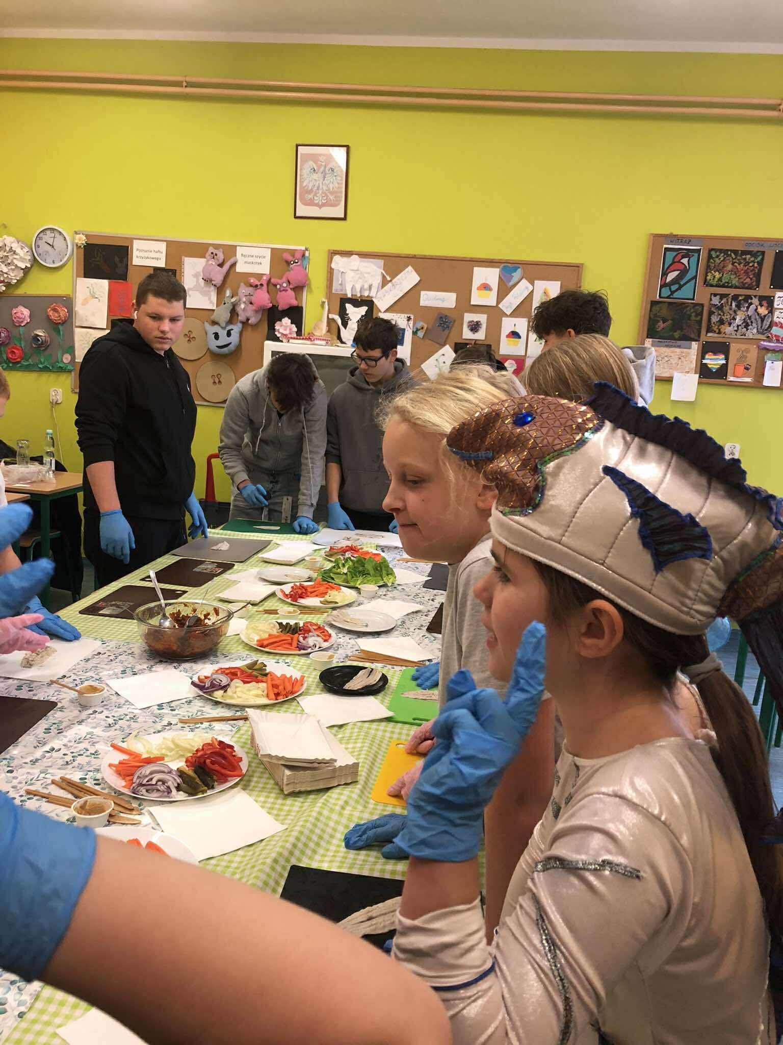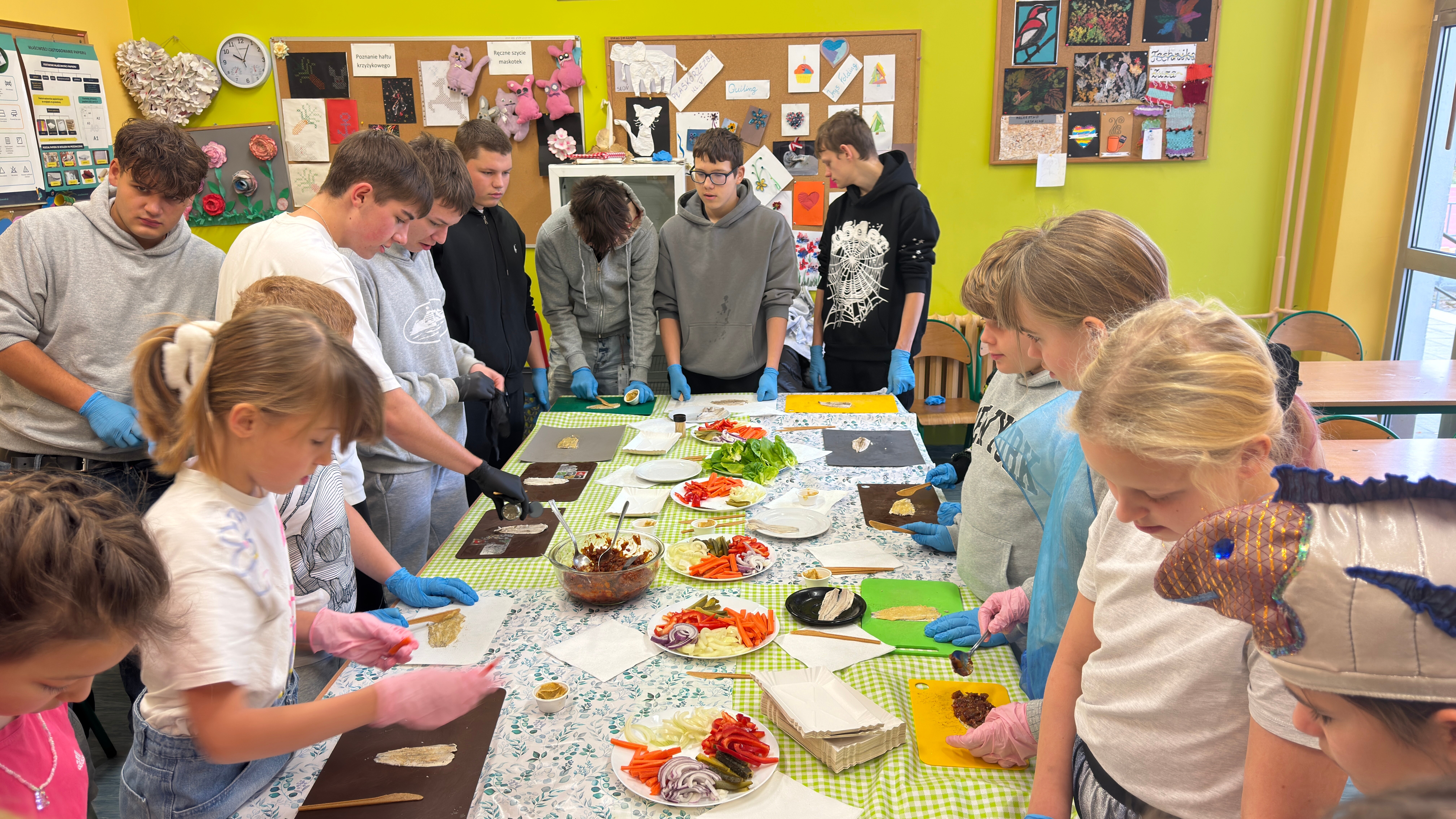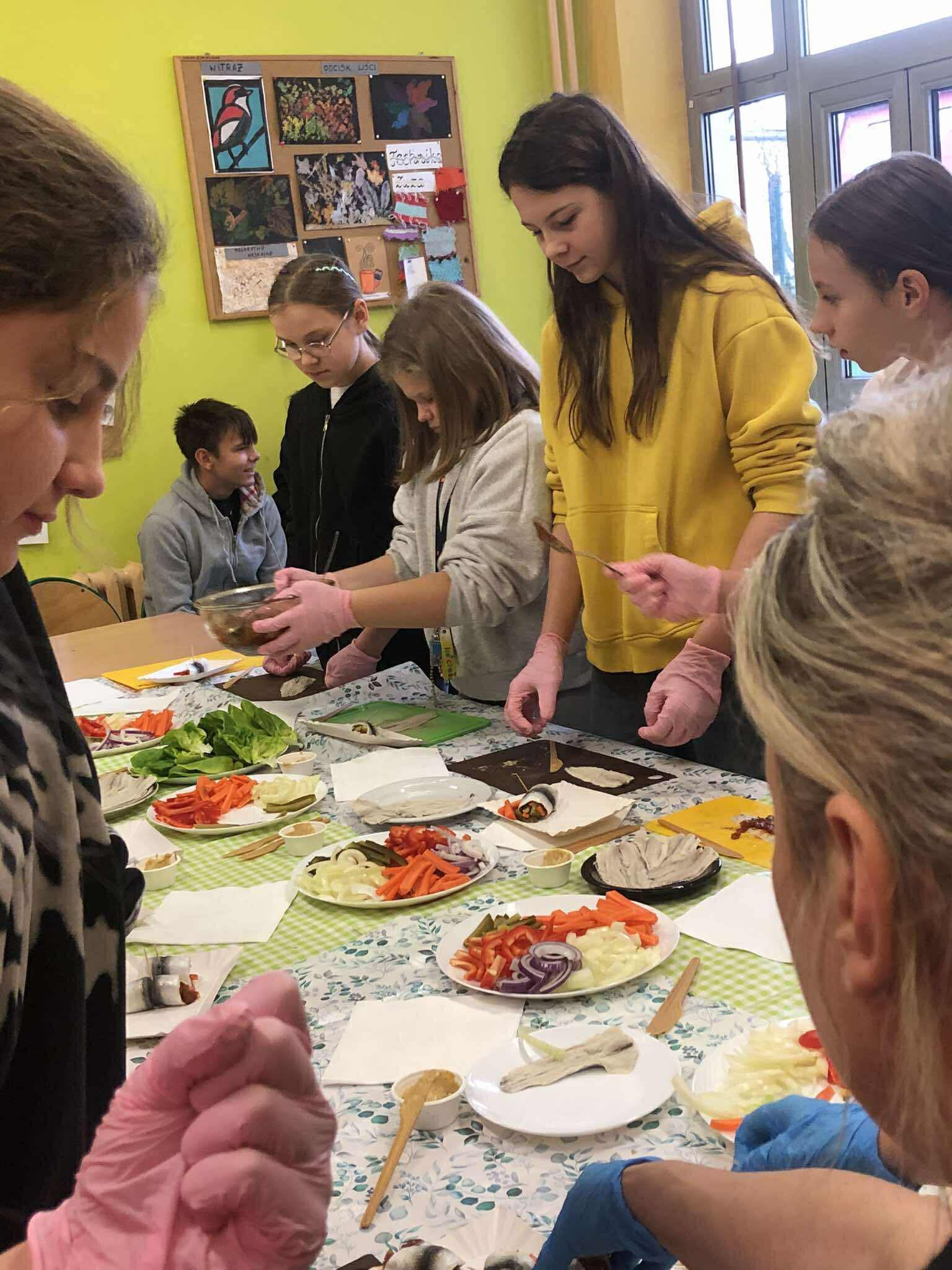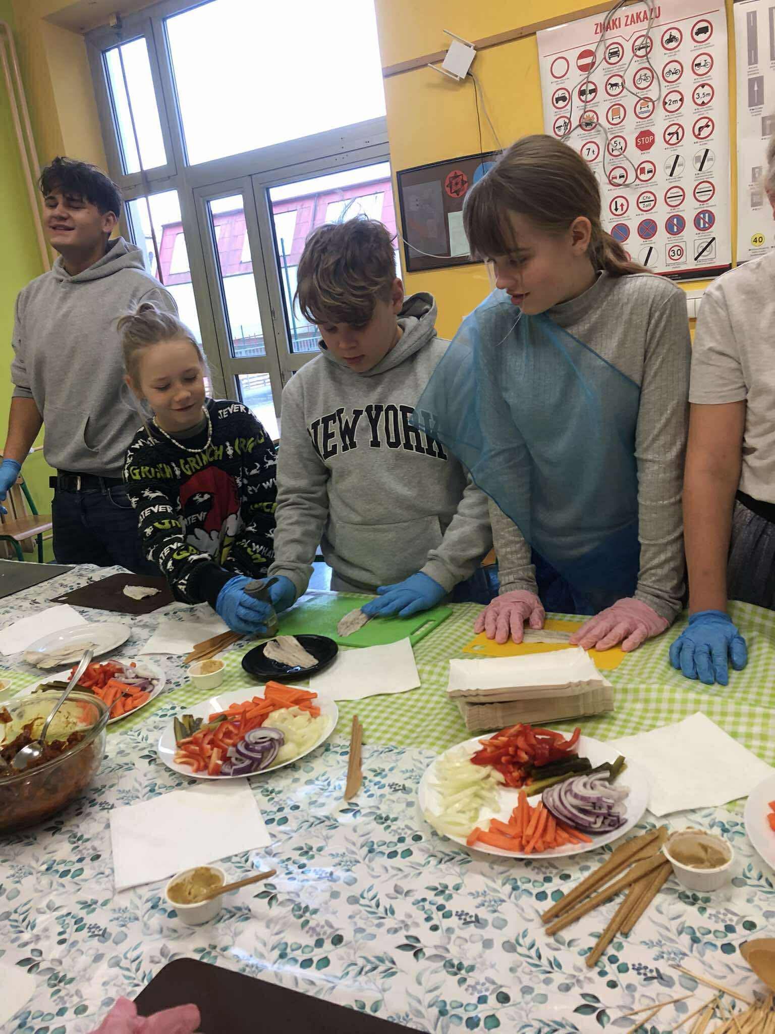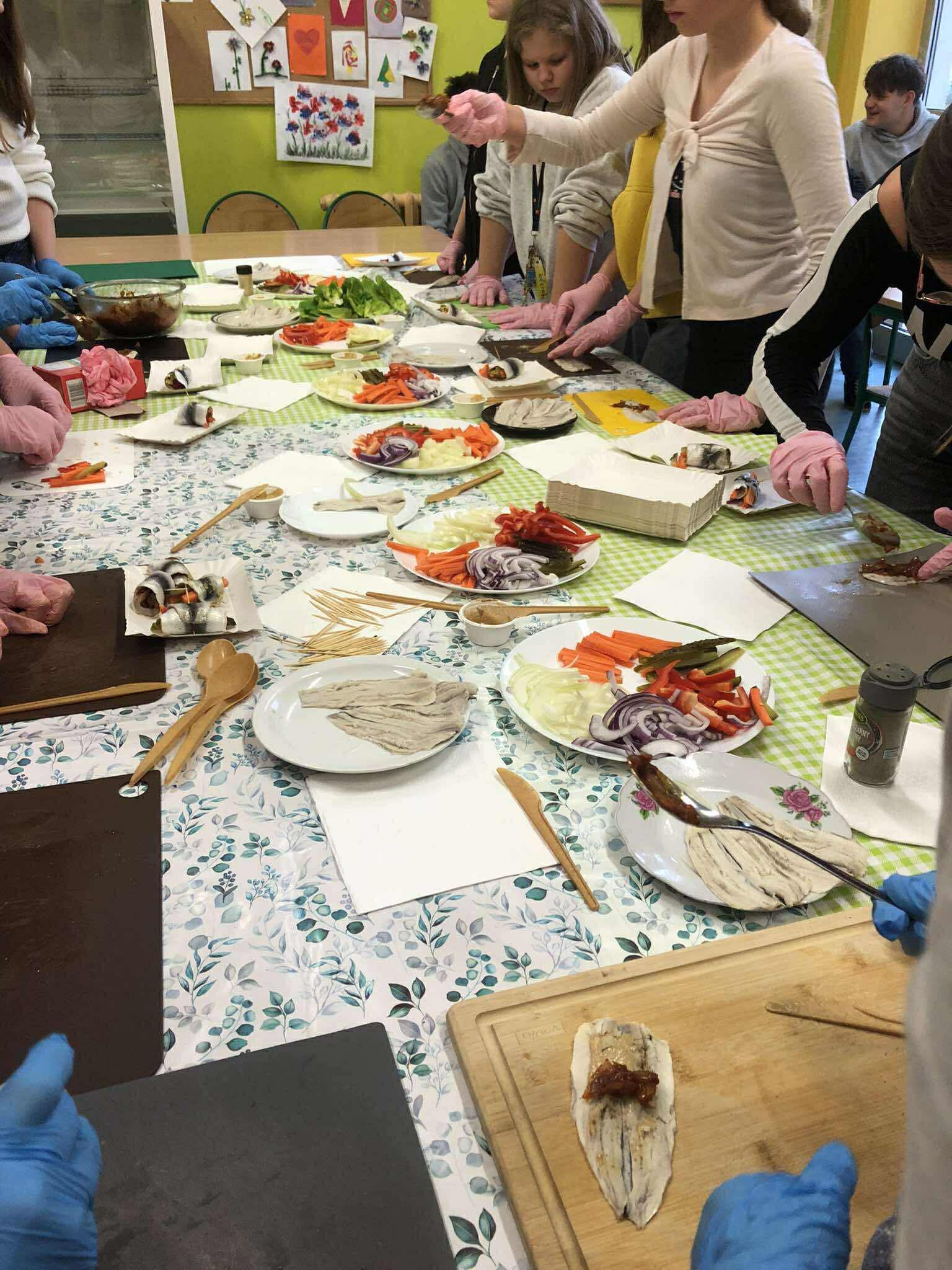 Dla 25 chętnych Uczniów Rodzice klasy 5SP przygotowali zajęcia skręcania rolmopsów. Lokalne zasoby śledzia to rzeczywiste królestwo smaków: po kaszubsku z cebulą w pomidorach, wytrawne z marchewką i ogórkiem, pikantne z papryka i musztardą- przepyszne wariacje. Czego uczyliśmy? Rozpoznawania smaków wód, które nas otaczają, świadomego wybierania ryb trafiających na talerz. Cel 14: Chronić oceany, morza i zasoby morskie oraz wykorzystywać je w sposób zrównoważony.