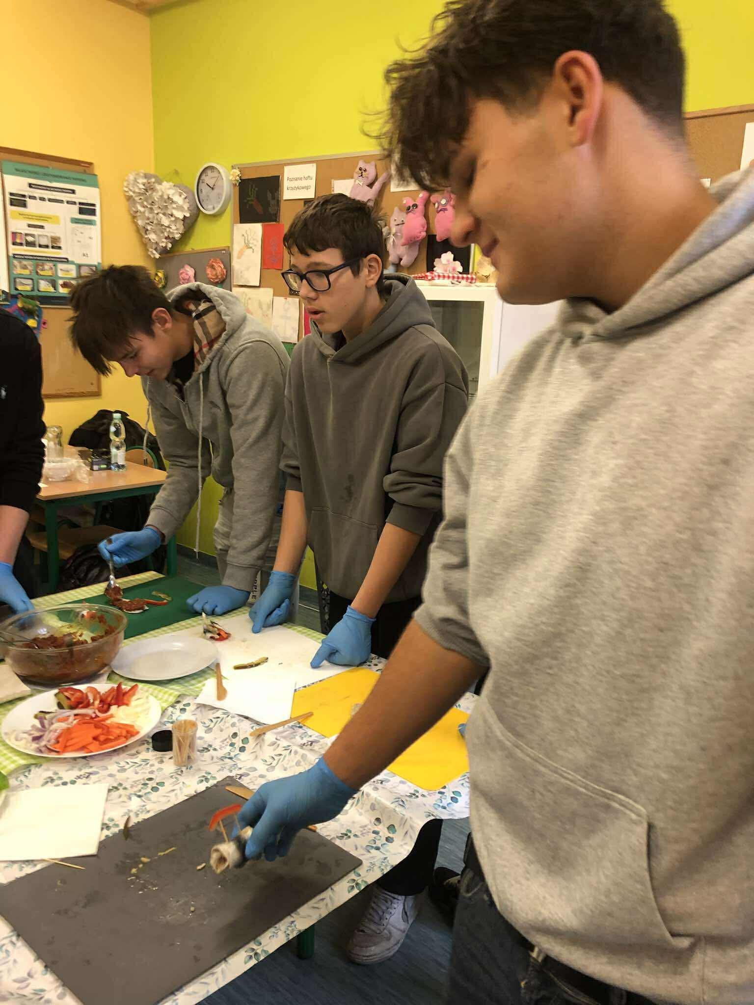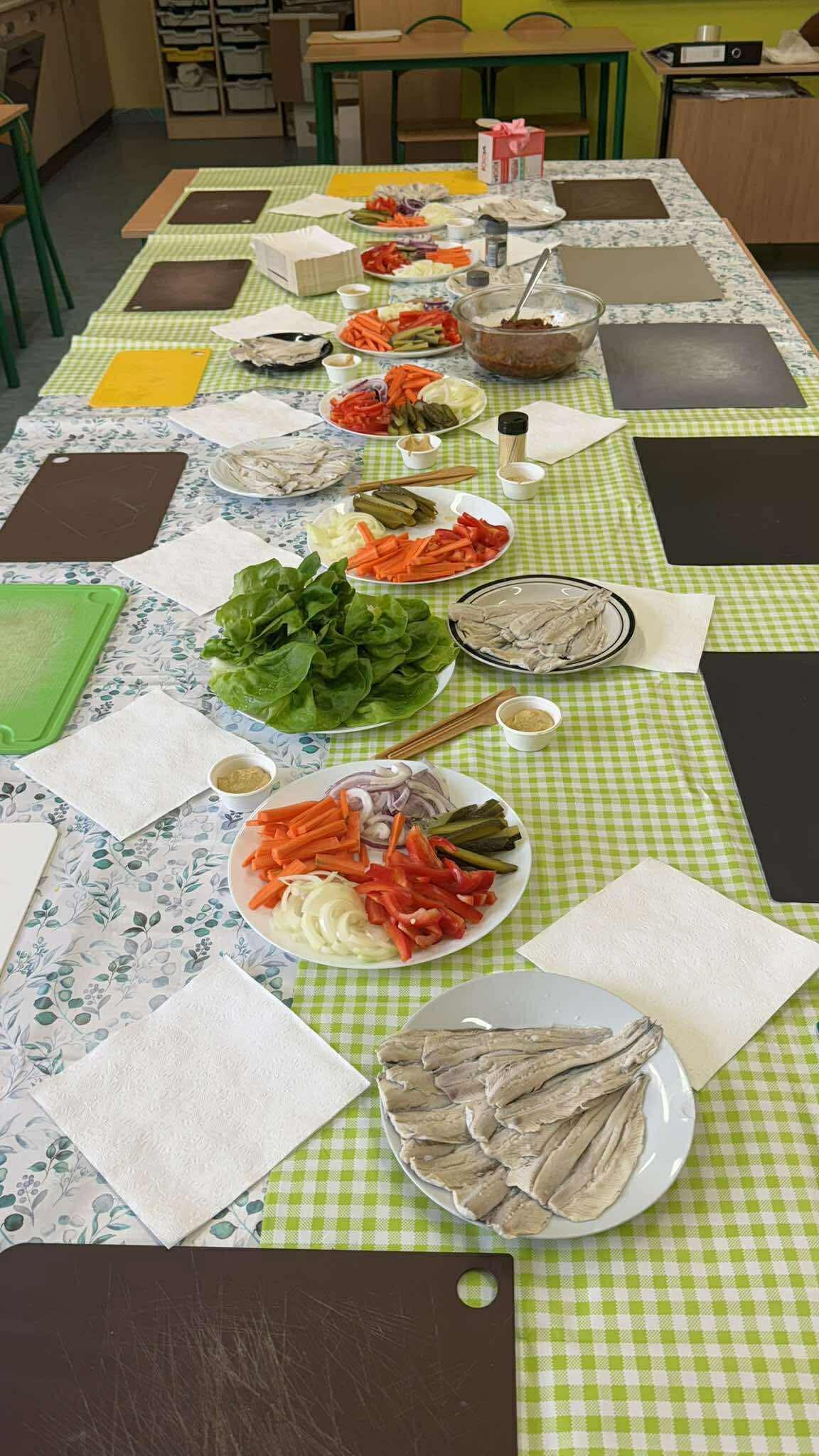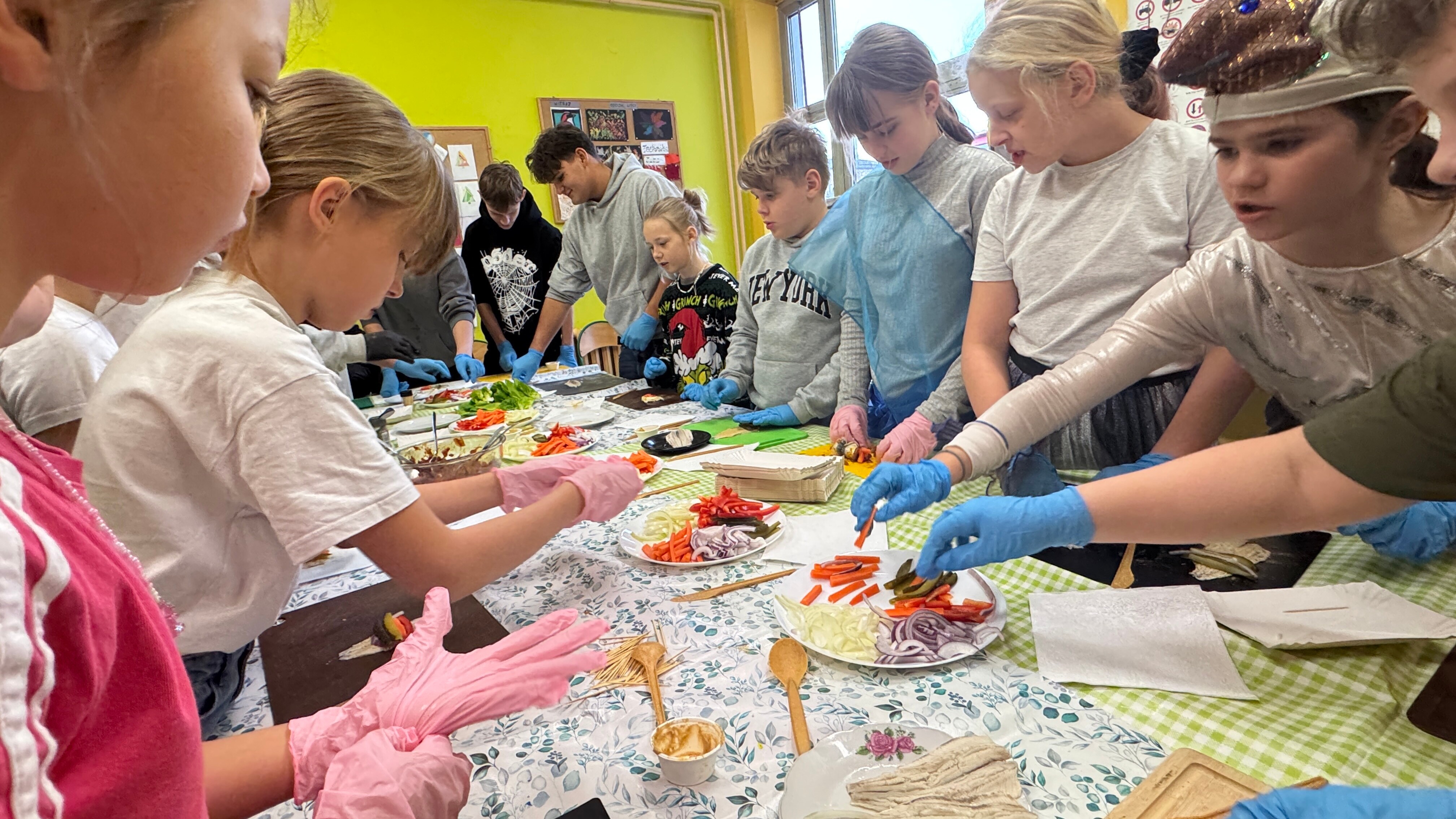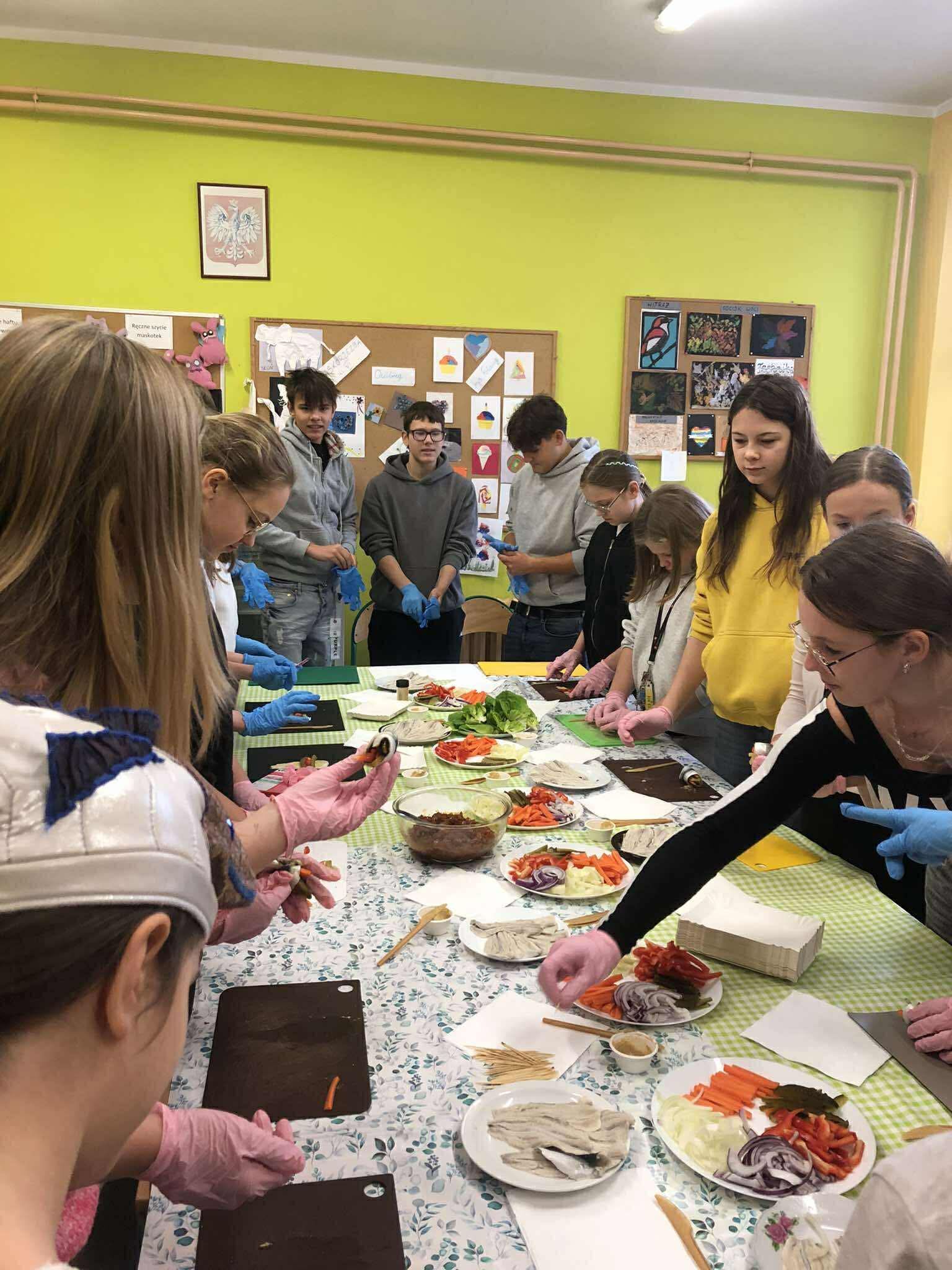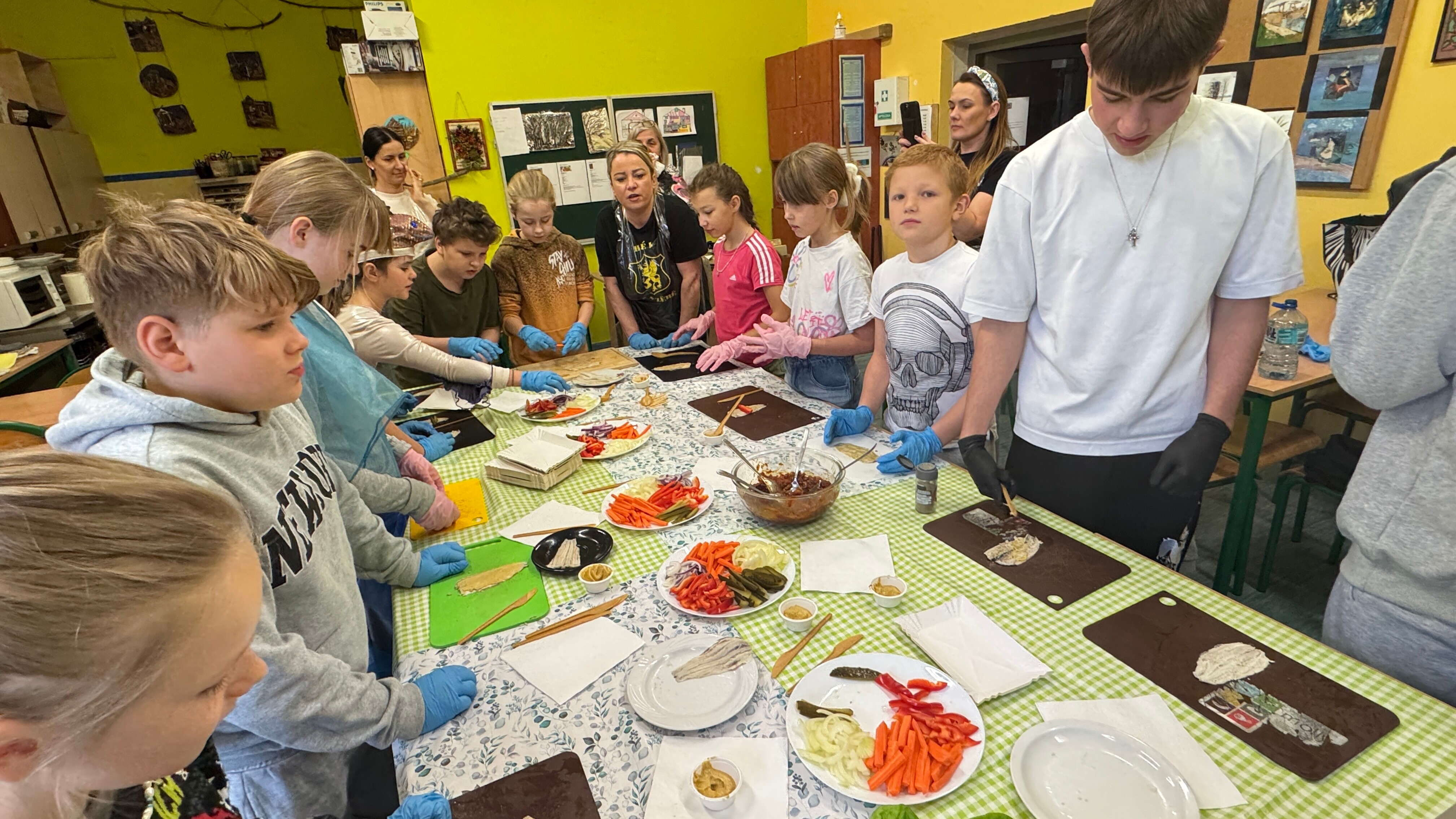 Dla 25 chętnych Uczniów Rodzice klasy 5SP przygotowali zajęcia skręcania rolmopsów. Lokalne zasoby śledzia to rzeczywiste królestwo smaków: po kaszubsku z cebulą w pomidorach, wytrawne z marchewką i ogórkiem, pikantne z papryka i musztardą- przepyszne wariacje. Czego uczyliśmy? Rozpoznawania smaków wód, które nas otaczają, świadomego wybierania ryb trafiających na talerz. Cel 14: Chronić oceany, morza i zasoby morskie oraz wykorzystywać je w sposób zrównoważony.