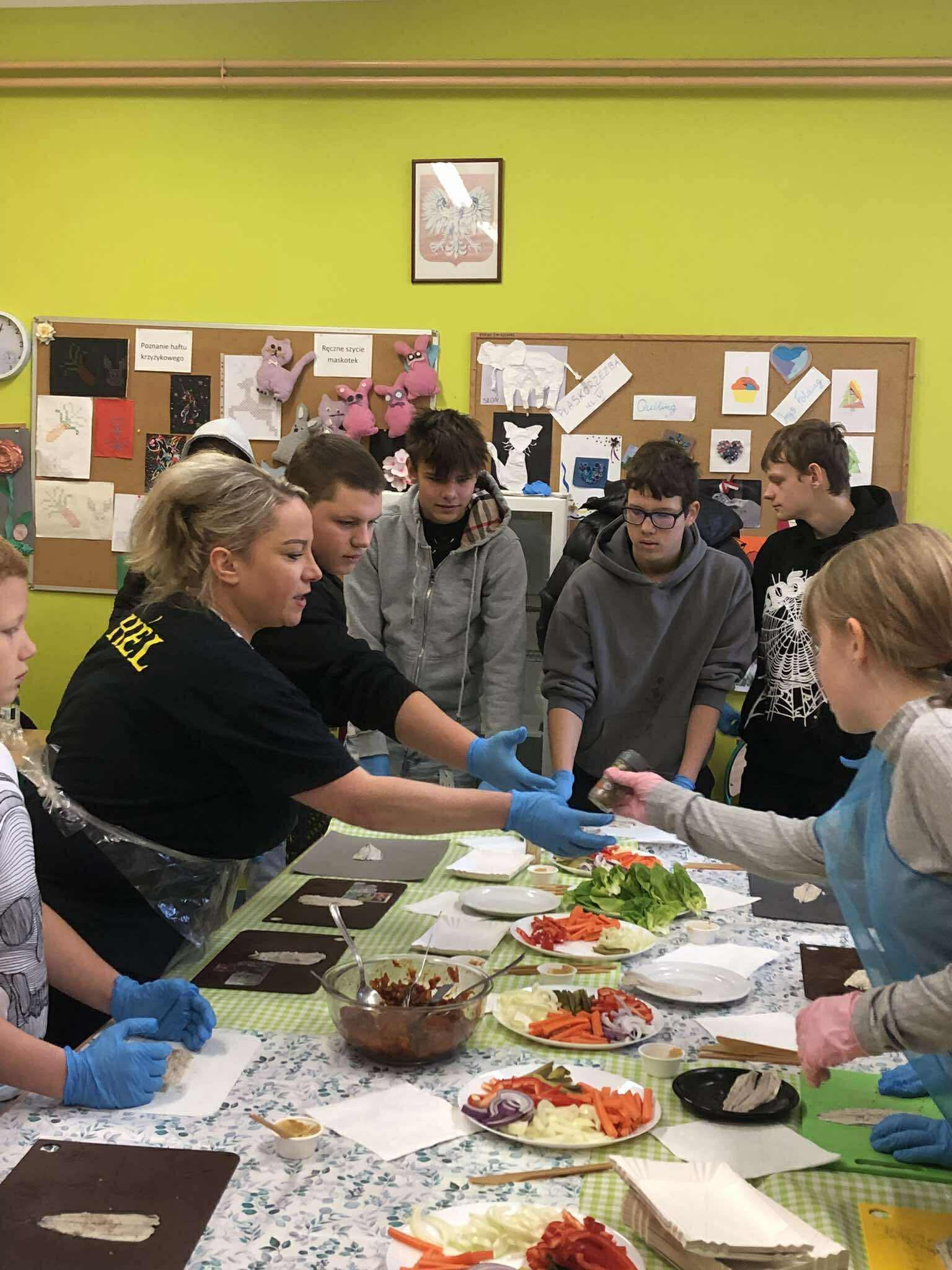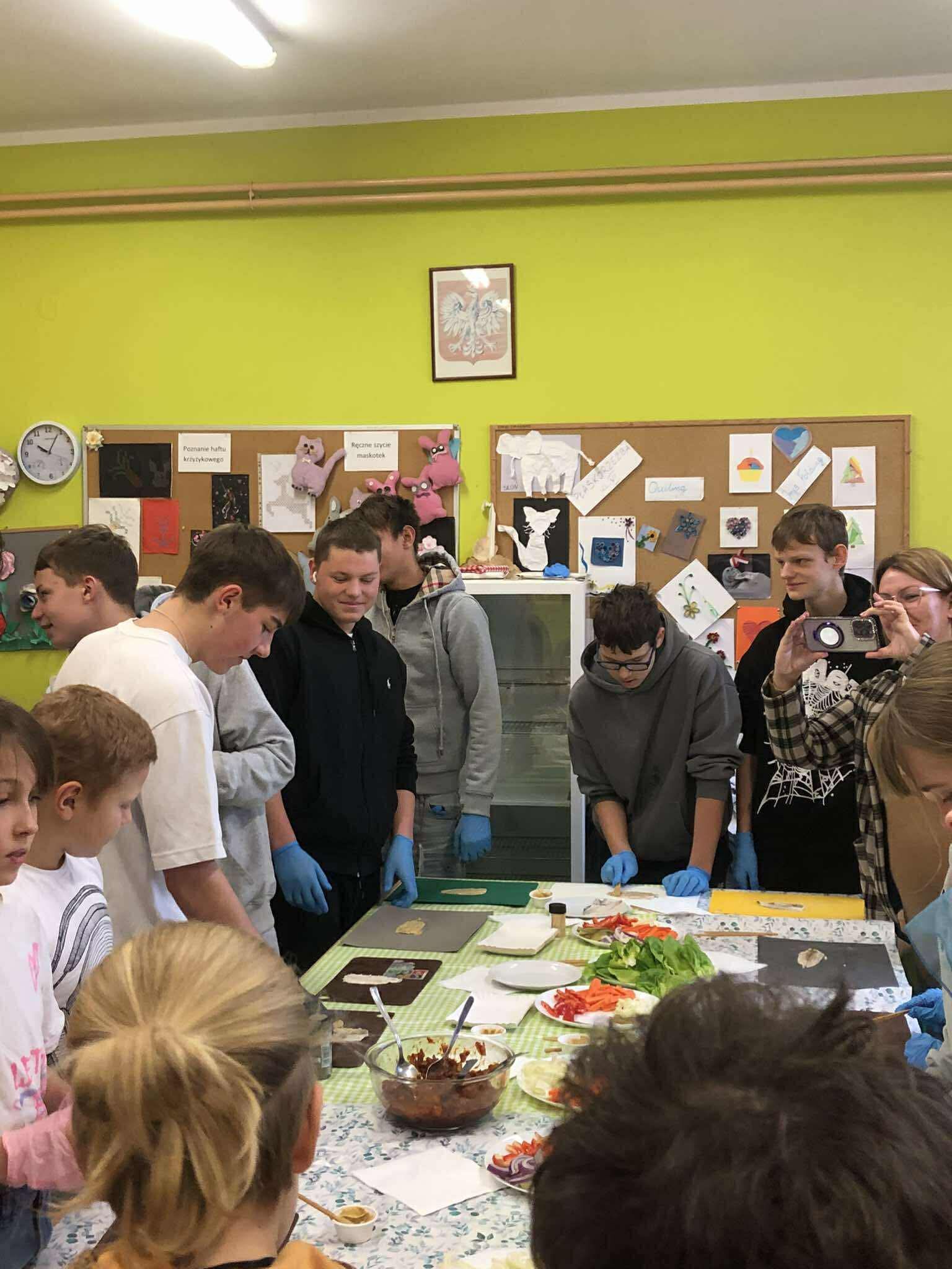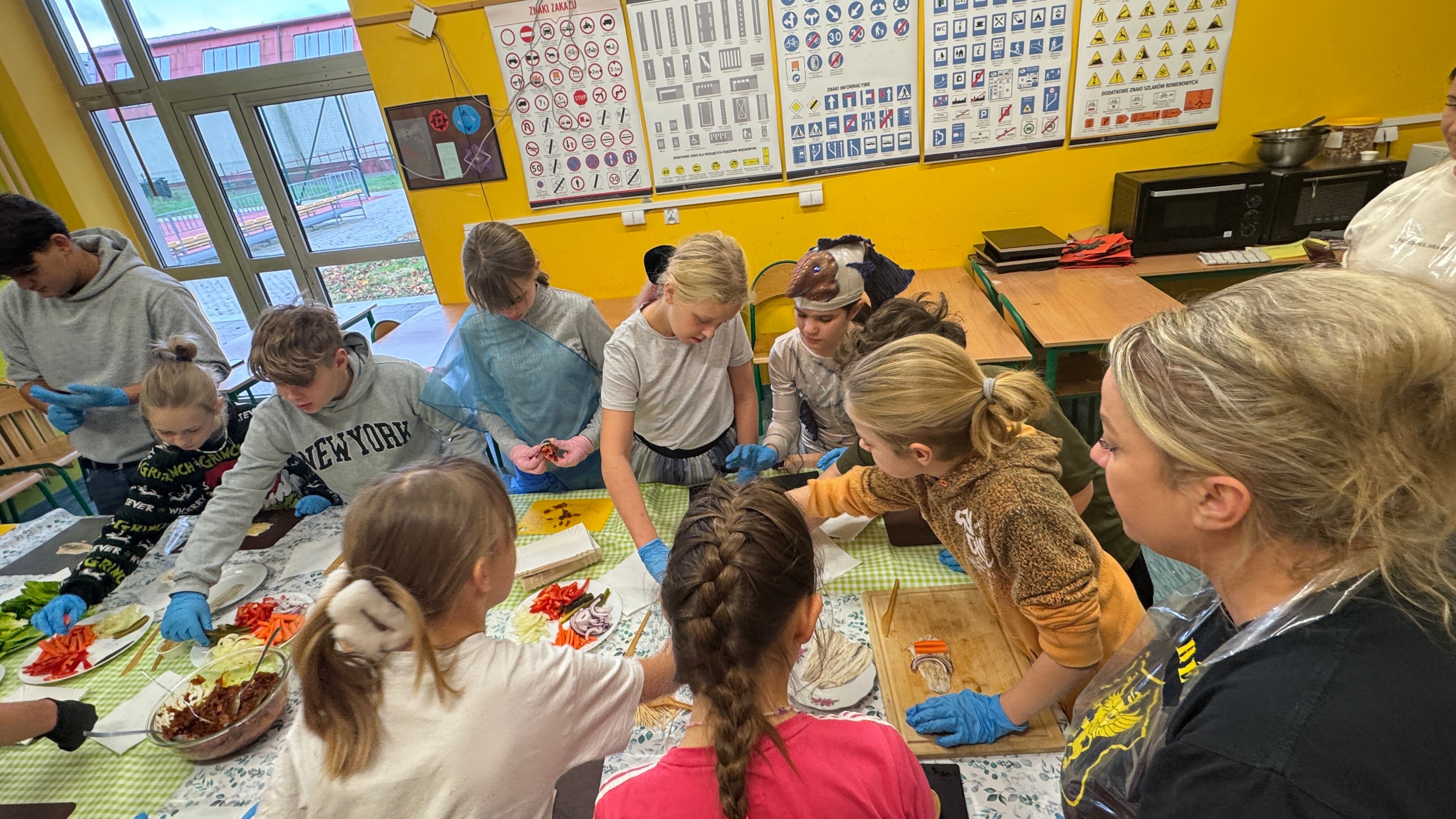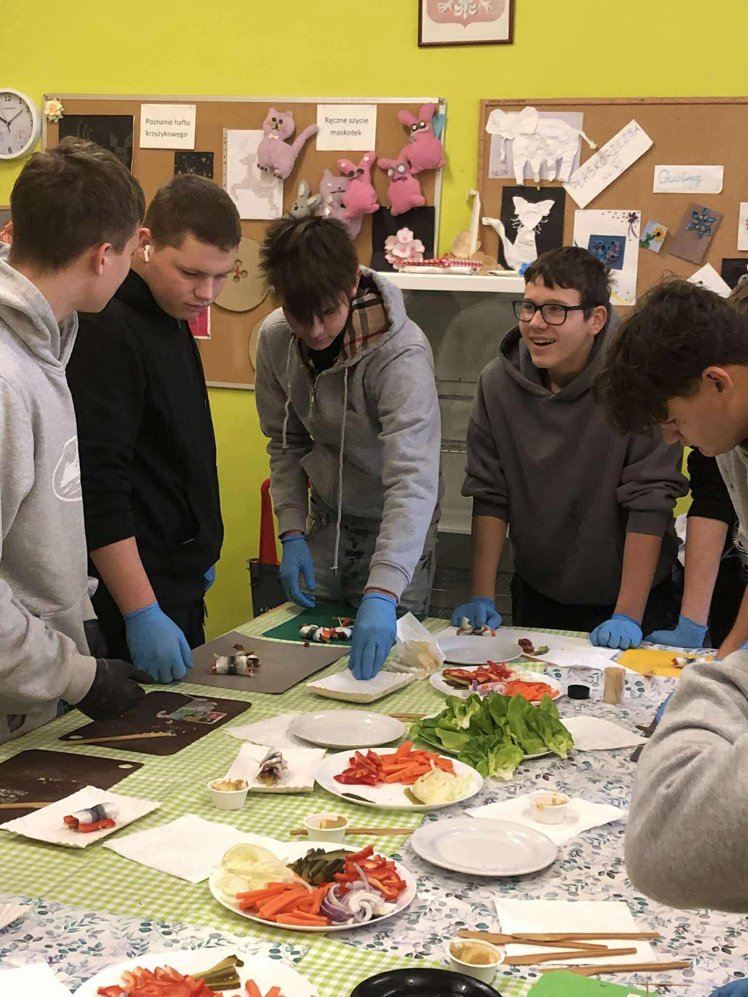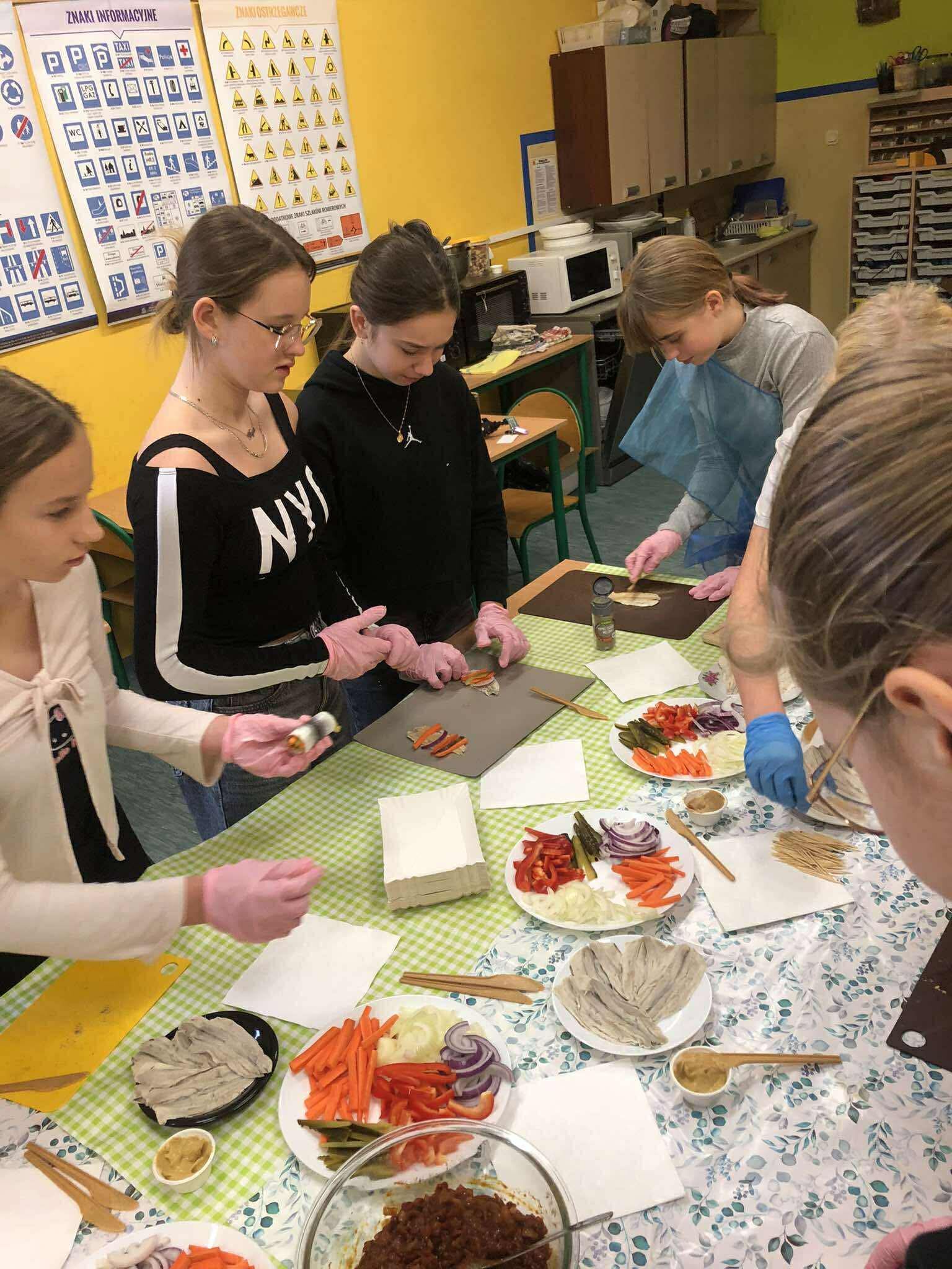 Dla 25 chętnych Uczniów Rodzice klasy 5SP przygotowali zajęcia skręcania rolmopsów. Lokalne zasoby śledzia to rzeczywiste królestwo smaków: po kaszubsku z cebulą w pomidorach, wytrawne z marchewką i ogórkiem, pikantne z papryka i musztardą- przepyszne wariacje. Czego uczyliśmy? Rozpoznawania smaków wód, które nas otaczają, świadomego wybierania ryb trafiających na talerz. Cel 14: Chronić oceany, morza i zasoby morskie oraz wykorzystywać je w sposób zrównoważony.