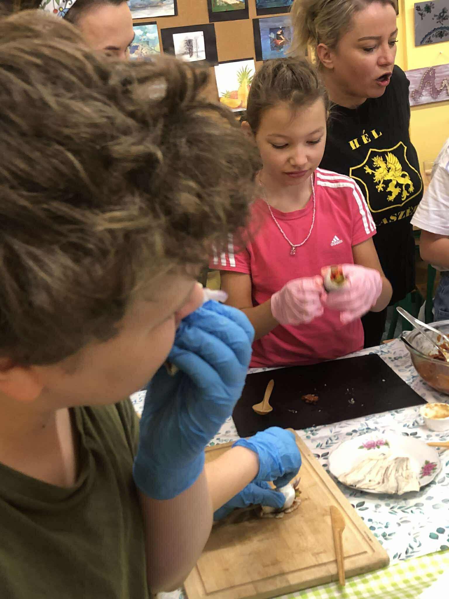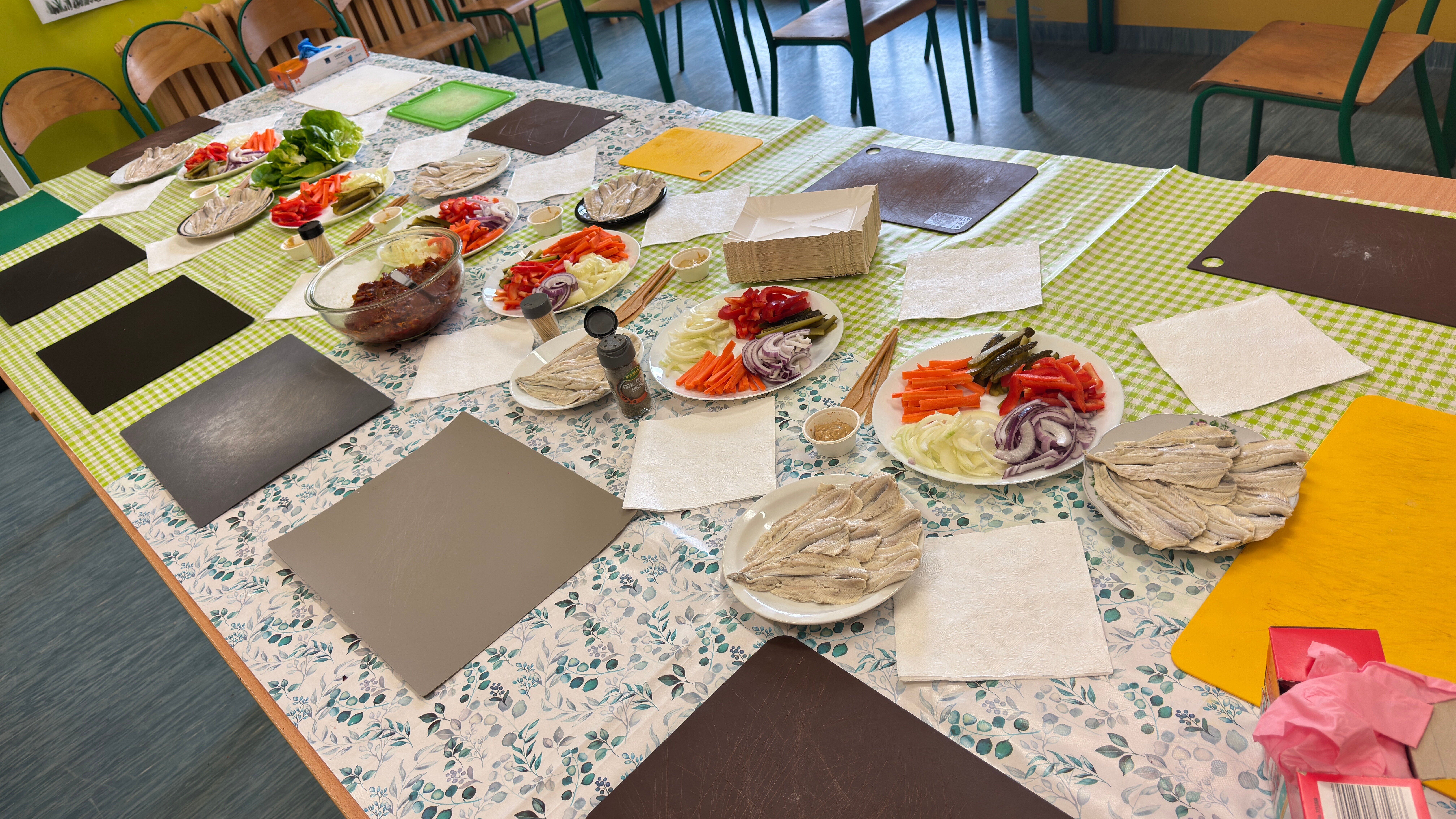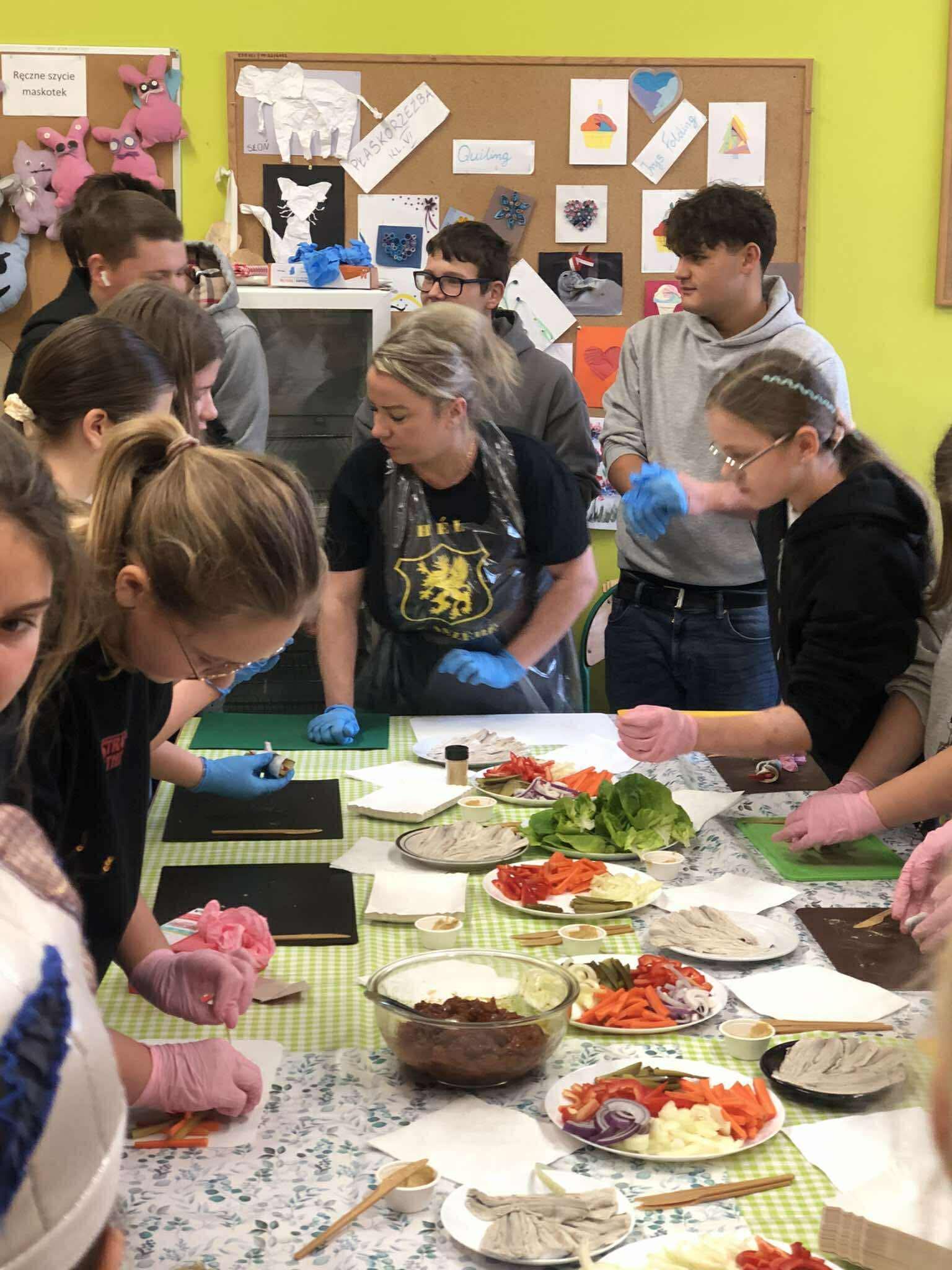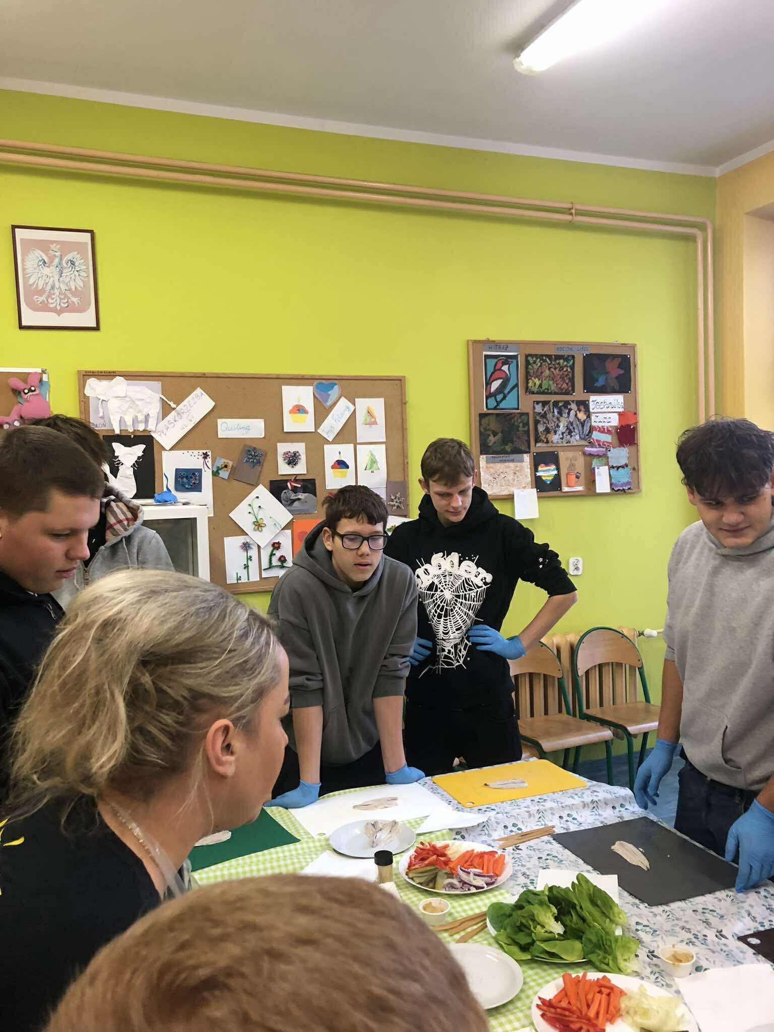 Dla 25 chętnych Uczniów Rodzice klasy 5SP przygotowali zajęcia skręcania rolmopsów. Lokalne zasoby śledzia to rzeczywiste królestwo smaków: po kaszubsku z cebulą w pomidorach, wytrawne z marchewką i ogórkiem, pikantne z papryka i musztardą- przepyszne wariacje. Czego uczyliśmy? Rozpoznawania smaków wód, które nas otaczają, świadomego wybierania ryb trafiających na talerz. Cel 14: Chronić oceany, morza i zasoby morskie oraz wykorzystywać je w sposób zrównoważony.