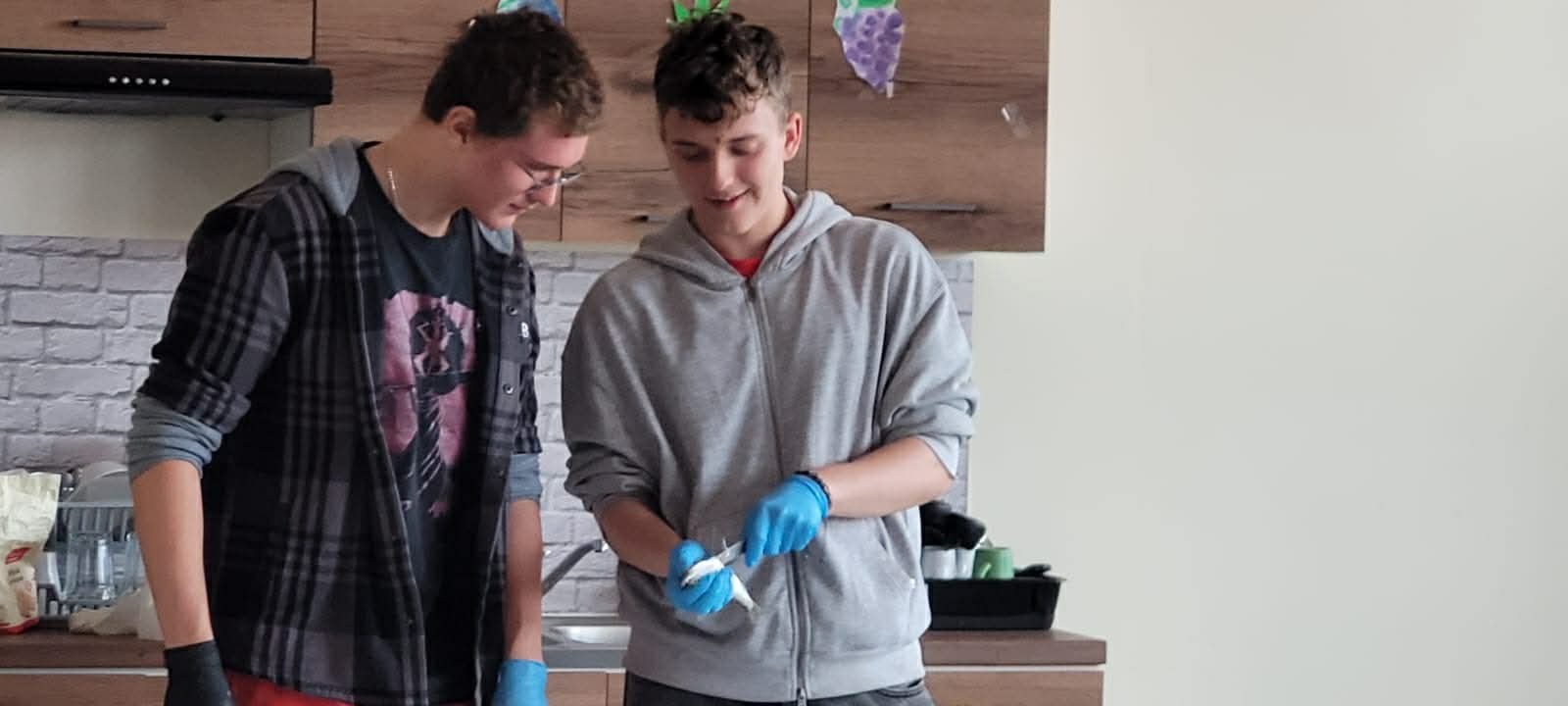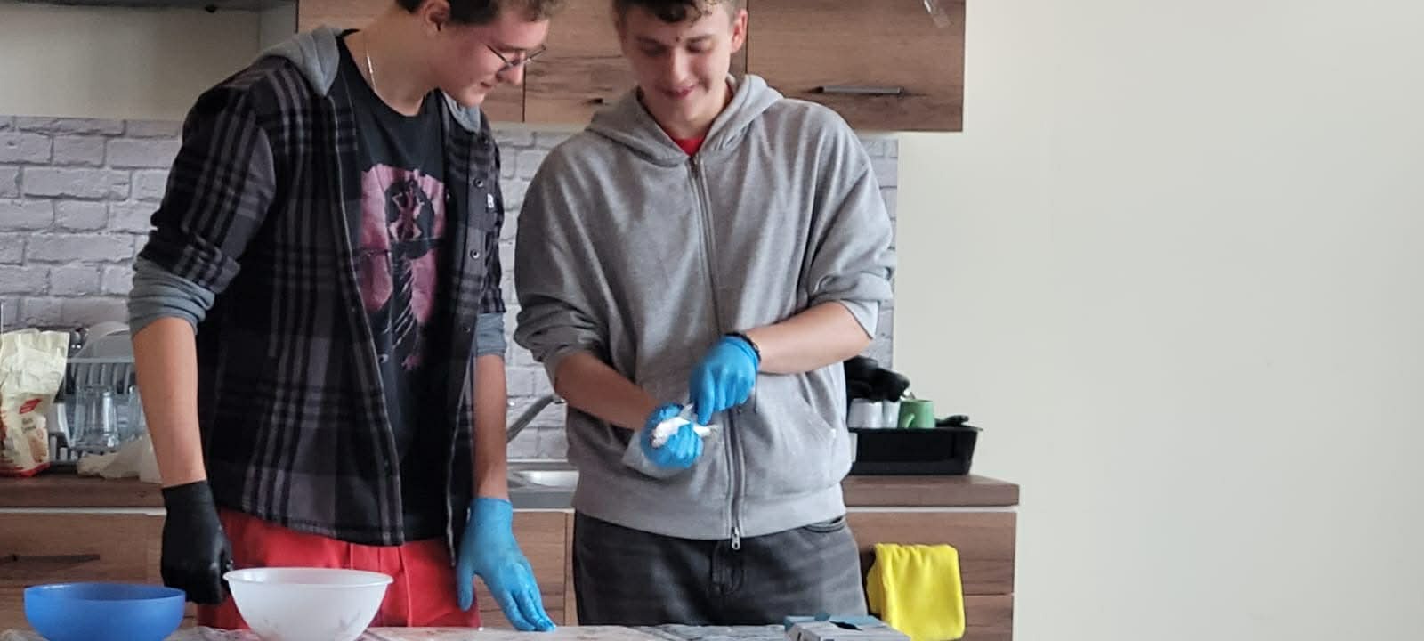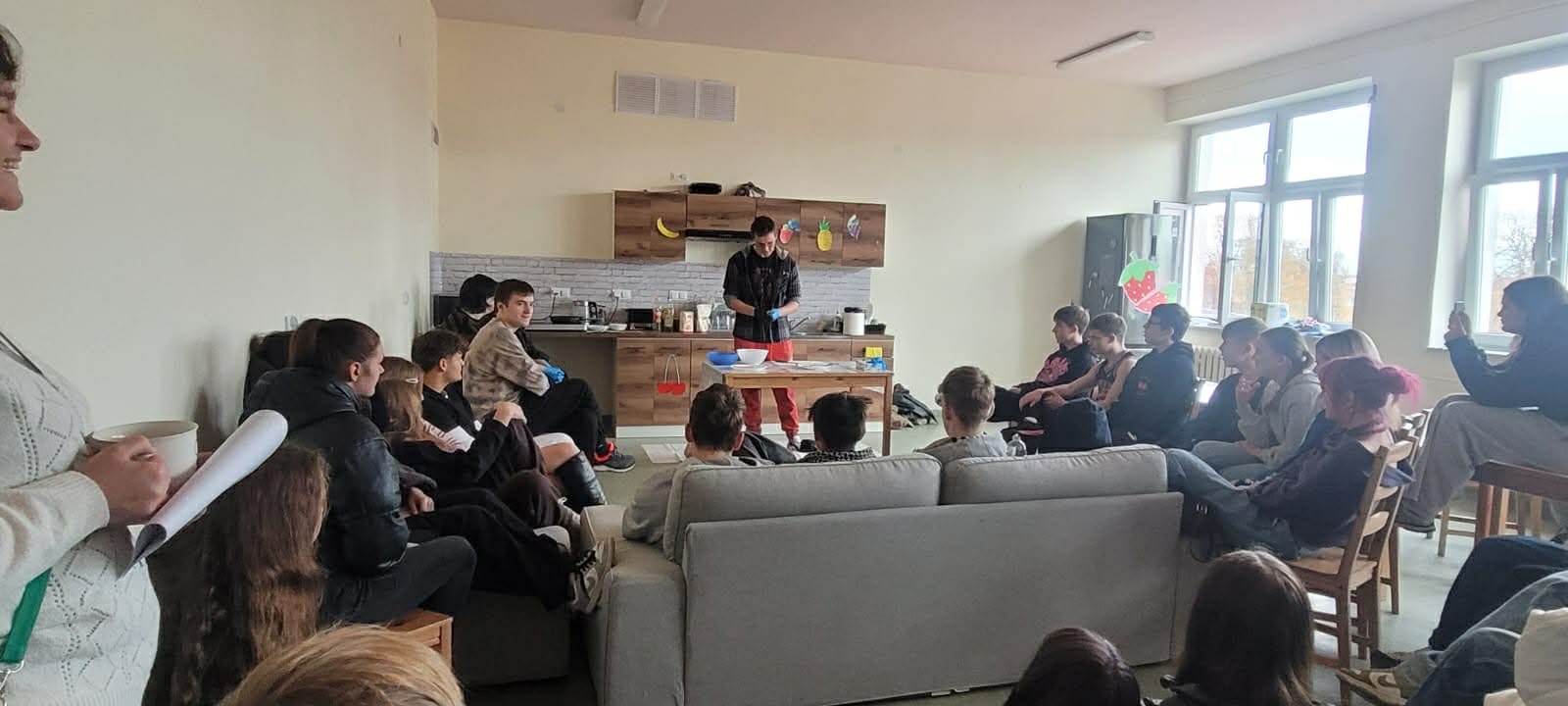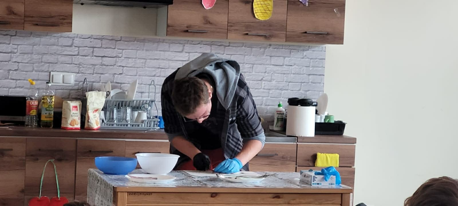 Młodzież HEL~LO miała okazję przyjrzeć się, jak skutecznie i z najmniejszą utratą rybiego mięsa patroszyć króla Bałtyku, czyli śledzia. Mistrzem ceremonii był uczeń klasy 3 LO, Paweł Muża, który, sprawnie operując nożem, usuwał wnętrzności, ostrożnie filetował i uczył widzów tej rzadkiej umiejętności. Znalazło się kilku chętnych do prób śledziowych i całkiem nieźle sobie poradzili. Gotowe płaty śledziowe przyprawiały i smażyły Dominika Okulińska i Asia Stechura. Podano delicje bałtyckie! Wykorzystaliśmy lokalne zasoby, resztkami nakarmiliśmy zwierzęta (zaopiekowane koty przy ul. Żeromskiego), nie zmarnowaliśmy żadnej cząstki ryby, która trafiła na nasz talerz. Frasobliwość gospodarzy planety Ziemia to sztuka, którą trzeba przyswoić koniecznie.