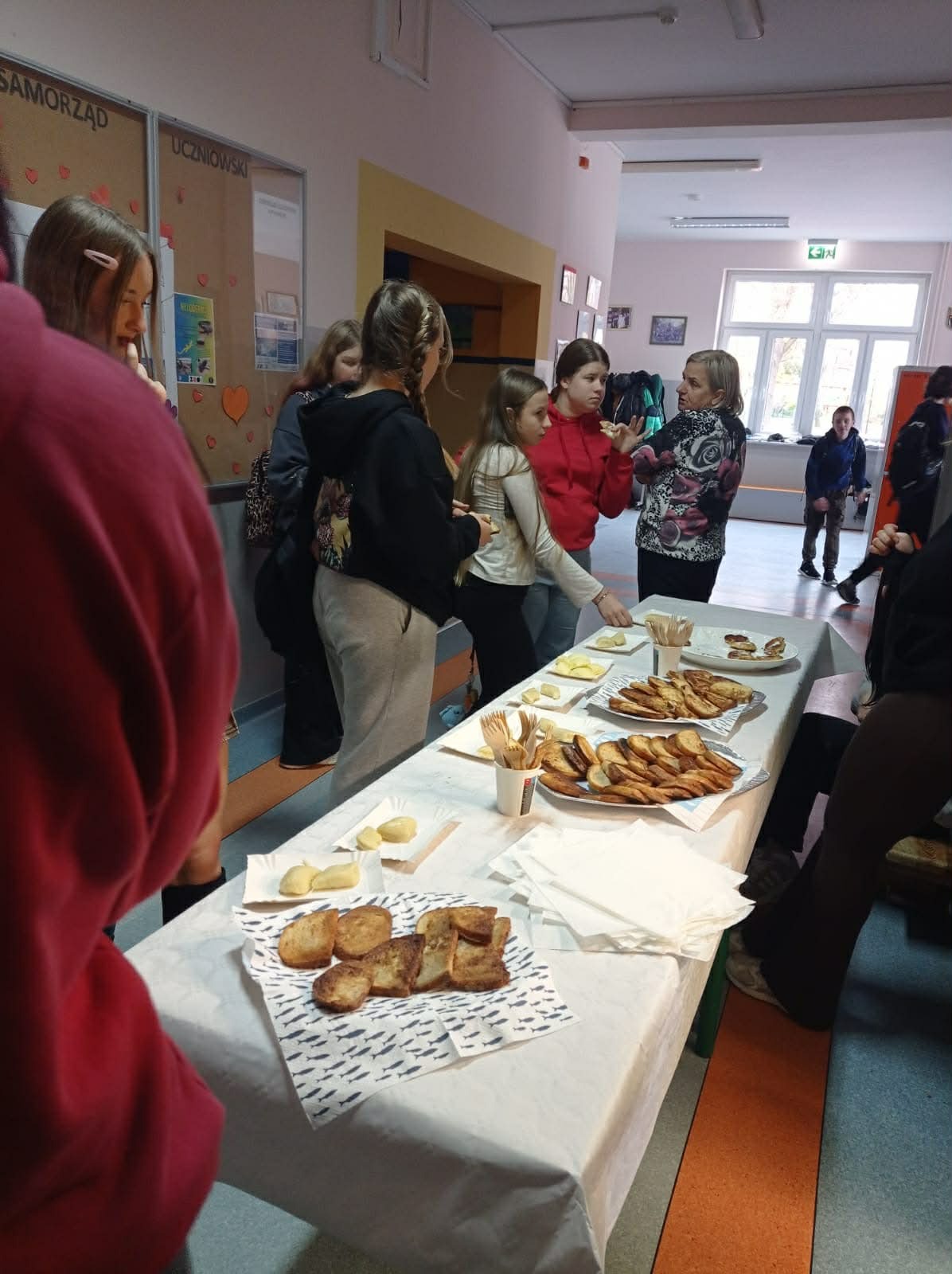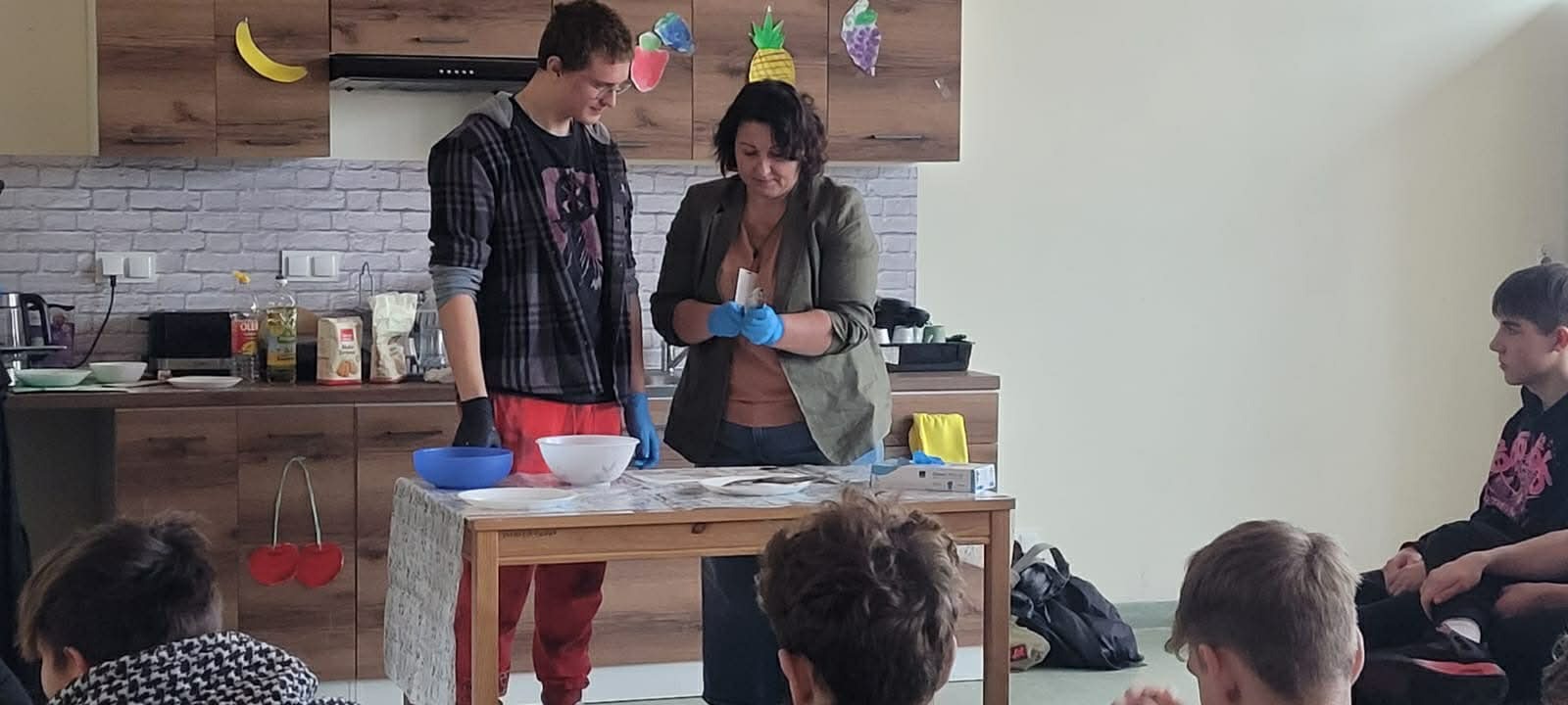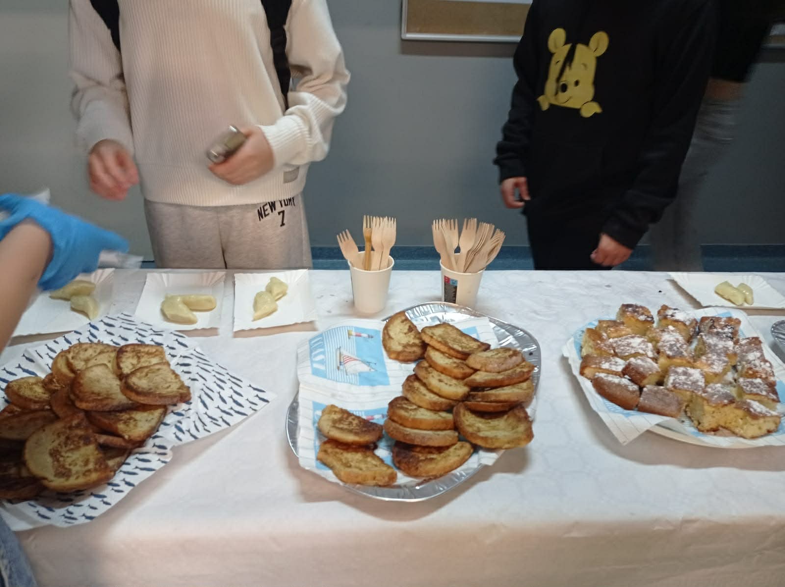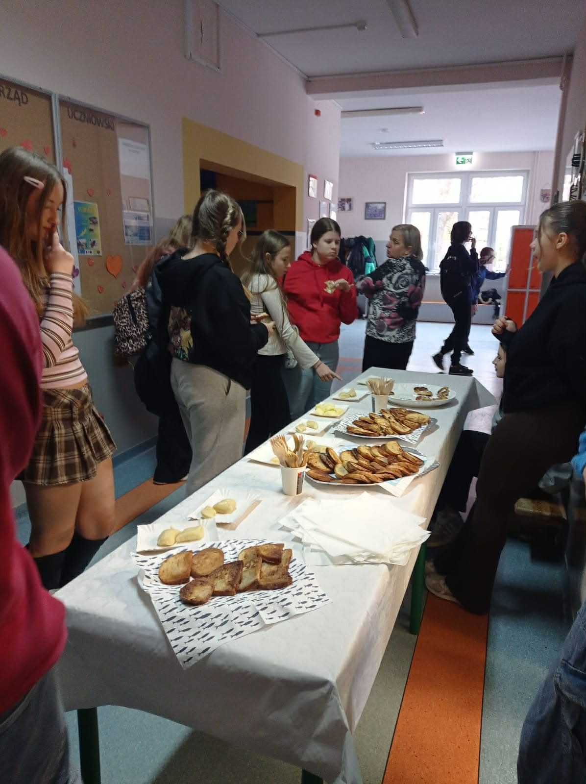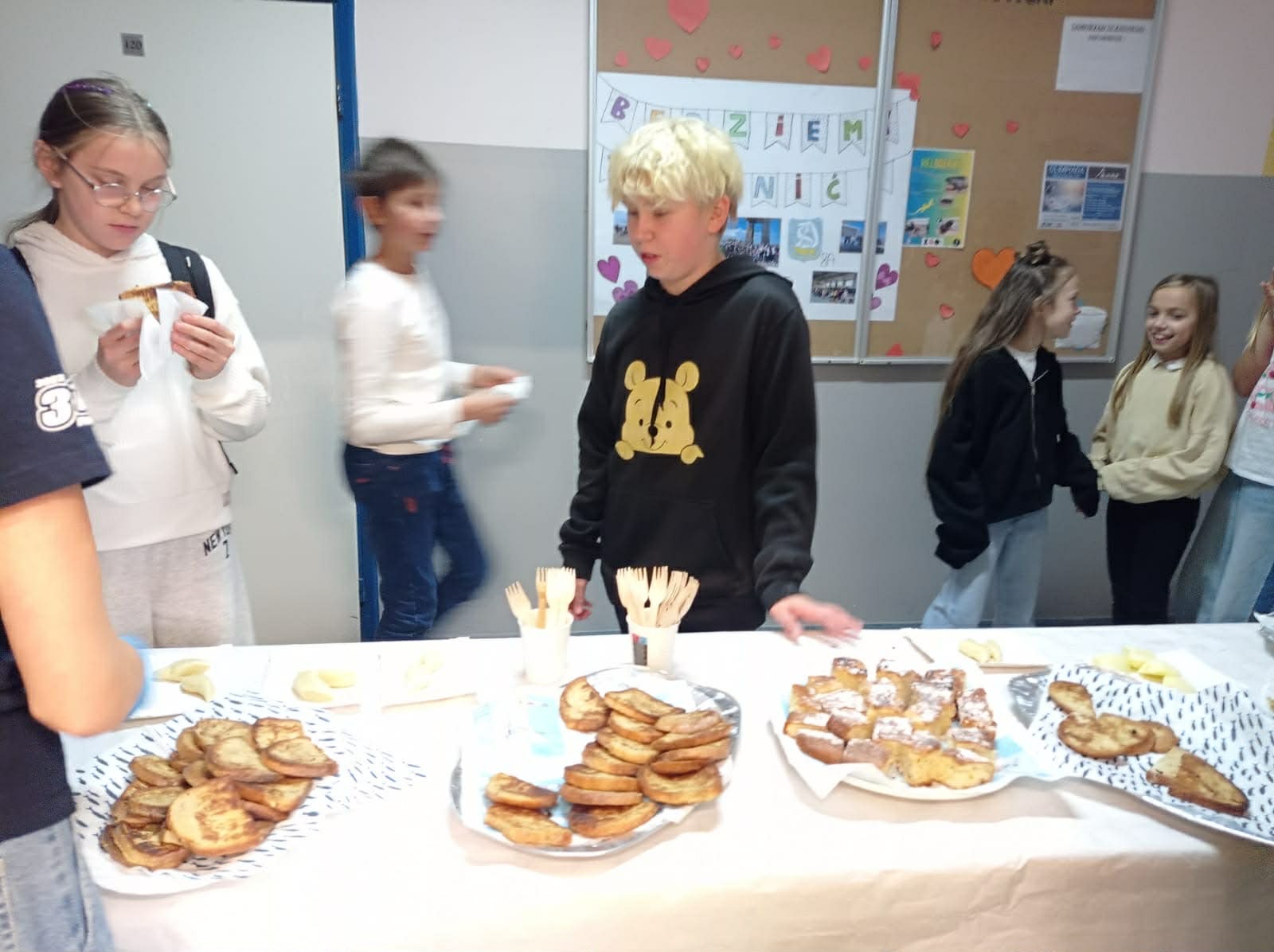 Tym razem zespół z klas 6 i 8 SP pod okiem Pań Oli Muttke Lamparskiej i Iwony Zyskiej przygotowywał popularne dania ze składników, które najczęściej pozostają z różnych innych posiłków. Stąd kopytka, racuszki z jabłkami, smażony w jajku chleb, ciasto dyniowe i jabłecznik. Pyszności cieszyły się wzięciem, a przy okazji uczyliśmy, jak nie marnować żywności. Warto pamiętać, że gospodarstwa domowe poprzez wybór produktów żywnościowych i przyzwyczajenia kulinarne wpływają na swoje otoczenie i tym samym mają udział w procesie globalnym. Każdego roku około 1/3 całej wyprodukowanej żywności – tj. 1,3 mld ton pożywienia o wartości około 1 biliona dolarów – marnuje się w domach lub sklepach albo psuje się z powodu złego transportu i praktyk związanych ze zbiorami.