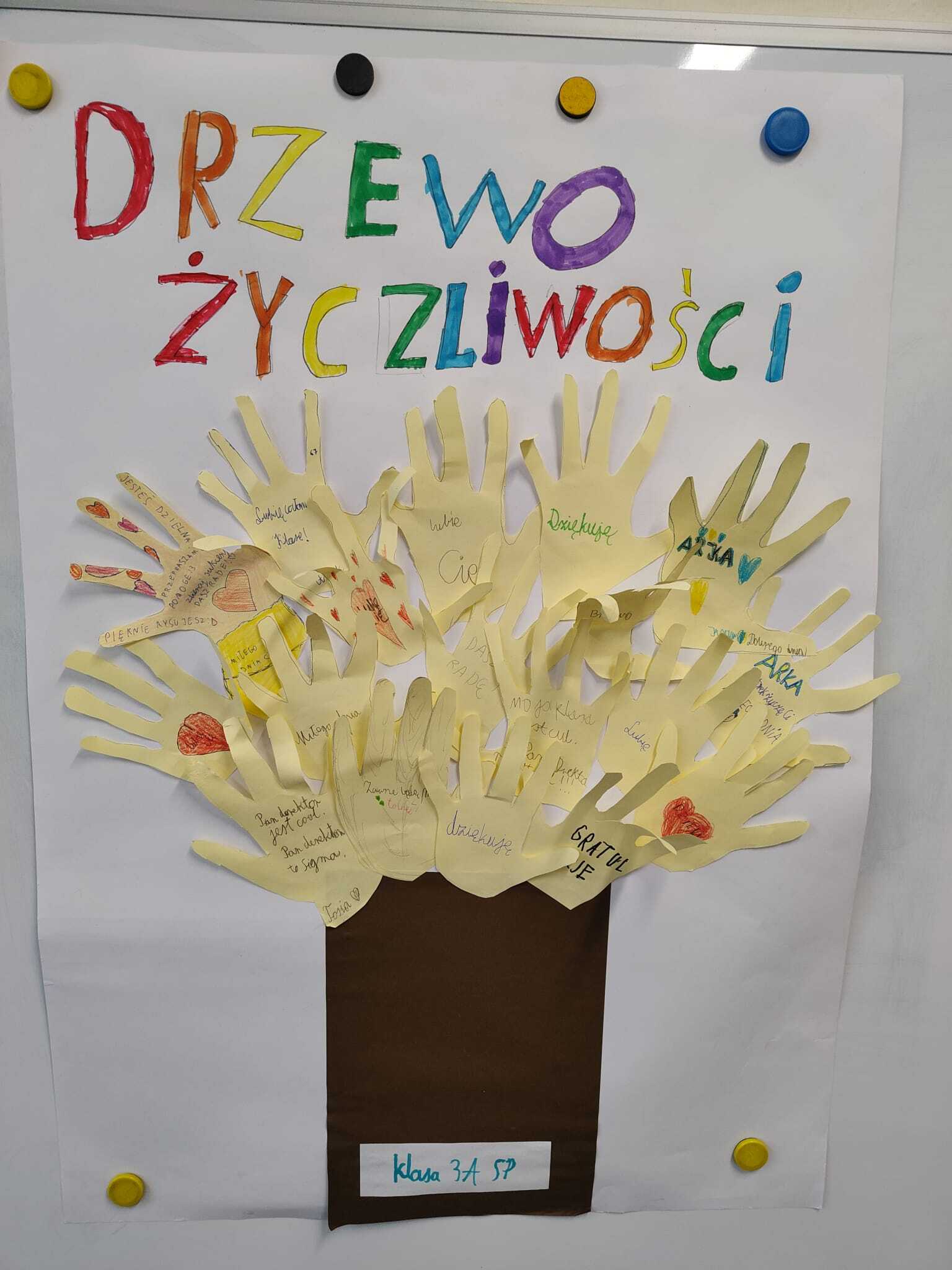 Uczniowie klas 1-3 SP pod opieką swoich wychowawców odbyli zajęcia wzmacniające ich kompetencje emocjonalne i społeczne, a następnie stworzyli piękne prace plastyczne, zachęcające do okazywania wobec siebie szacunku, serdeczności oraz uśmiechu. I tak oto powstało drzewo życzliwości, serca koleżeństwa, plakaty pełne dobrych uczynków i wzmacniających słów